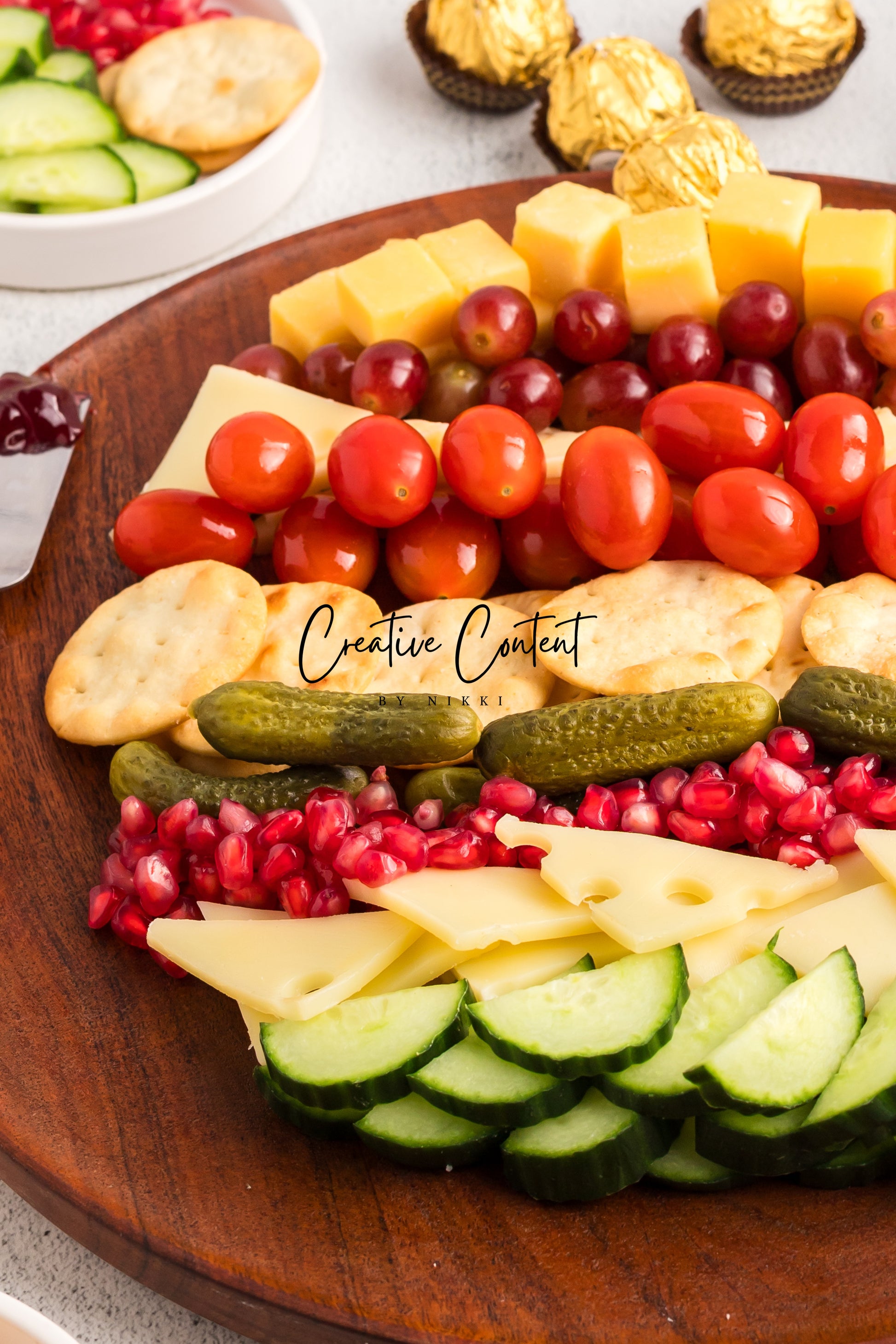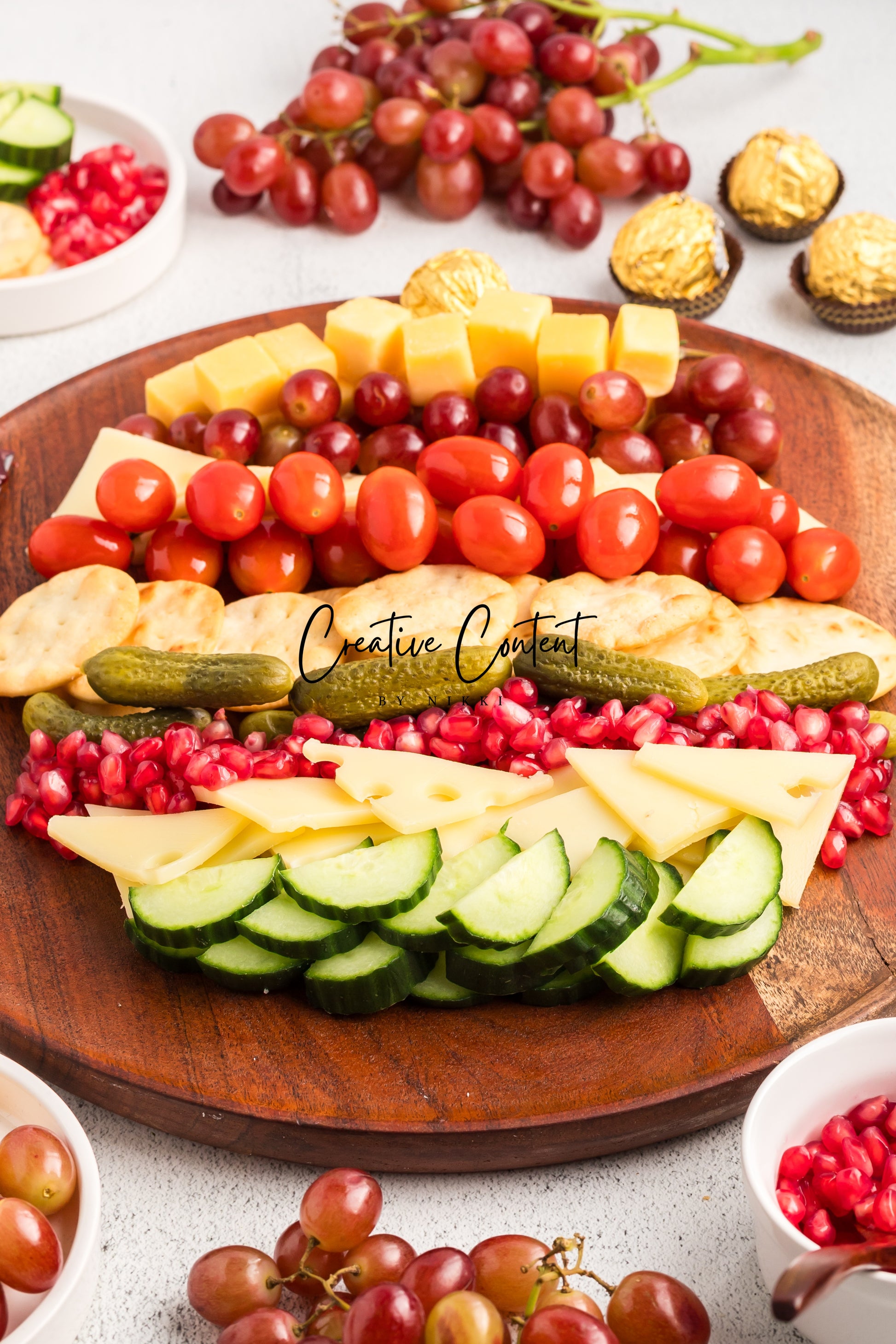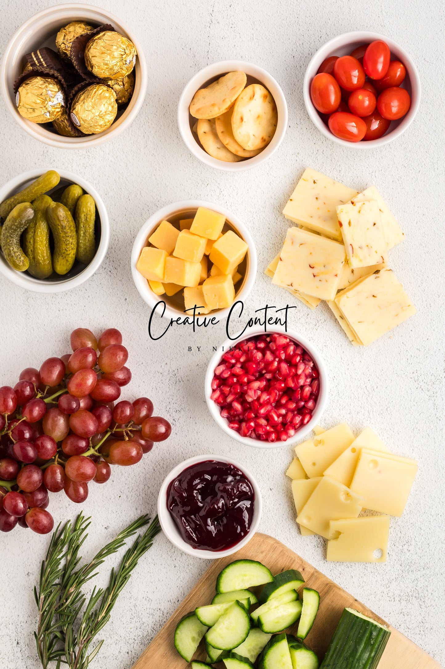 - Featured Ingredients; English cucumber, white cheese, pepper jack cheese, Swiss cheese, cherry tomatoes, red grapes, pomegranate seeds, gherkin pickles, rosemary, crackers, raspberry jelly, and Ferrero Rocher.