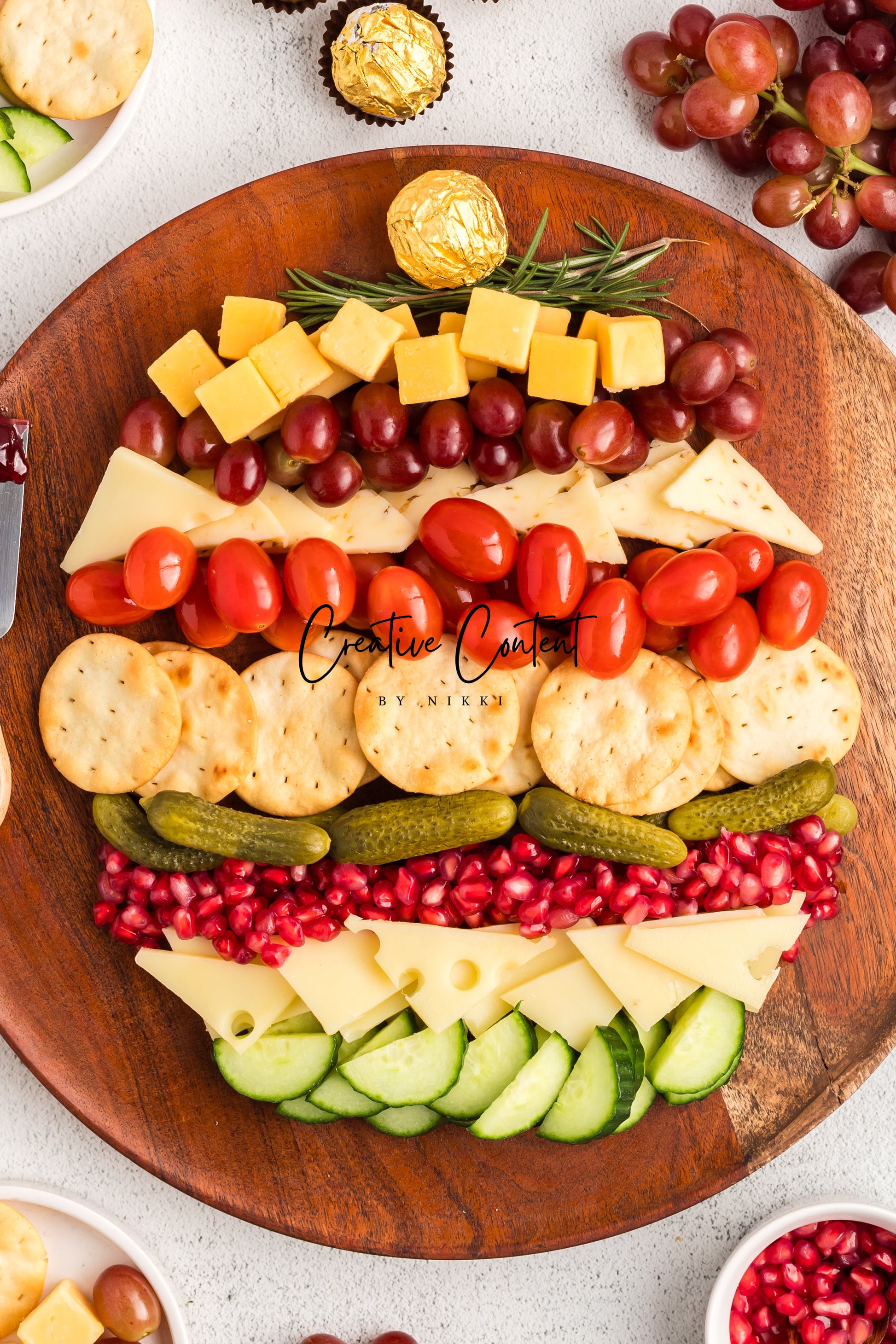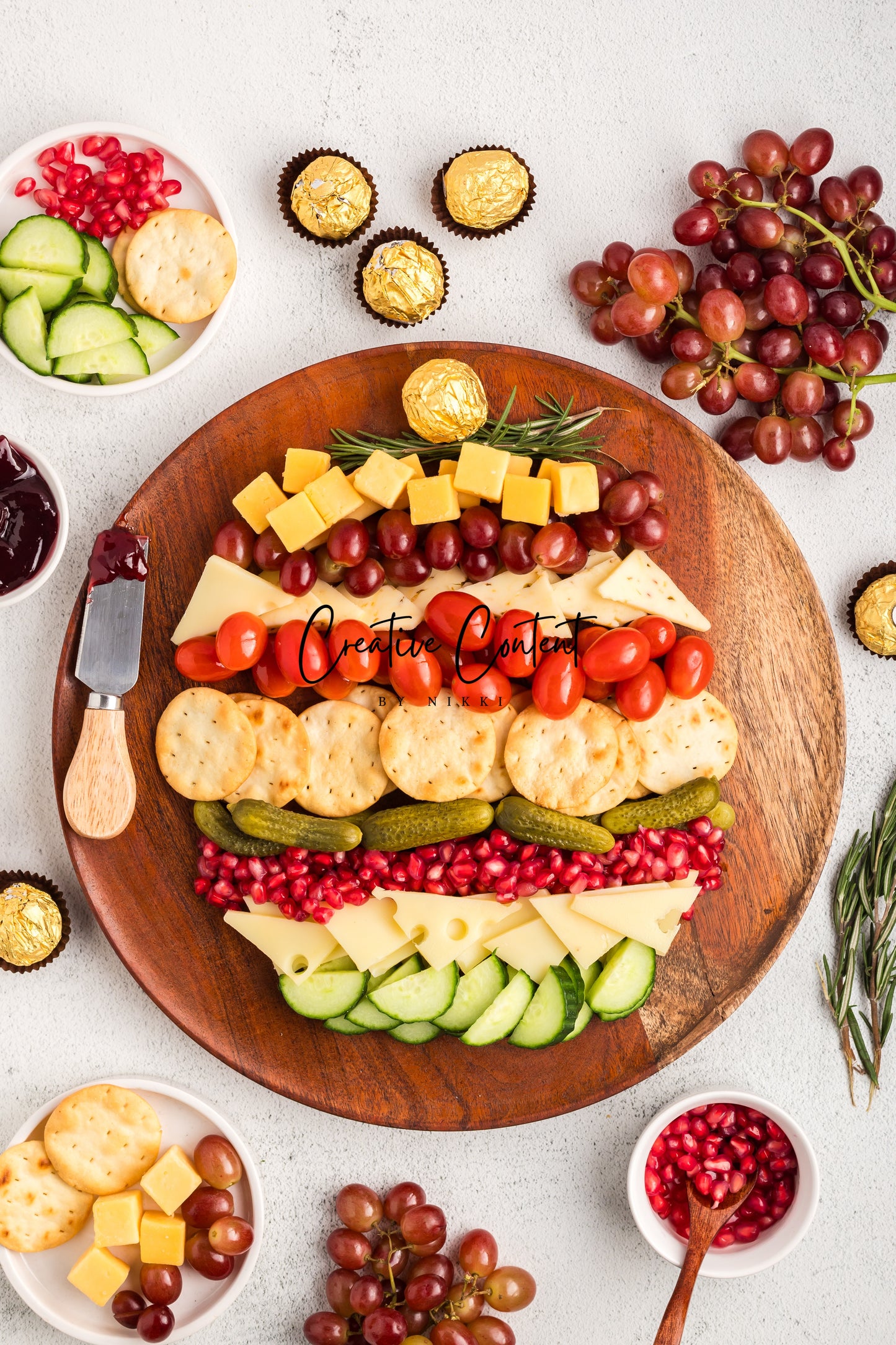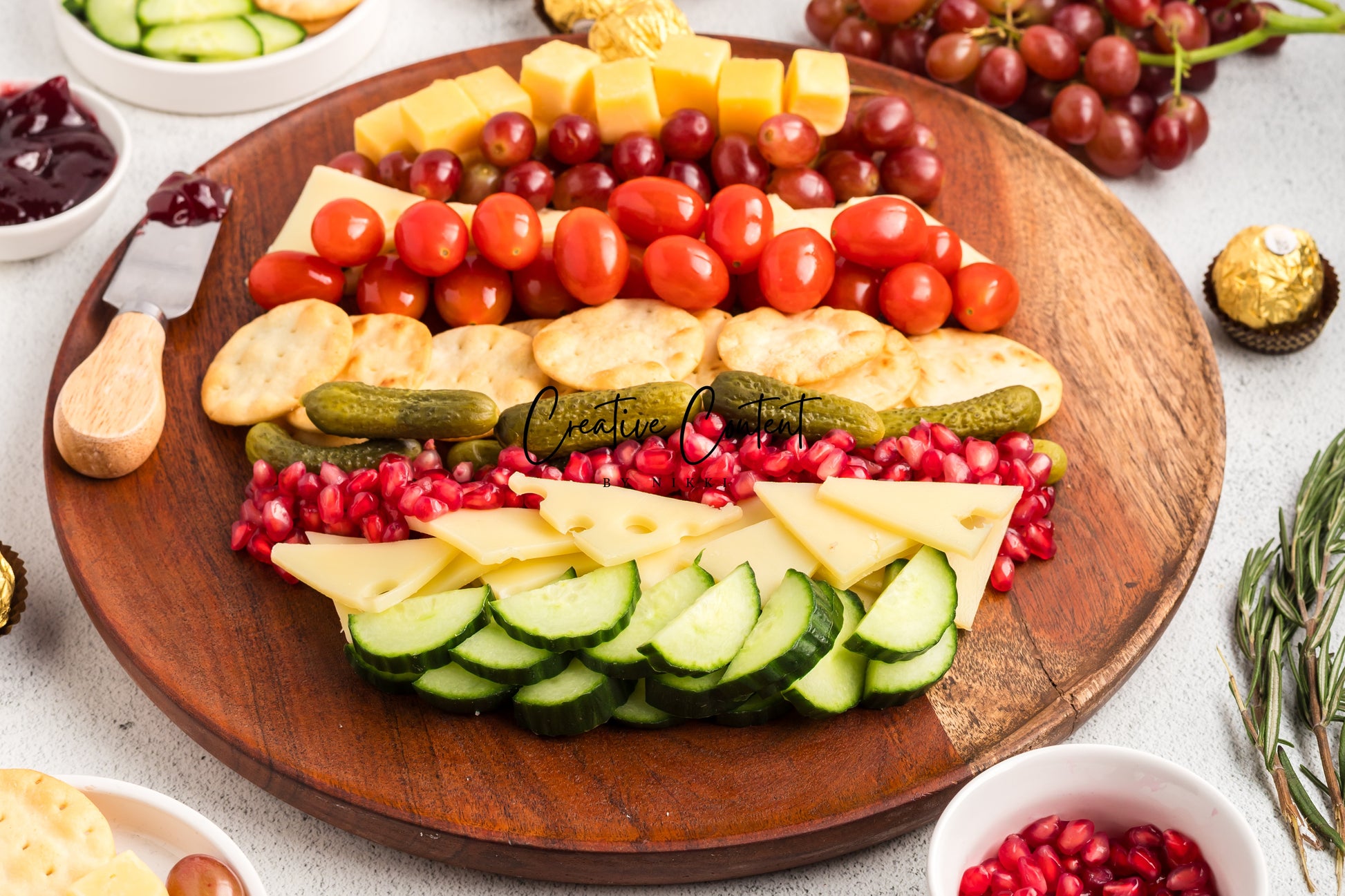 - Featured Ingredients; English cucumber, white cheese, pepper jack cheese, Swiss cheese, cherry tomatoes, red grapes, pomegranate seeds, gherkin pickles, rosemary, crackers, raspberry jelly, and Ferrero Rocher.