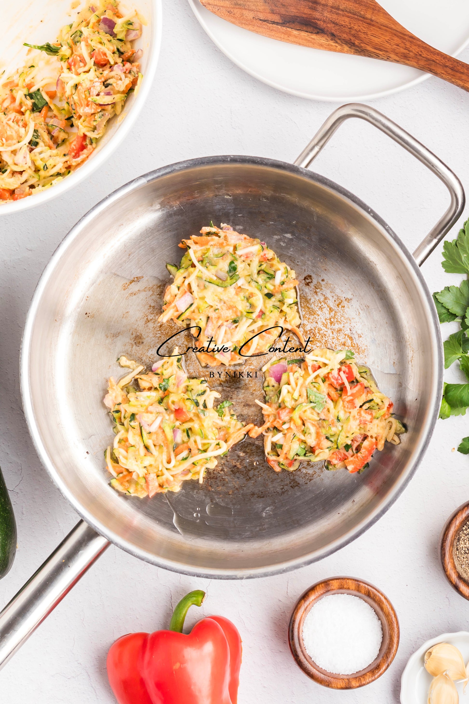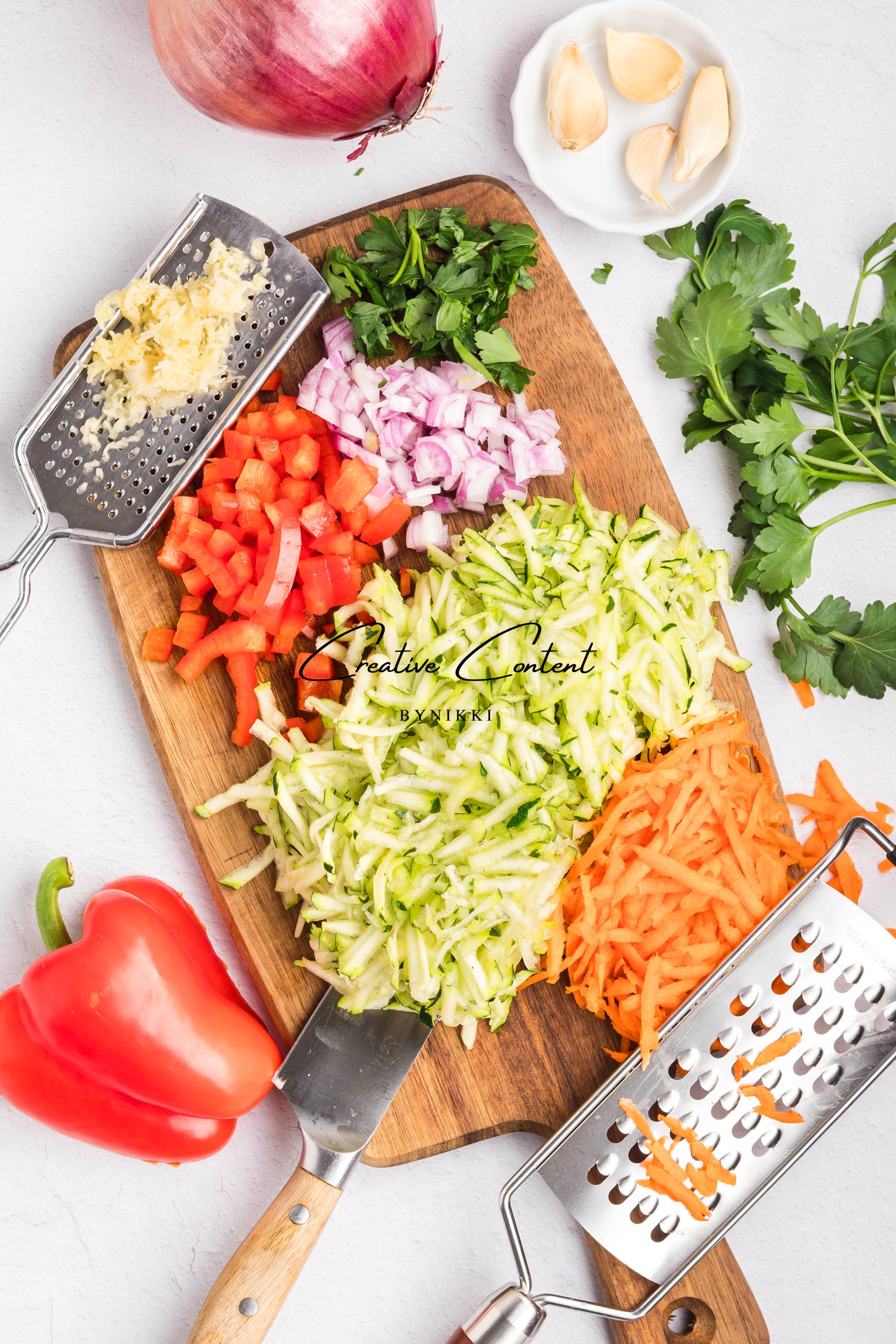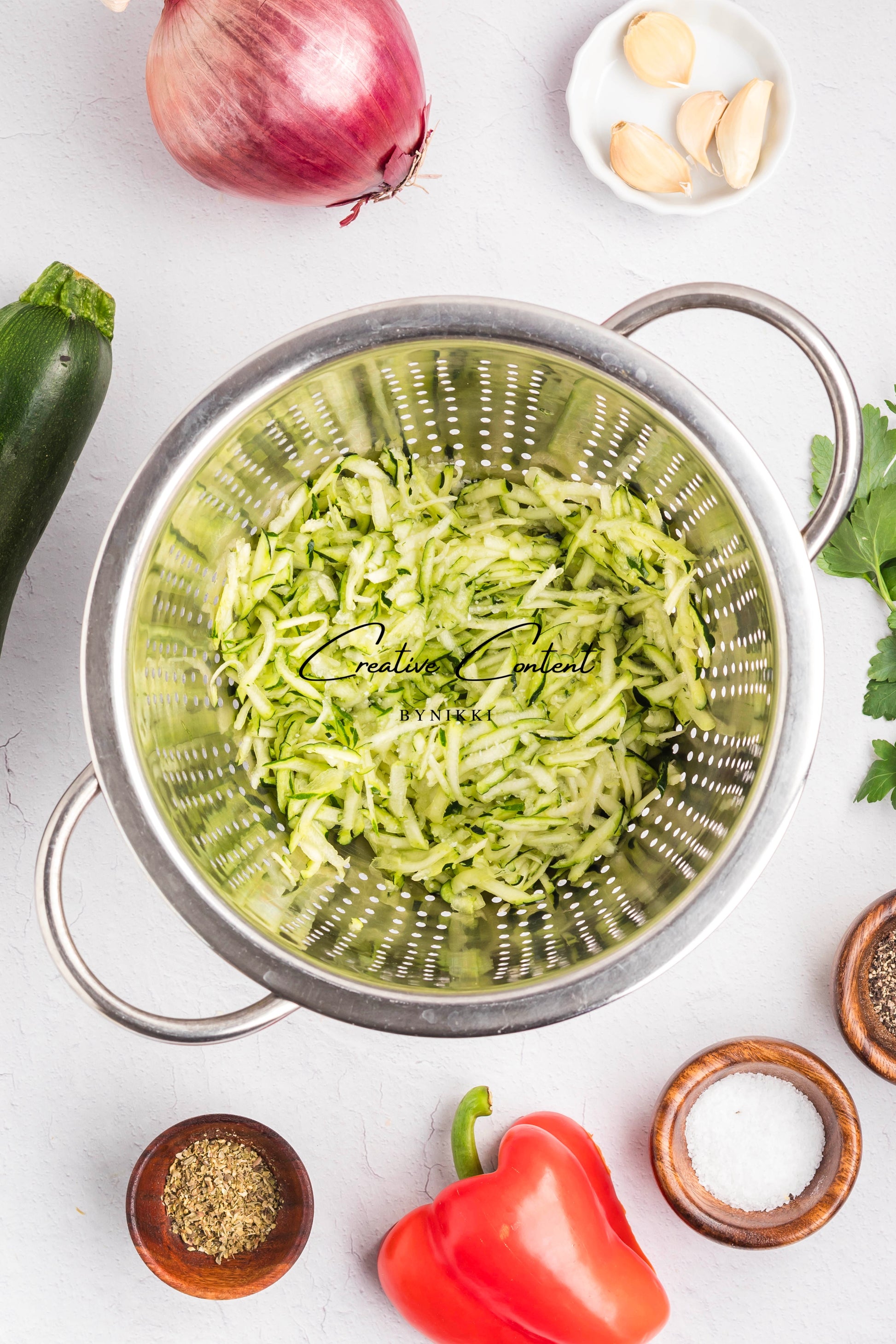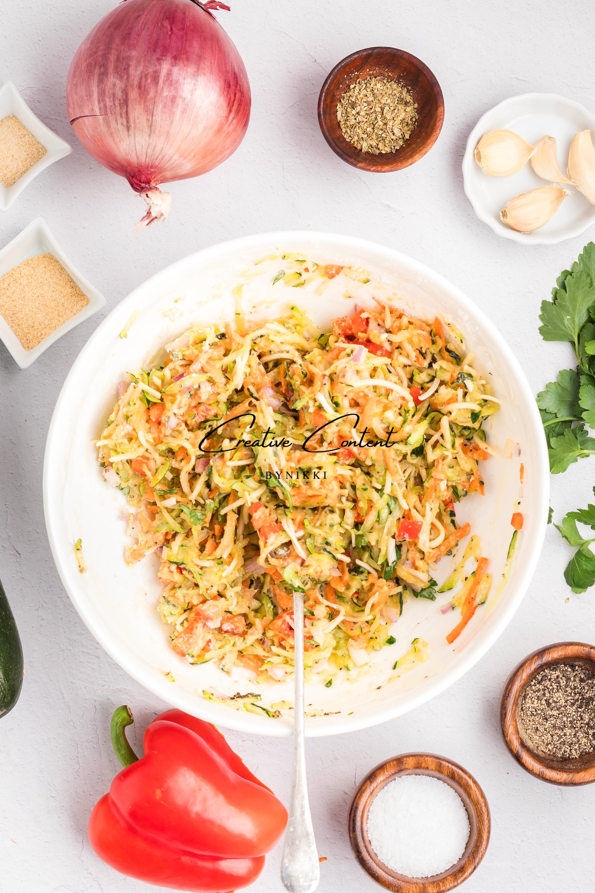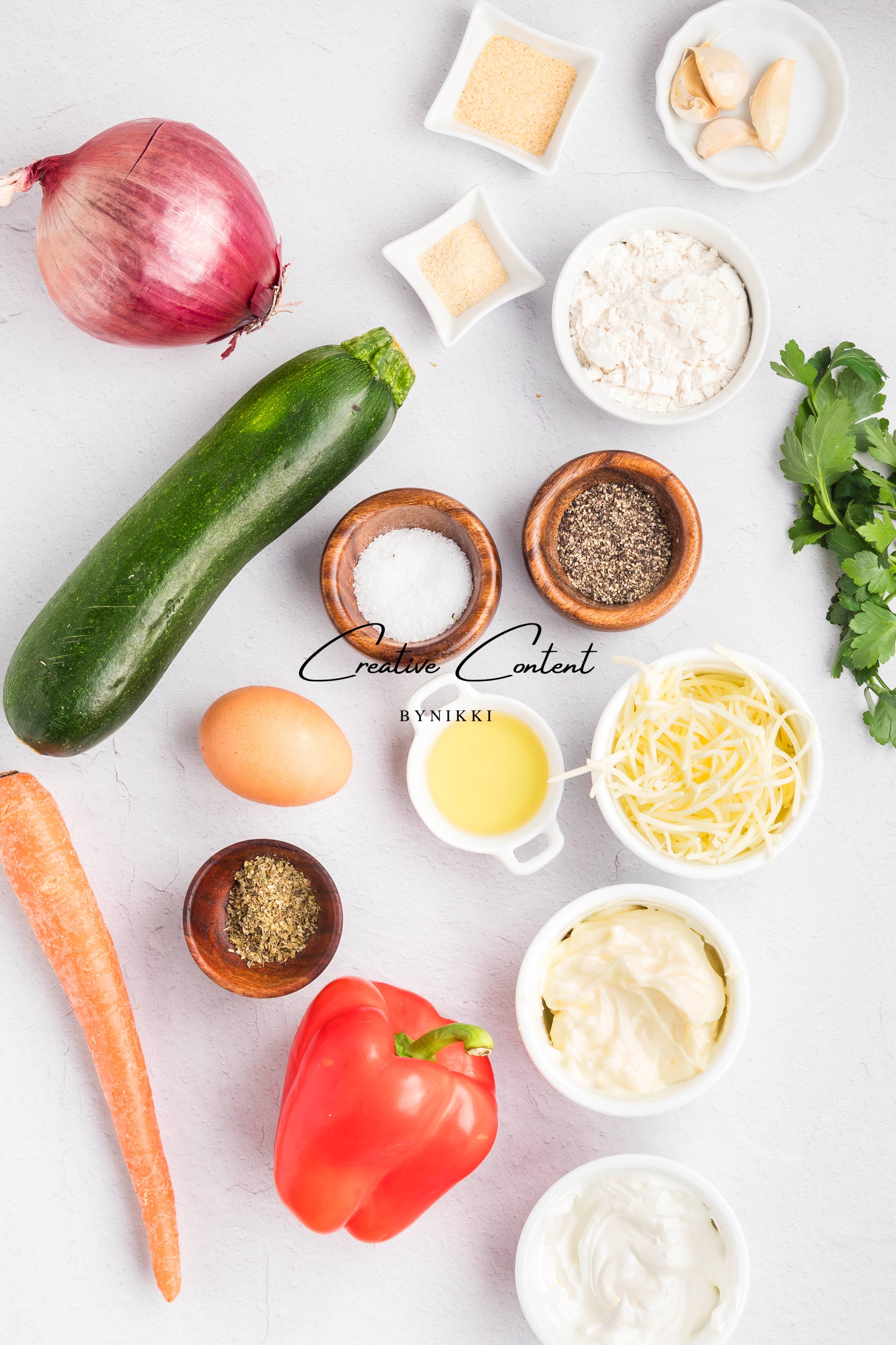 - Featured Ingredients: Zucchini, mozzarella cheese, all-purpose flour, red onion, carrots, red bell pepper, garlic cloves, eggs, dried seasonings