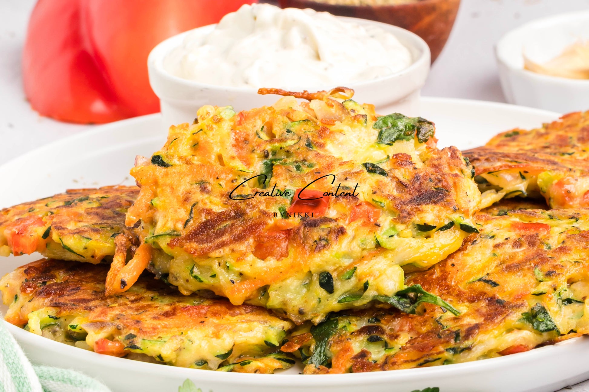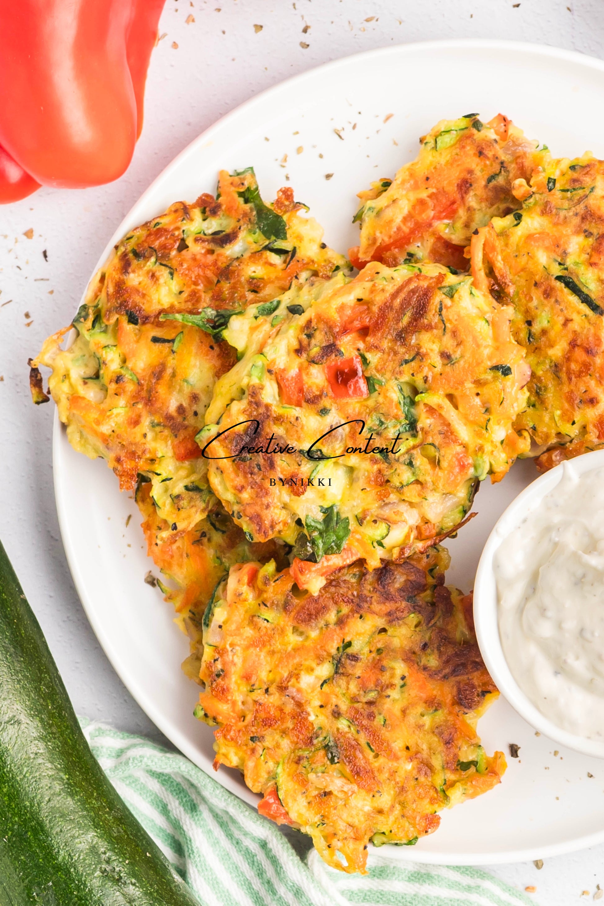 Cheesy veggie patties are full of delicious vegetables with a homemade creamy garlic dip. The patties are full of carrots, zucchini, red bell peppers, and mozzarella cheese to tie it all together. The veggie patties are perfect as an appetizer, a quick snack, or a side dish with any entrée.