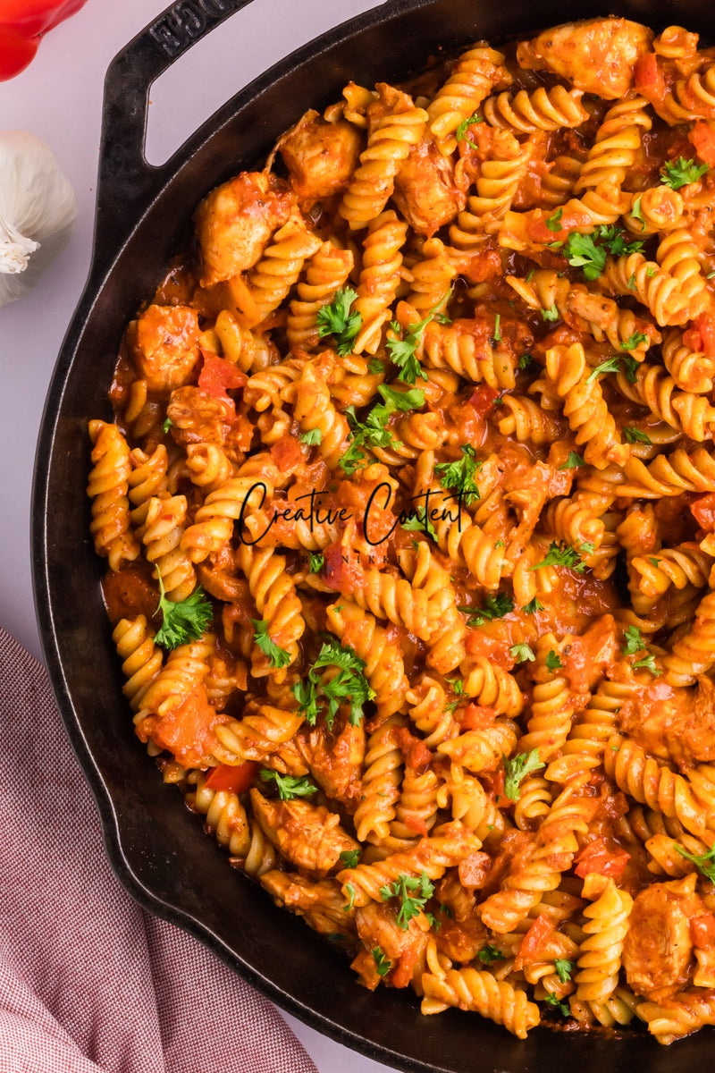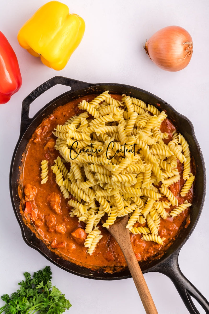 - Ingredients needed; pasta, avocado oil, yellow onion, red bell pepper, chicken breasts, chorizo, garlic cloves, tomato paste, no sodium diced tomatoes, heavy whipping cream, chicken stock, white granulated sugar, Italian seasoning, sweet paprika, red pepper flakes, coarse kosher salt, black pepper, parmesan cheese, unsalted butter, and parsley.