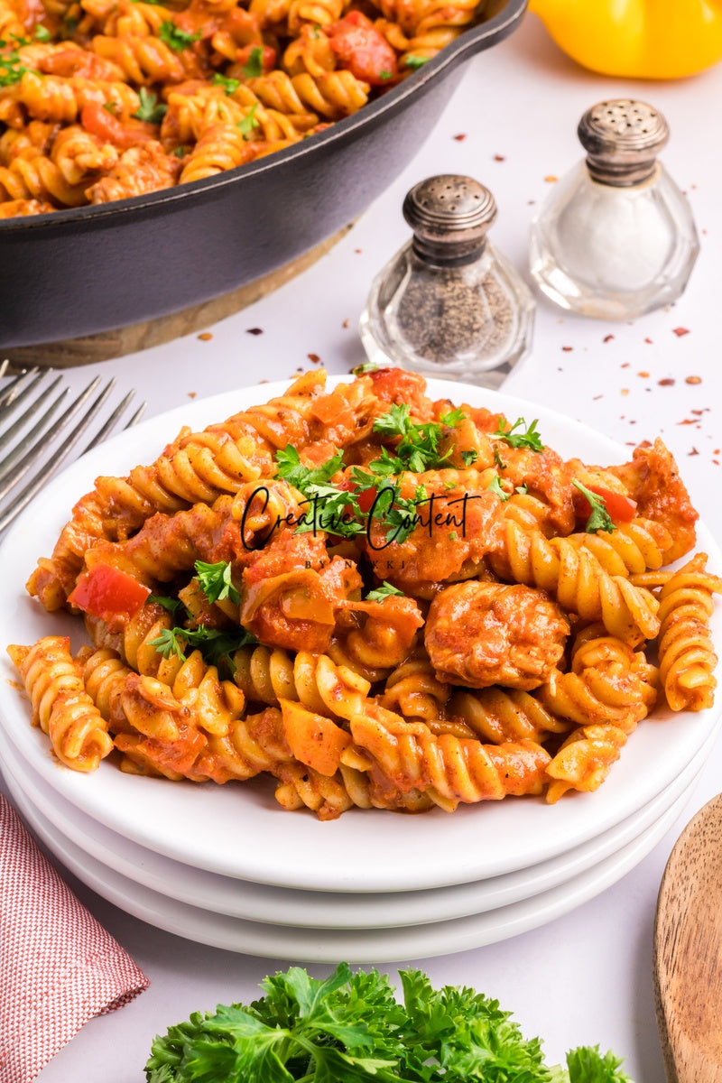 This chicken and chorizo pasta is full of flavor with onions, bell peppers, Italian seasoning, garlic, and parmesan cheese. This is a recipe that the whole family will love even your picky eaters. If you need a special dinner with the family or one for when having friends over this pasta is it. The creamy tomato-based sauce is beyond flavorful with the spicy chorizo.