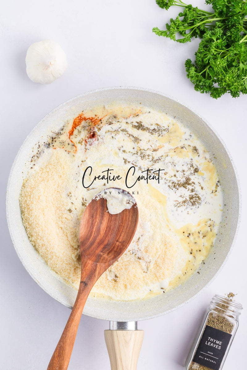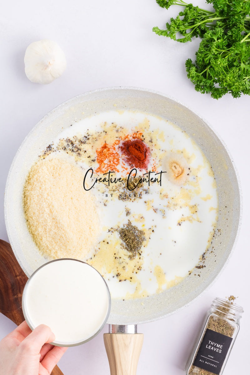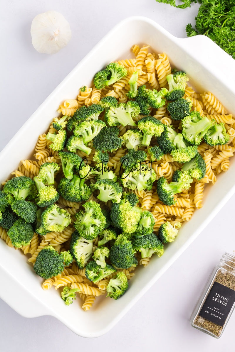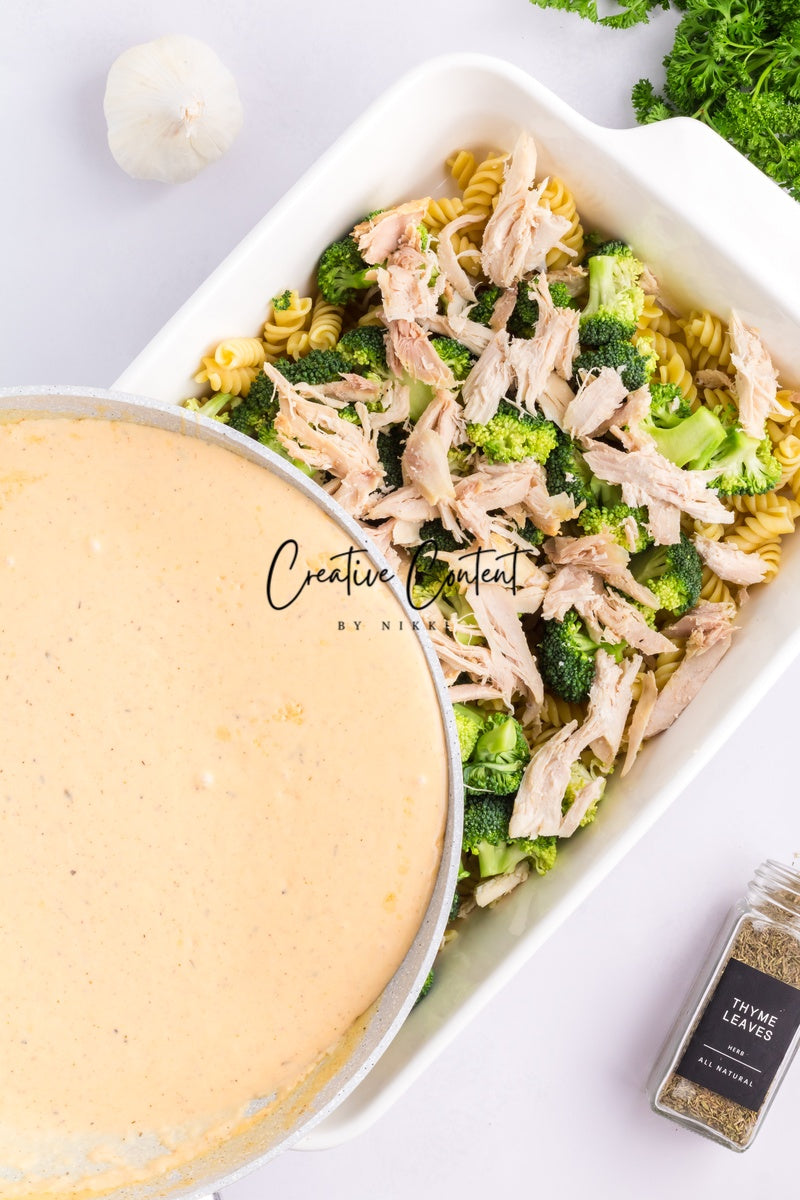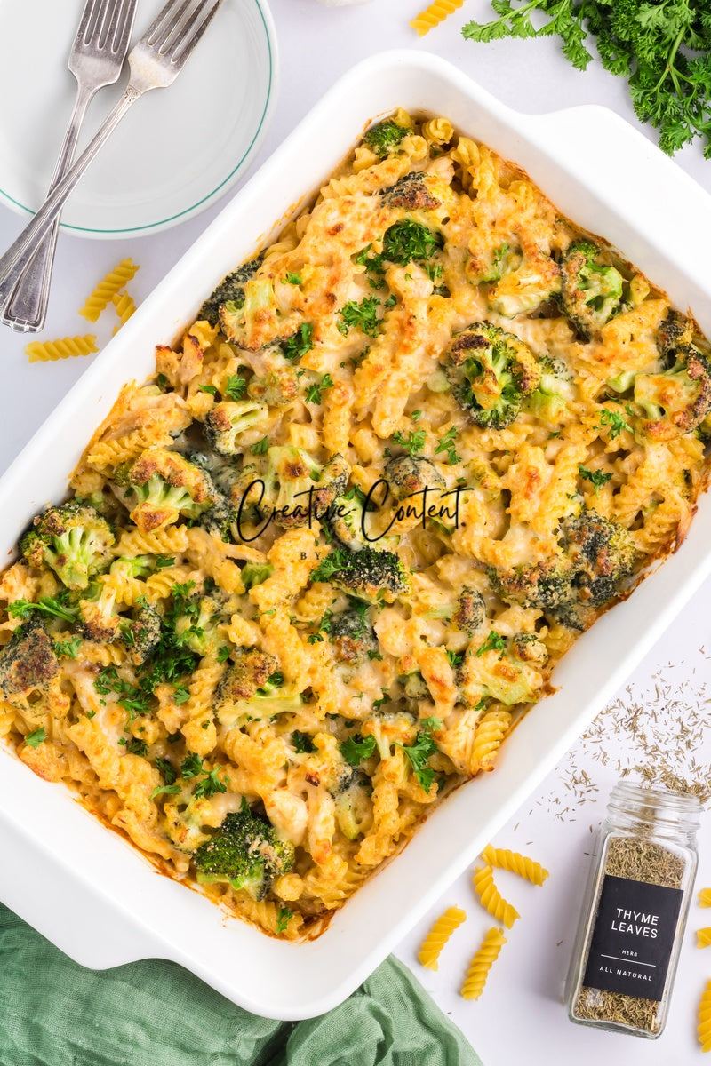 - Ingredients needed; pasta, broccoli, shredded chicken, unsalted butter, all-purpose flour, garlic cloves, milk, heavy cream, parmesan cheese, paprika, dried thyme, garlic powder, onion powder, dried oregano, coarse kosher salt, black pepper, nutmeg, and parsley.
