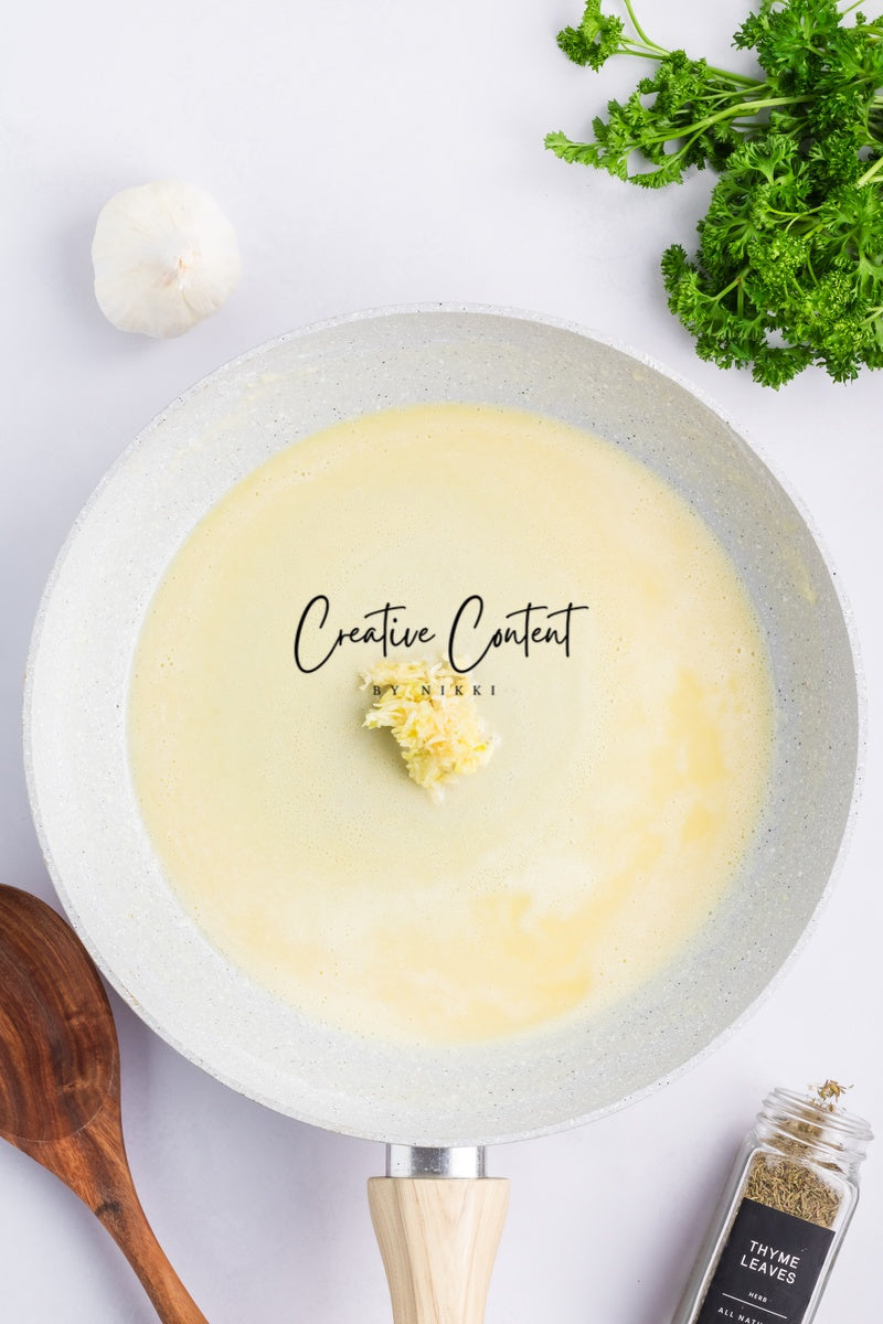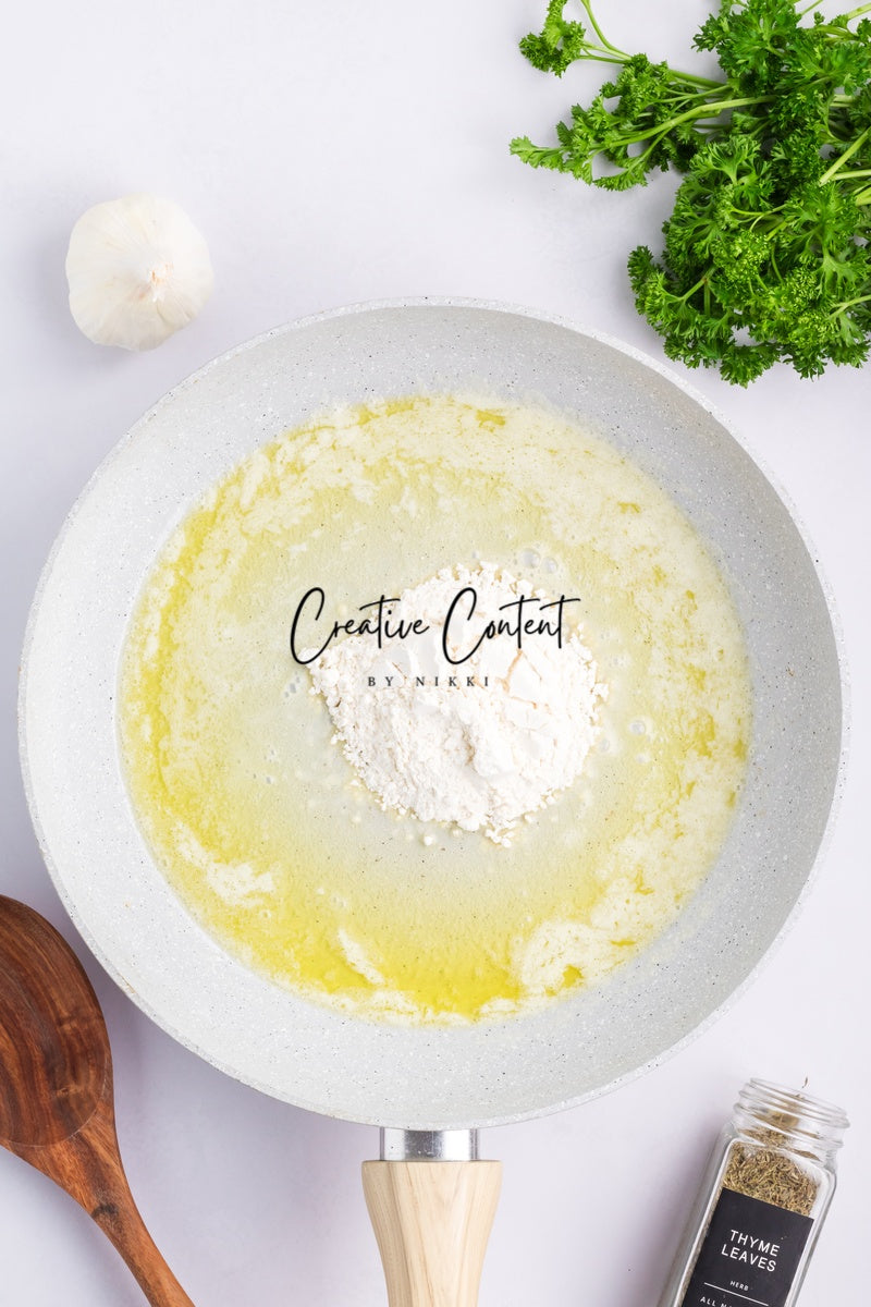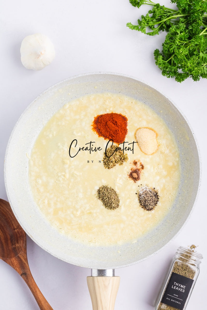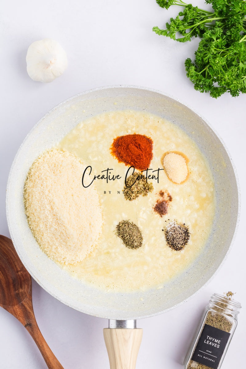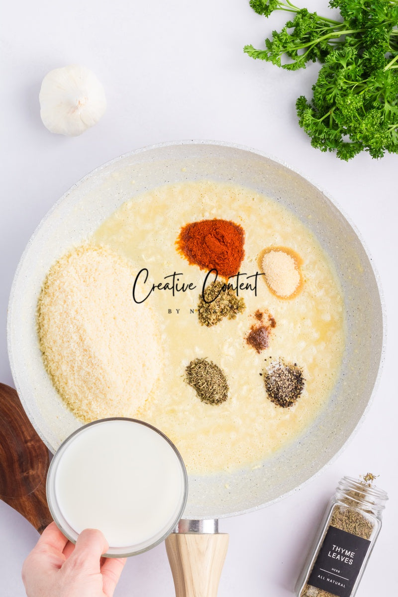 - Ingredients needed; pasta, broccoli, shredded chicken, unsalted butter, all-purpose flour, garlic cloves, milk, heavy cream, parmesan cheese, paprika, dried thyme, garlic powder, onion powder, dried oregano, coarse kosher salt, black pepper, nutmeg, and parsley.