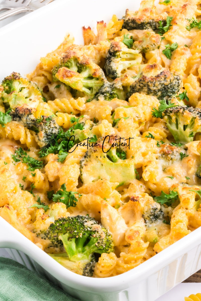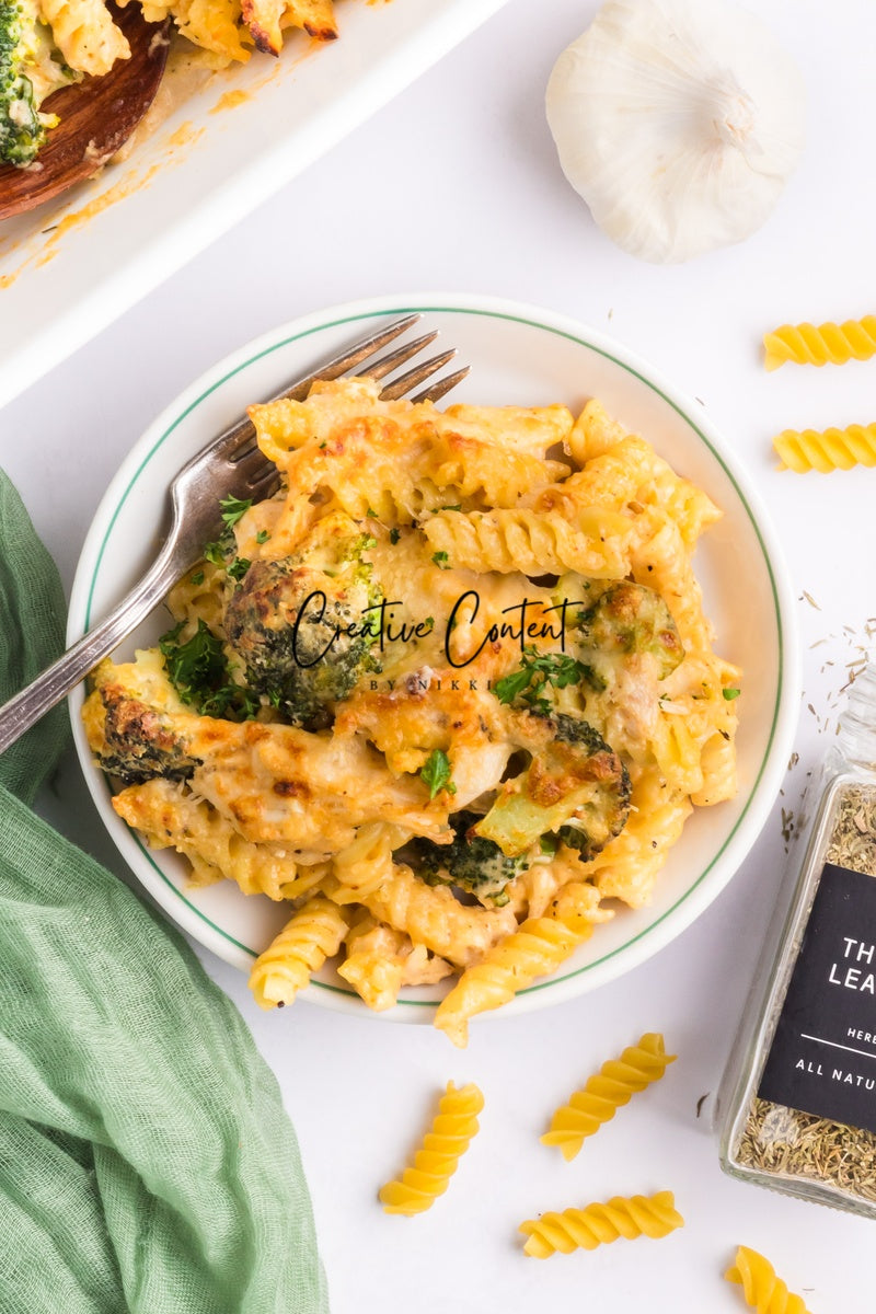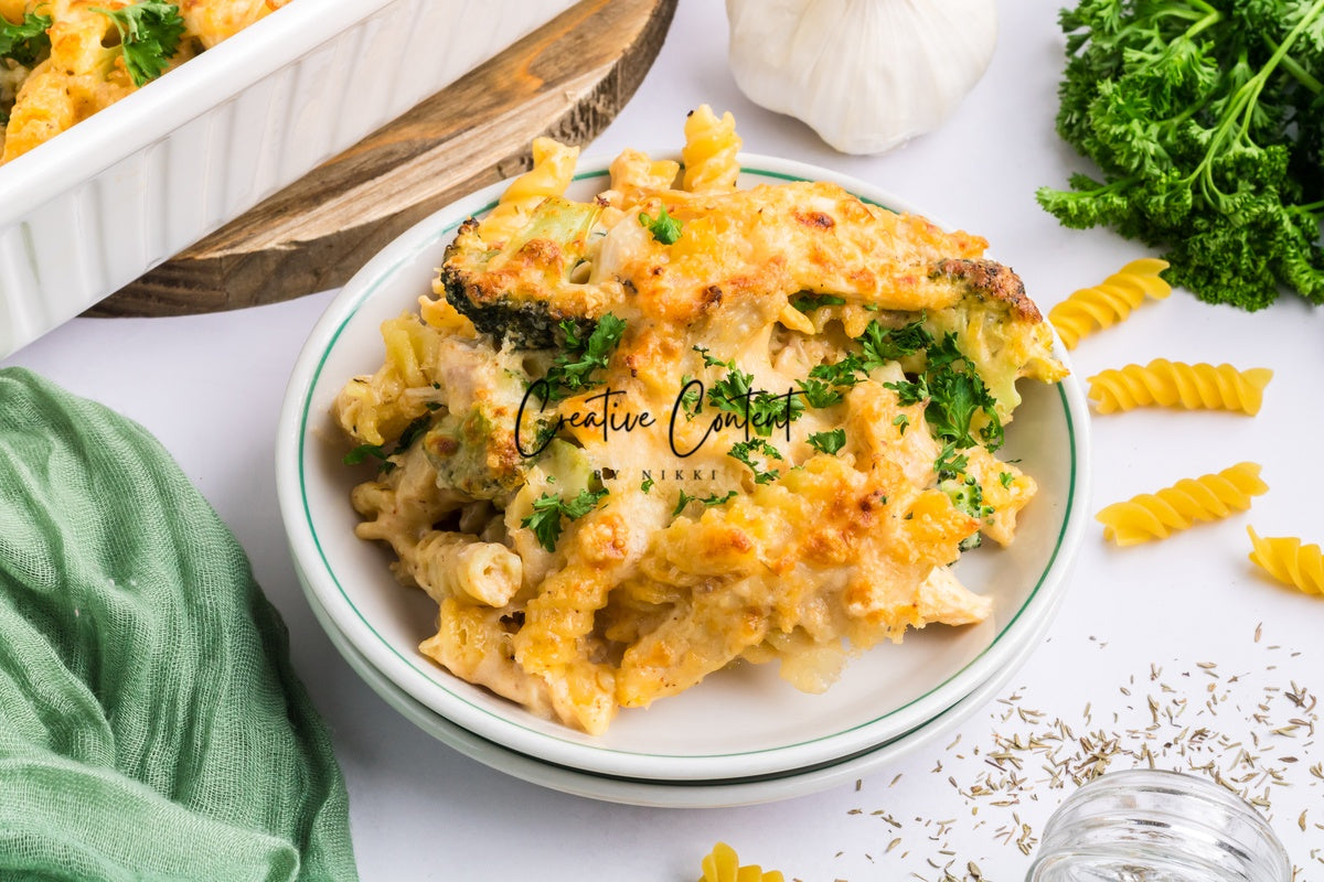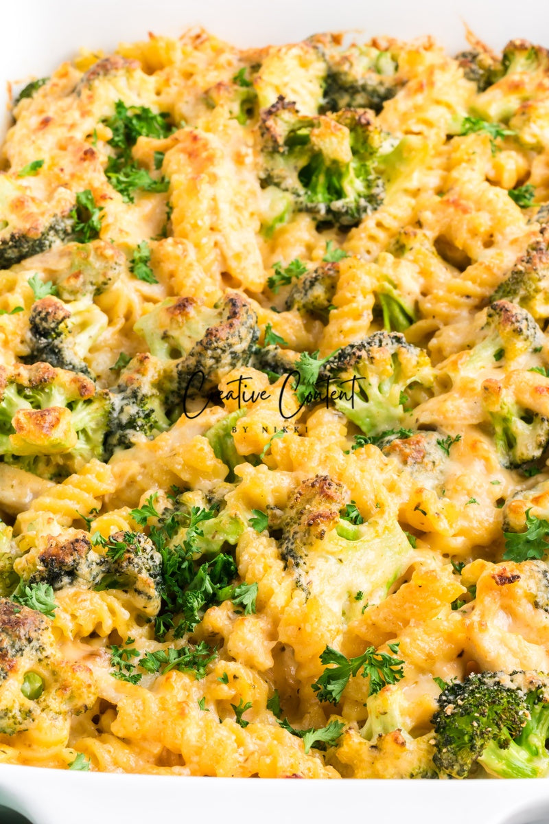 This chicken broccoli and pasta bake is loaded with seasoned shredded chicken, garlic, parmesan cheese, and herbs. The creamy sauce is cheesy and thick to make this a decadent dinner everyone will love. This is a great pasta bake to make when having people over, as you can place it in the oven just as they arrive. It is the perfect dish to have in your dinner rotation, as it is the ultimate comfort food.