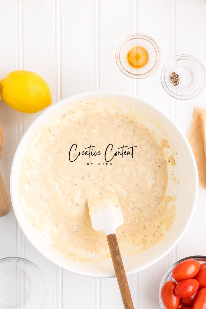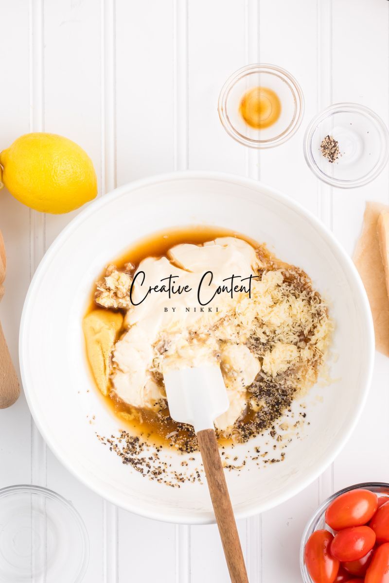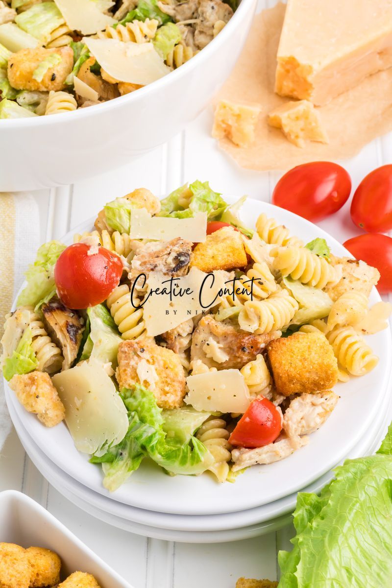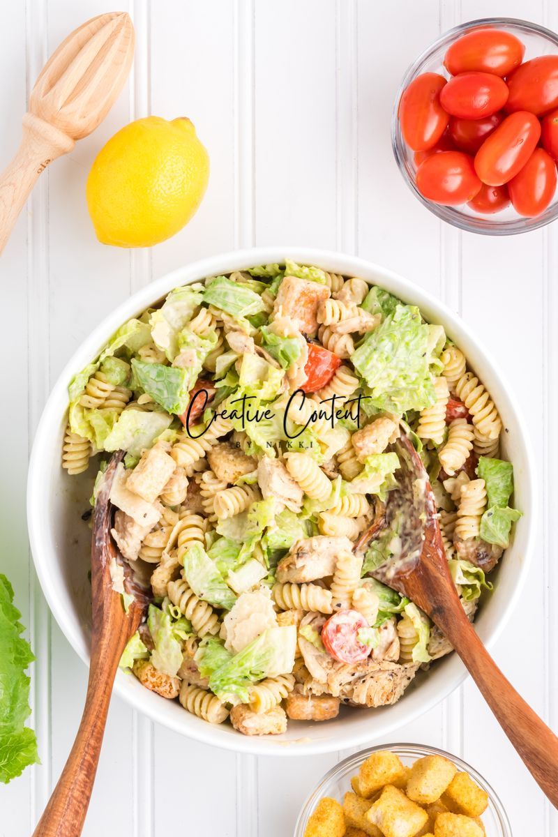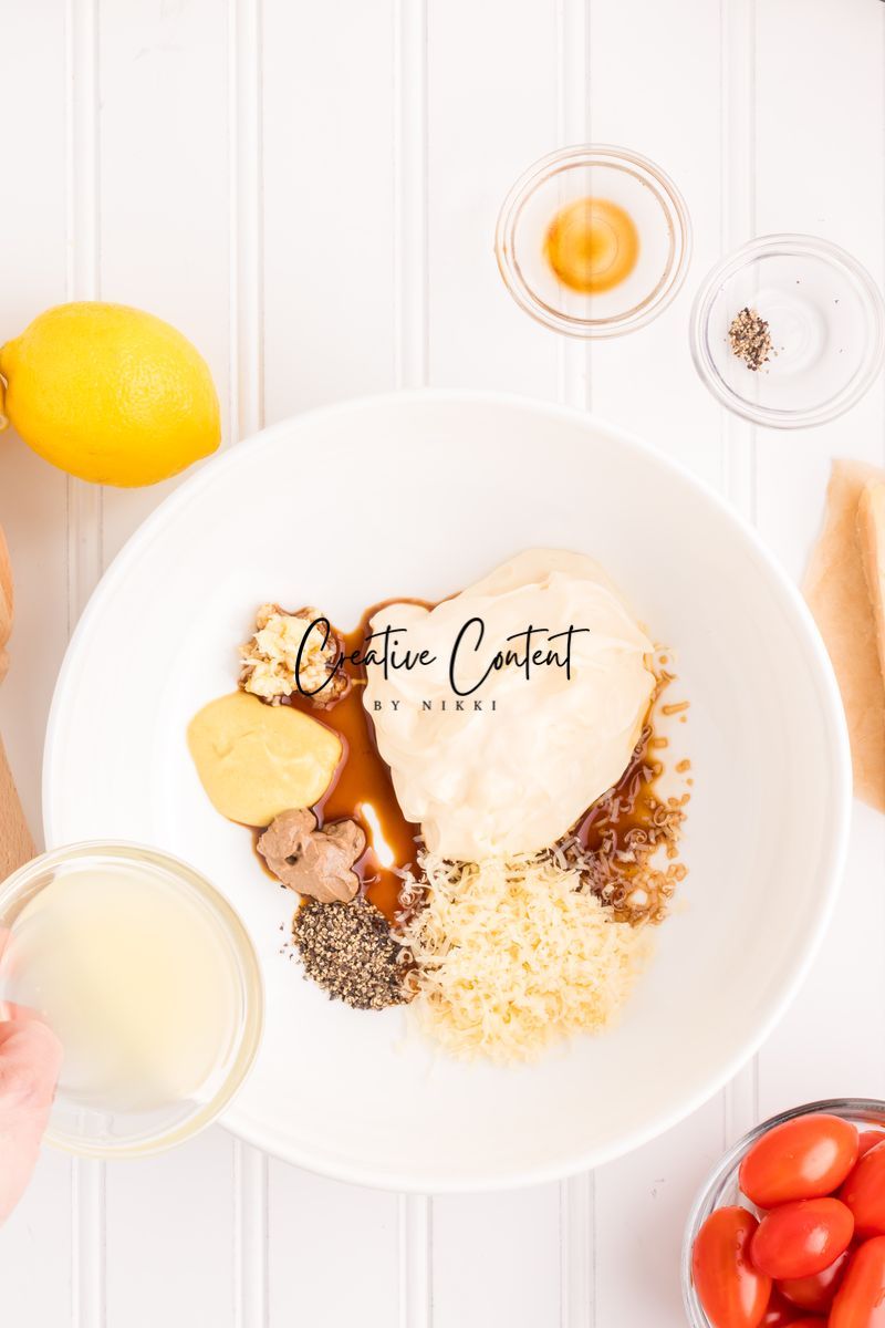 - Ingredients needed; mayonnaise, parmesan cheese, lemon juice, dijon mustard, Worcestershire sauce, minced garlic, lemon juice, anchovy paste, pasta of your choice, 1 pound of chicken of your choice, romaine hearts, cherry tomatoes, croutons, and parmesan cheese.