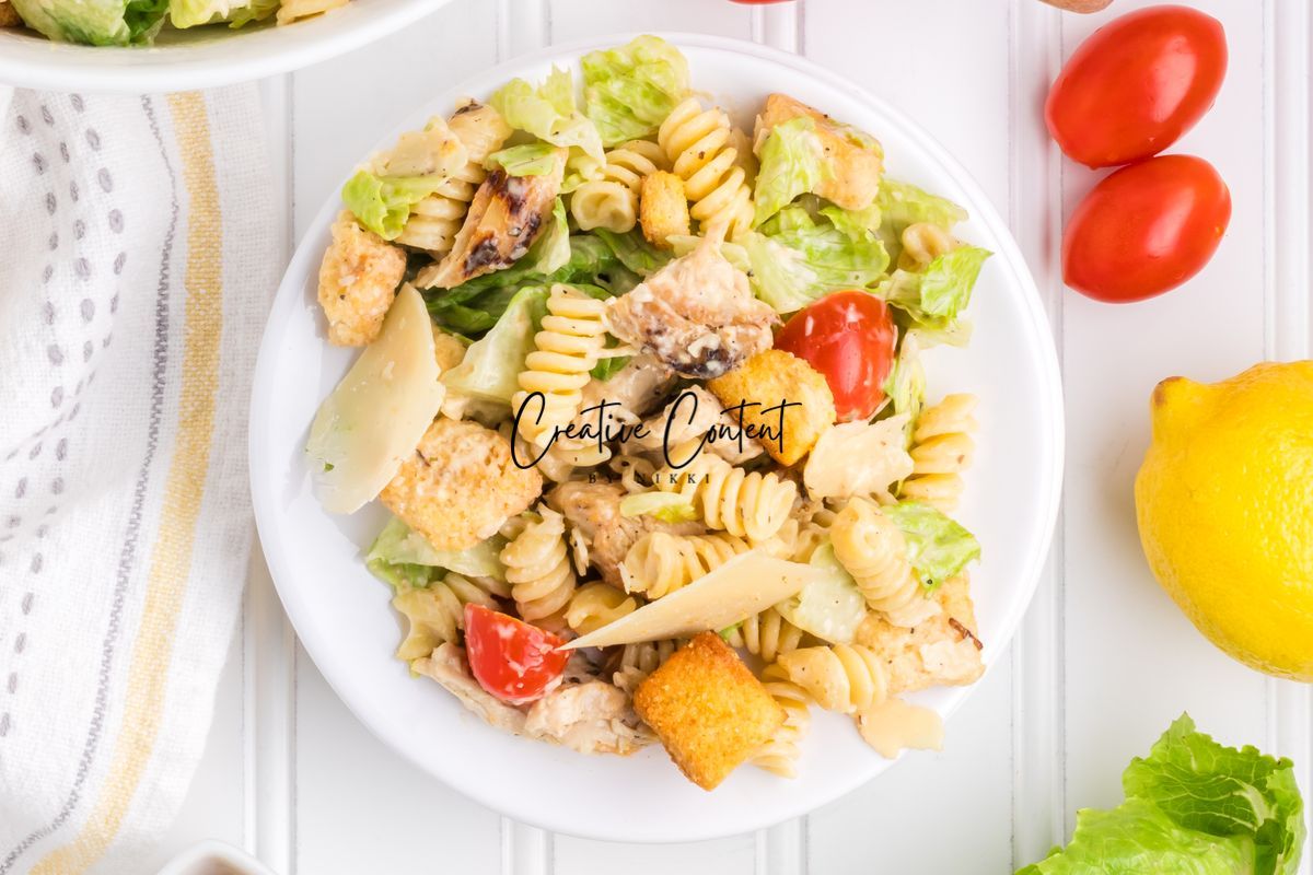 This Chicken Caesar pasta salad is made with an easy-peasy Caesar dressing that is made with anchovies, garlic, and mayonnaise. The combination of the lettuce and pasta along with the tomatoes and chicken makes the perfect meal. This is a great salad for your next barbecue, picnic, or family reunion.