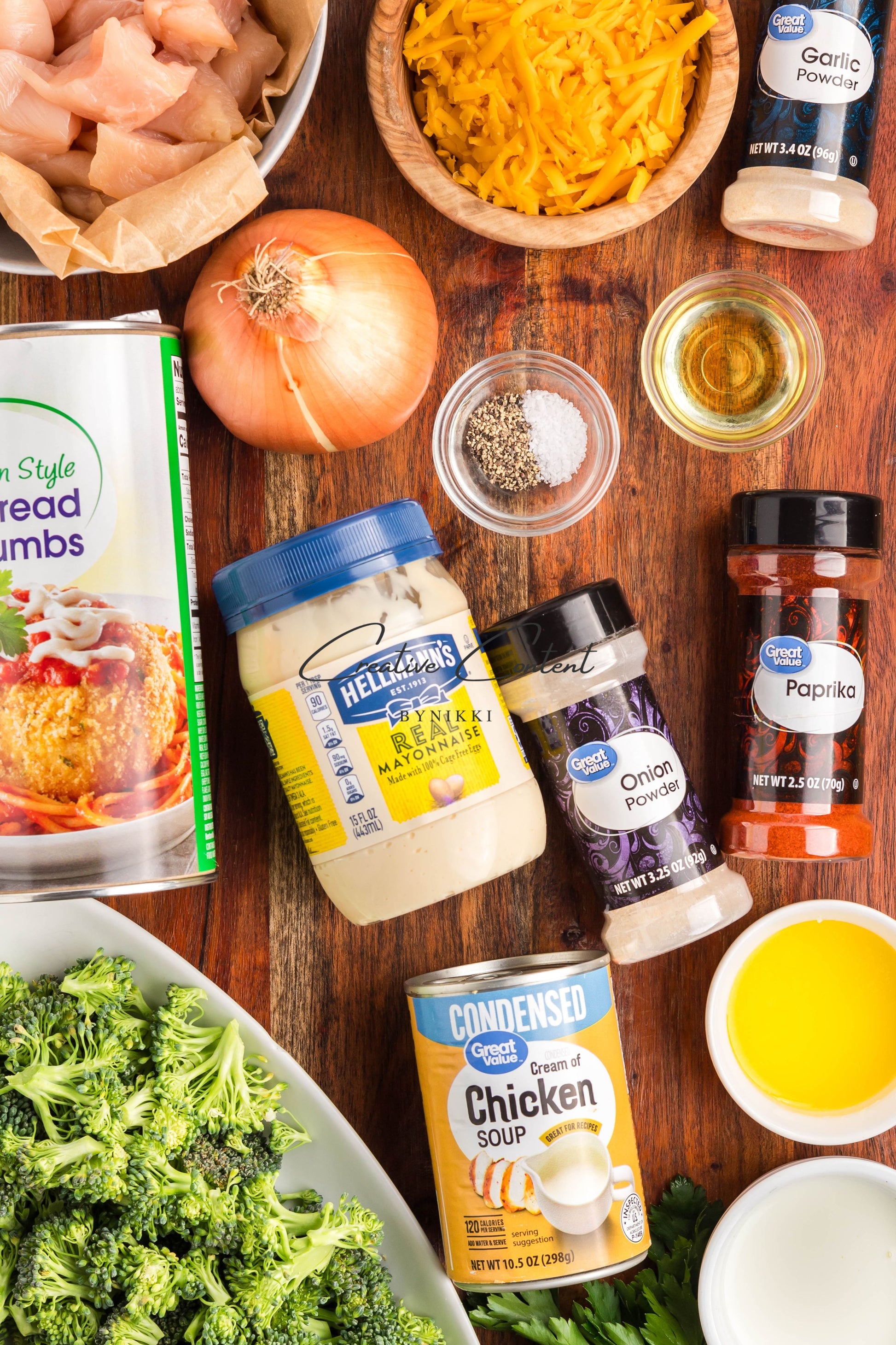 - Ingredients: avocado oil, skinless chicken, diced yellow onions, coarse kosher salt, black pepper, fresh broccoli florets, cream of chicken soup, milk, mayonnaise, garlic powder, onion powder, paprika, shredded cheddar cheese, chopped parsley