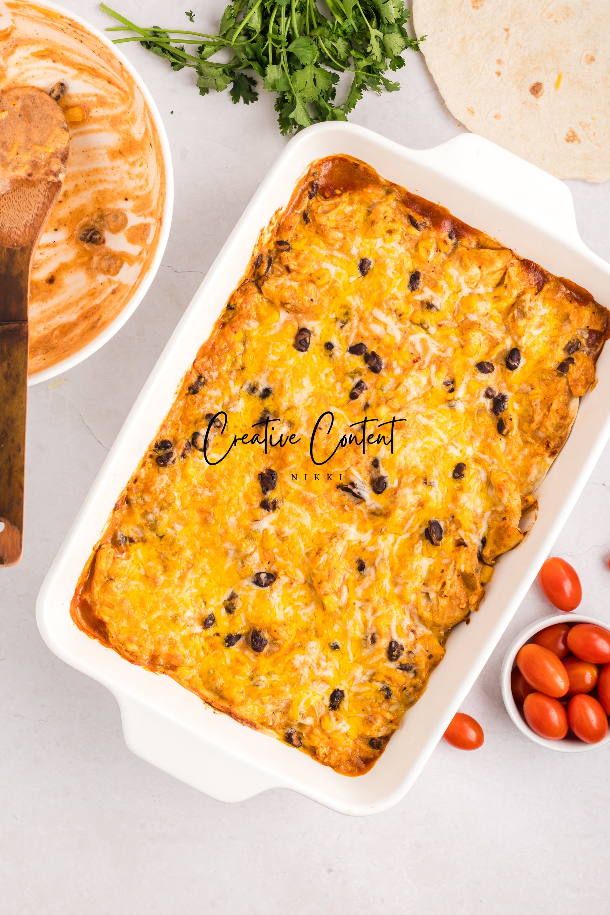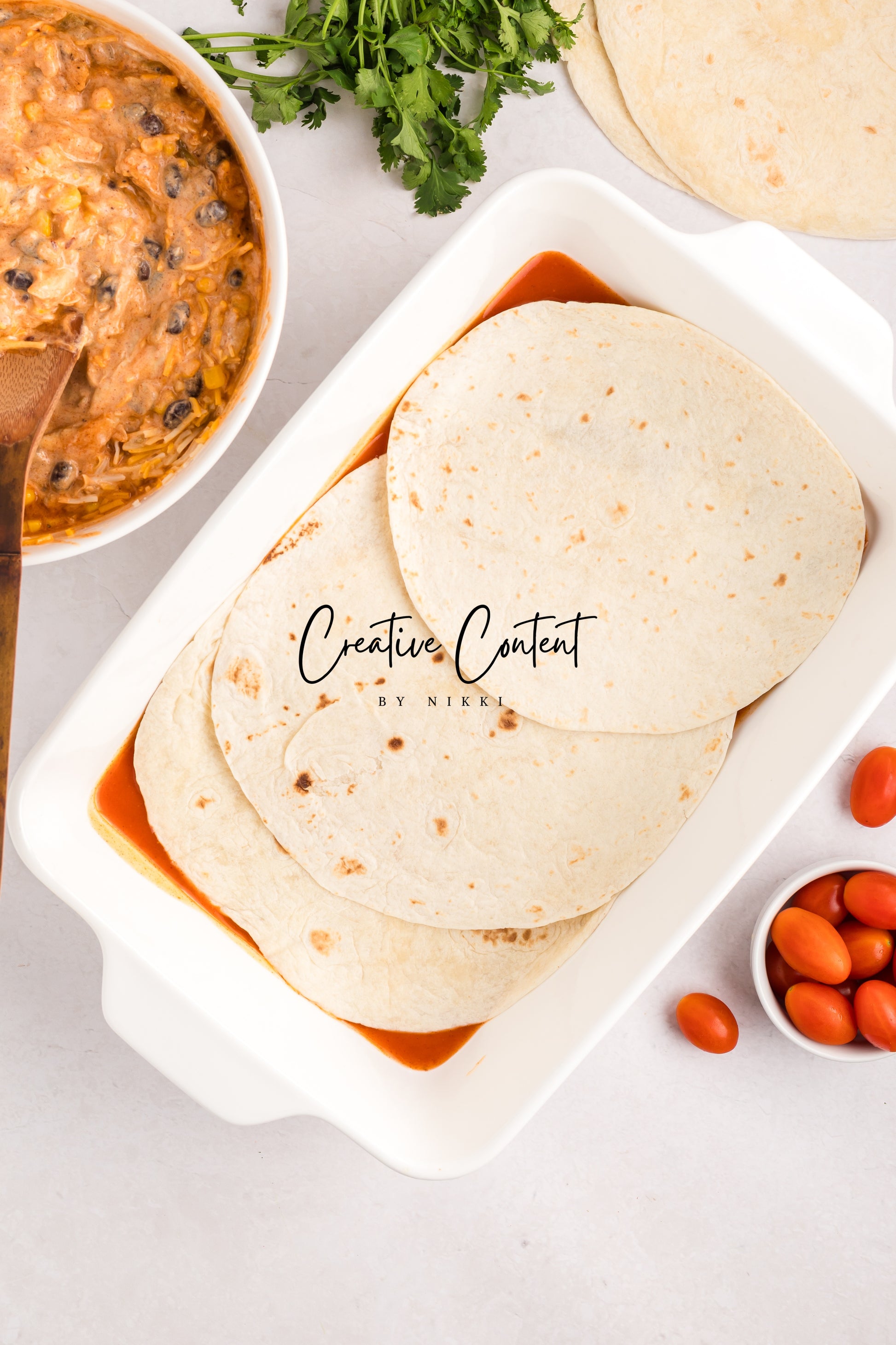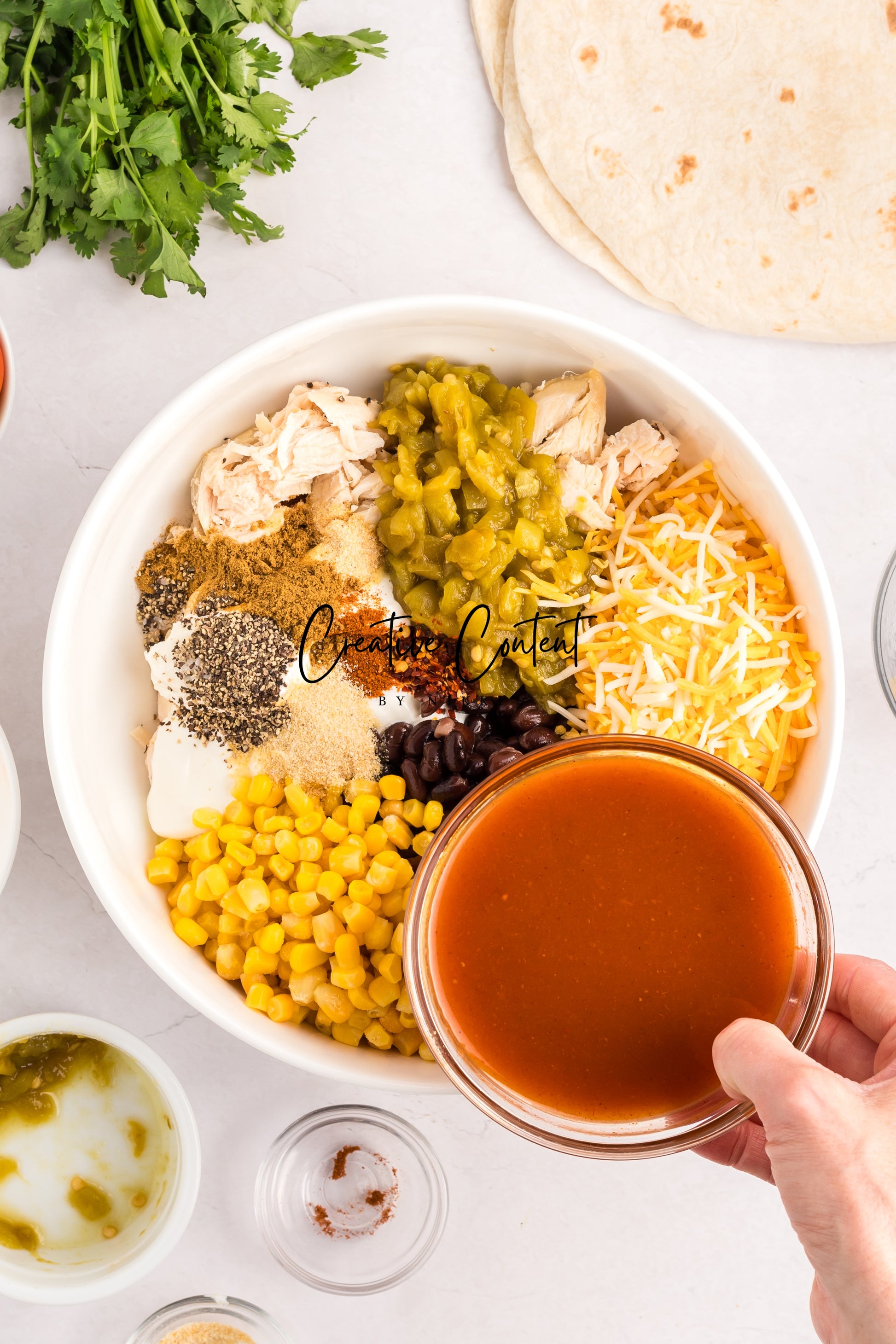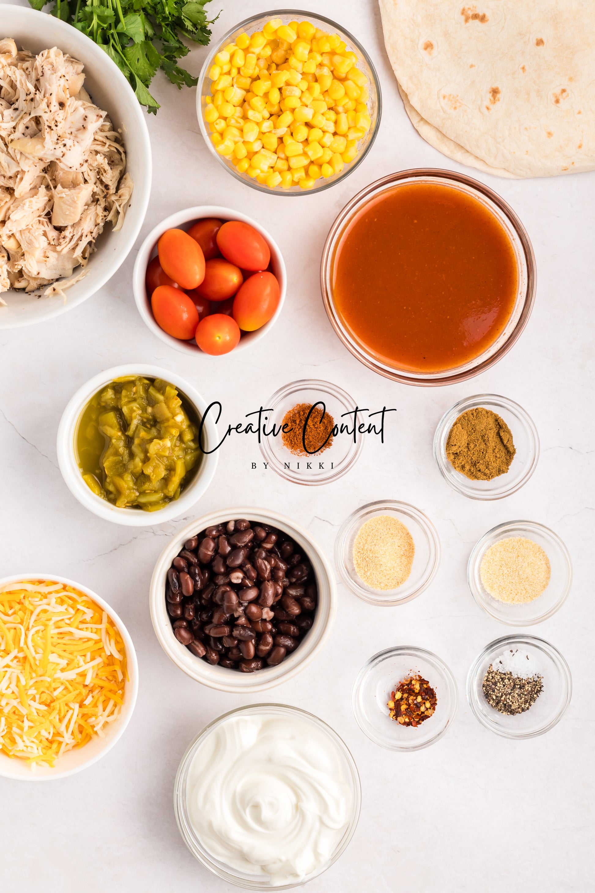 - Featured Ingredients; red enchilada sauce, Mexican cheese blend, sour cream, green chiles, seasonings, tortilla shells, cooked chicken, cherry tomatoes, and cilantro.