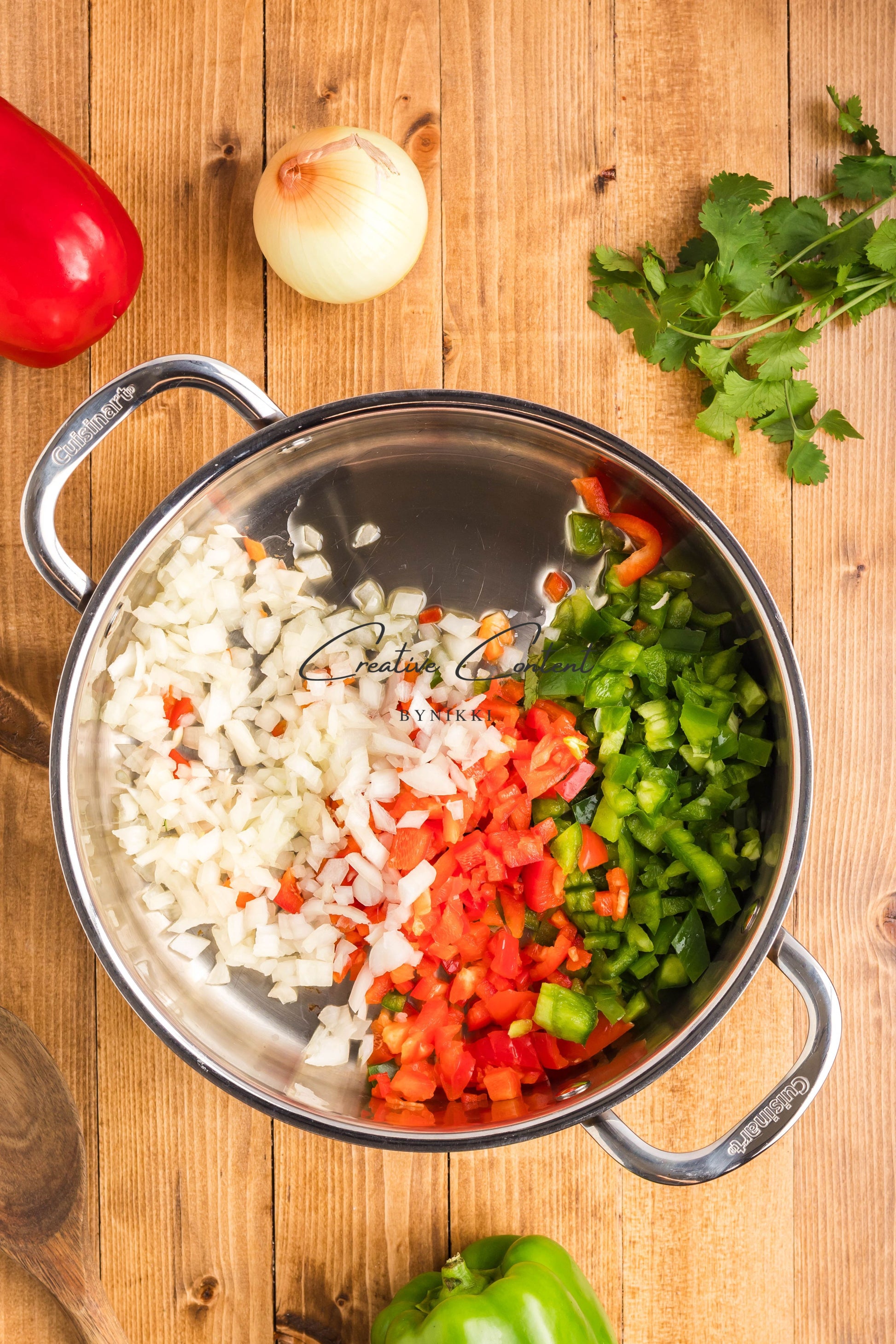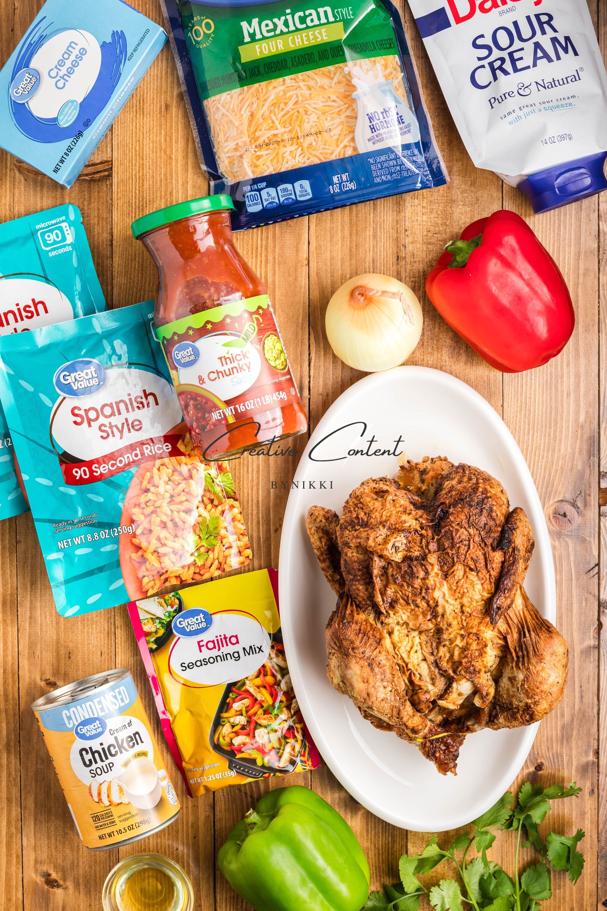 - Ingredients: green bell pepper, red bell pepper, yellow onion, avocado oil, cream of chicken soup, salsa, cream cheese, Mexican shredded cheese, sour cream, fajita seasoning, rotisserie chicken, Spanish style rice, chopped cilantro