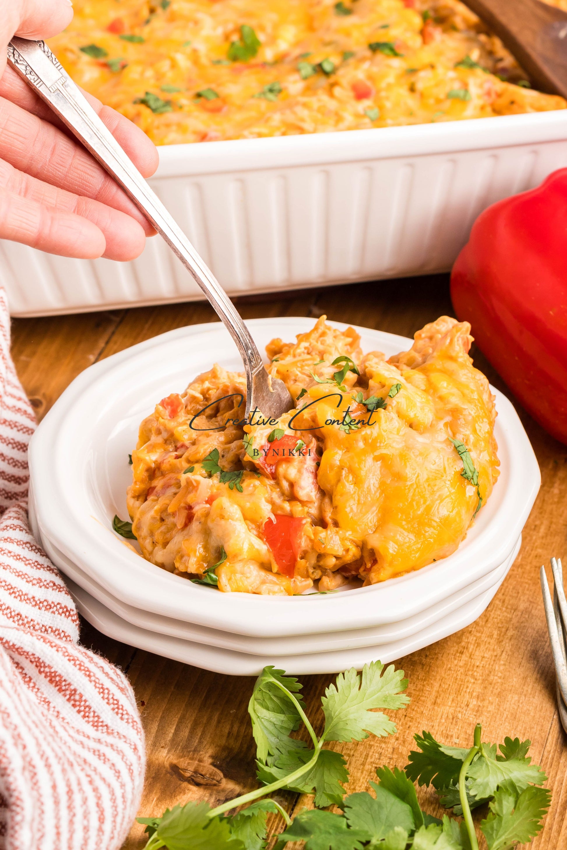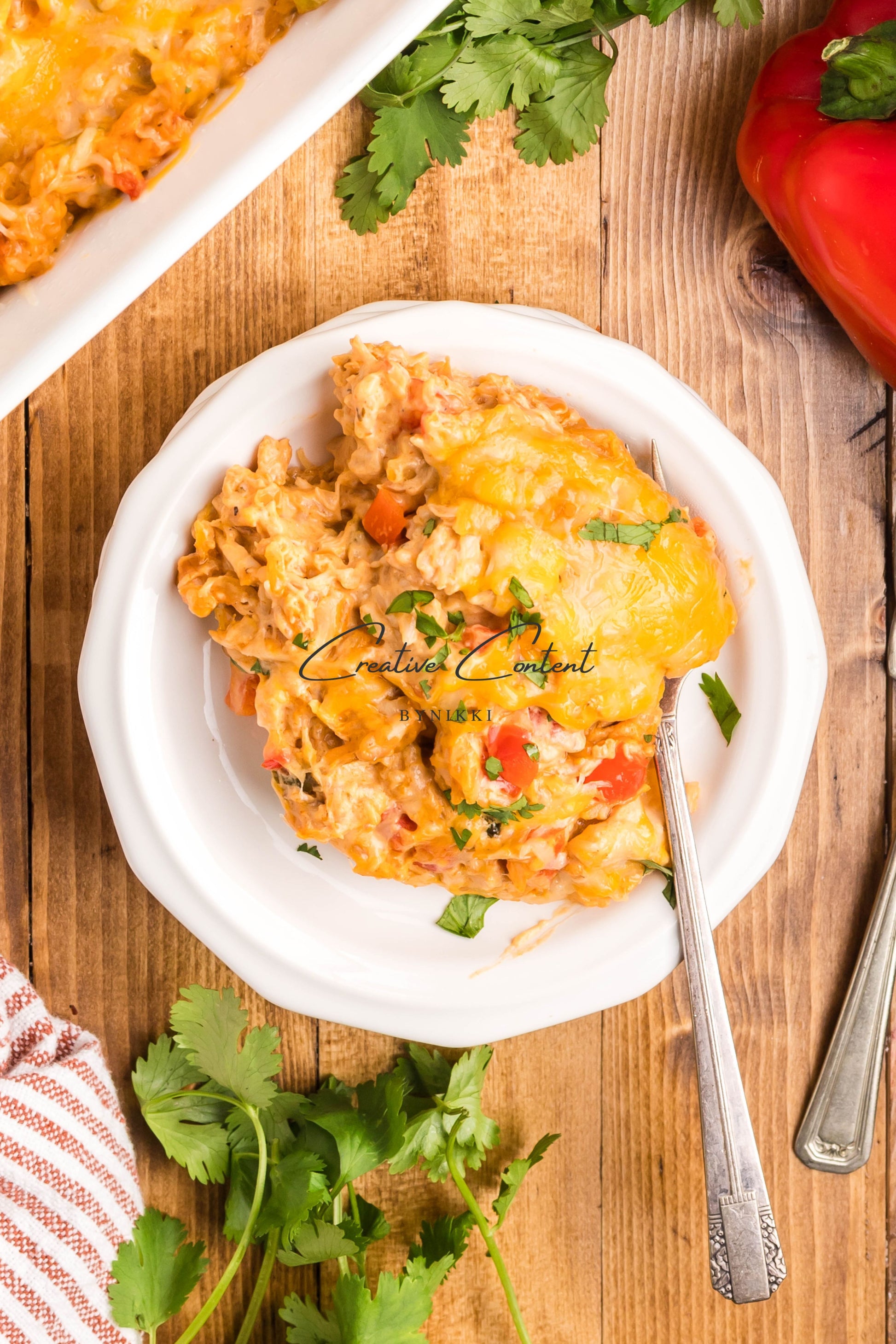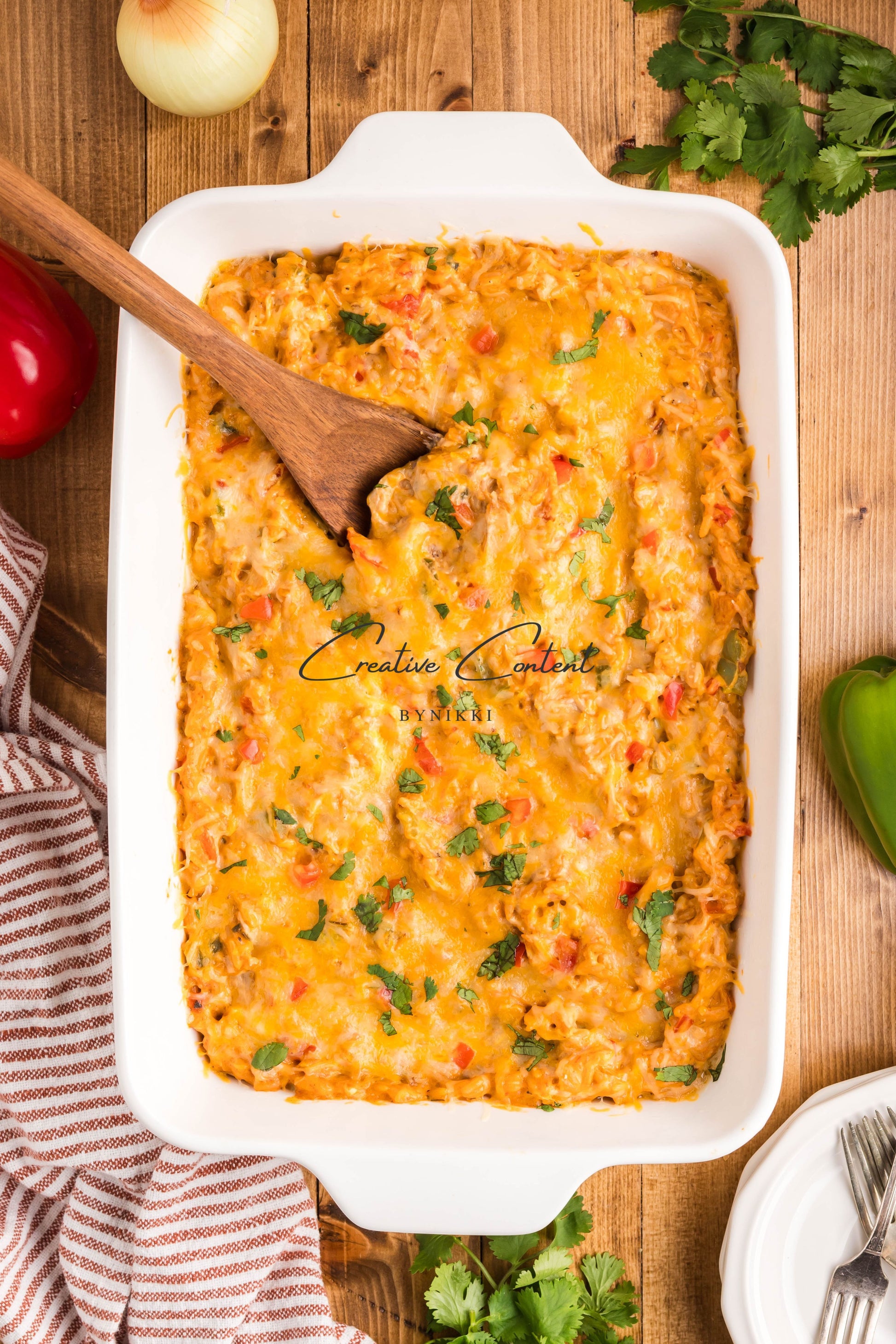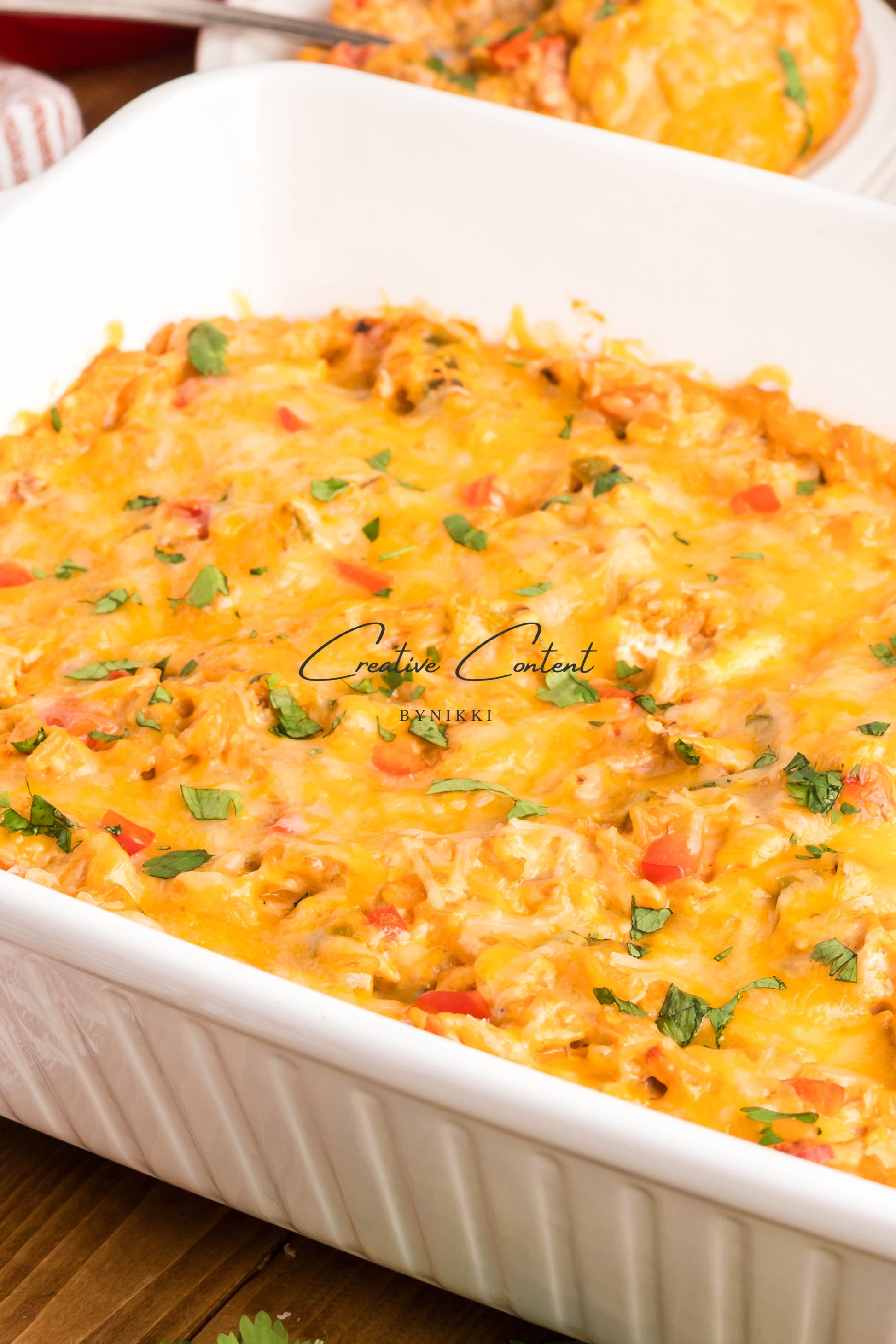 This chicken fajita casserole is a flavorful and satisfying dish that's perfect for any occasion. Packed with tender rotisserie chicken, bell peppers, and onions, it's a comforting meal everyone will love. The creamy mixture of cream cheese, sour cream, and cream of chicken soup creates a rich, smooth base that perfectly complements the spices. Topped with melted Mexican cheese and a hint of cilantro, each bite is full of savory goodness
