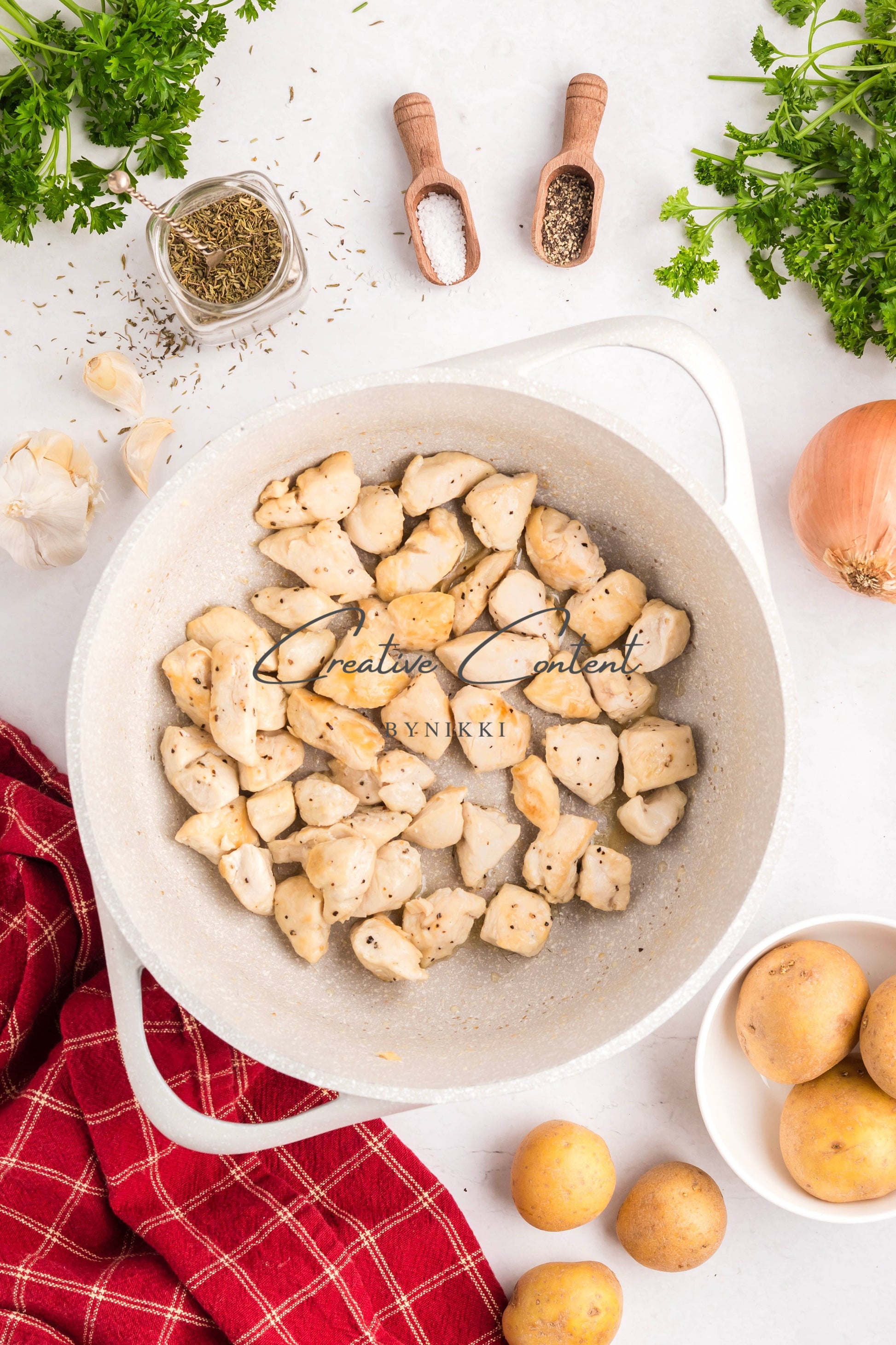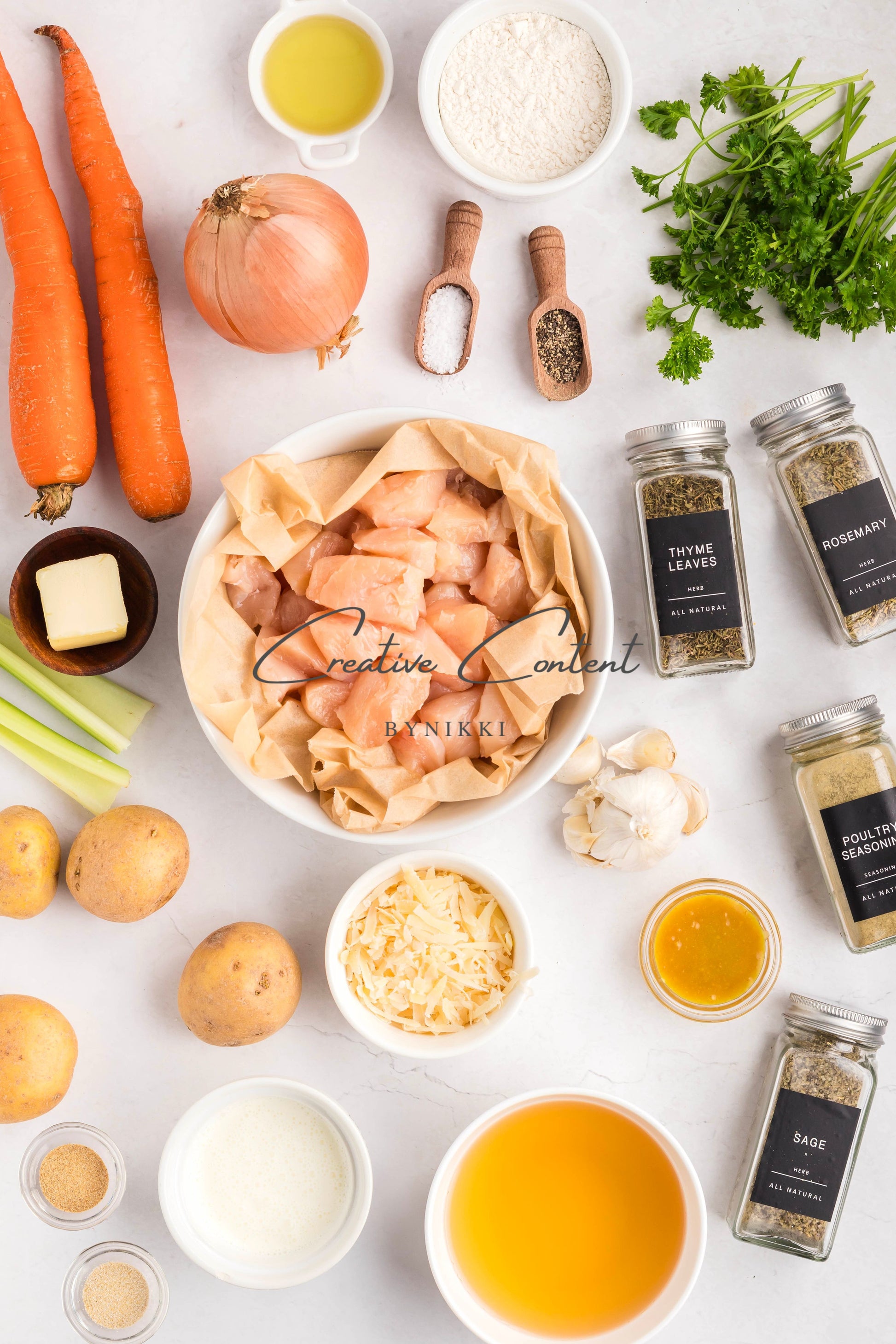 - Ingredients: chicken, avocado oil, coarse kosher salt, black pepper, unsalted butter, yellow onion, celery stalks, carrots, garlic cloves, all-purpose flour, low-sodium chicken stock, yellow potatoes, low-sodium chicken Better Than Bouillon, dried thyme, rosemary, poultry seasoning, garlic powder, onion powder, dried sage, grated parmesan, heavy cream, parsley
