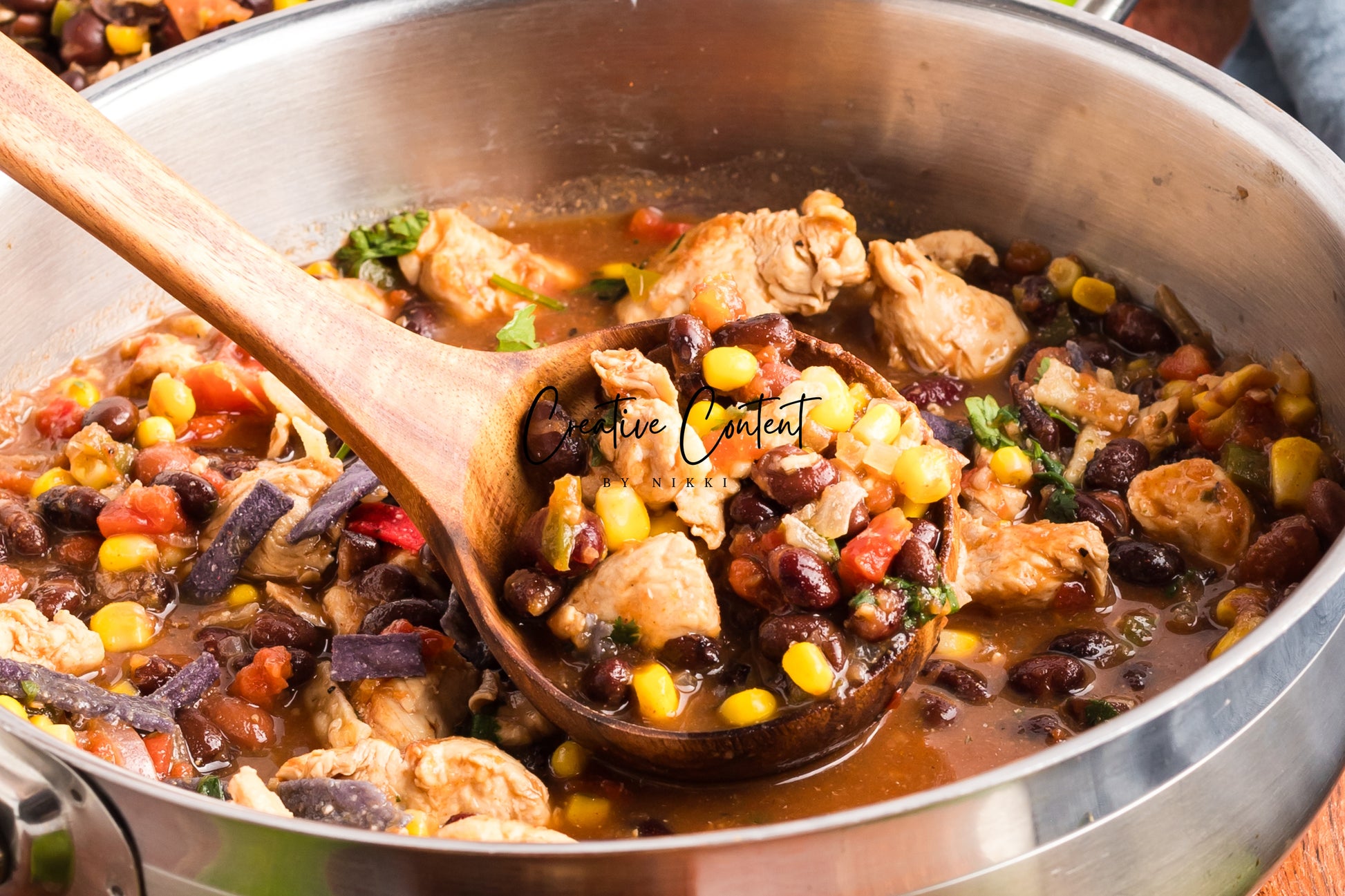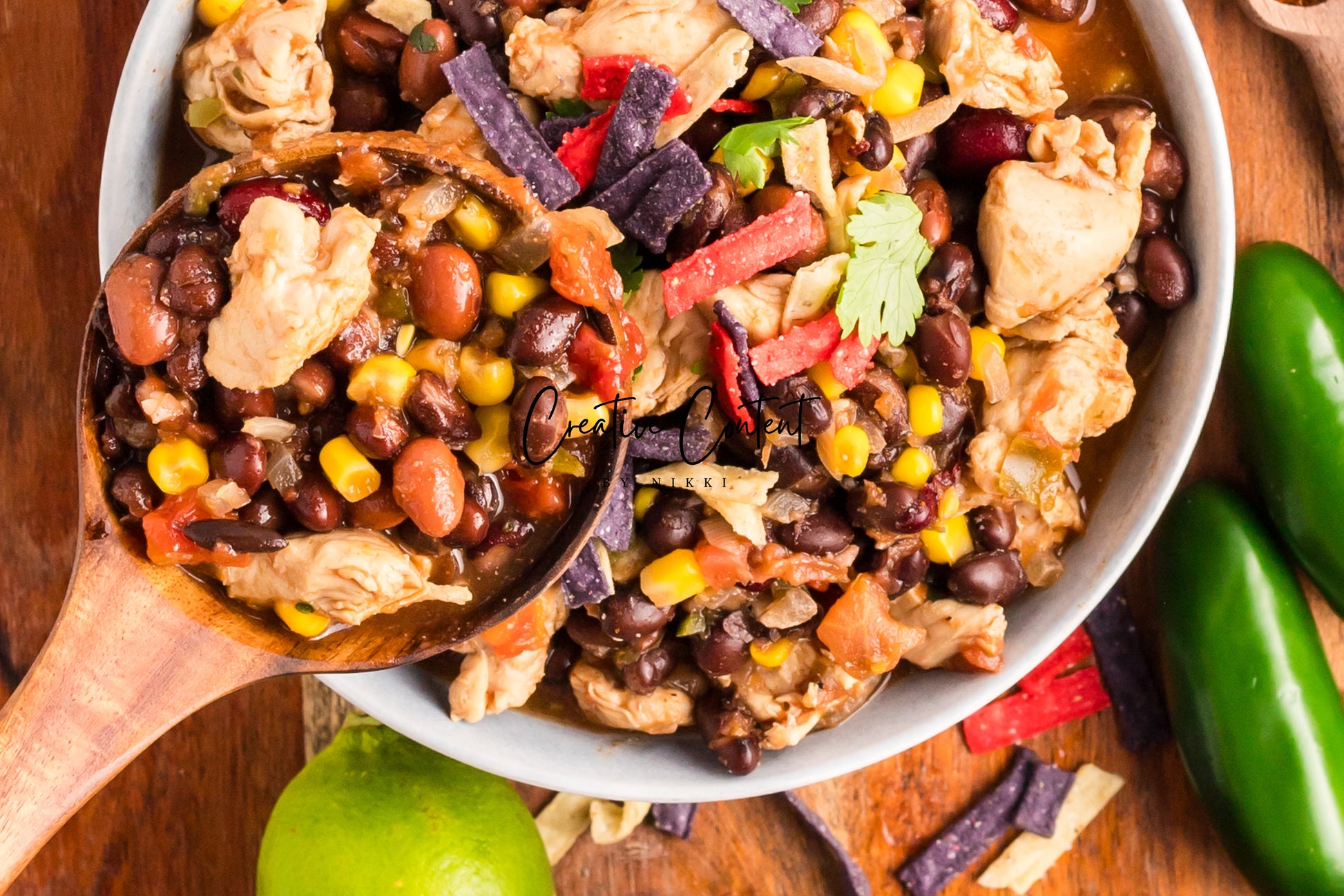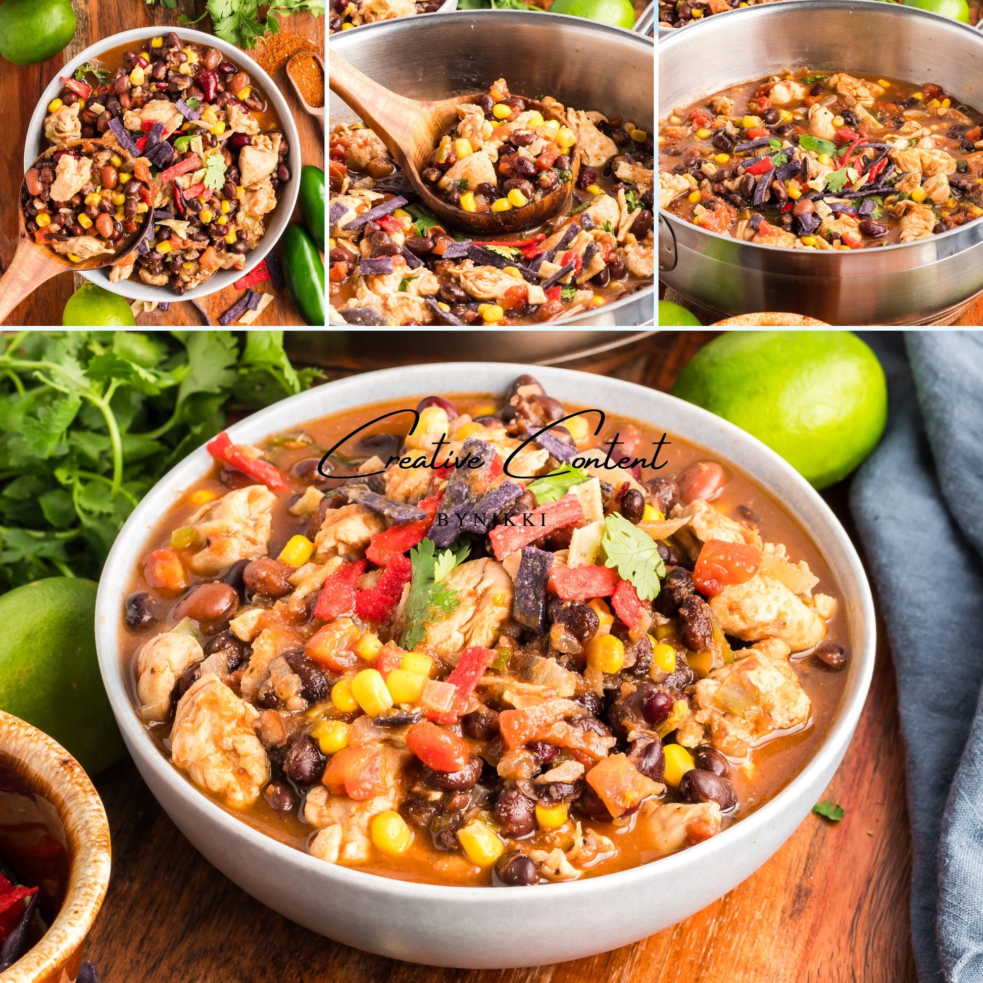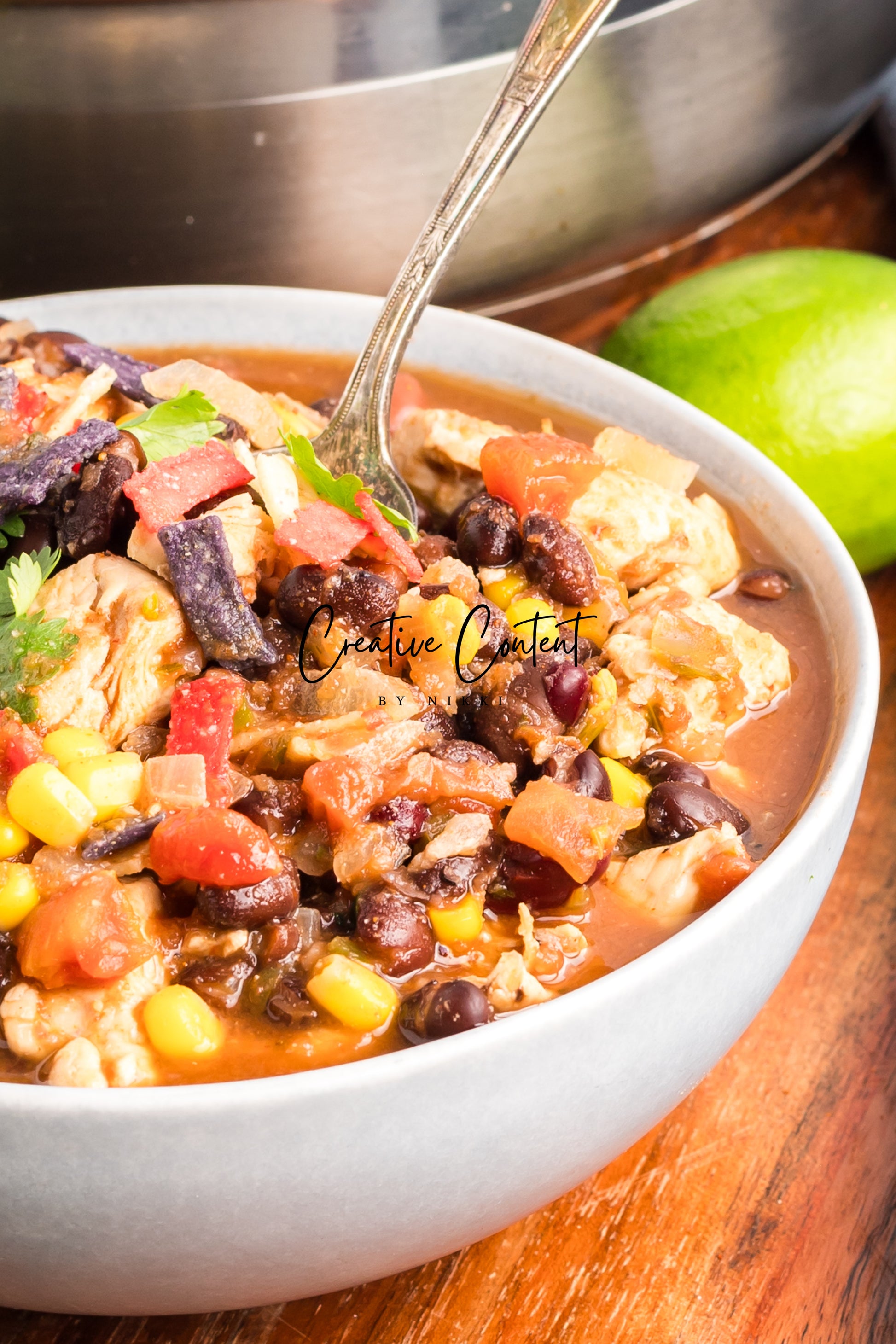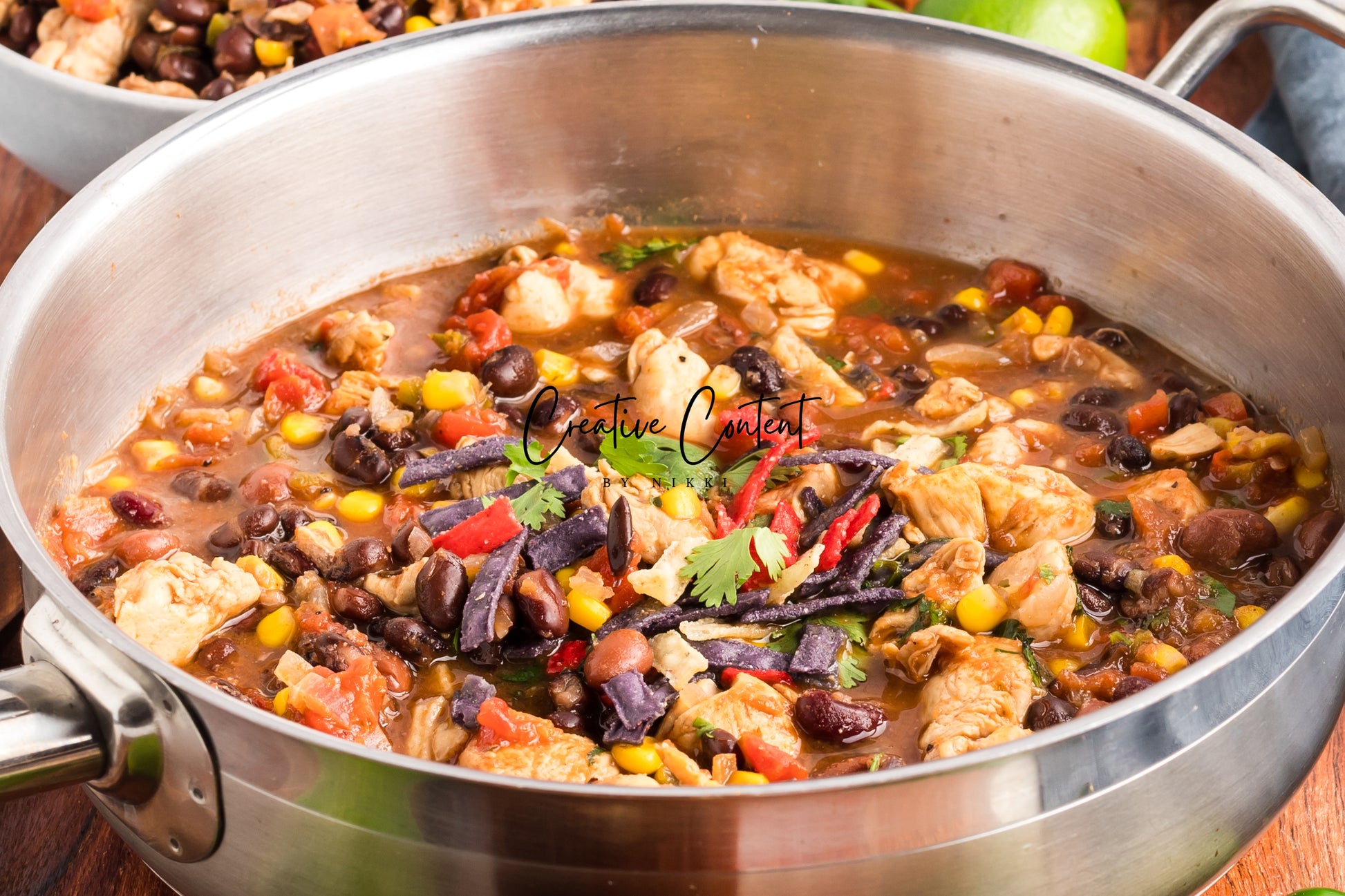 - Featured Ingredients; chicken, yellow onion, avocado oil, chili beans, black beans, chicken stock, corn salsa, diced tomatoes with green chiles, lime, seasonings, sour cream, cheddar cheese, and tortilla strips.
