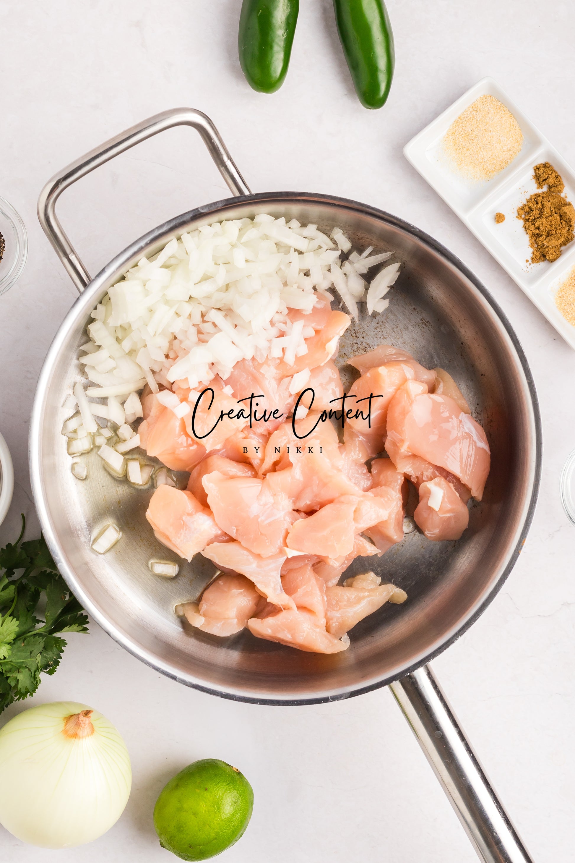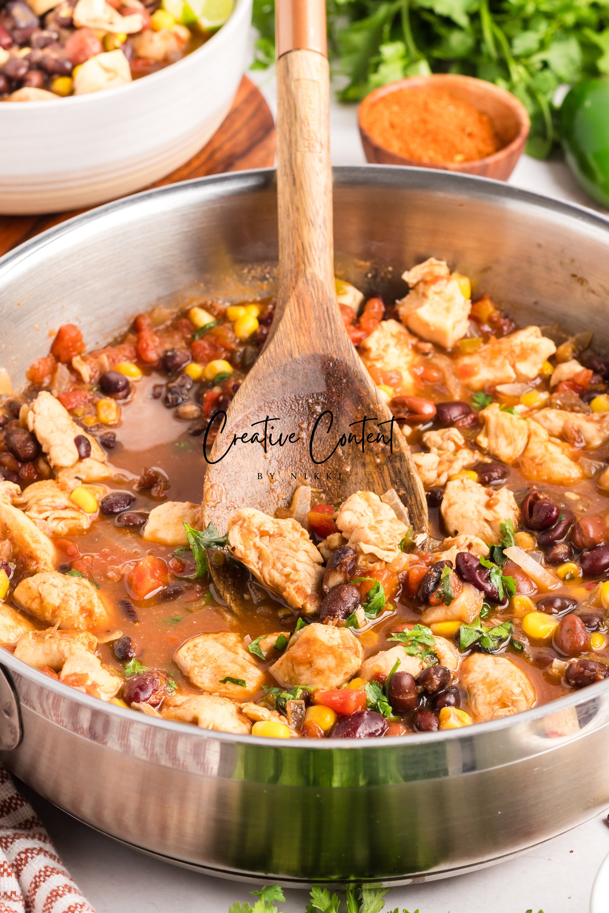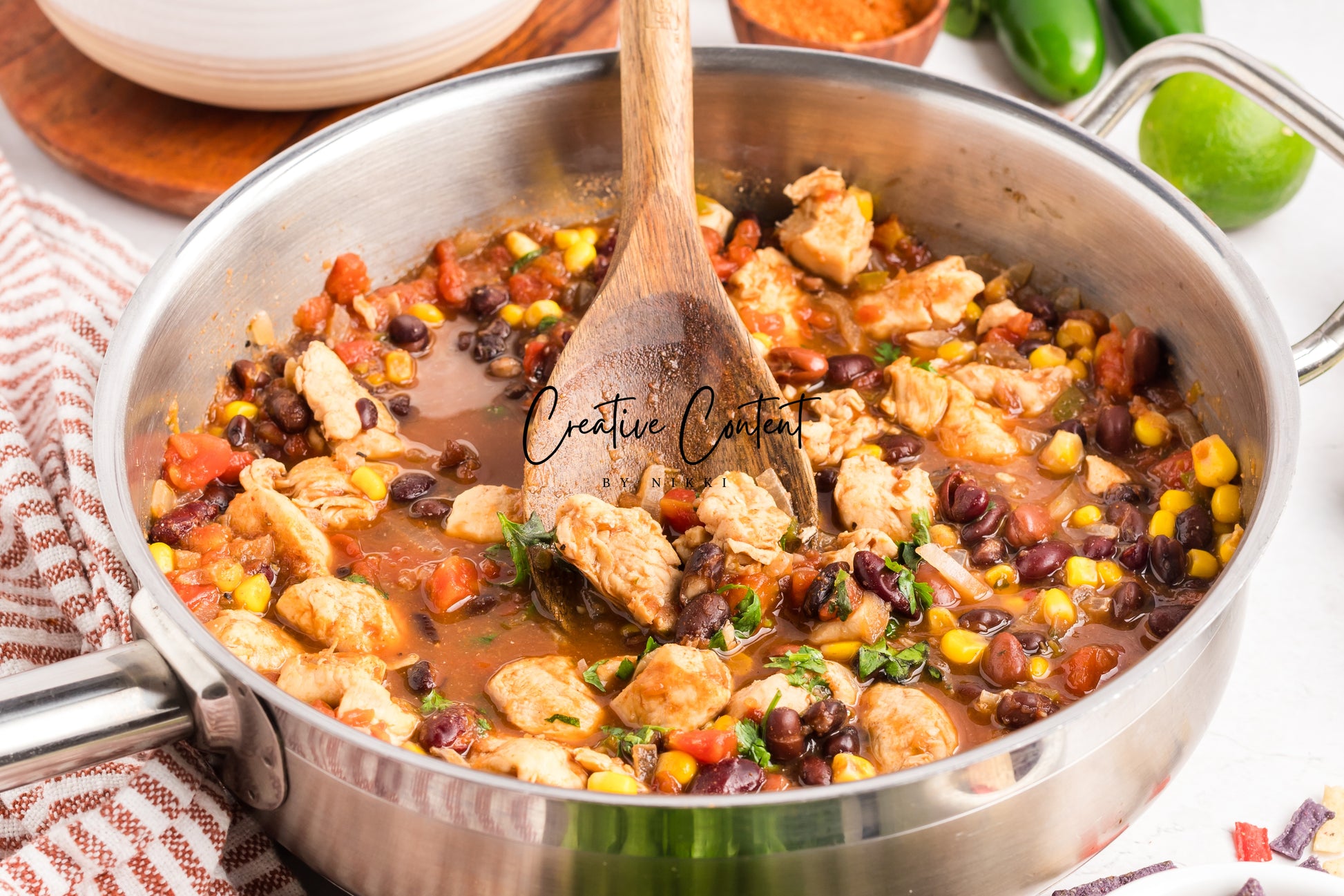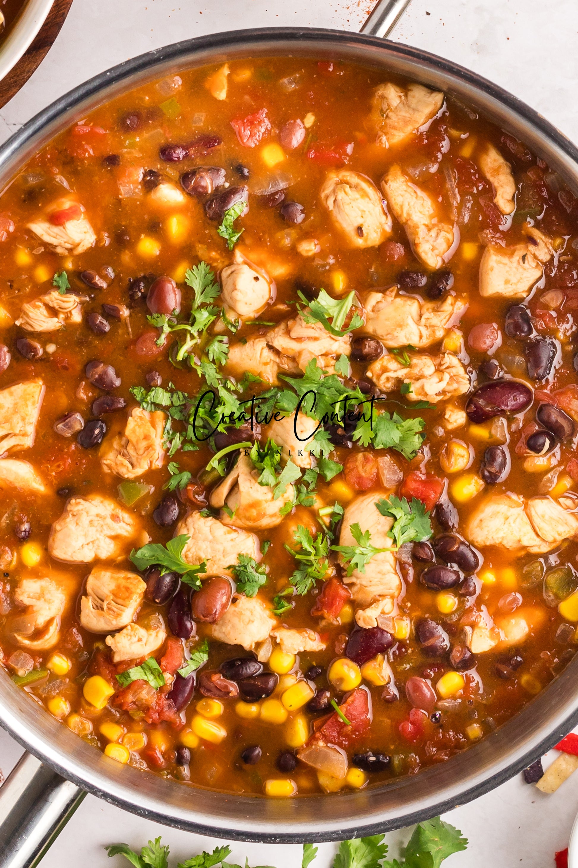 - Featured Ingredients; chicken, yellow onion, avocado oil, chili beans, black beans, chicken stock, corn salsa, diced tomatoes with green chiles, lime, seasonings, sour cream, cheddar cheese, and tortilla strips.
