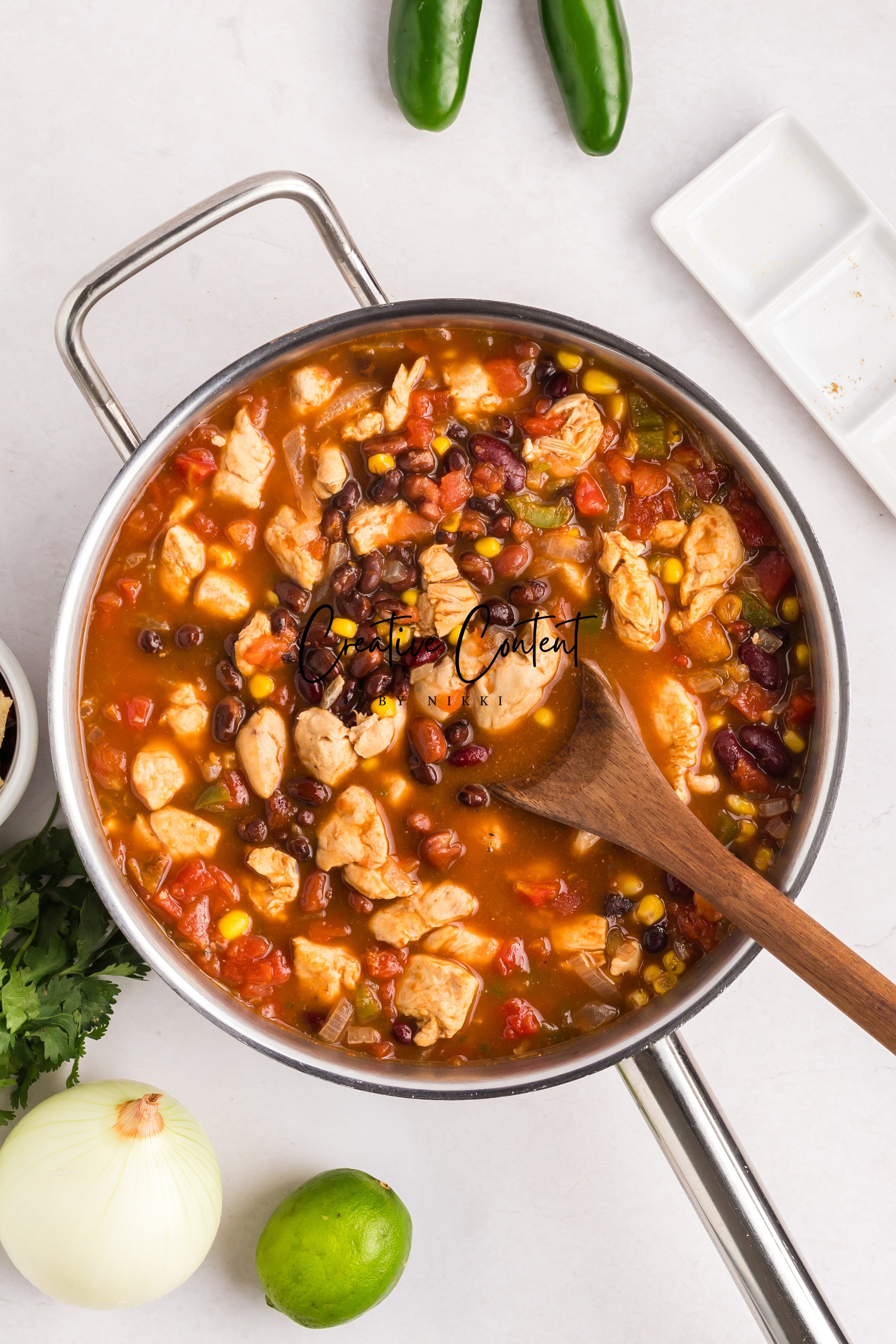 This chicken taco soup is beyond flavorful with the seasonings, salsa, green chiles, and lime juice. The beans and corn along with the sauteed chicken make for the best fall and winter soup. If you are looking for a soup to serve a crowd this one is it.
