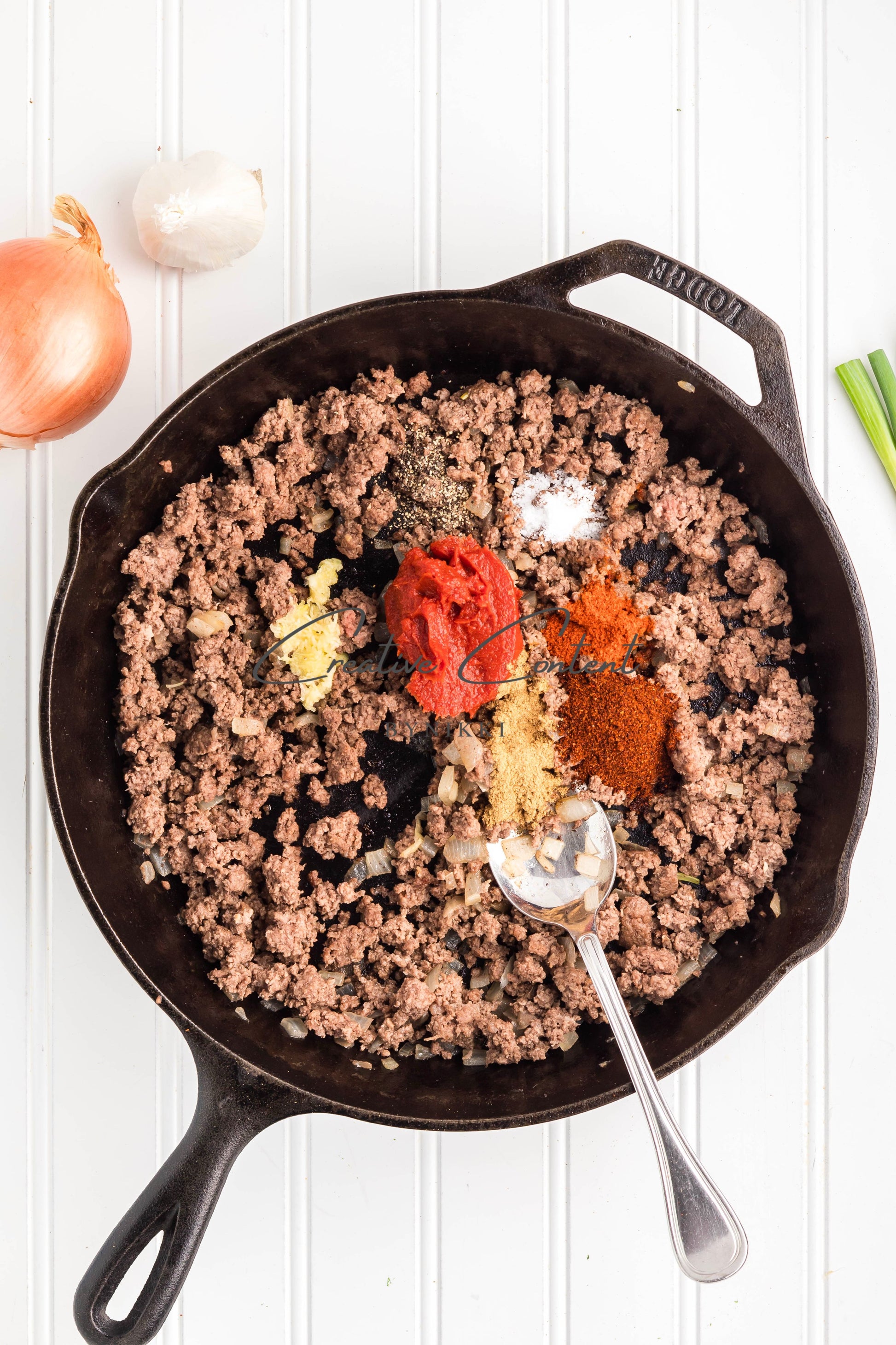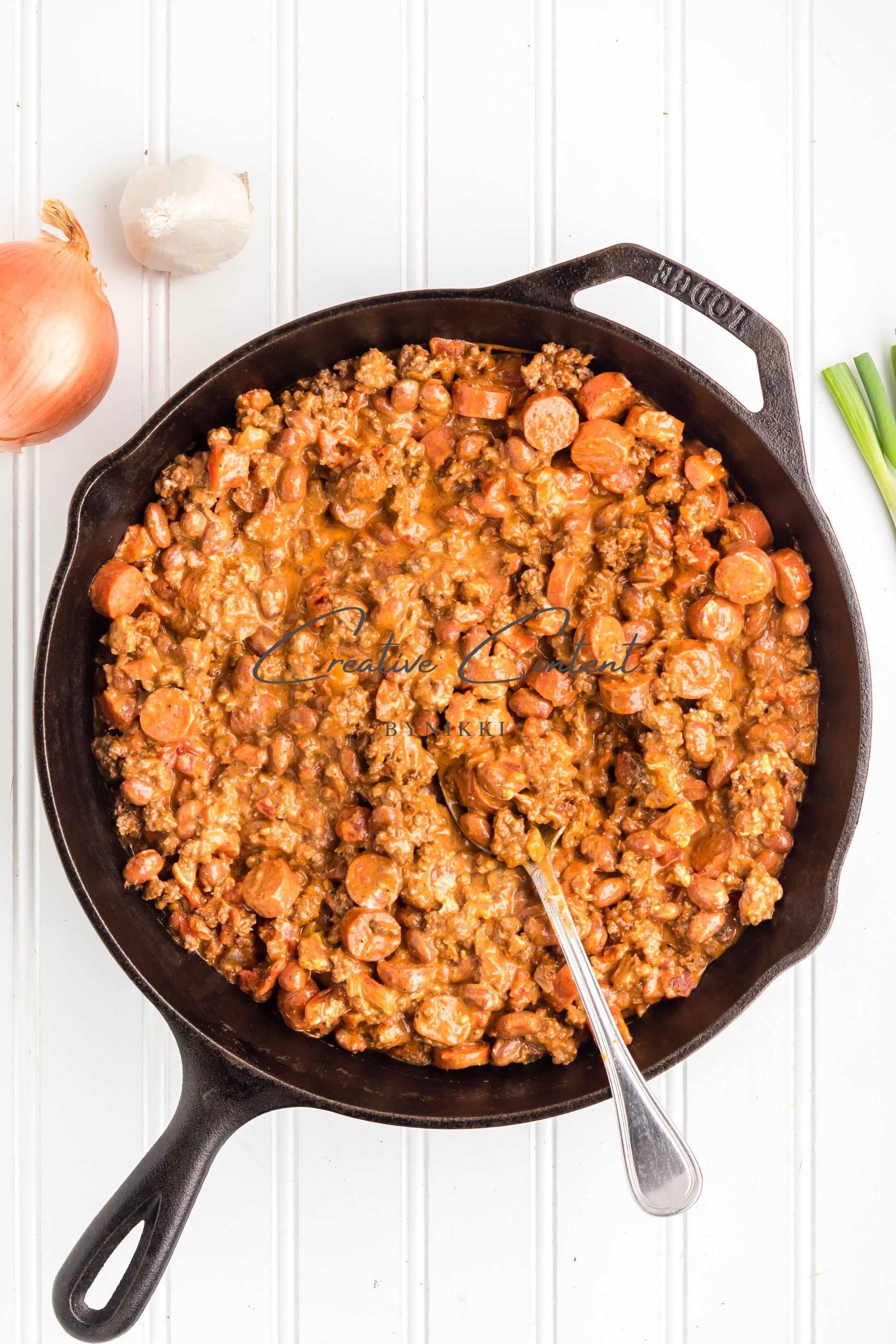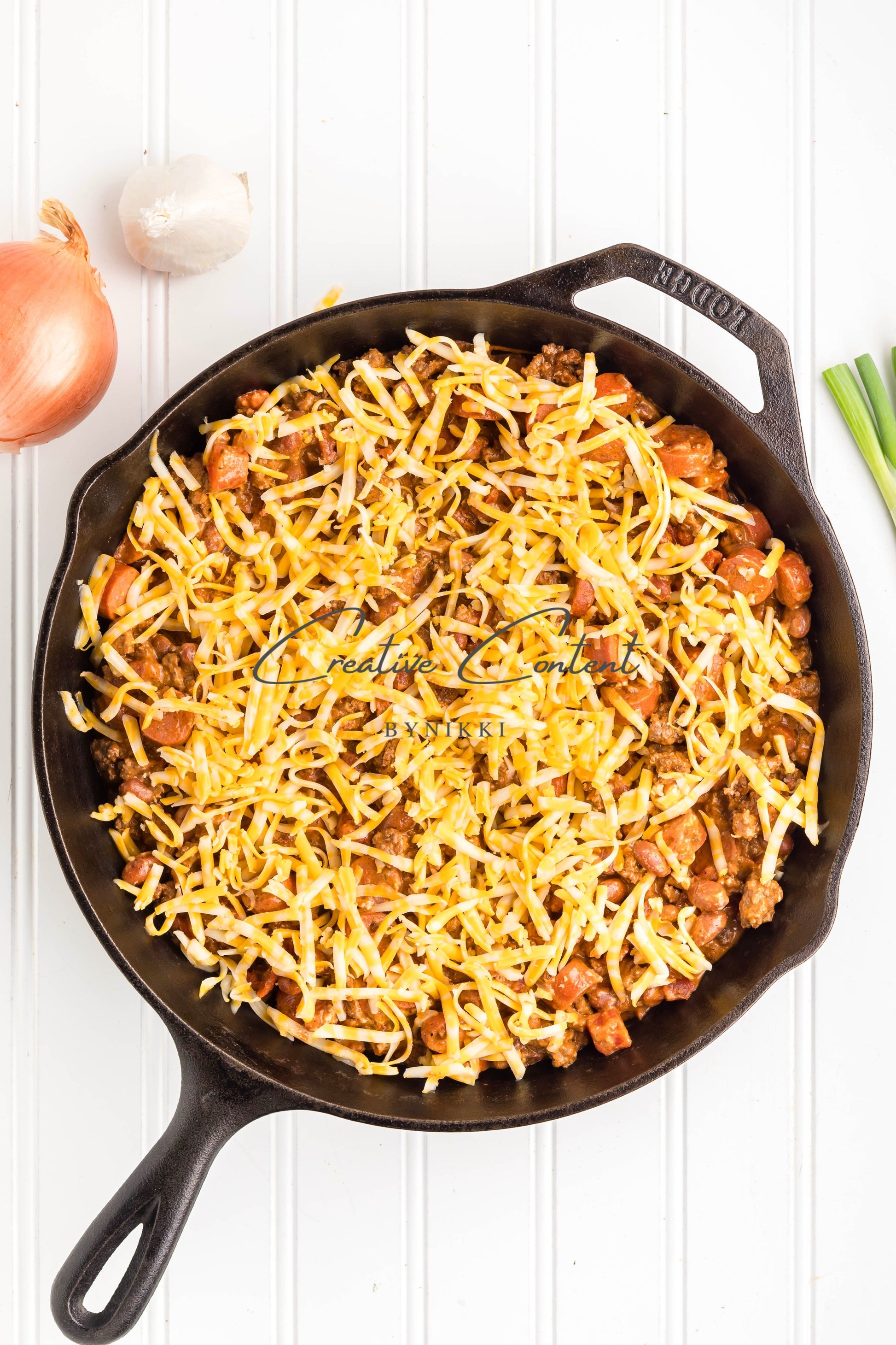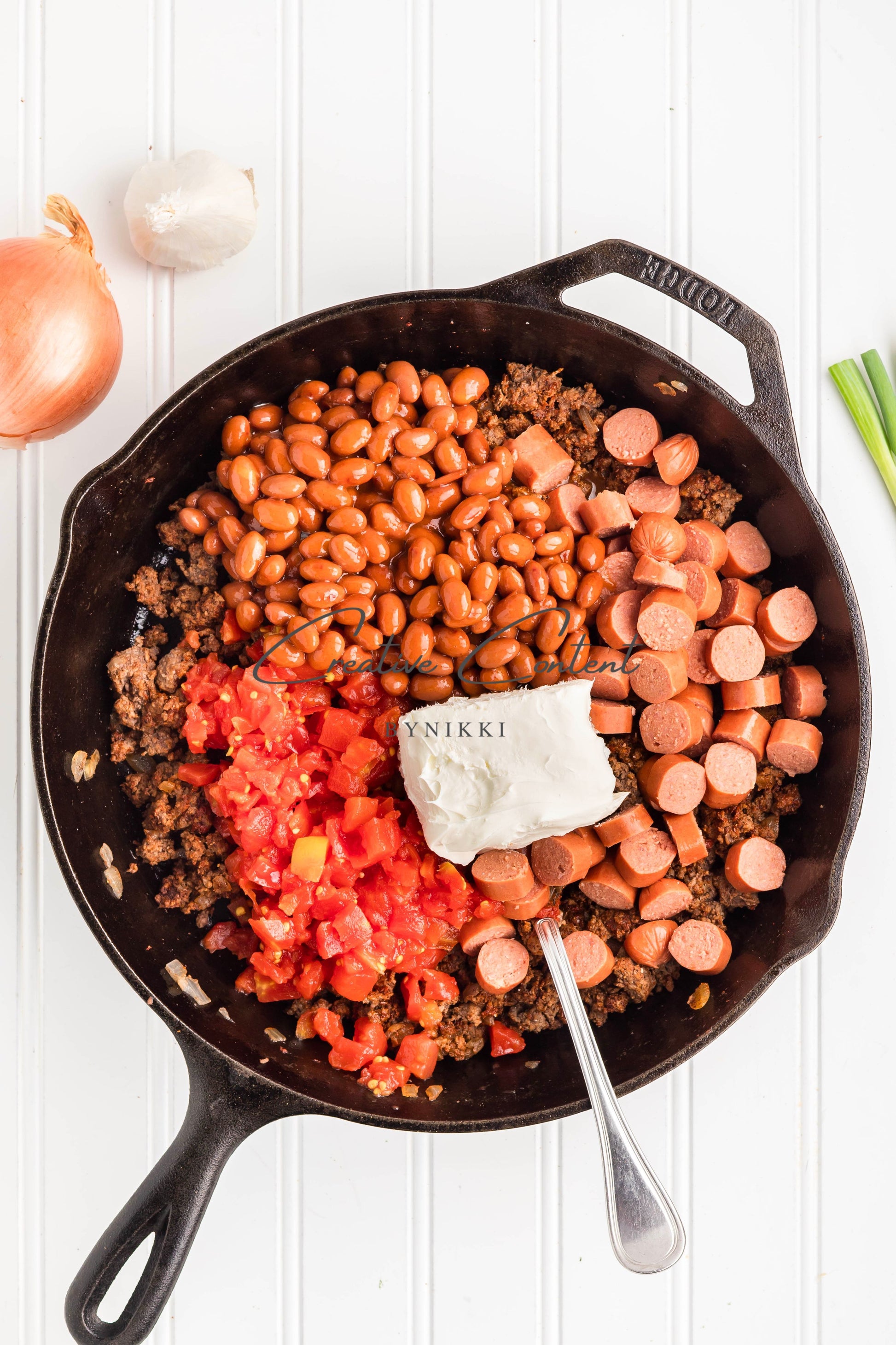 - Ingredients: lean ground beef, yellow onion, tomato paste, garlic cloves, chili powder, coarse kosher salt, black pepper, ground cumin, paprika, hot dogs, Rotel, chili beans, cream cheese, Colby Jack Cheese, crispy rounds, green onions
