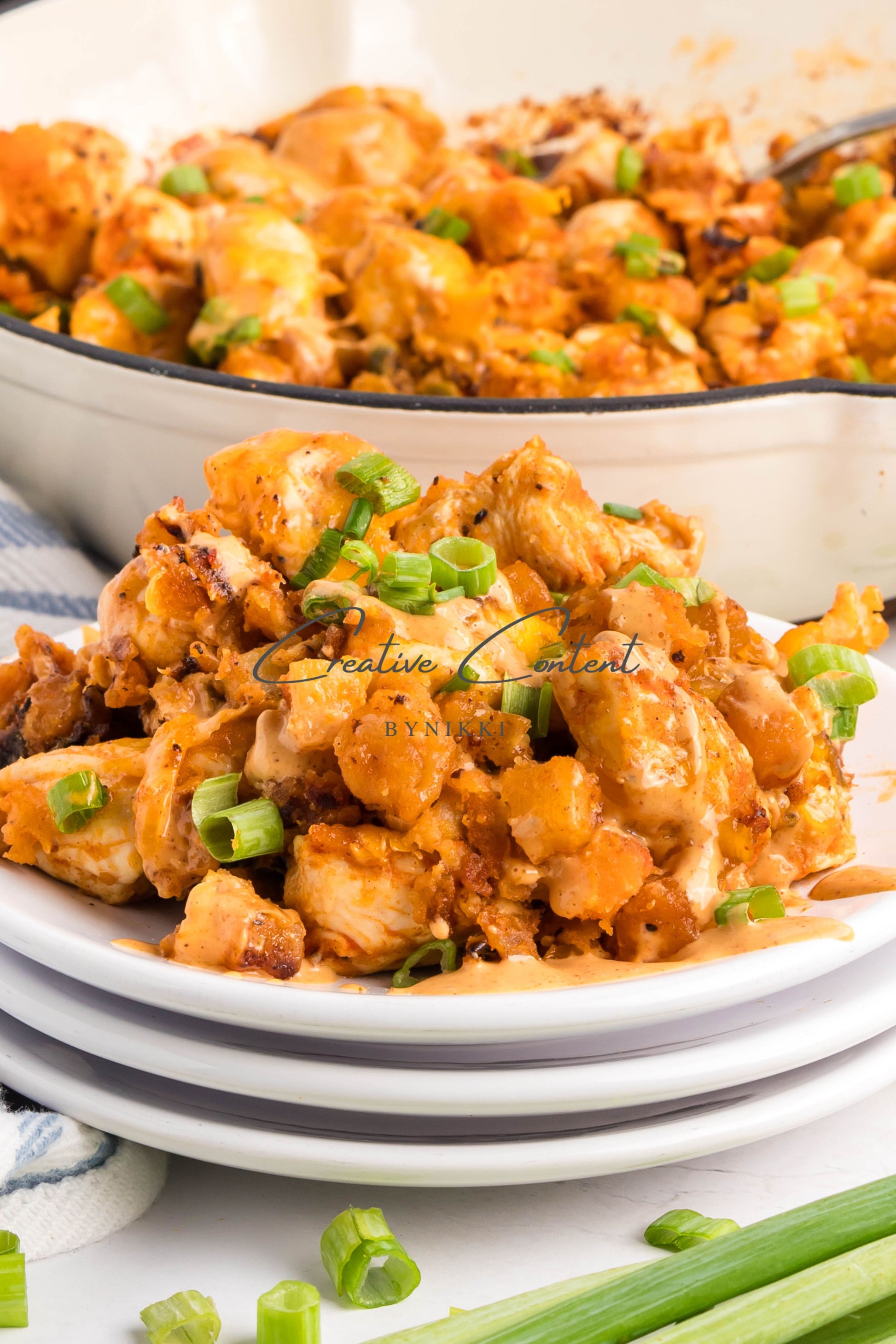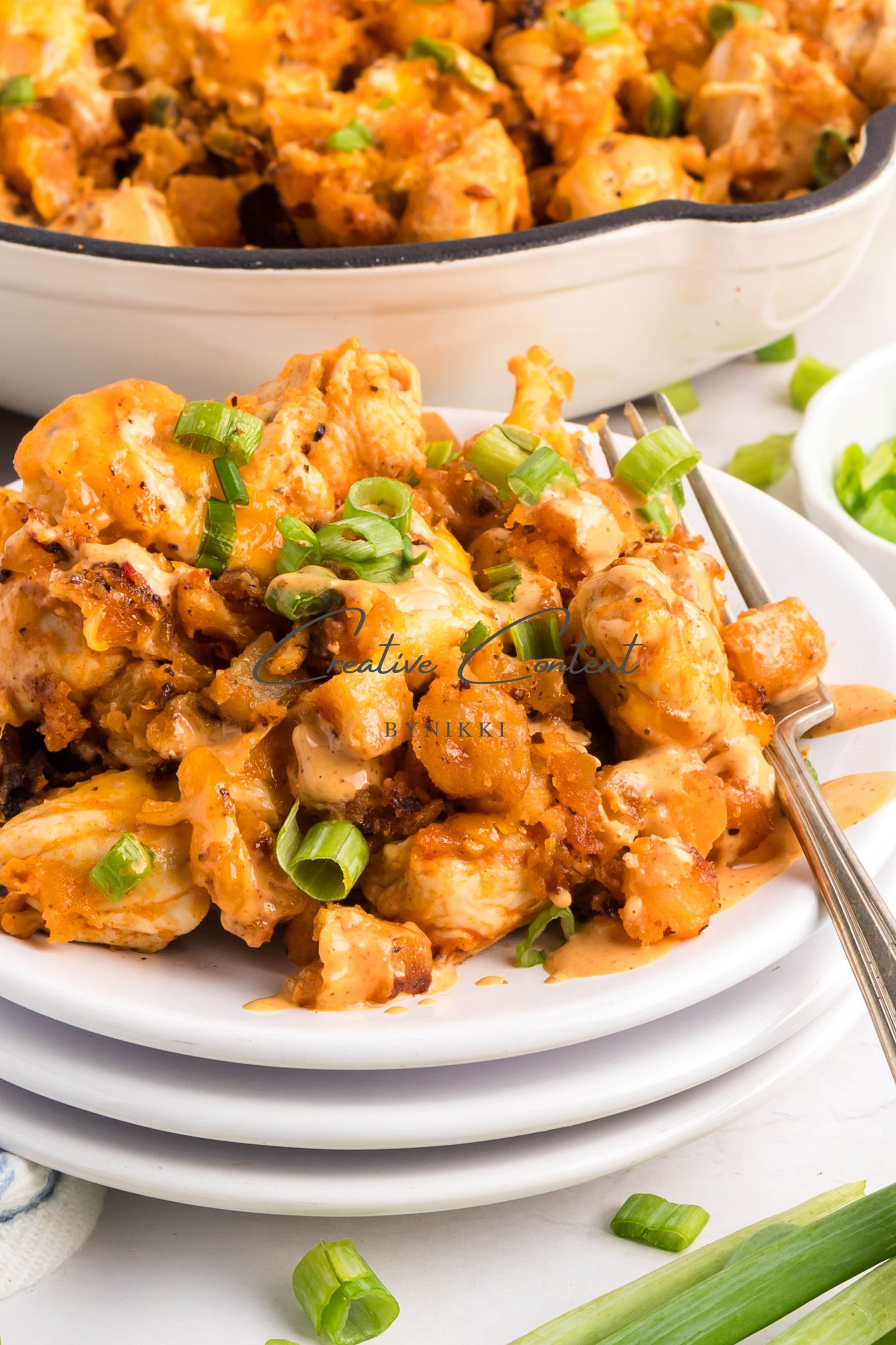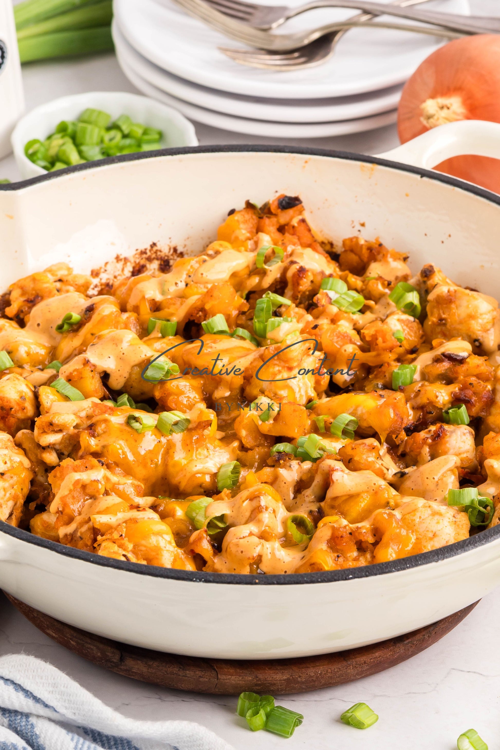 - Ingredients: avocado oil, frozen potatoes with or without bell peppers, chicken, salt, pepper, garlic powder, onion powder, and paprika, Chipotle sauce, cheddar cheese, and green onions