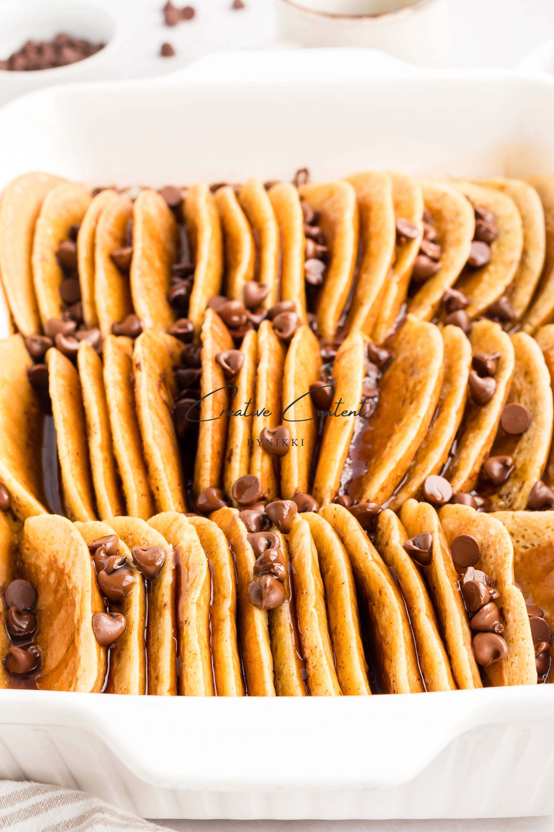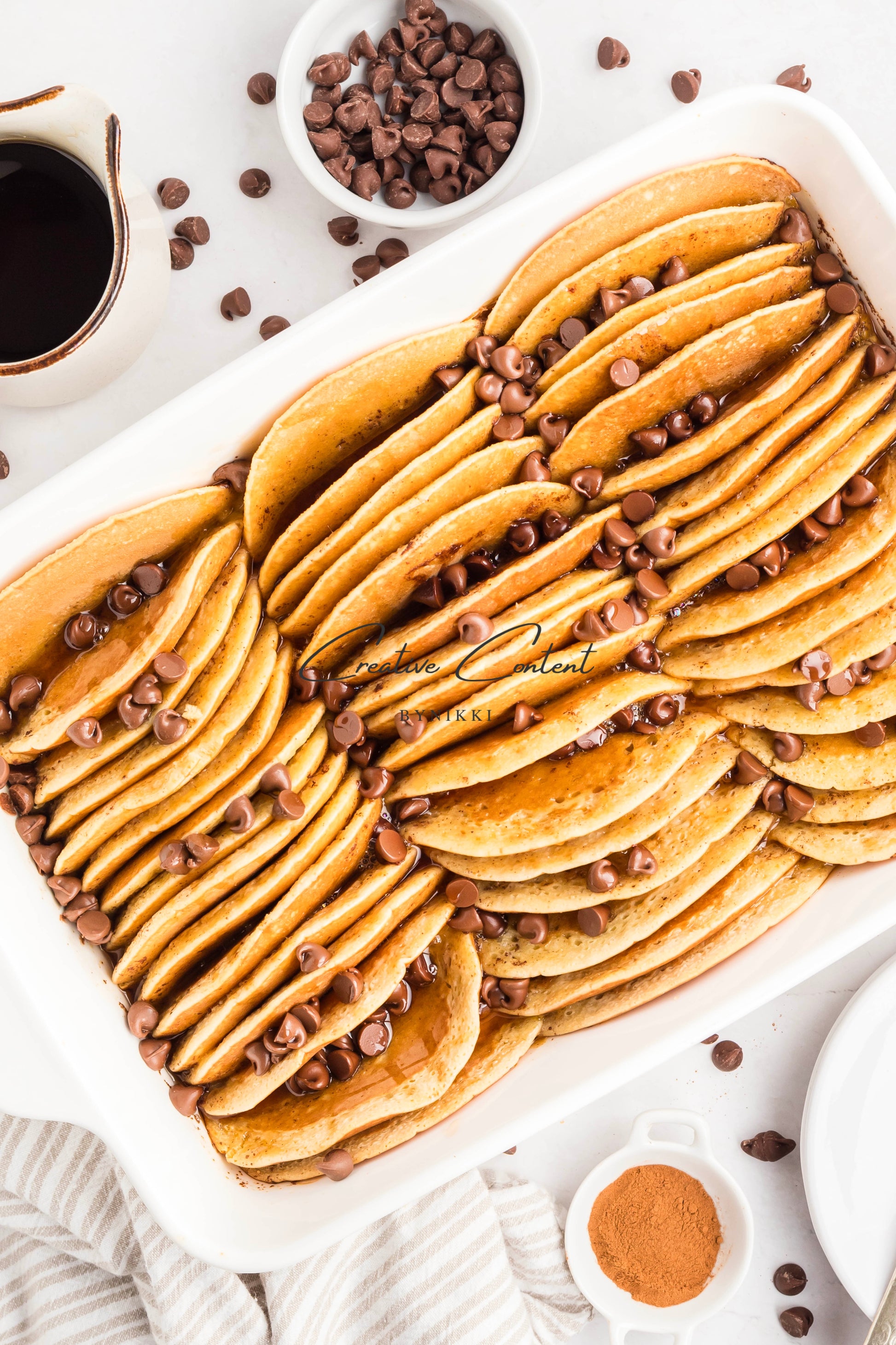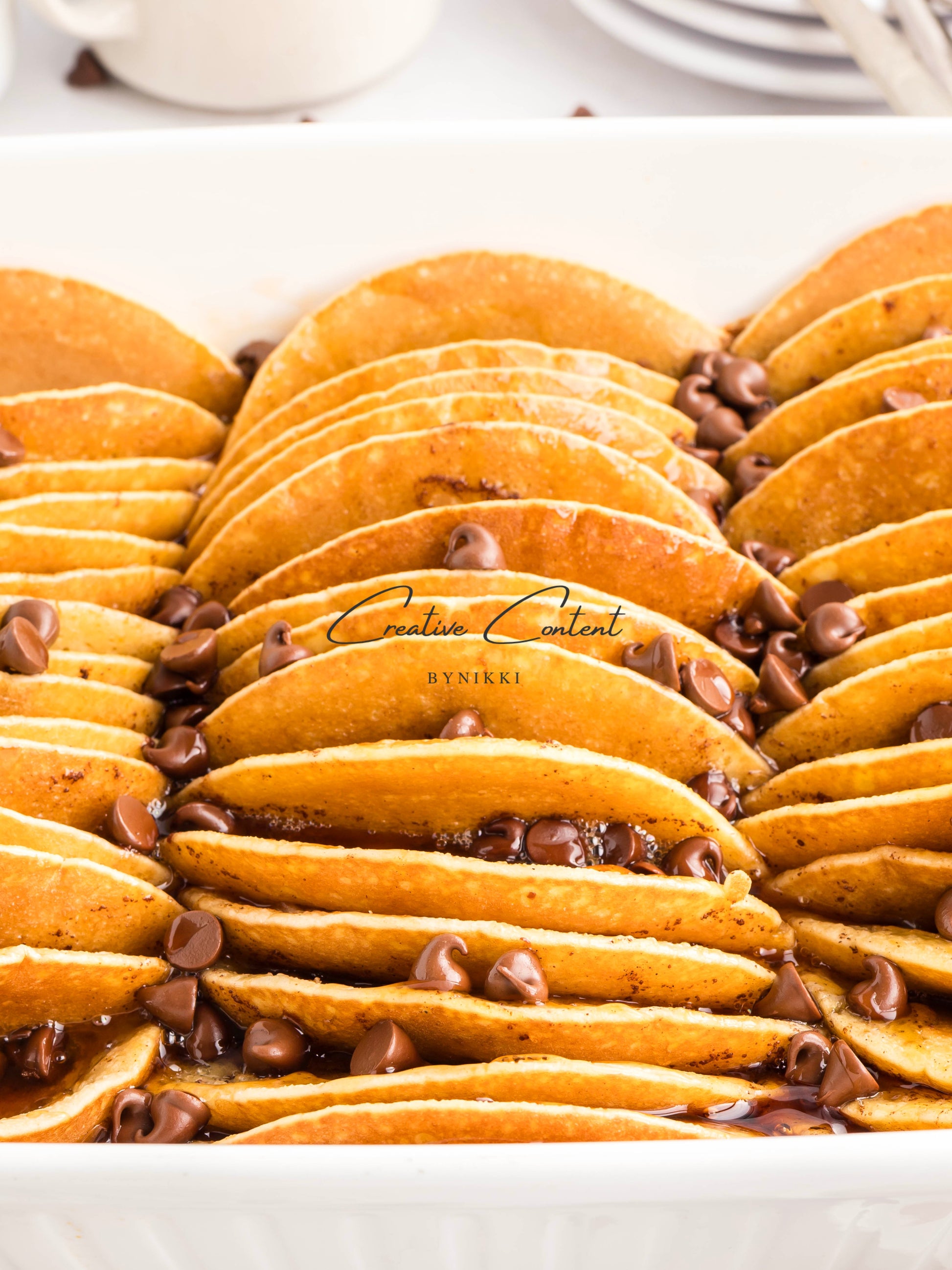 The chocolate chip pancake casserole is a loaded custard-infused pancake dish with sprinkled chocolate chips. The sweetness of the light brown sugar and chocolate chips takes this casserole to the next level.