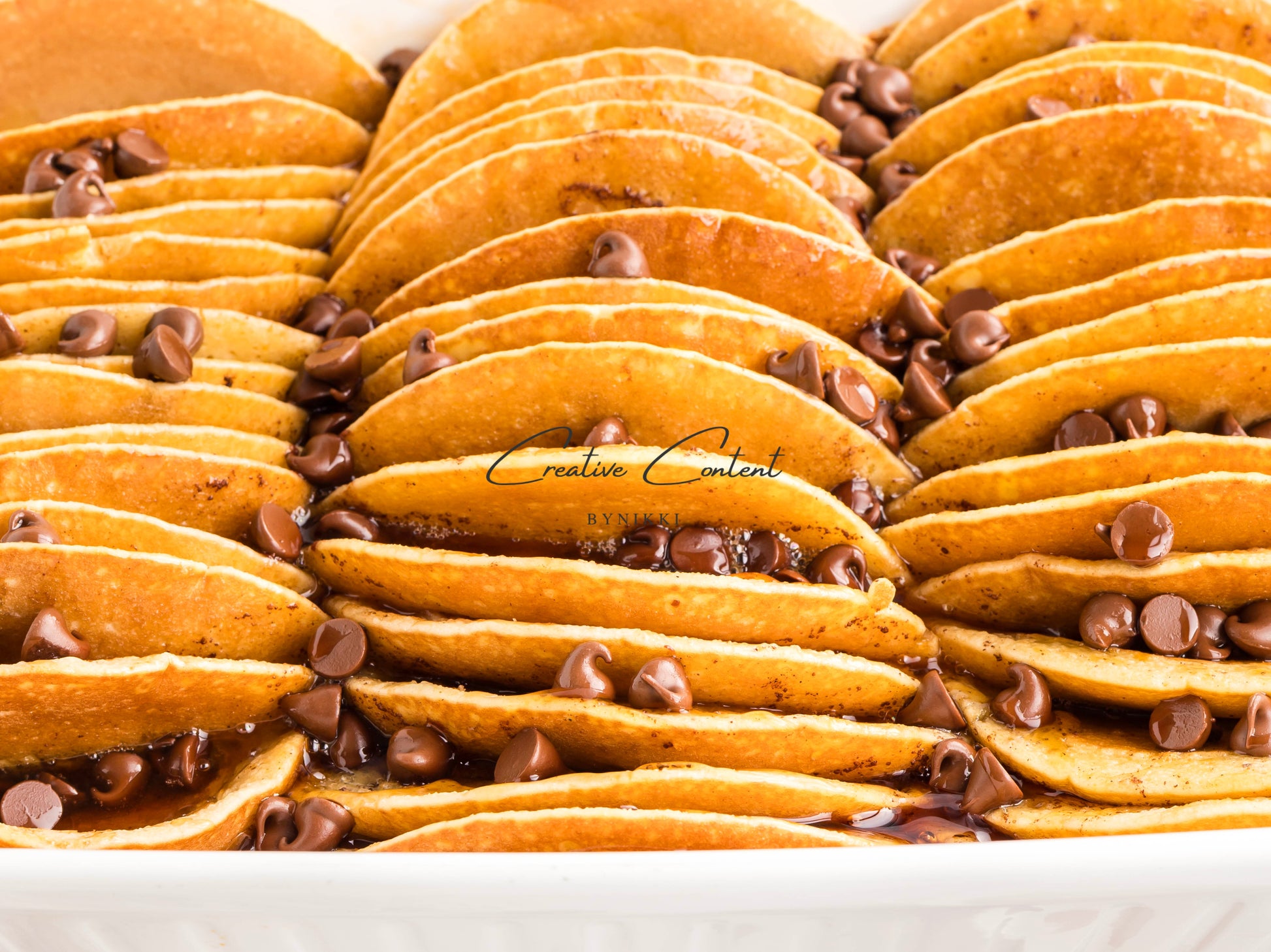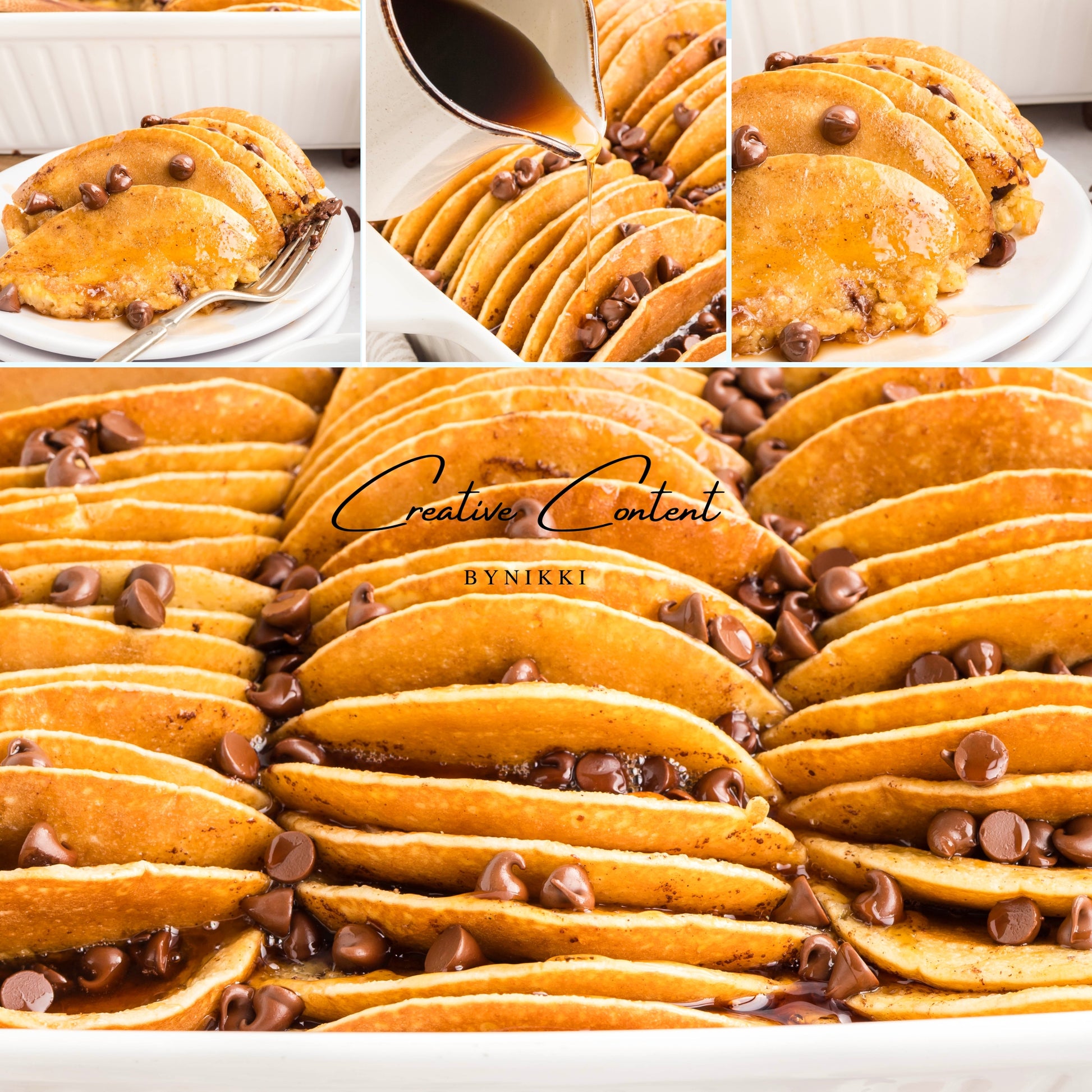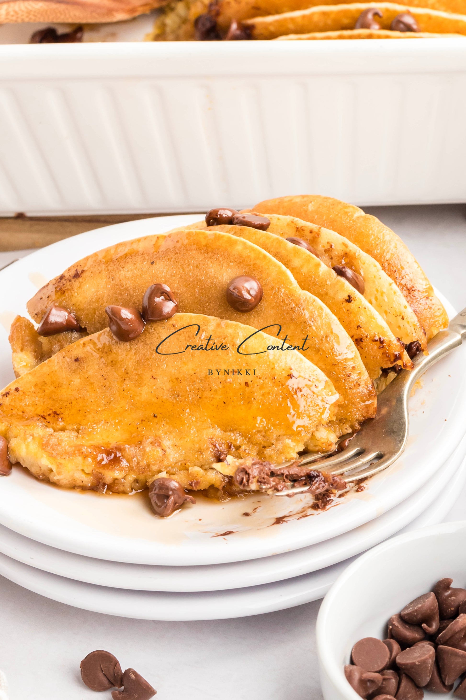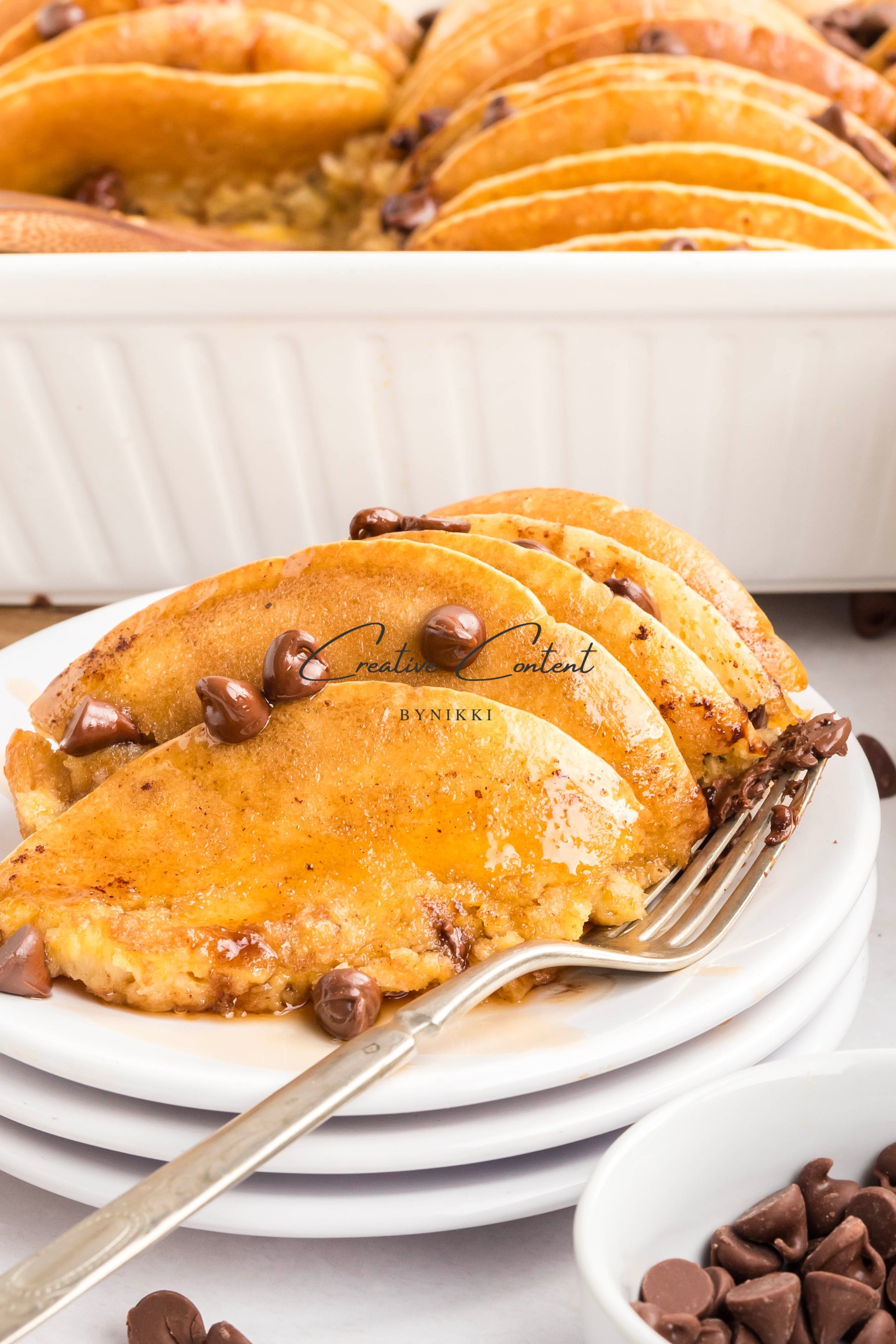 The chocolate chip pancake casserole is a loaded custard-infused pancake dish with sprinkled chocolate chips. The sweetness of the light brown sugar and chocolate chips takes this casserole to the next level.