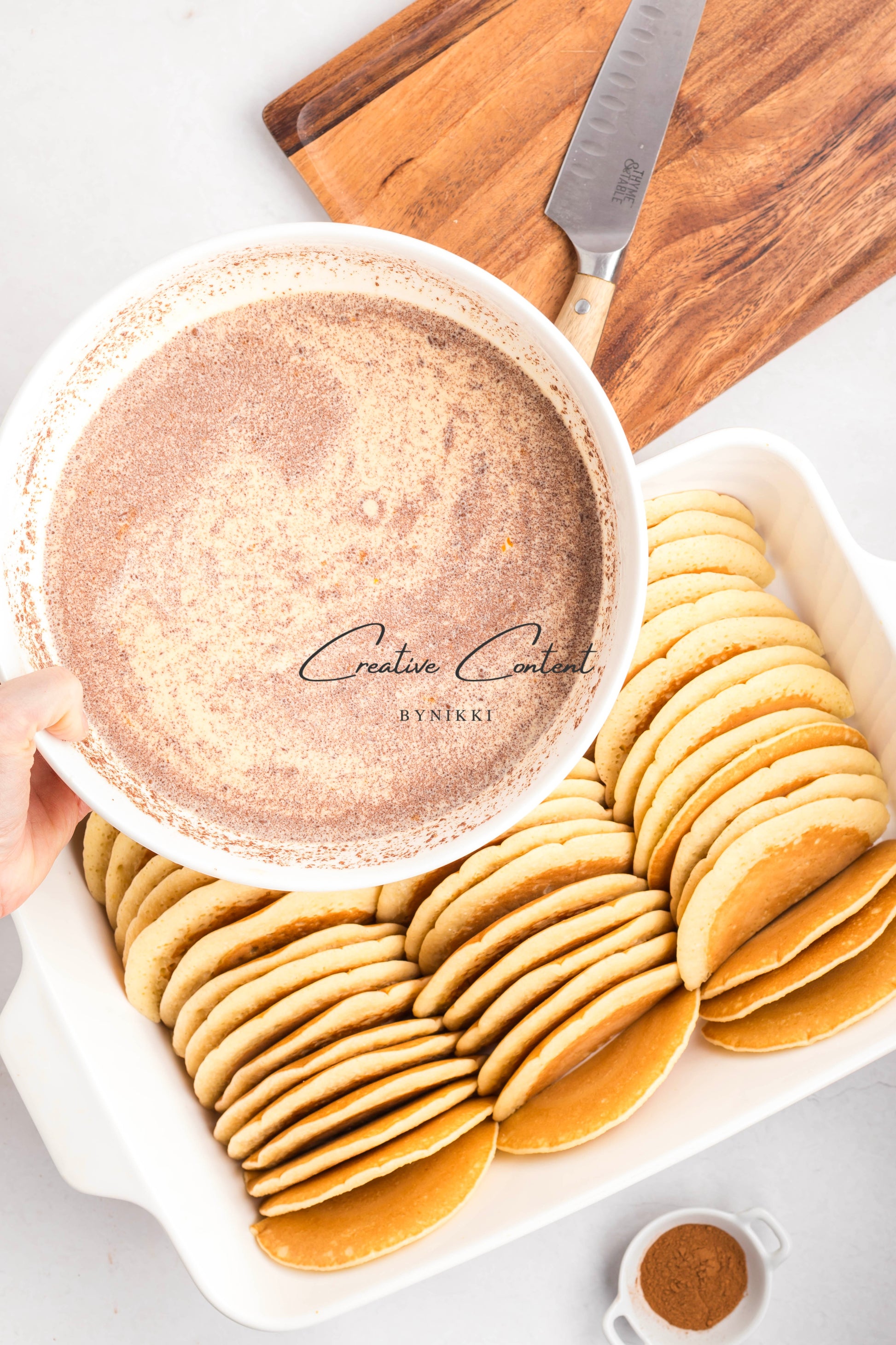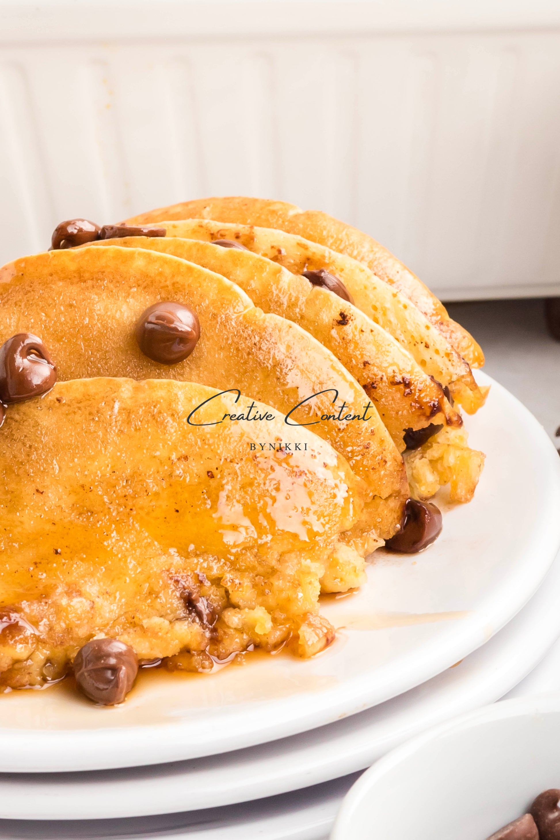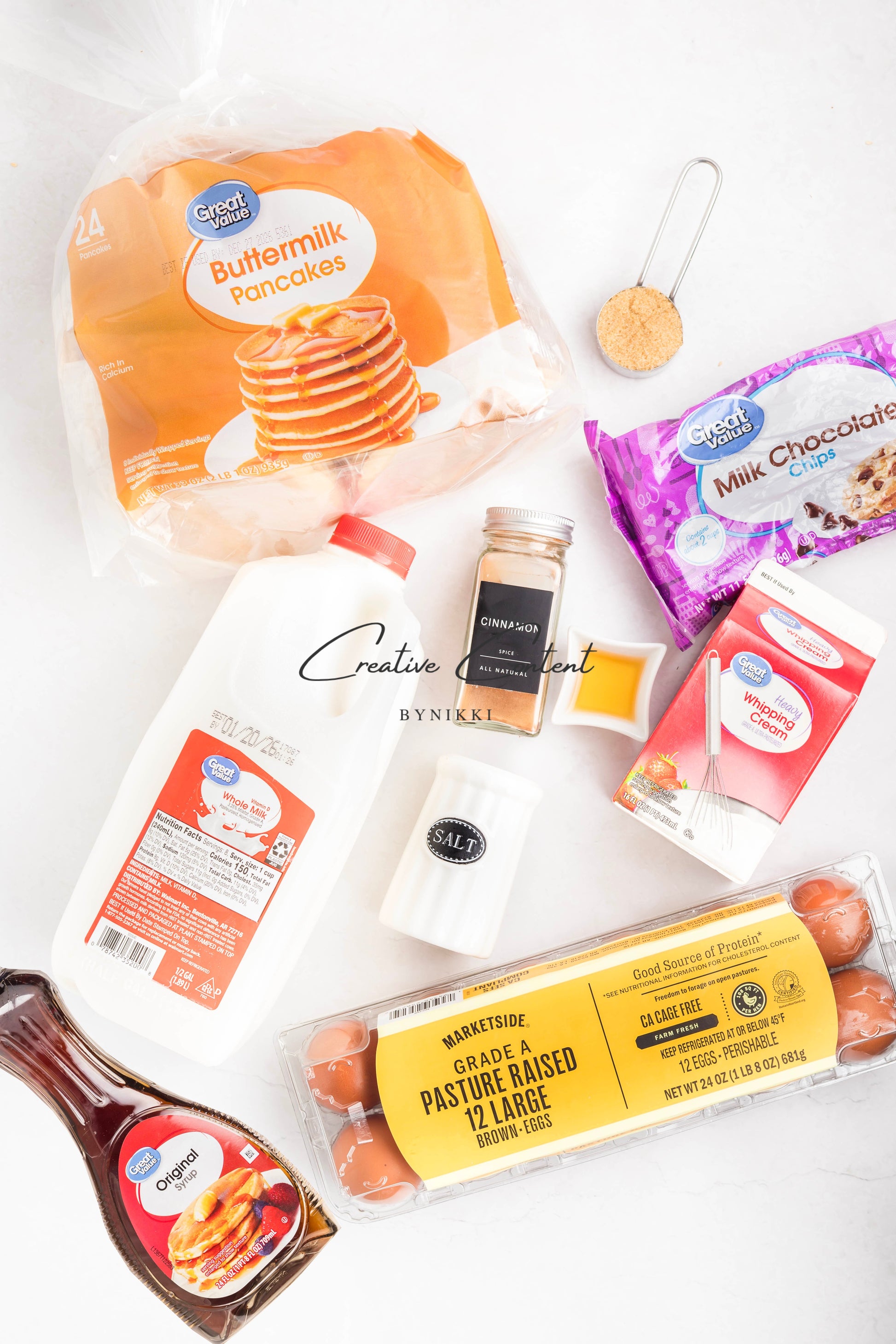 - Featured Ingredients; store-bought or homemade pancakes, eggs, heavy cream, milk, light brown sugar, cinnamon, vanilla extract, coarse kosher salt, and chocolate chips