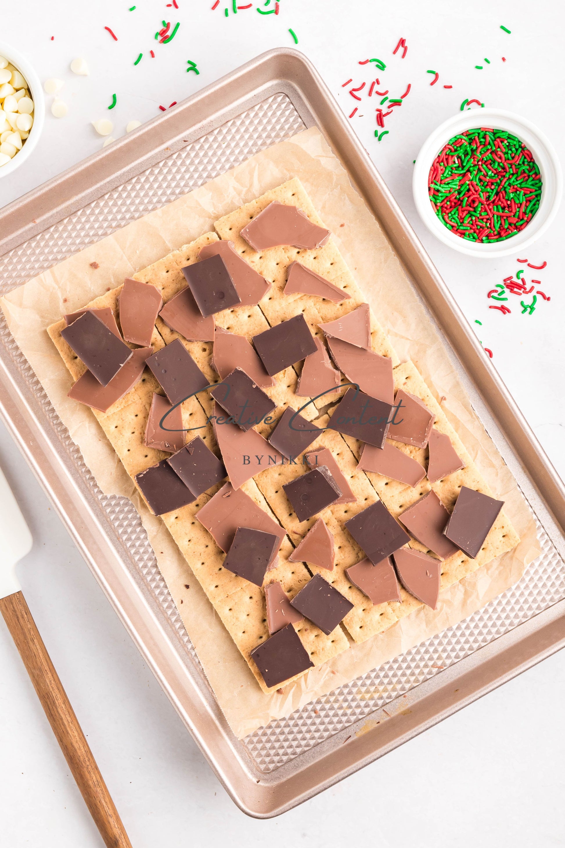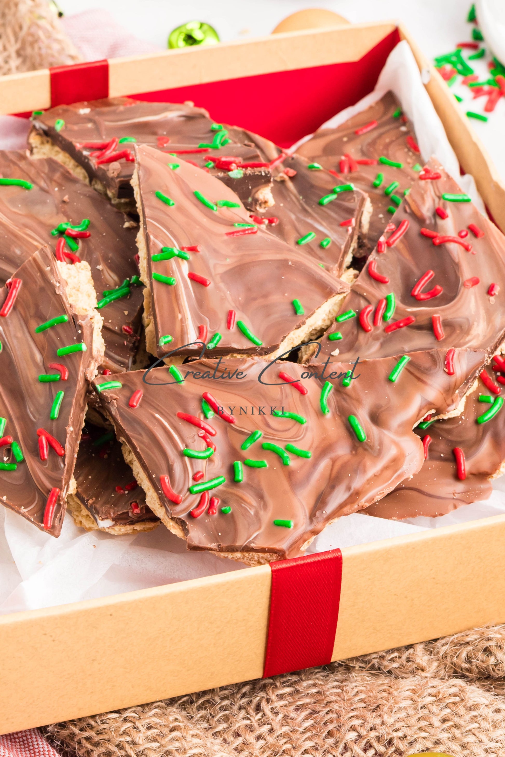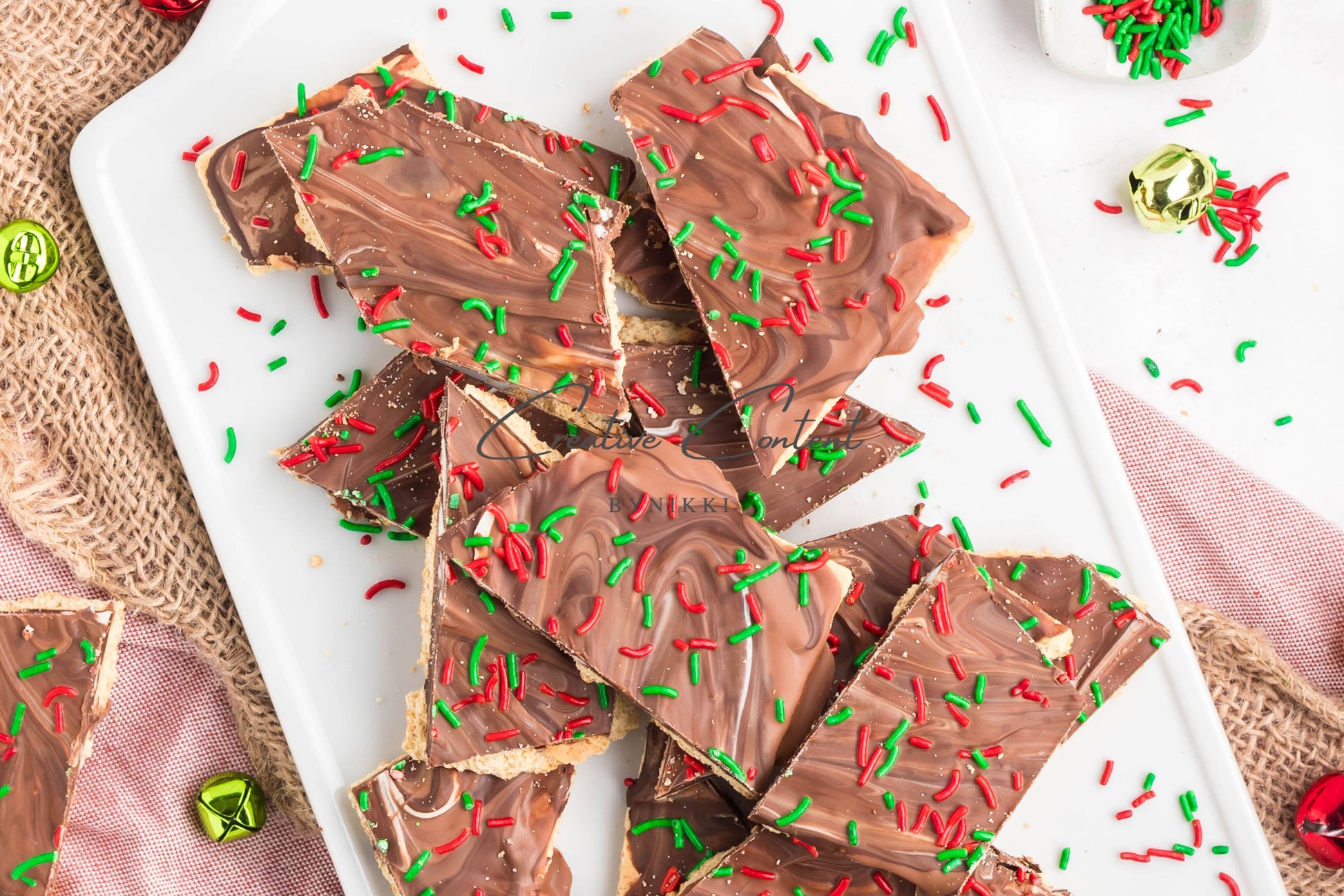 Christmas bark is a layer of crunchy graham crackers topped with melted chocolate with candy sprinkles on top. If you need a dessert for your next holiday gathering, this one is always a hit.