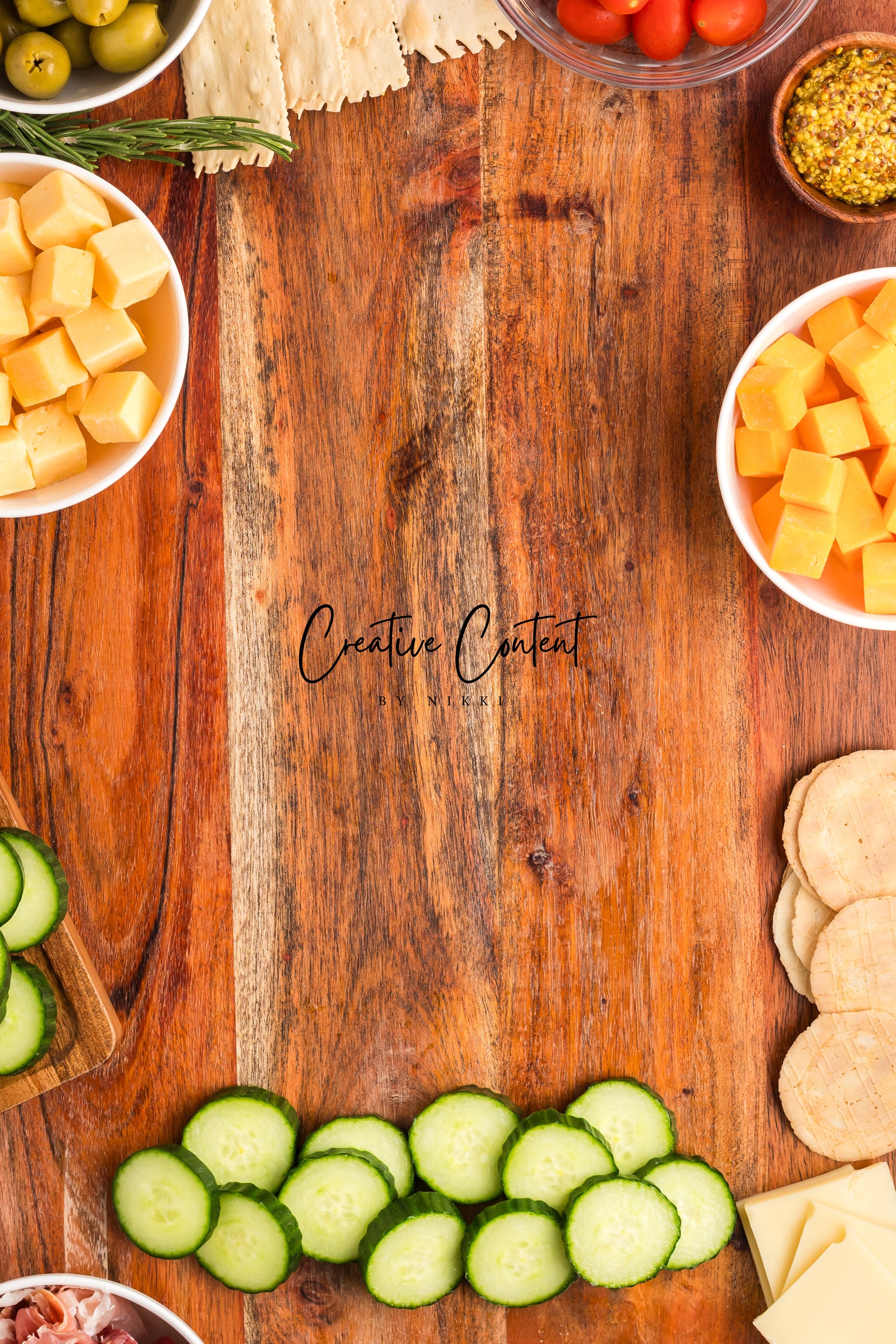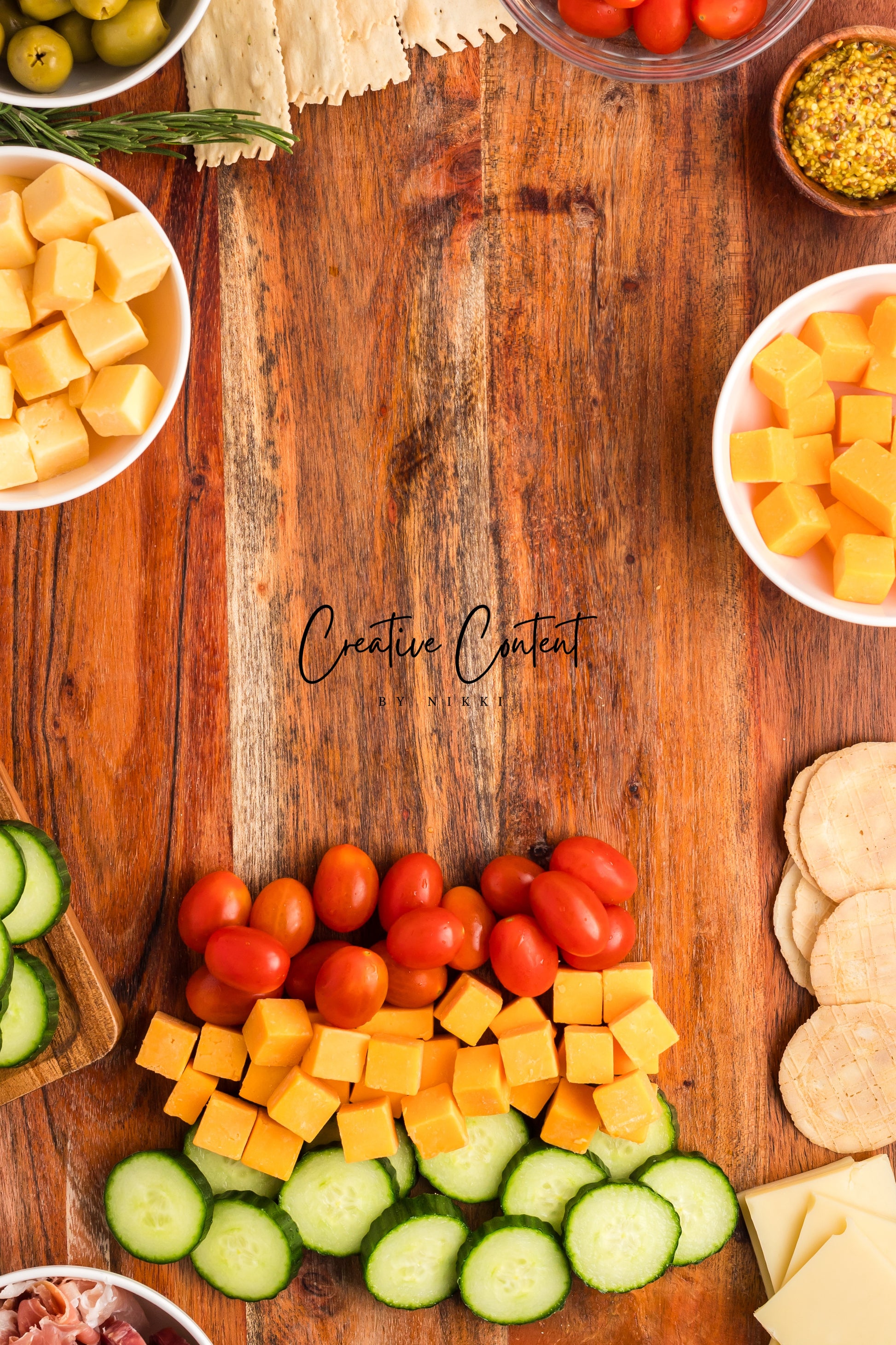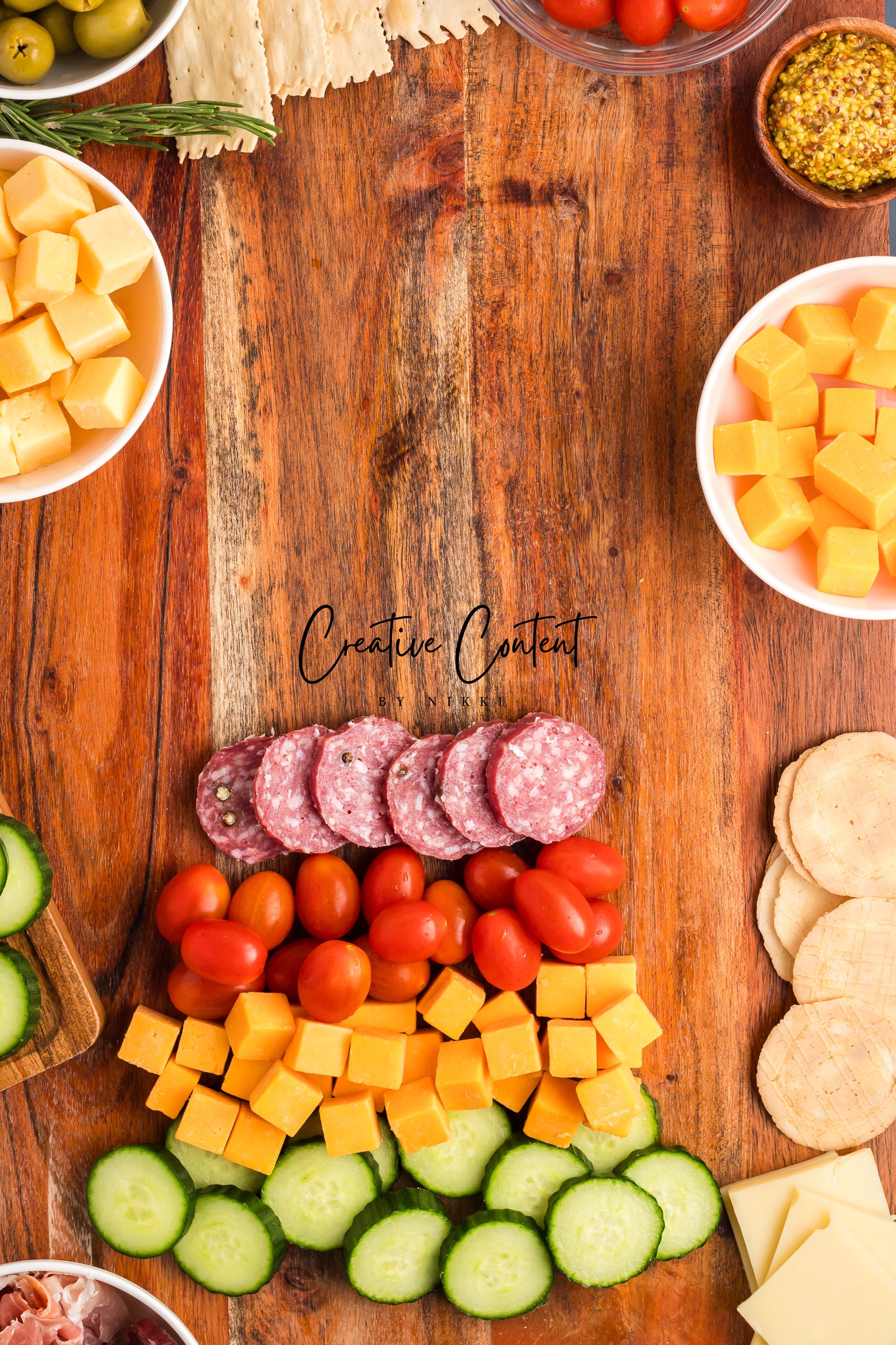 - Featured Ingredients; white cheese, yellow cheddar cheese, Swiss cheese, cherry tomatoes, olives, salami, prosciutto, rosemary, English cucumber, crackers, and ground mustard.