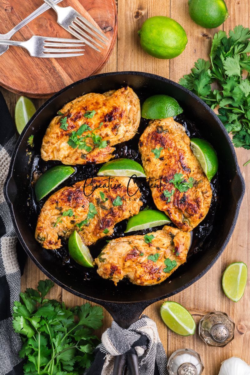 - Featured Ingredients; chicken breasts, cilantro, avocado oil, garlic cloves, lime juice, lime zest, honey, chili powder, and cumin.