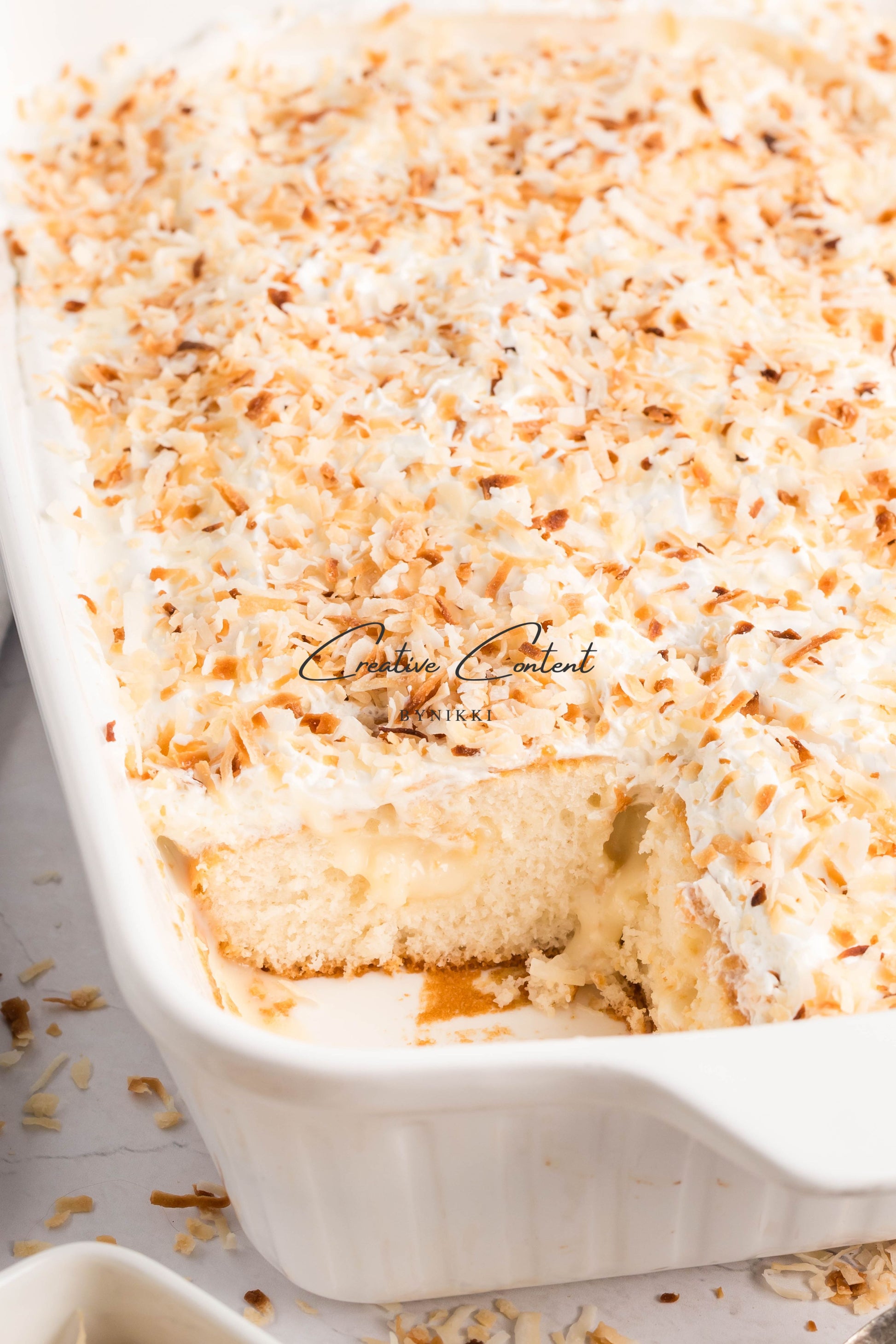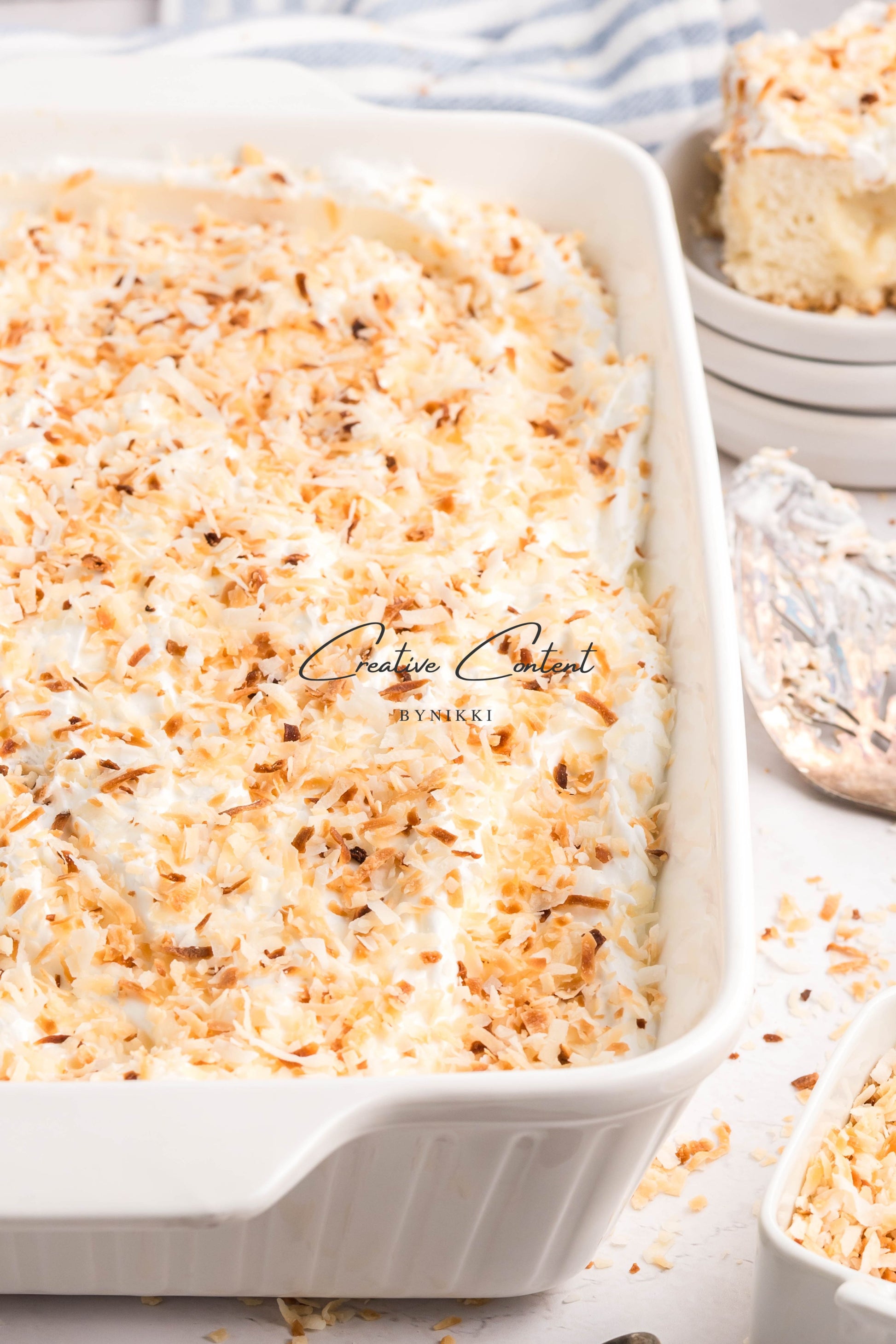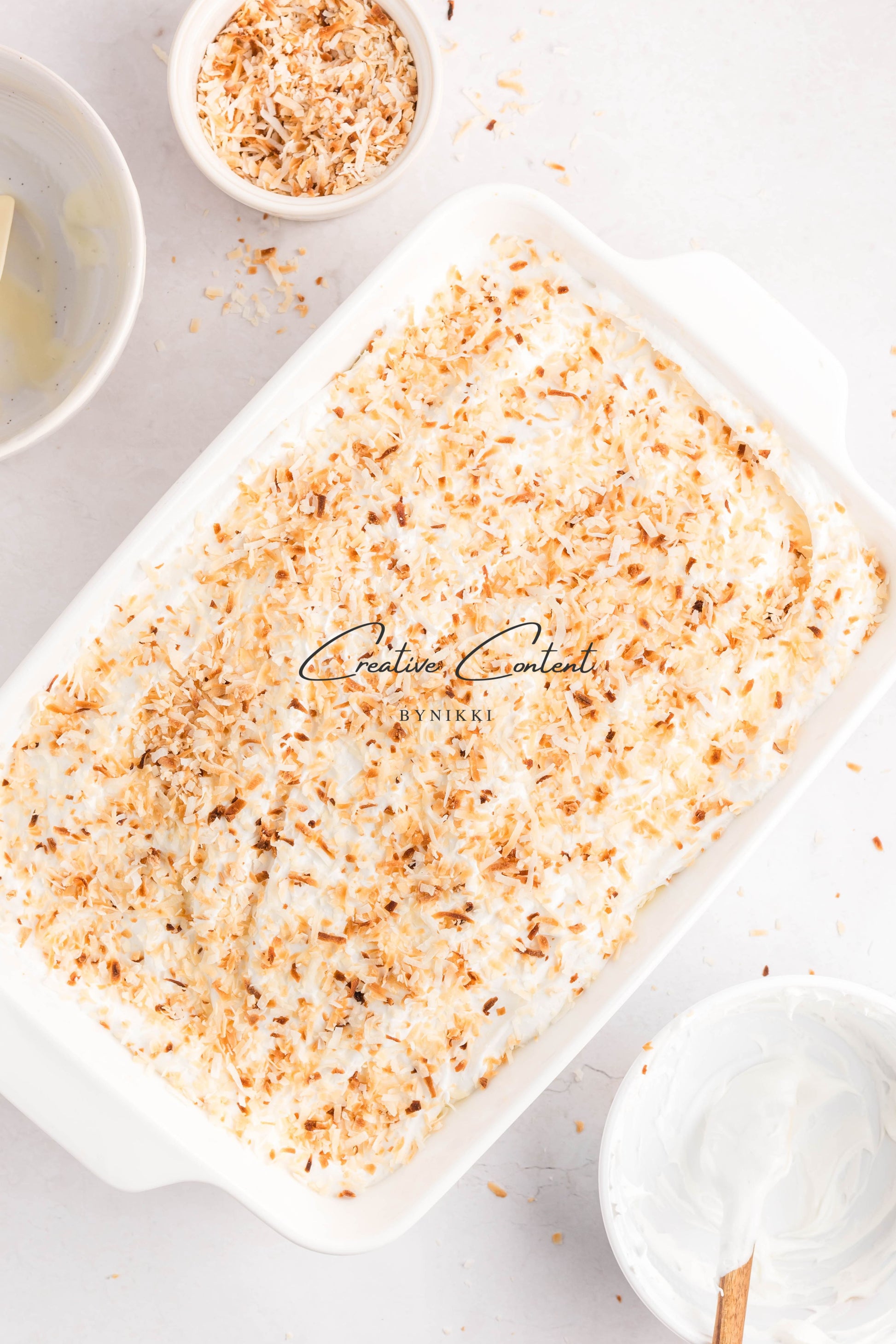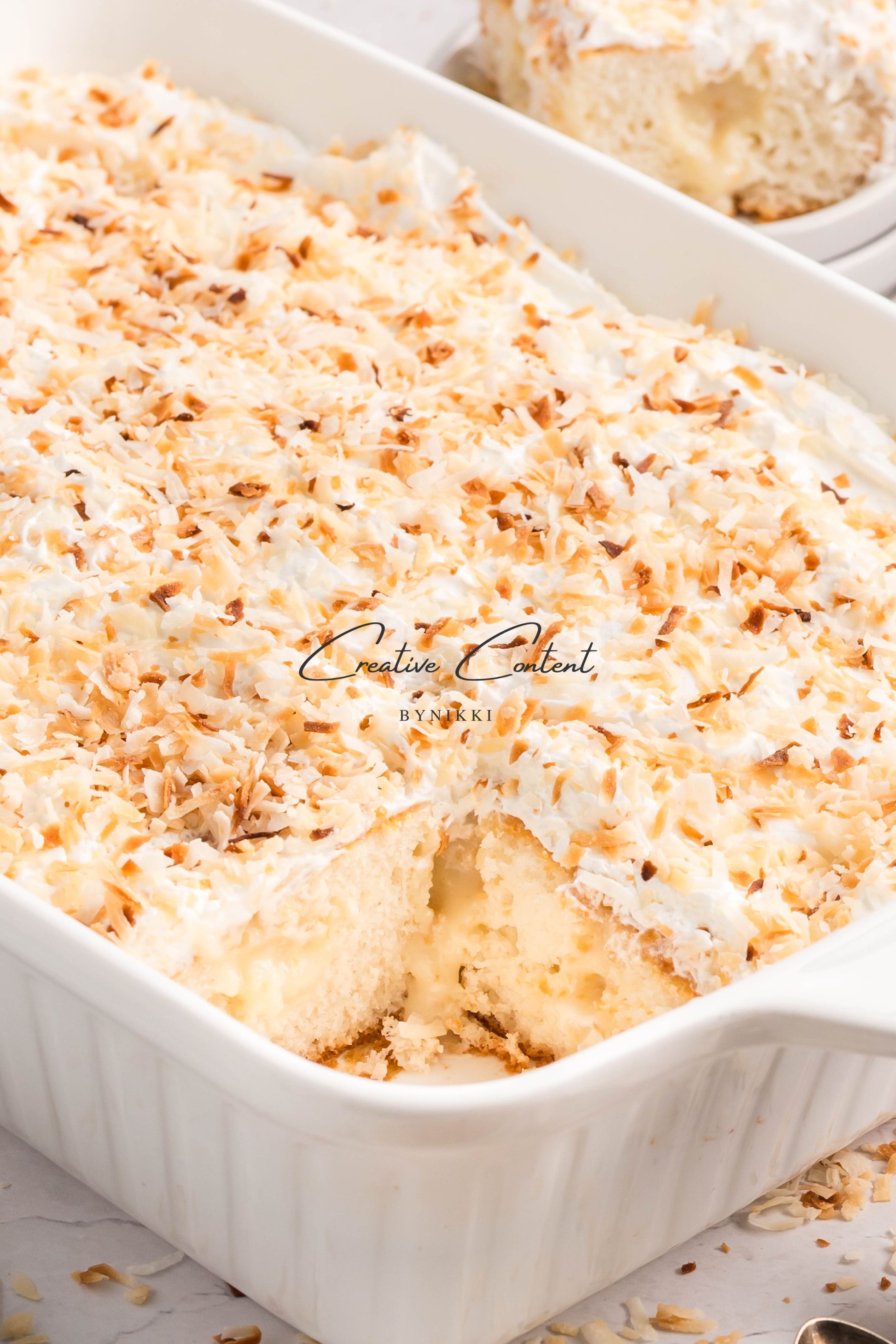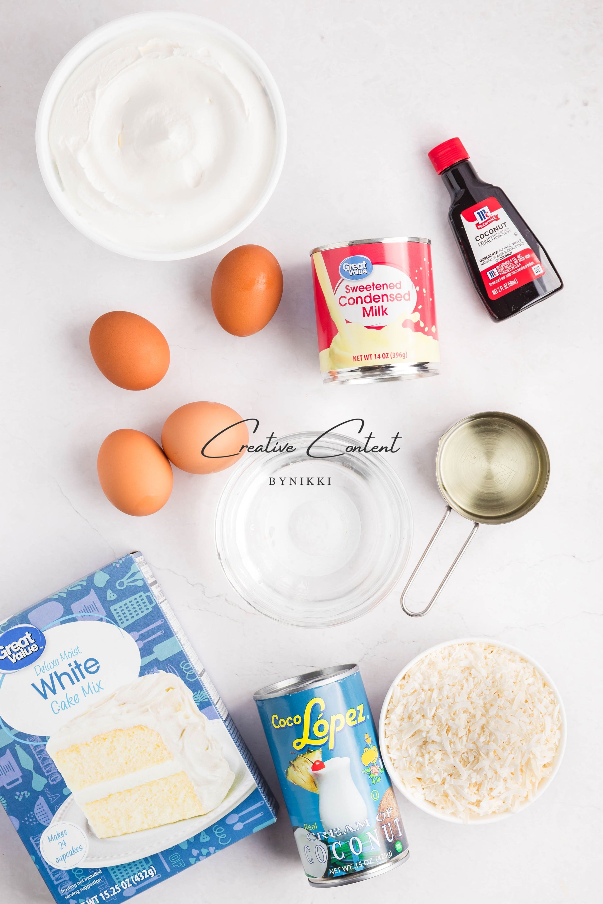 - Ingredients: coconut, white cake mix, egg, coconut extract, sweetened condensed milk, cream of coconut, whipped topping