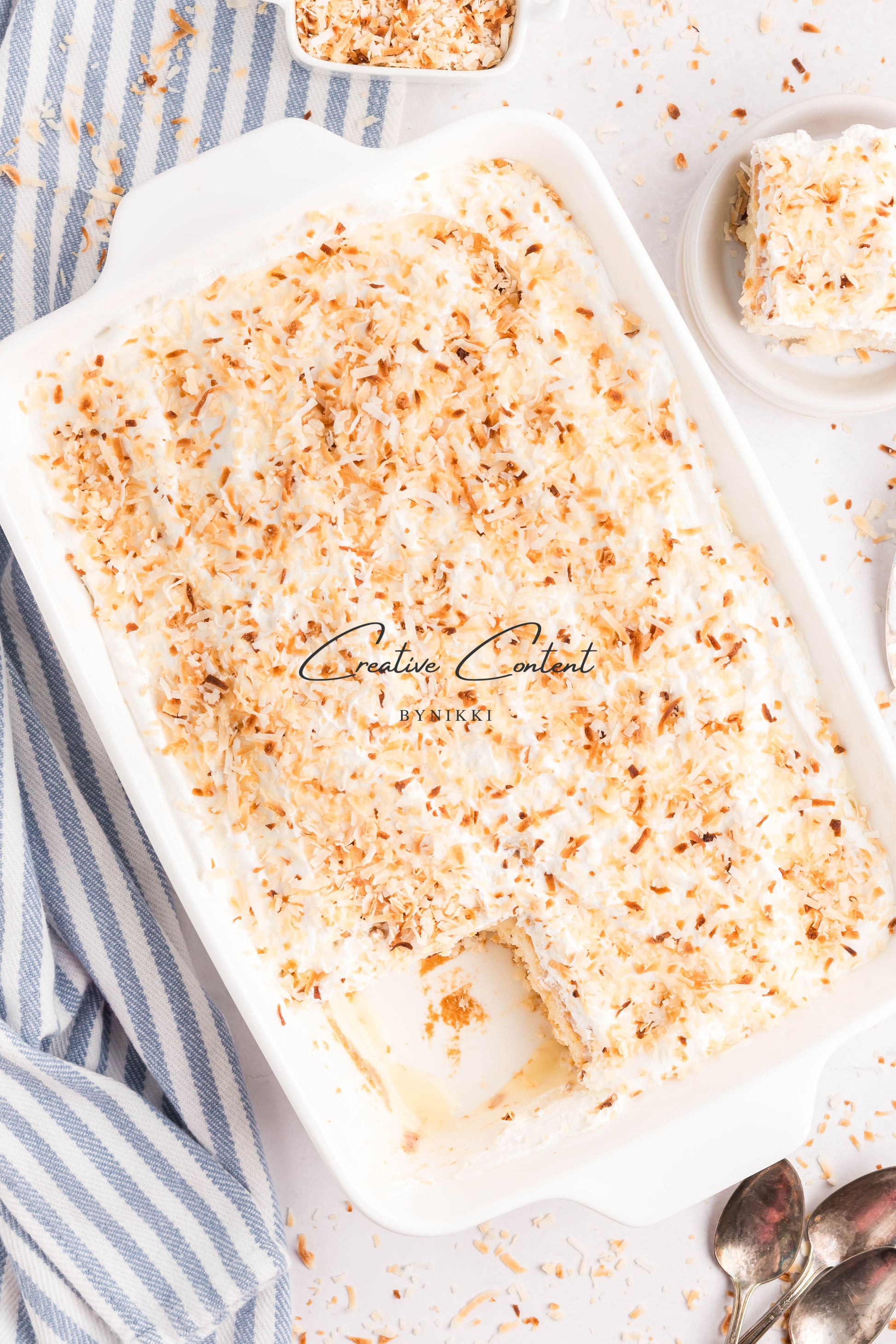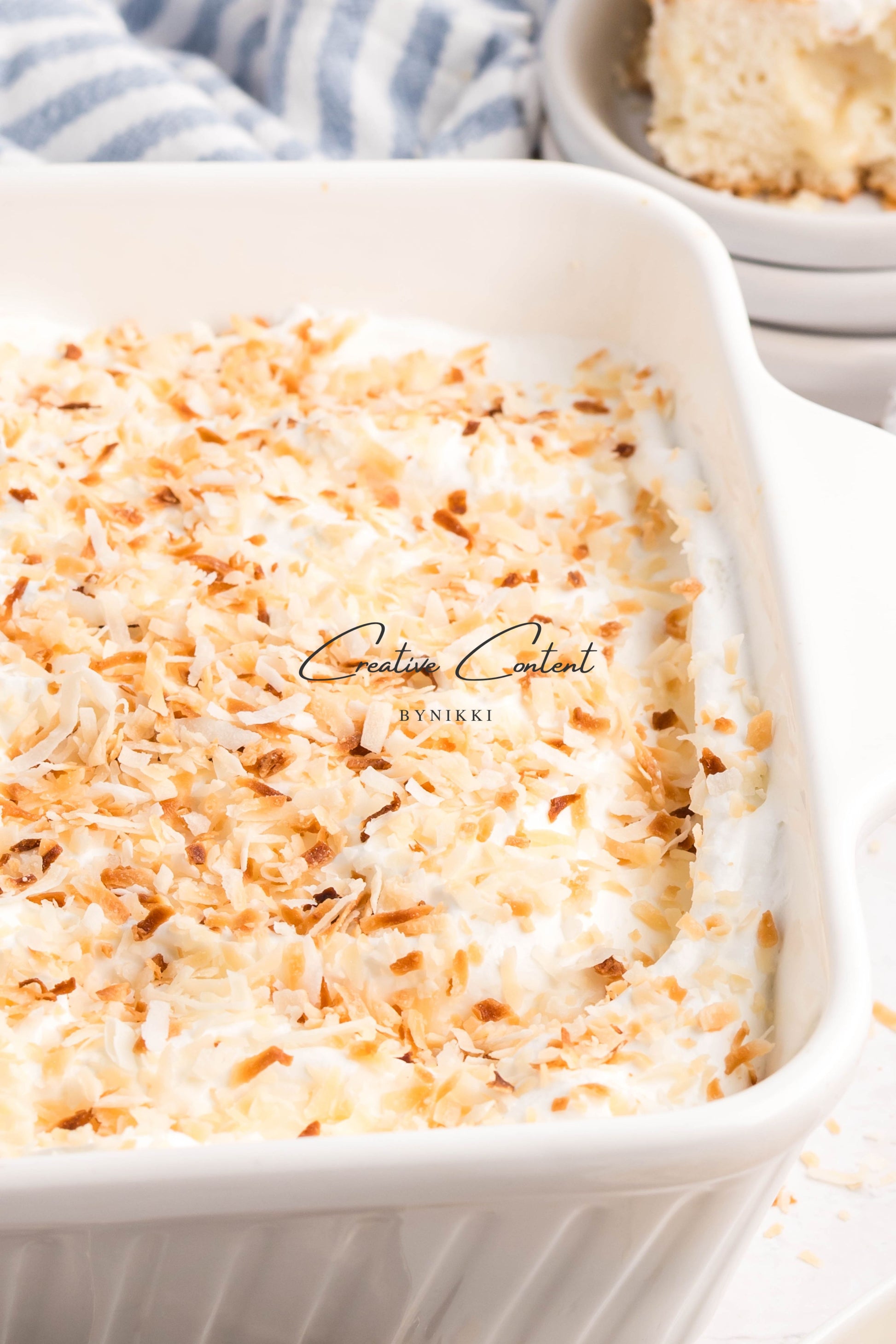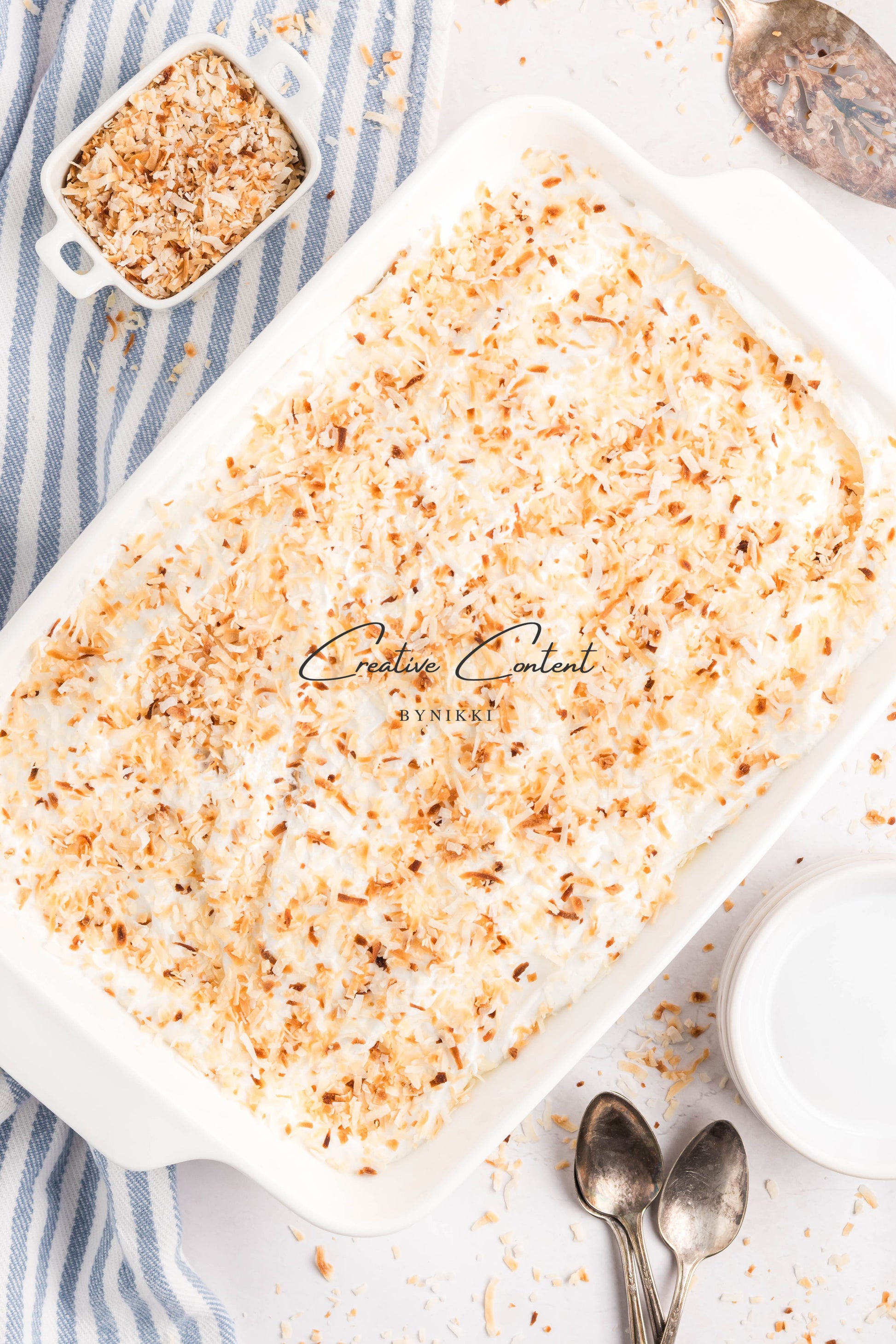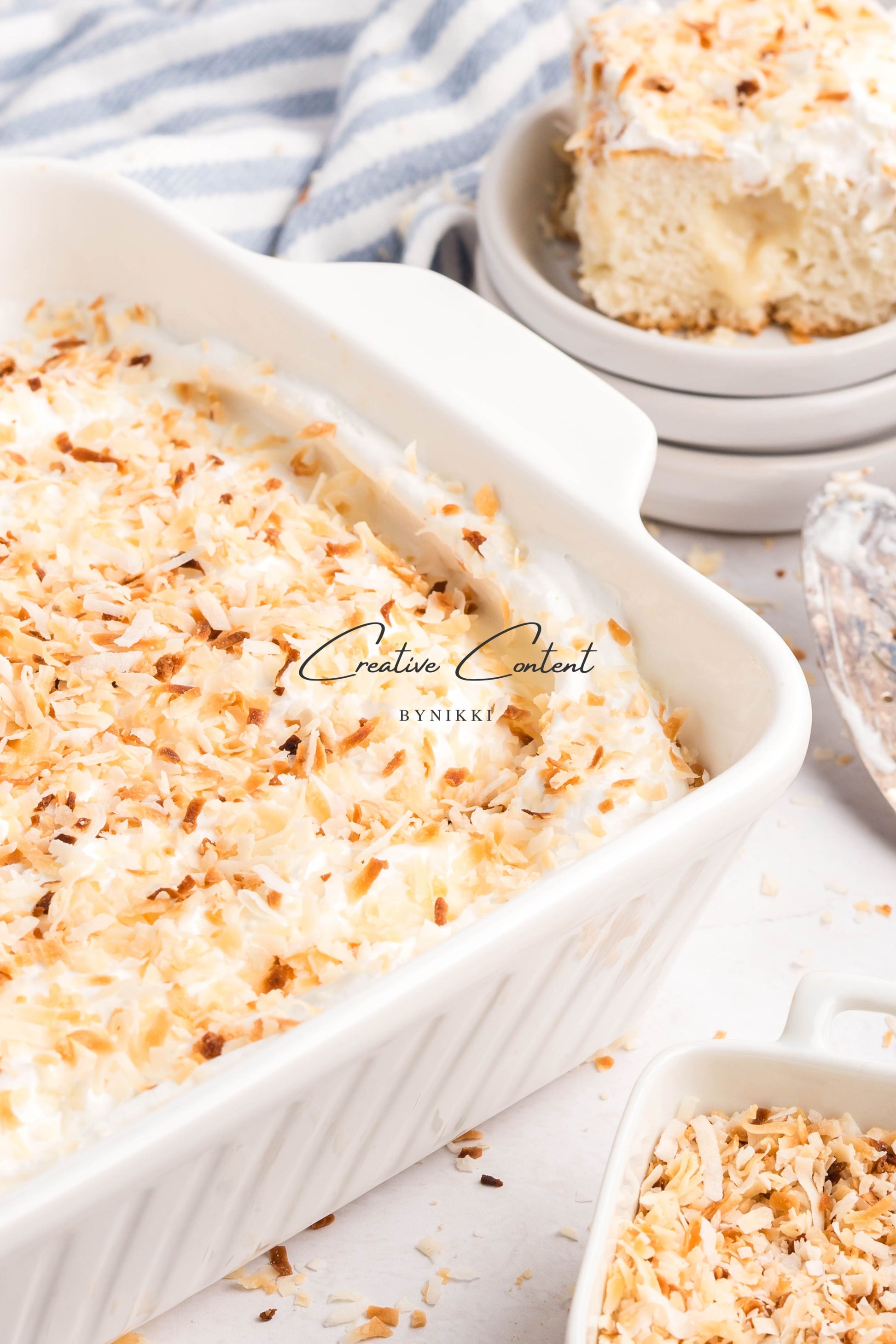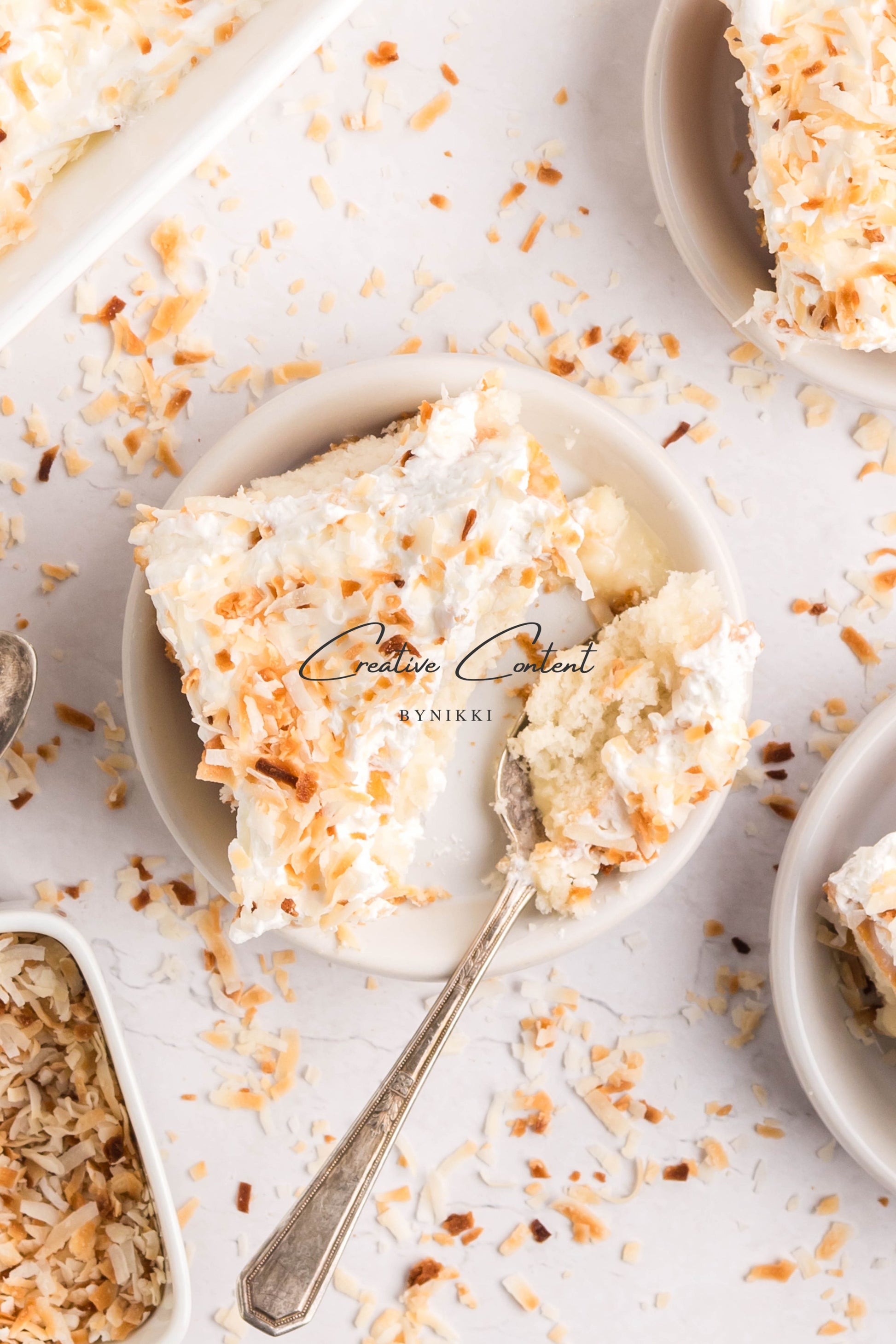 - Ingredients: coconut, white cake mix, egg, coconut extract, sweetened condensed milk, cream of coconut, whipped topping