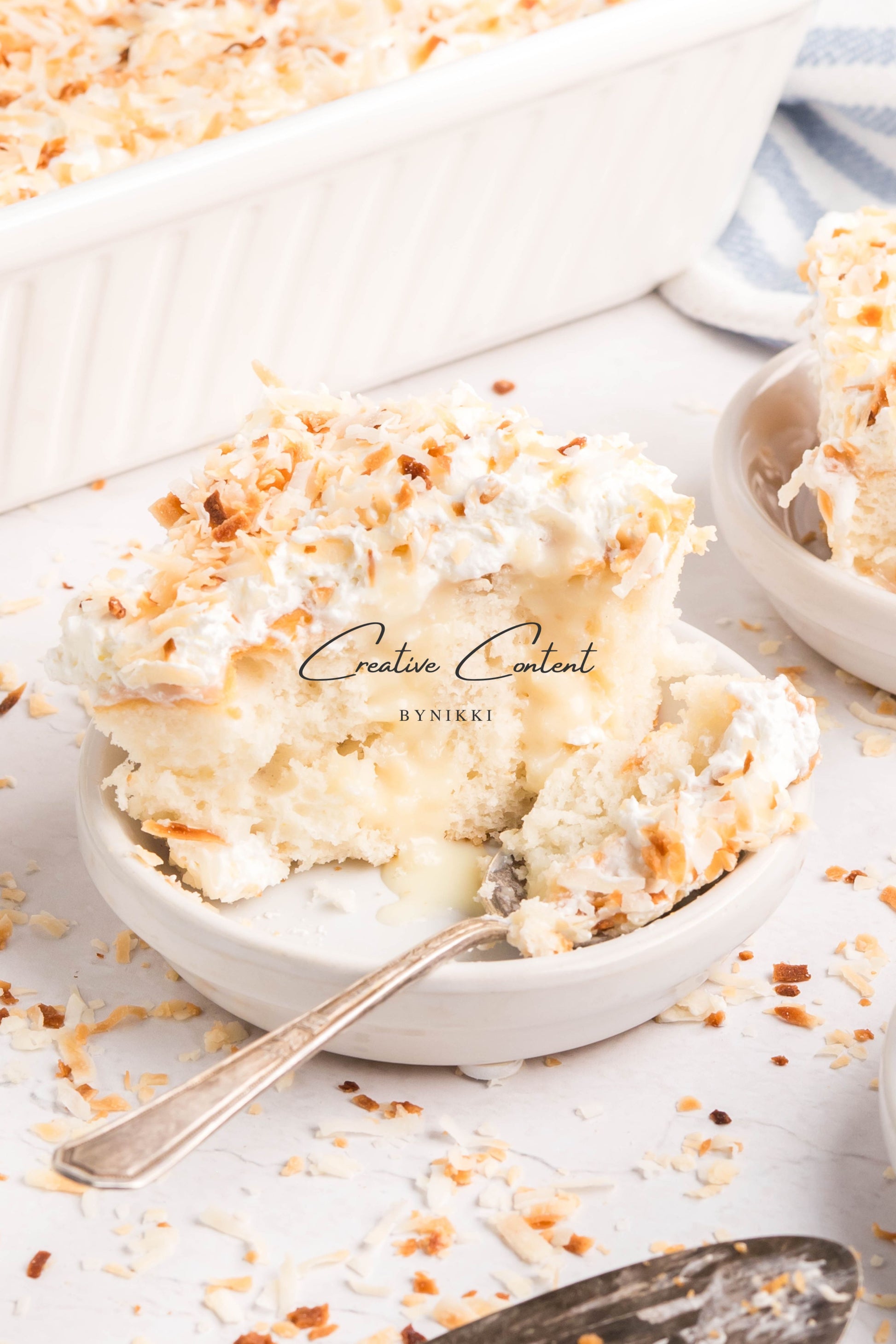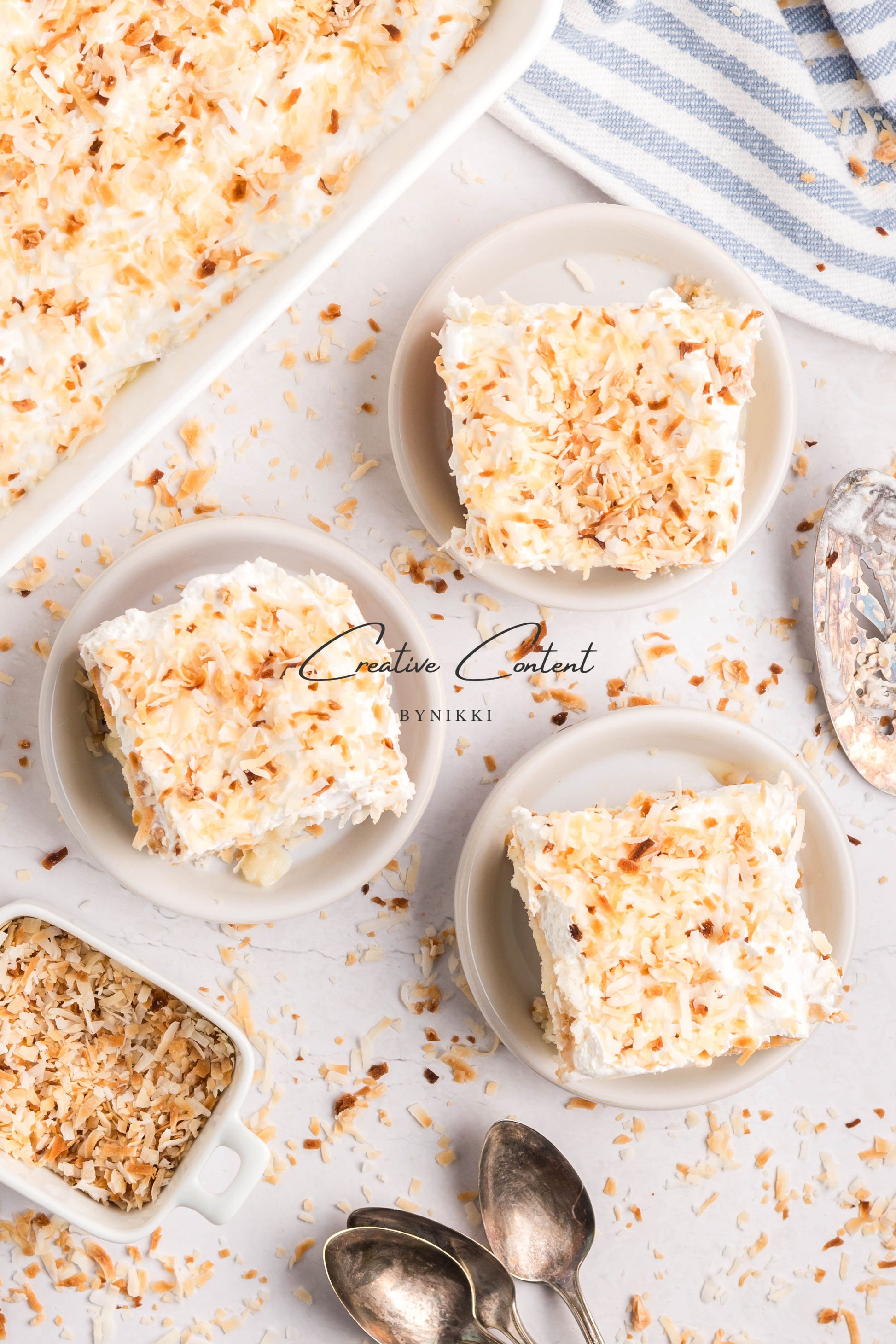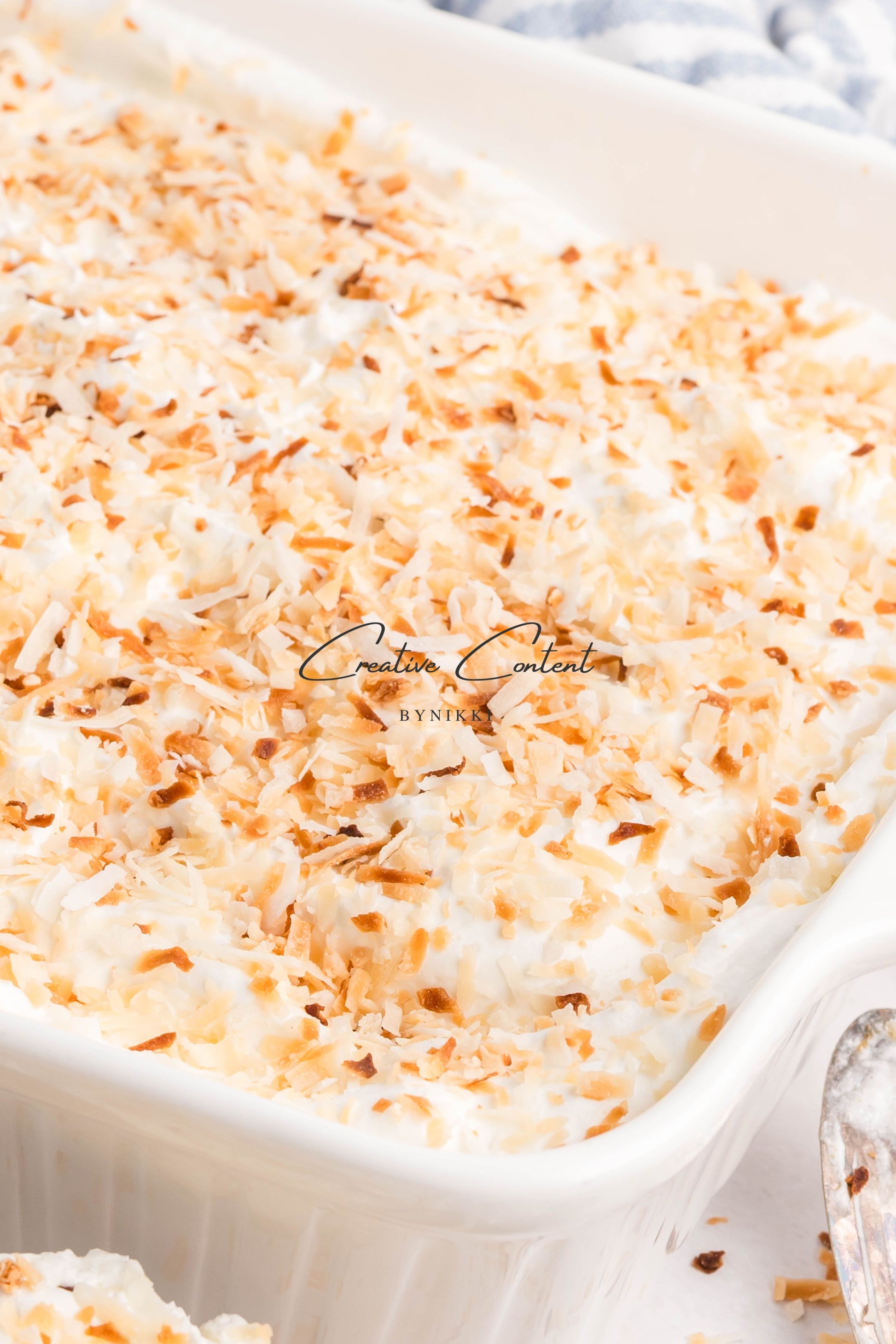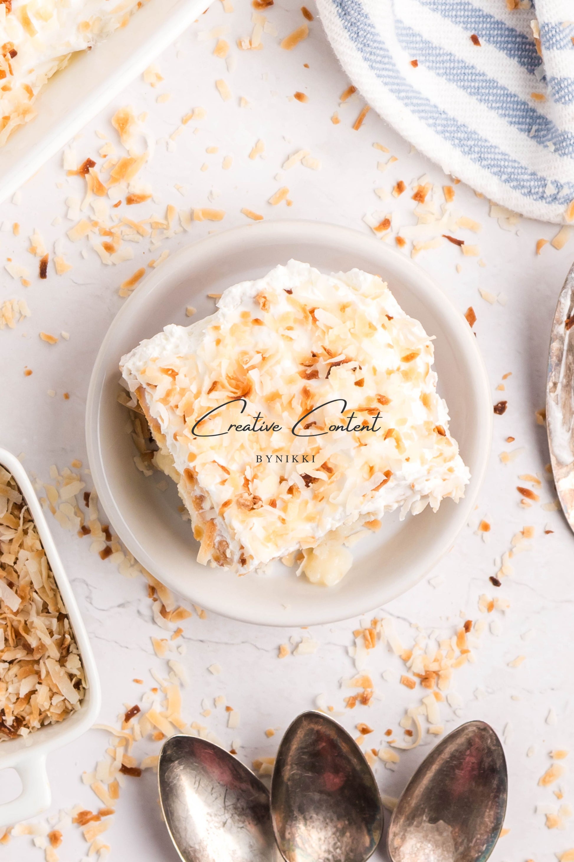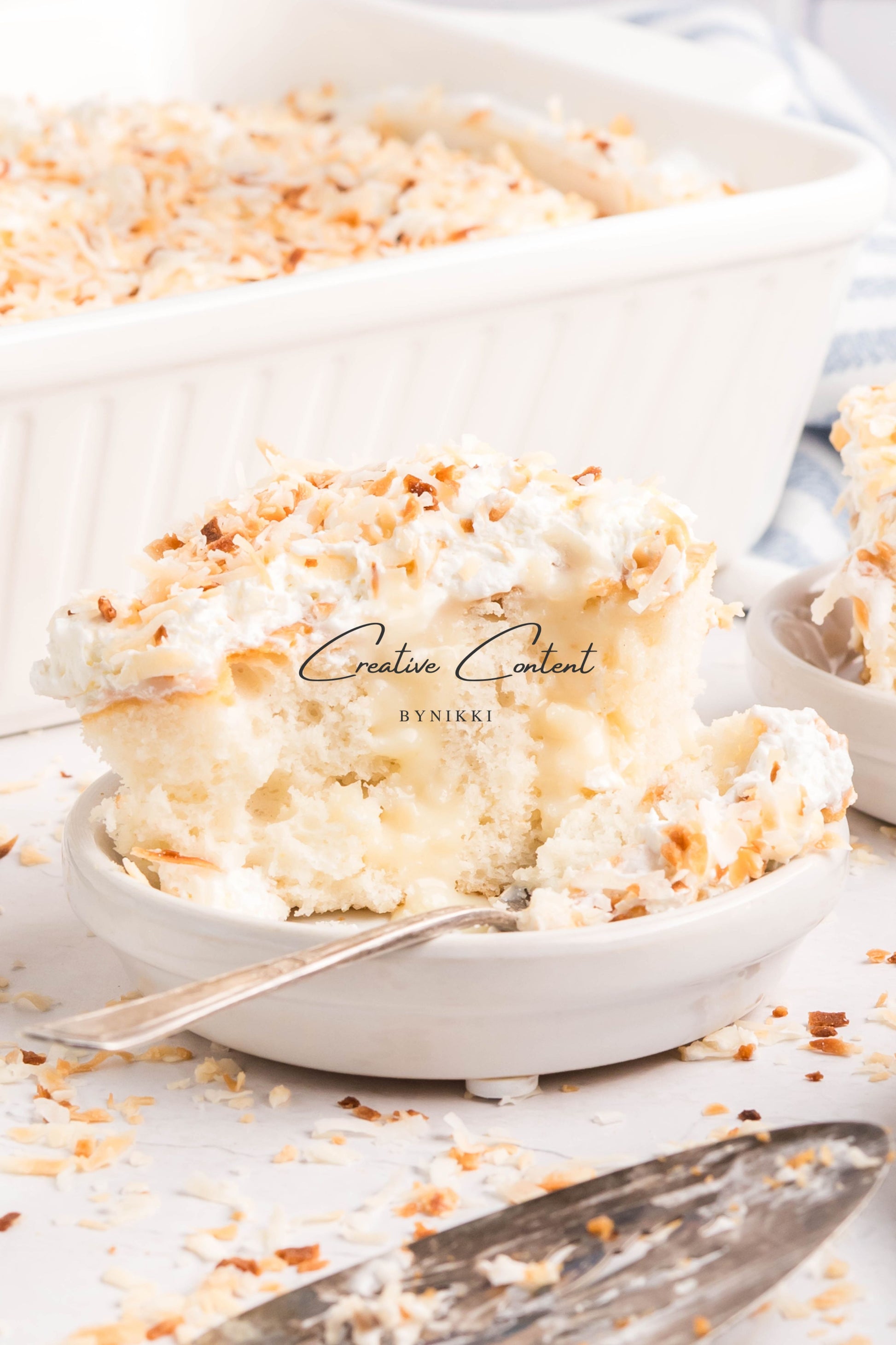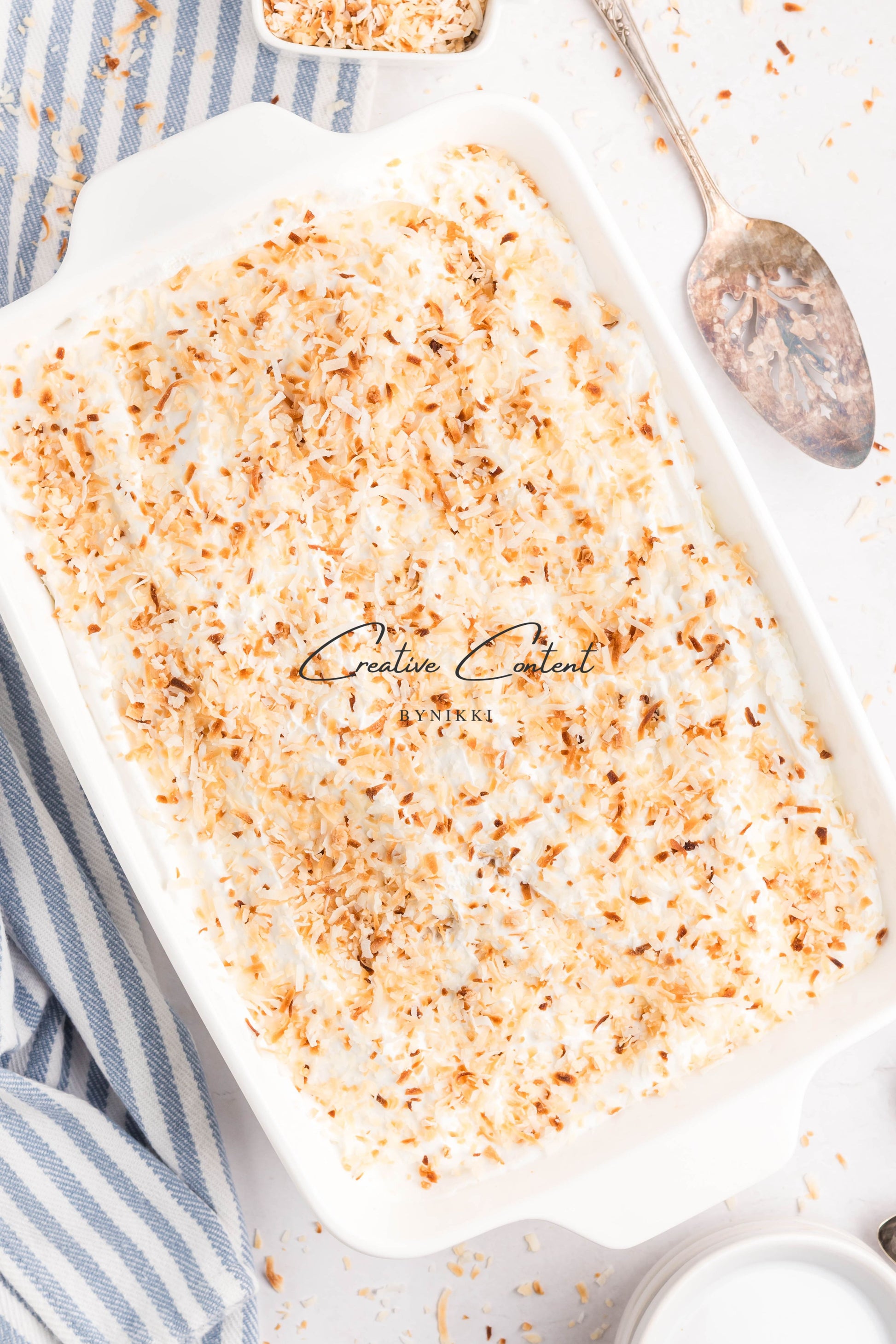 - Ingredients: coconut, white cake mix, egg, coconut extract, sweetened condensed milk, cream of coconut, whipped topping