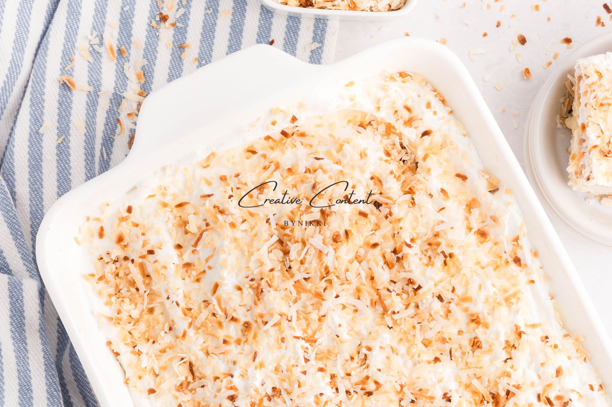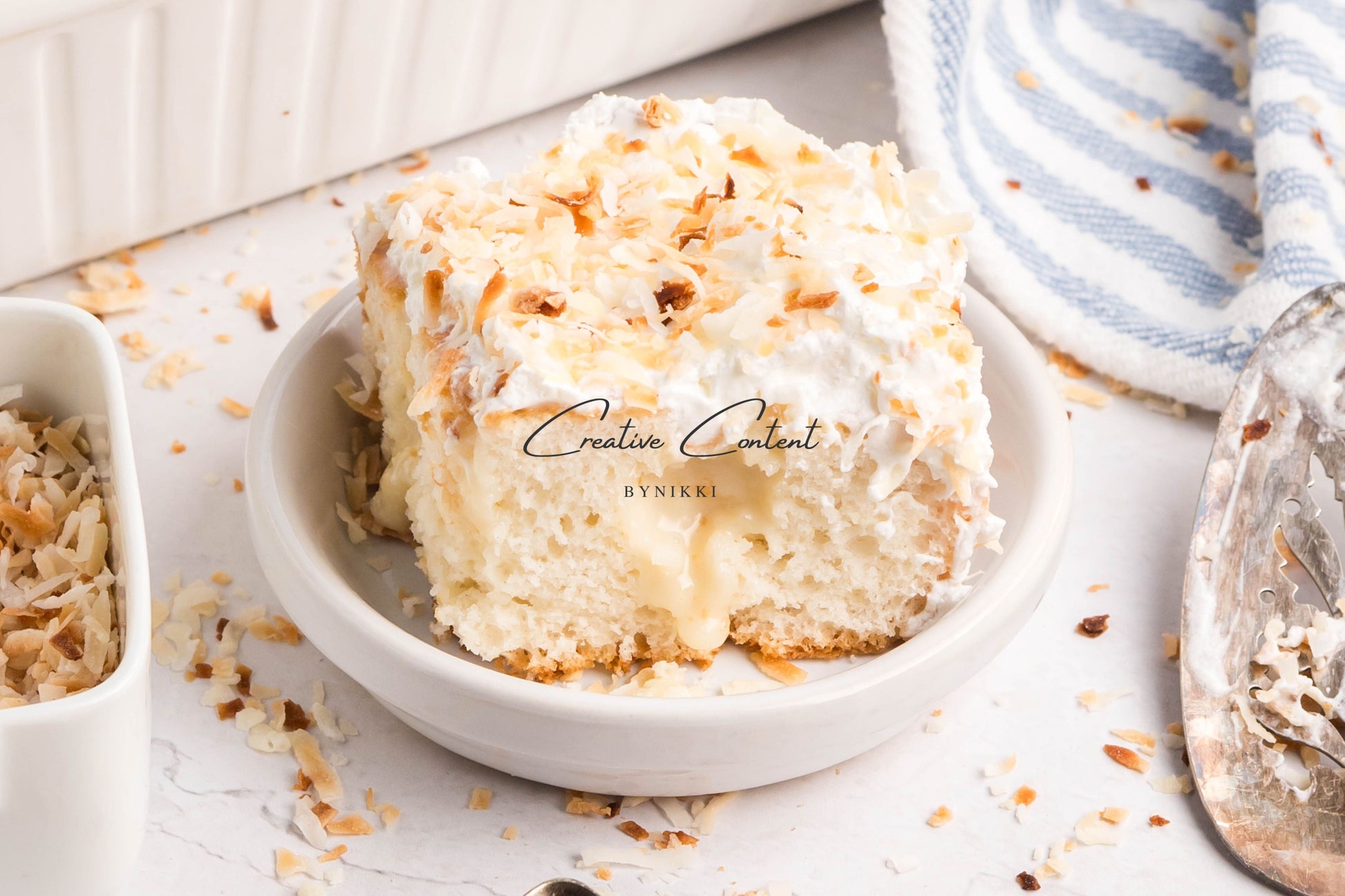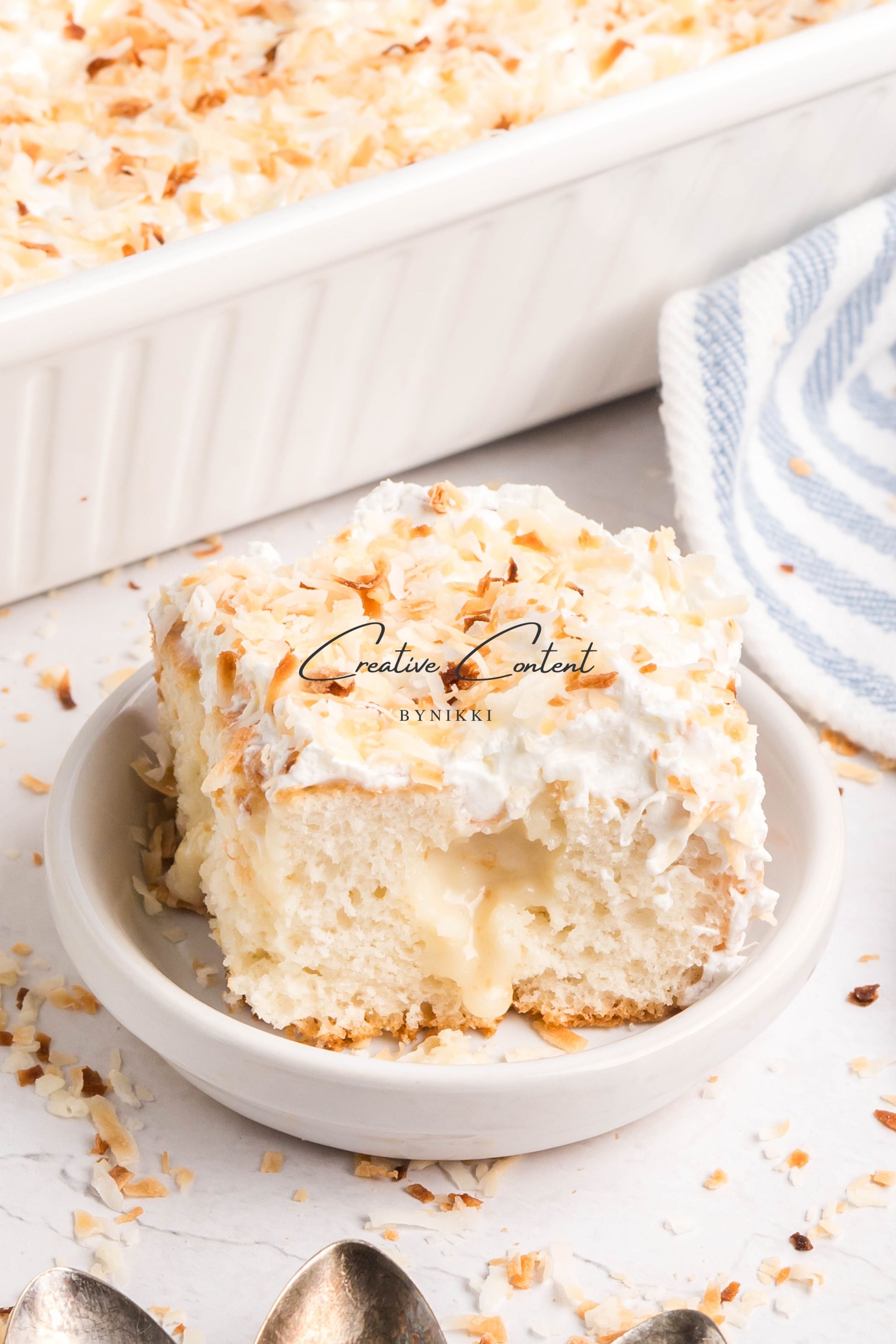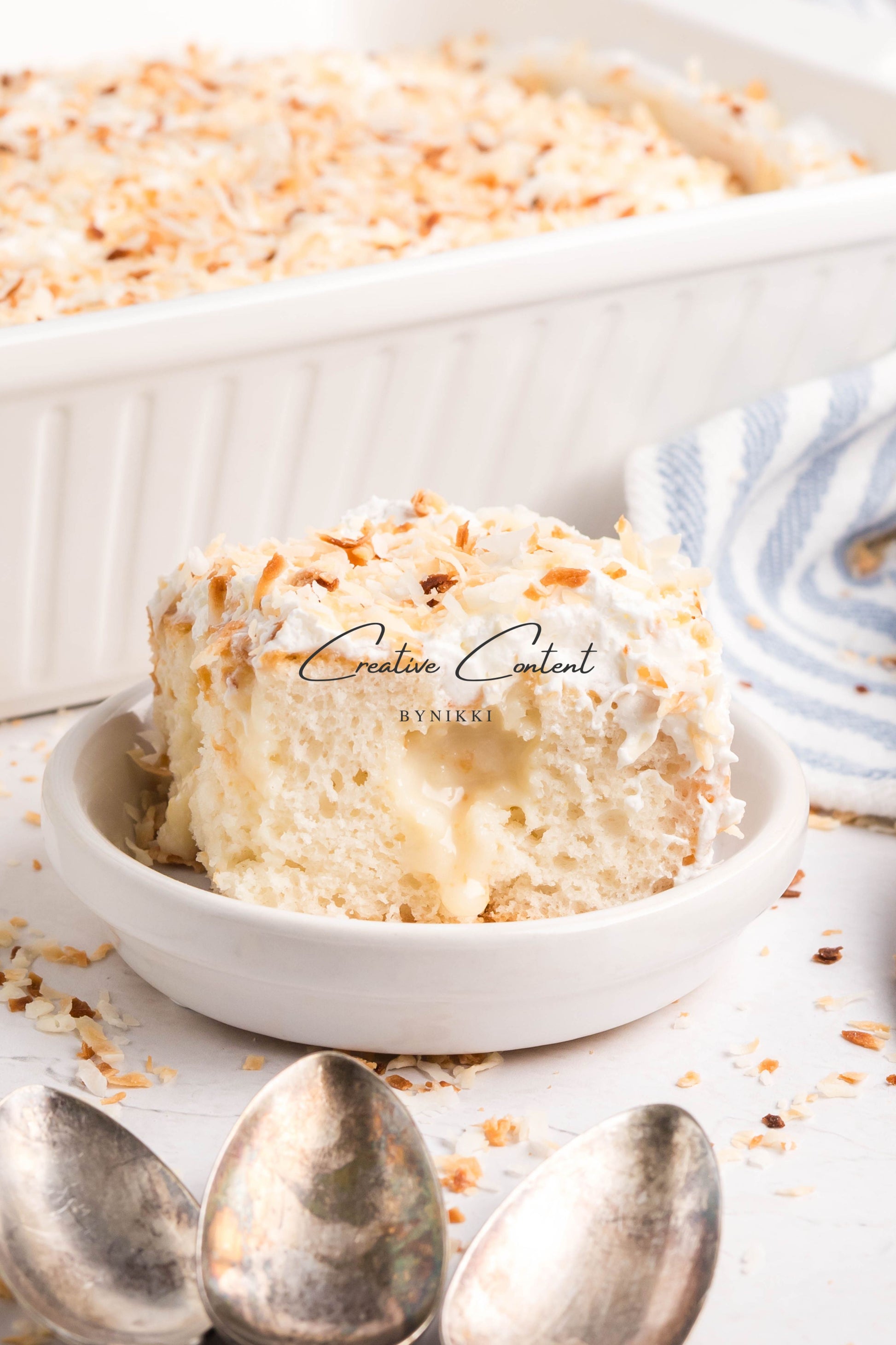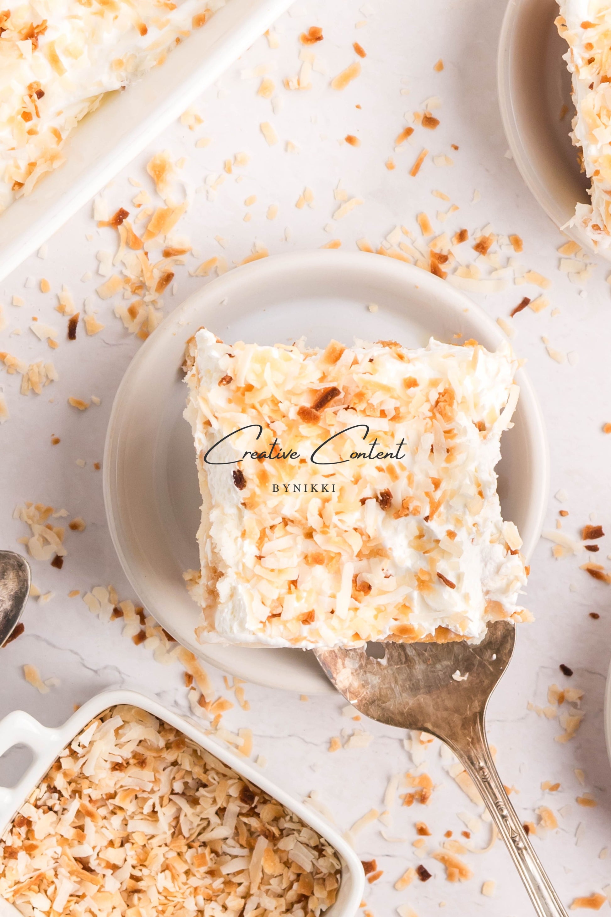 - Ingredients: coconut, white cake mix, egg, coconut extract, sweetened condensed milk, cream of coconut, whipped topping