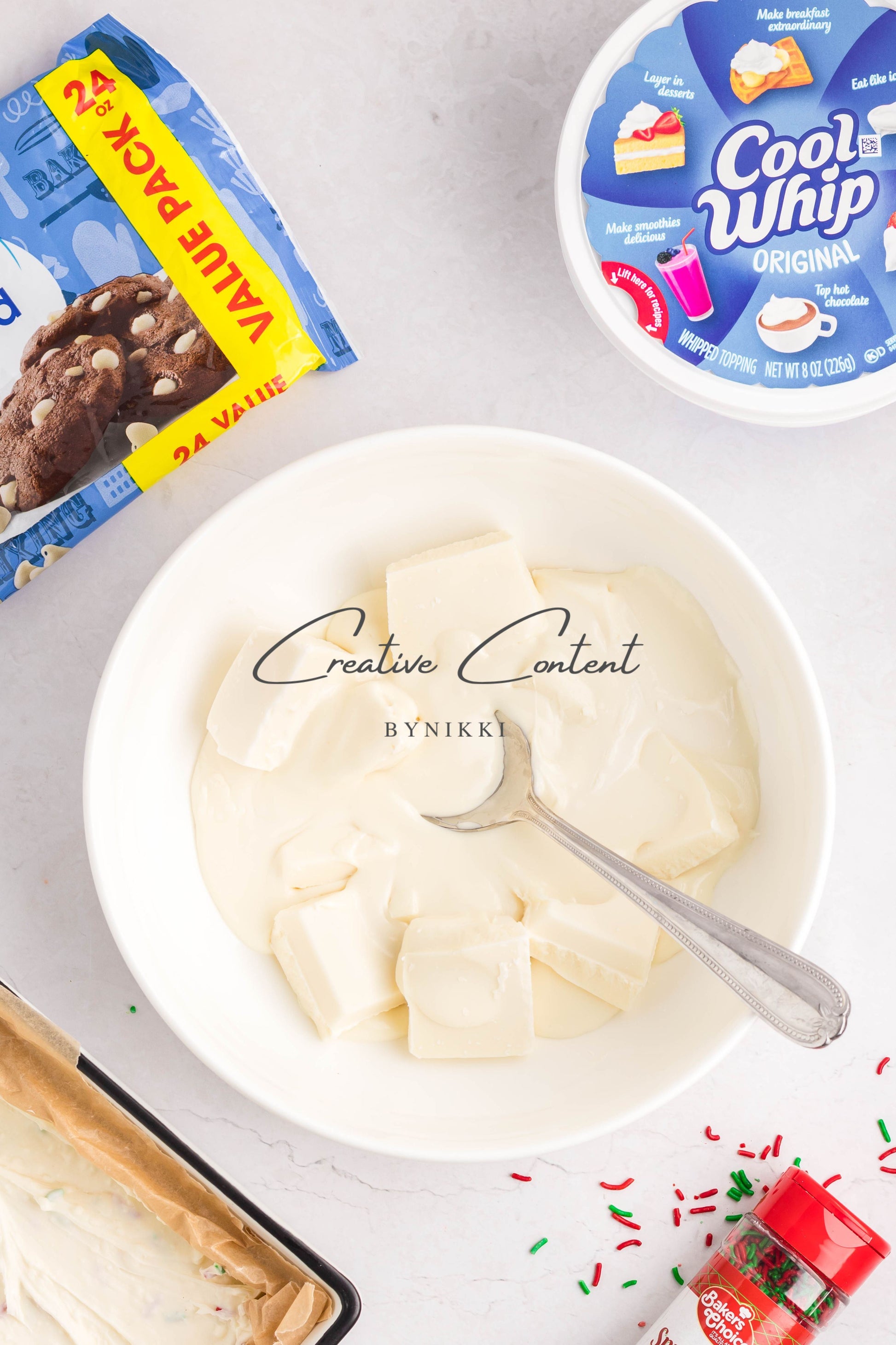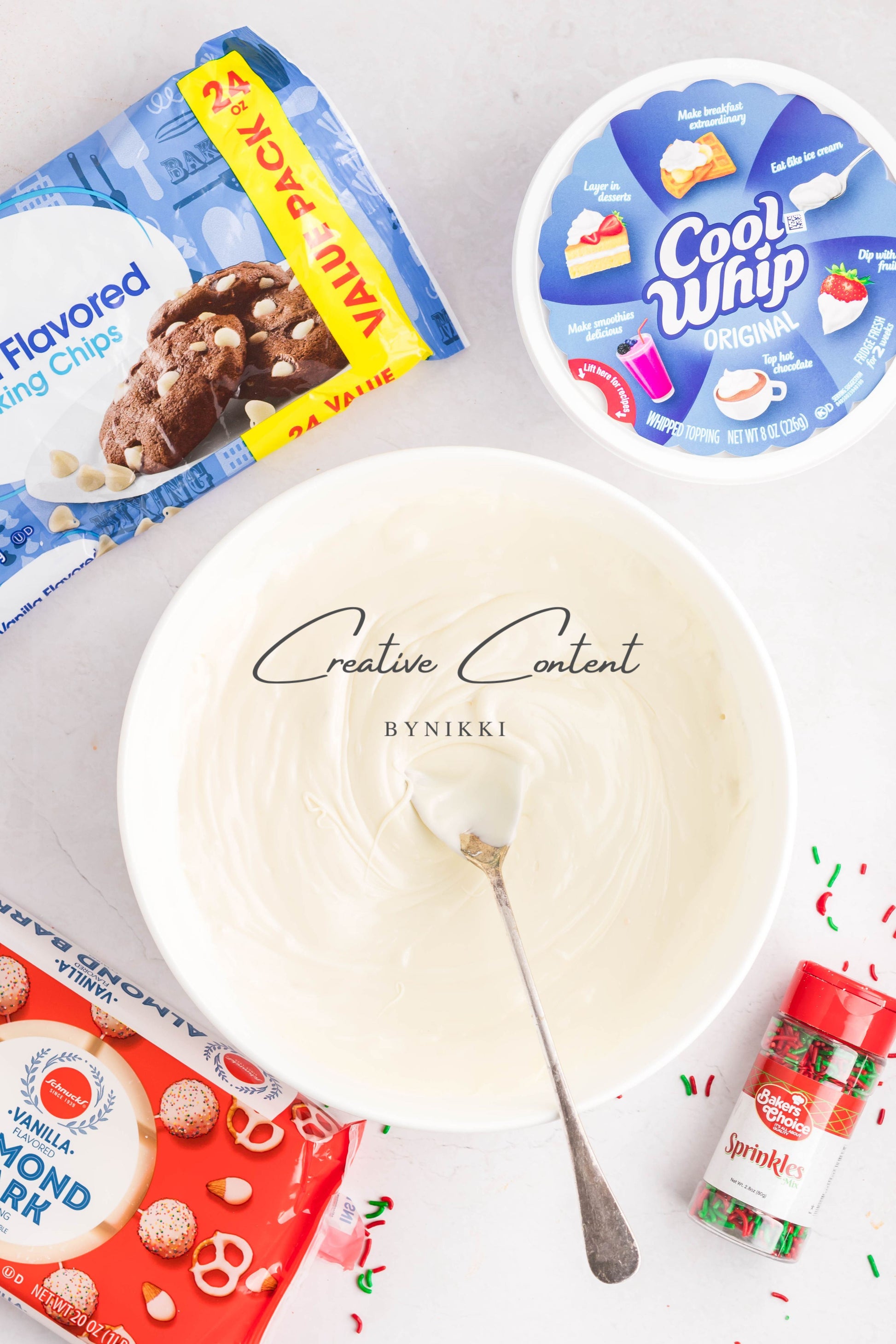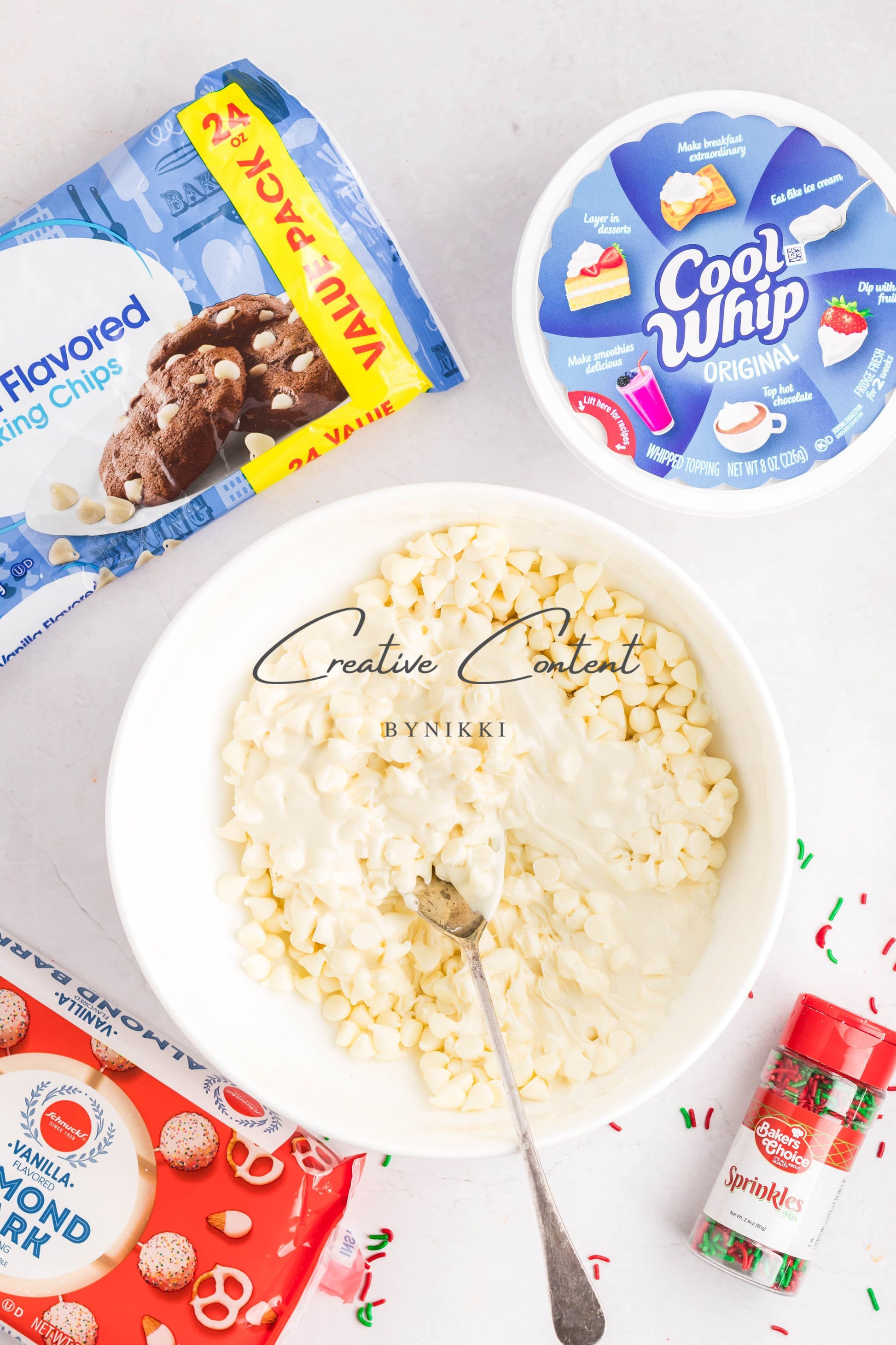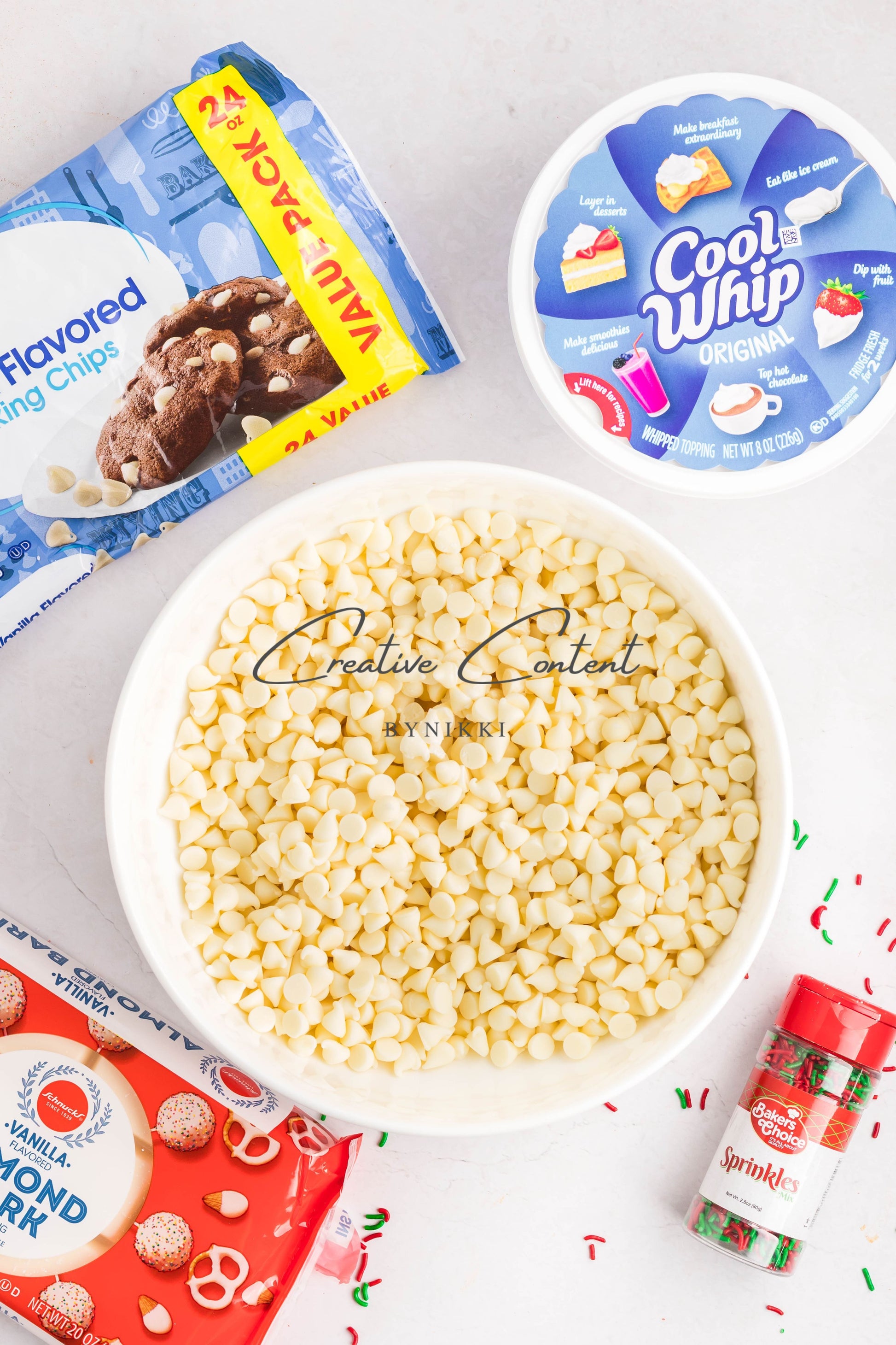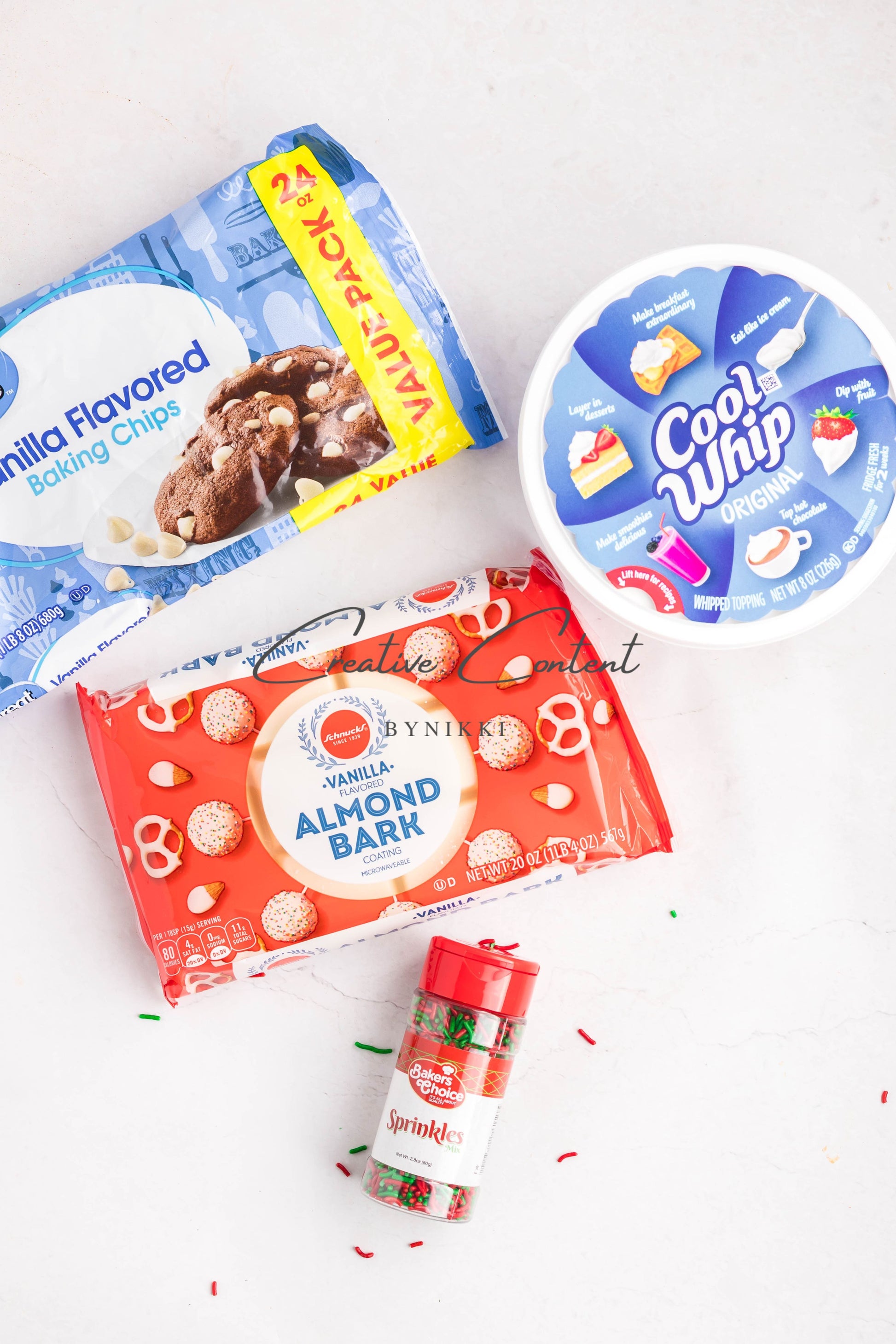 - Ingredients: whipped topping, white chocolate chips, vanilla almond bark, red and green sprinkles