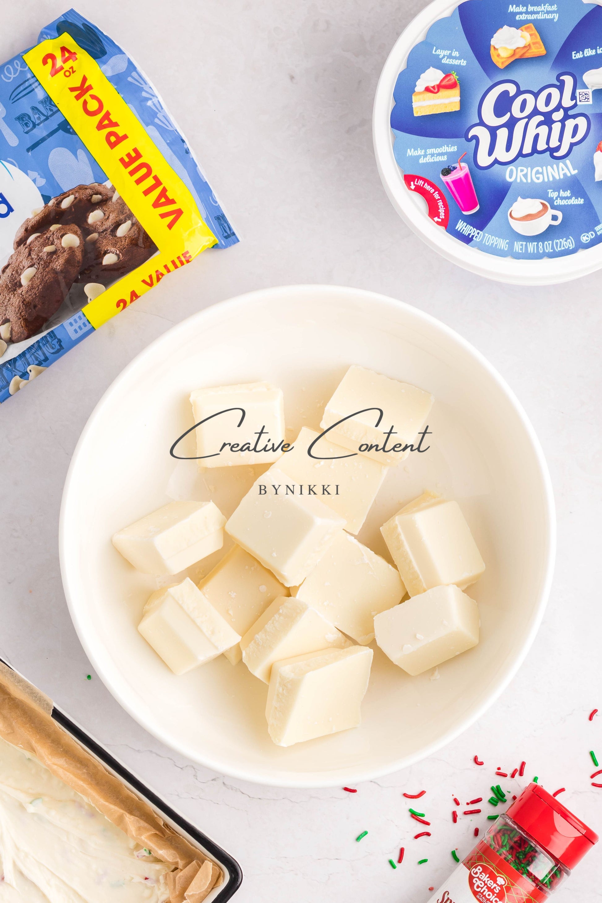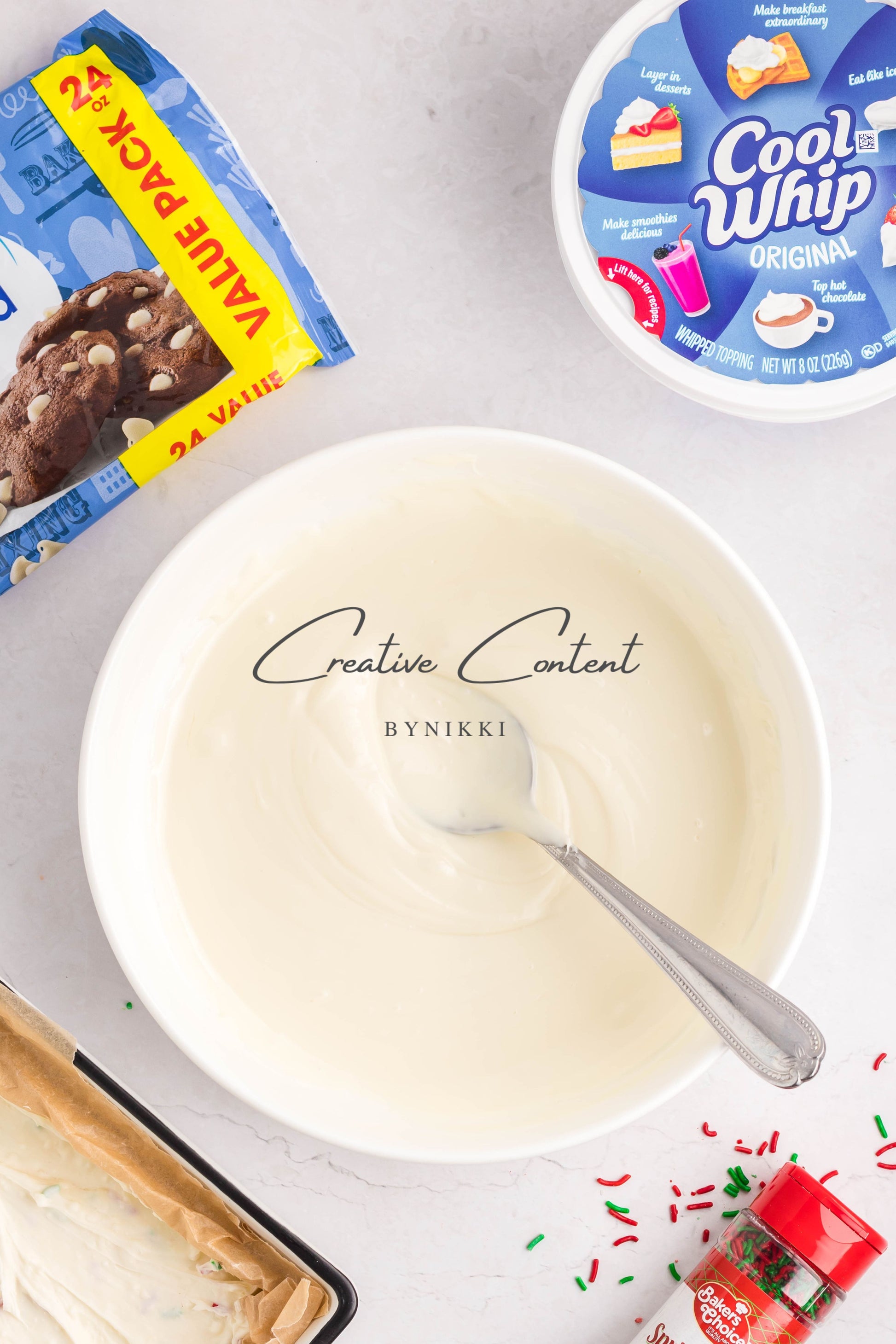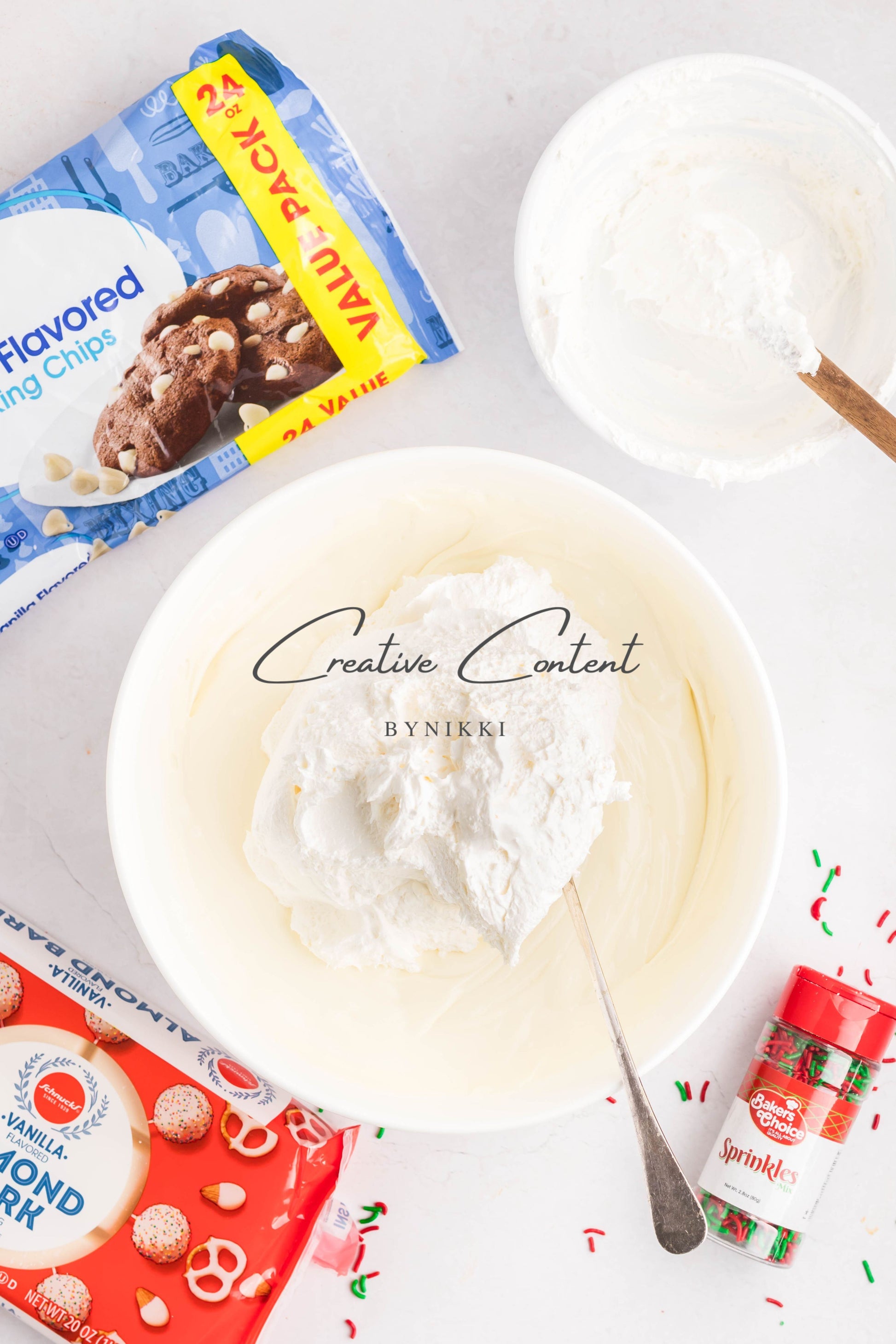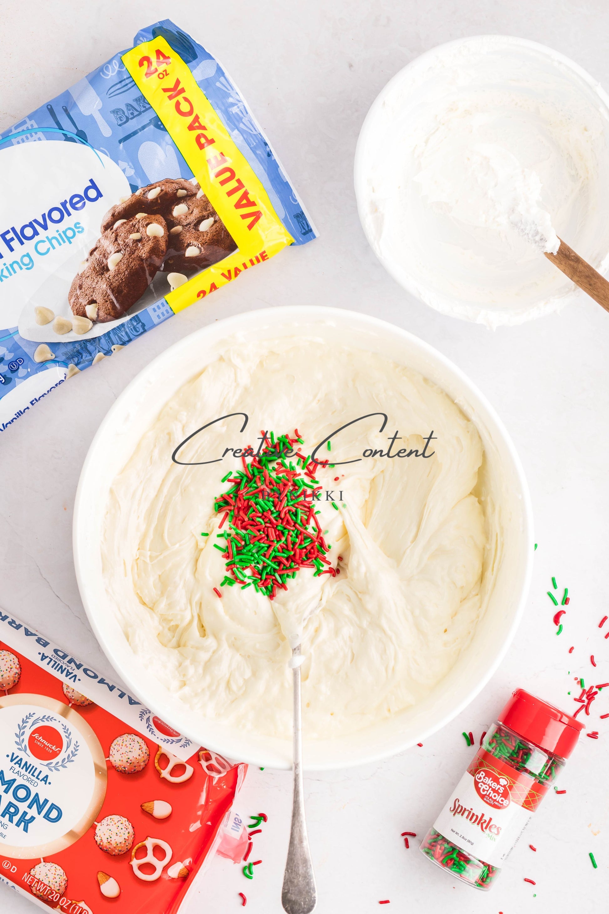- Ingredients: whipped topping, white chocolate chips, vanilla almond bark, red and green sprinkles