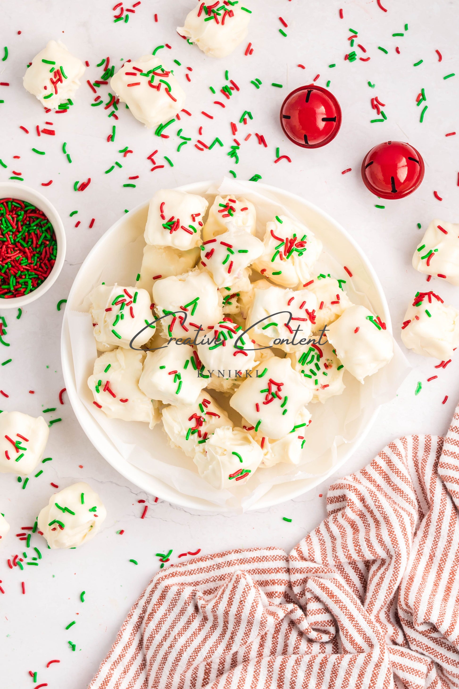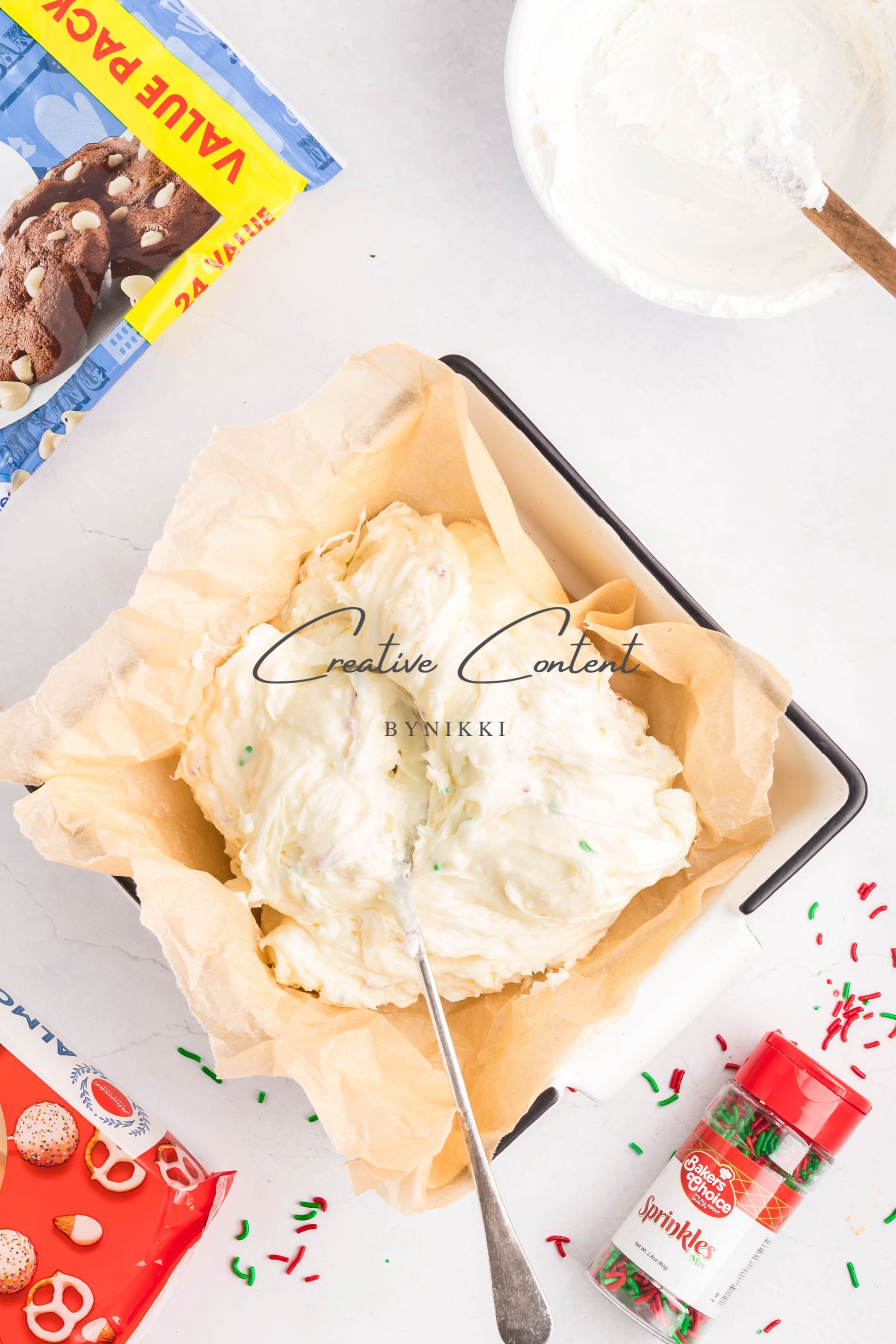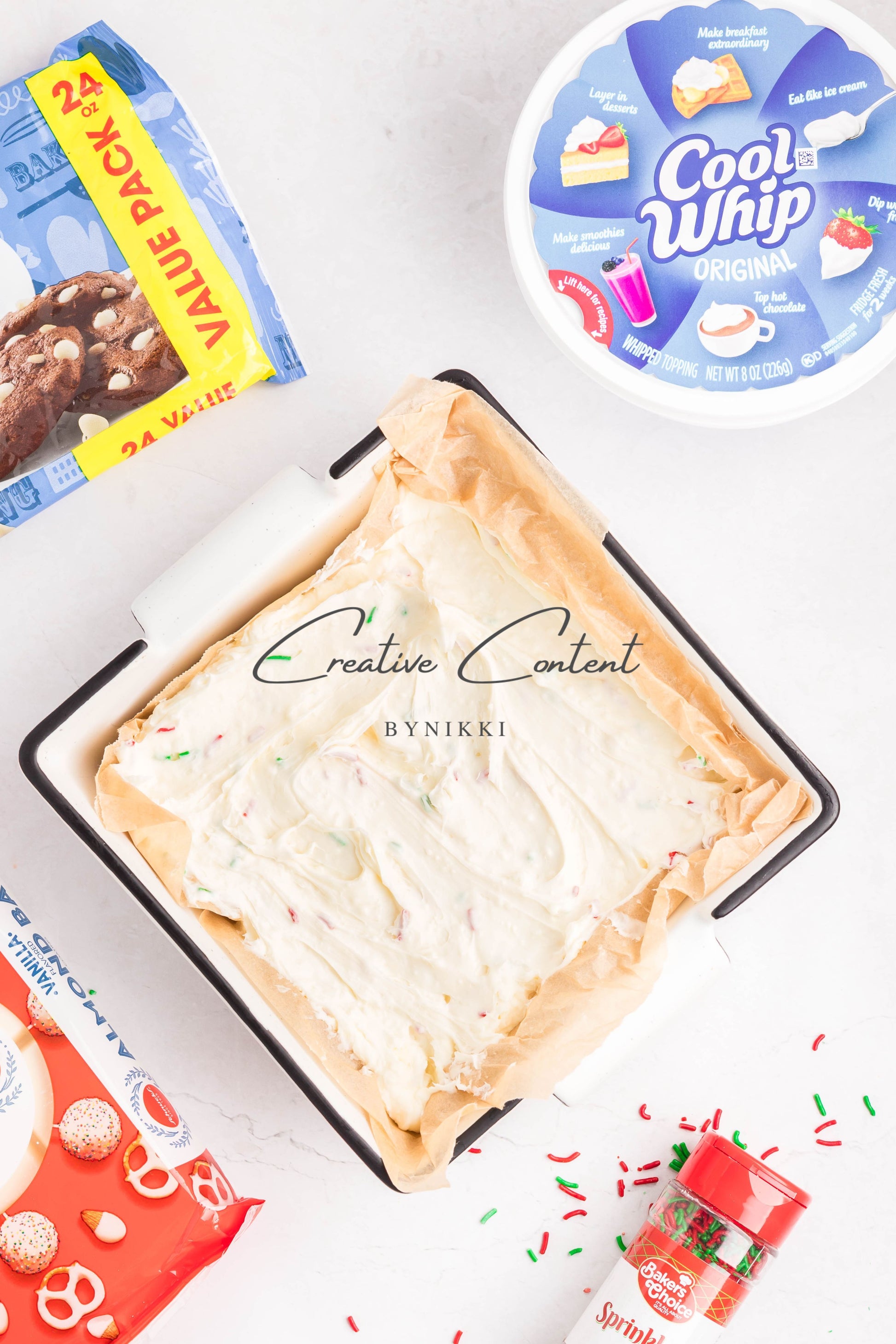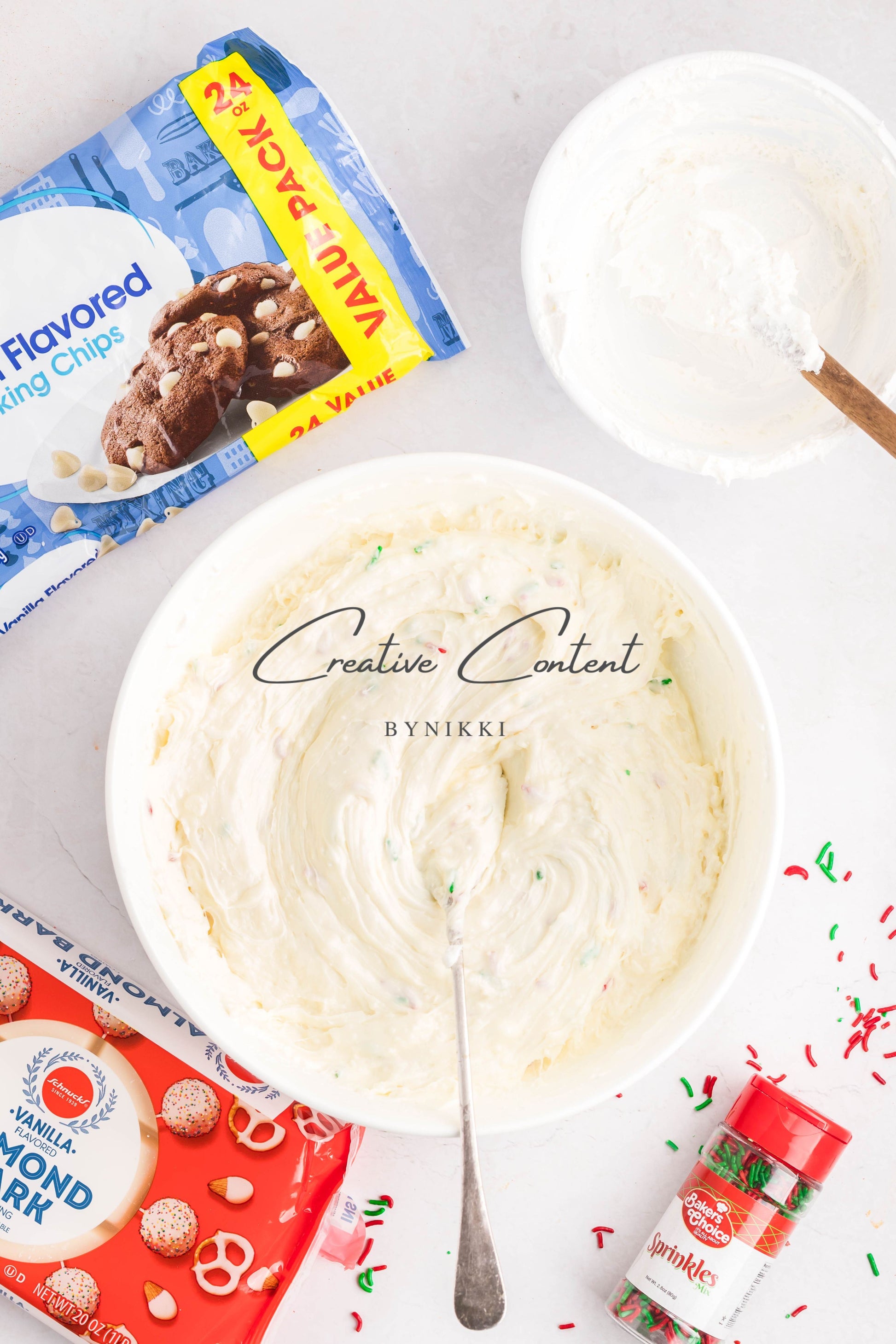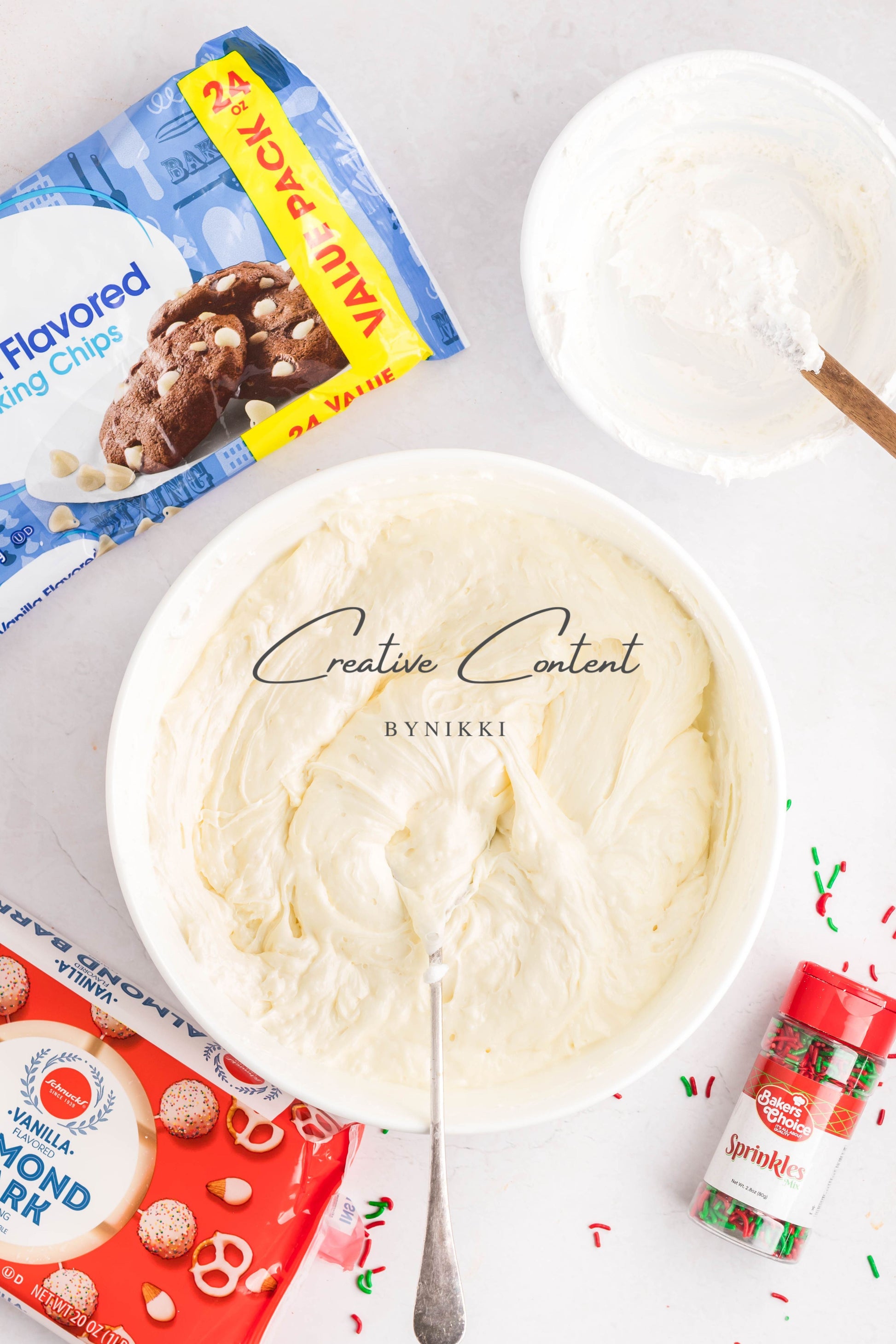 - Ingredients: whipped topping, white chocolate chips, vanilla almond bark, red and green sprinkles