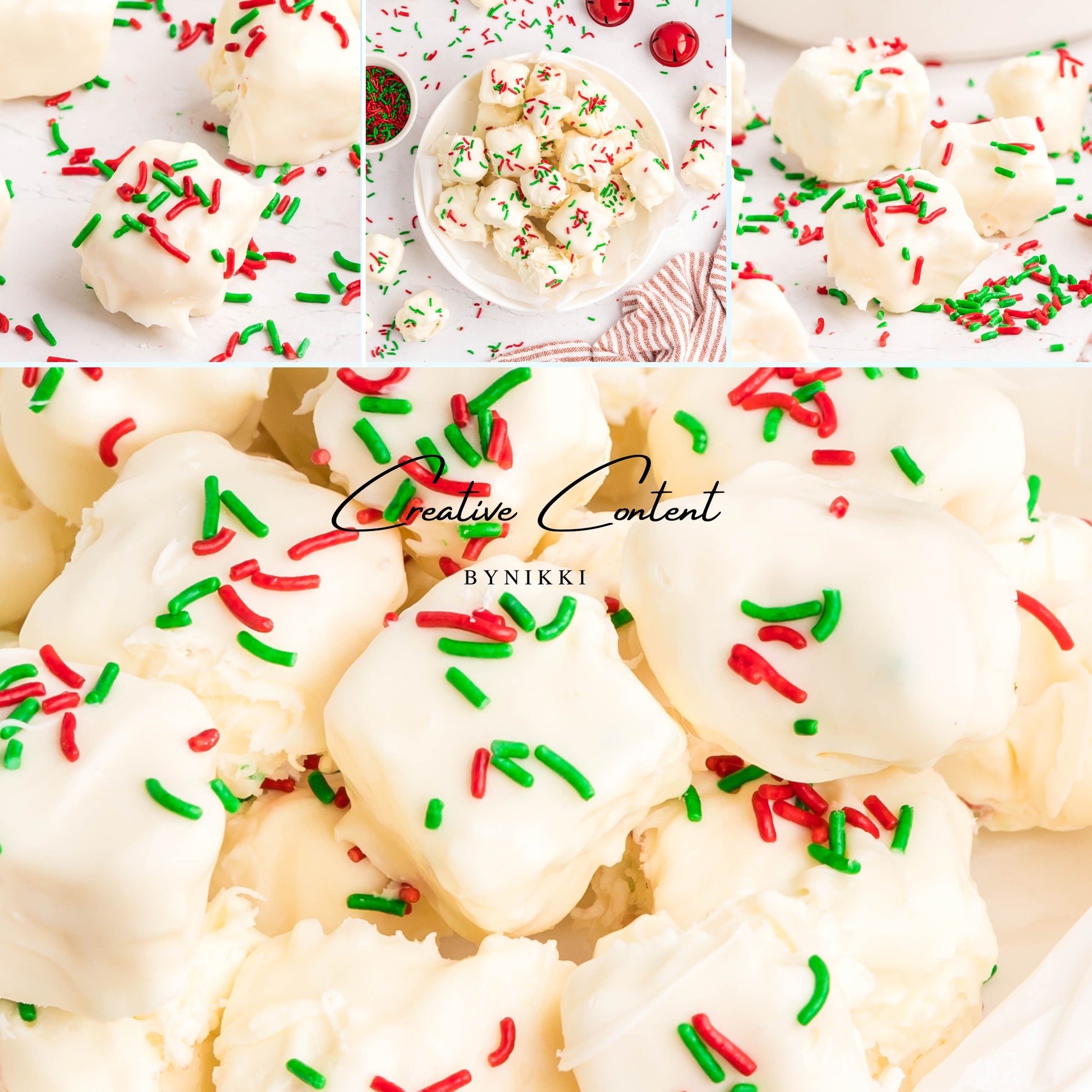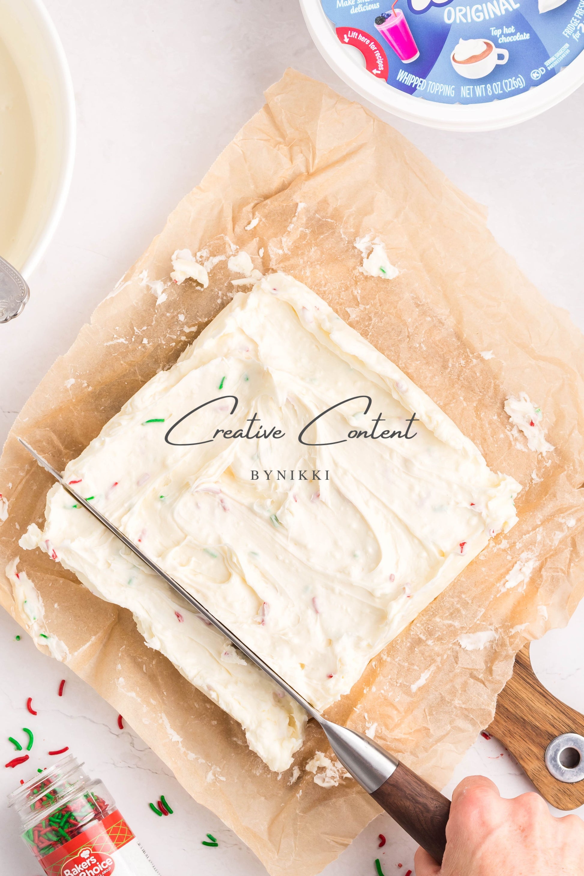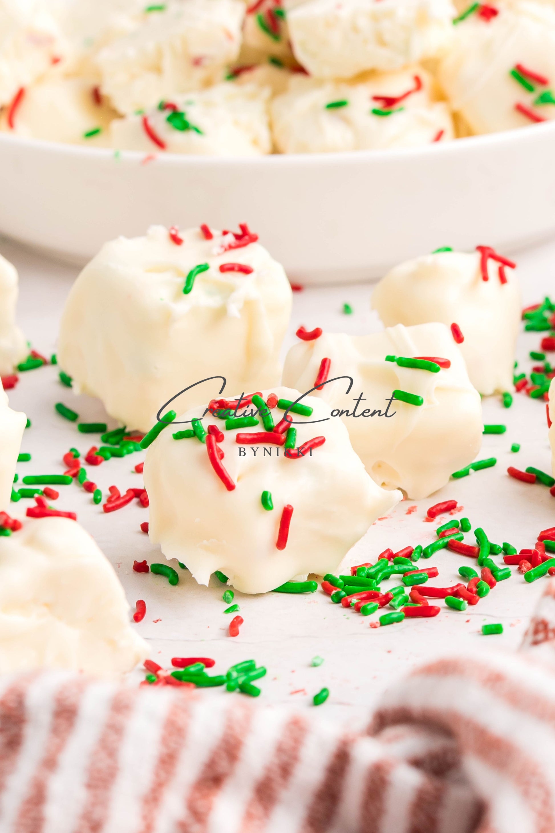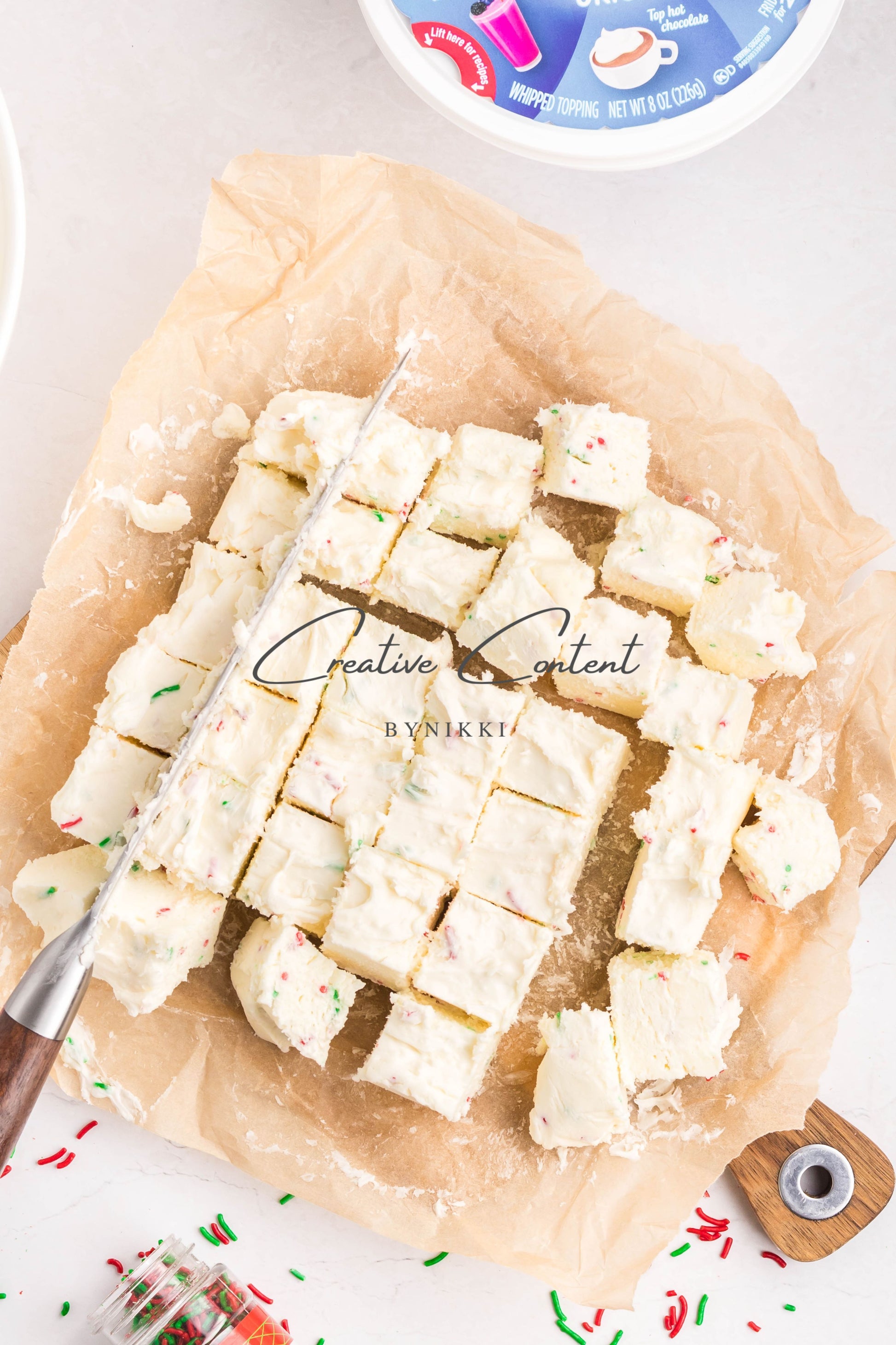- Ingredients: whipped topping, white chocolate chips, vanilla almond bark, red and green sprinkles