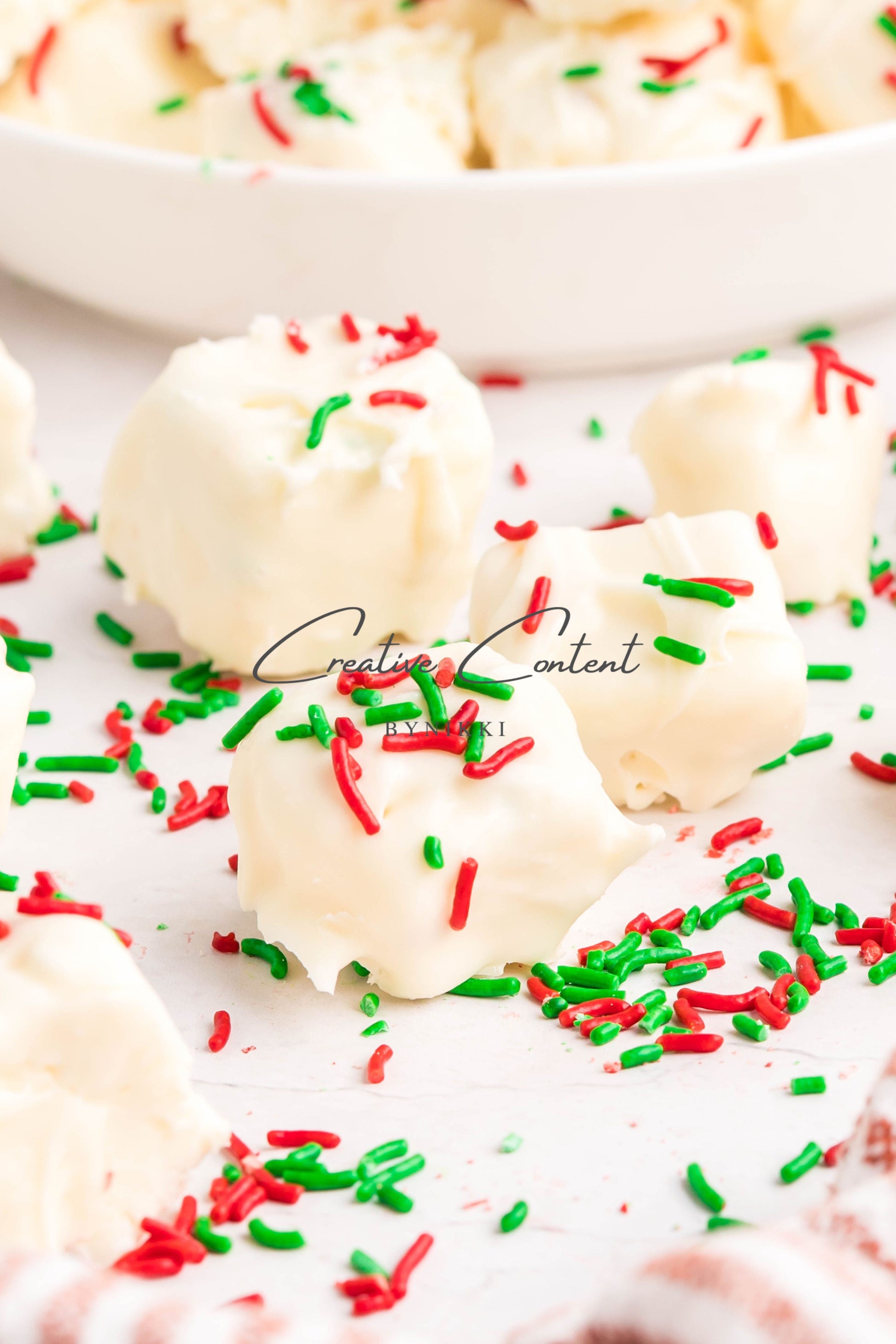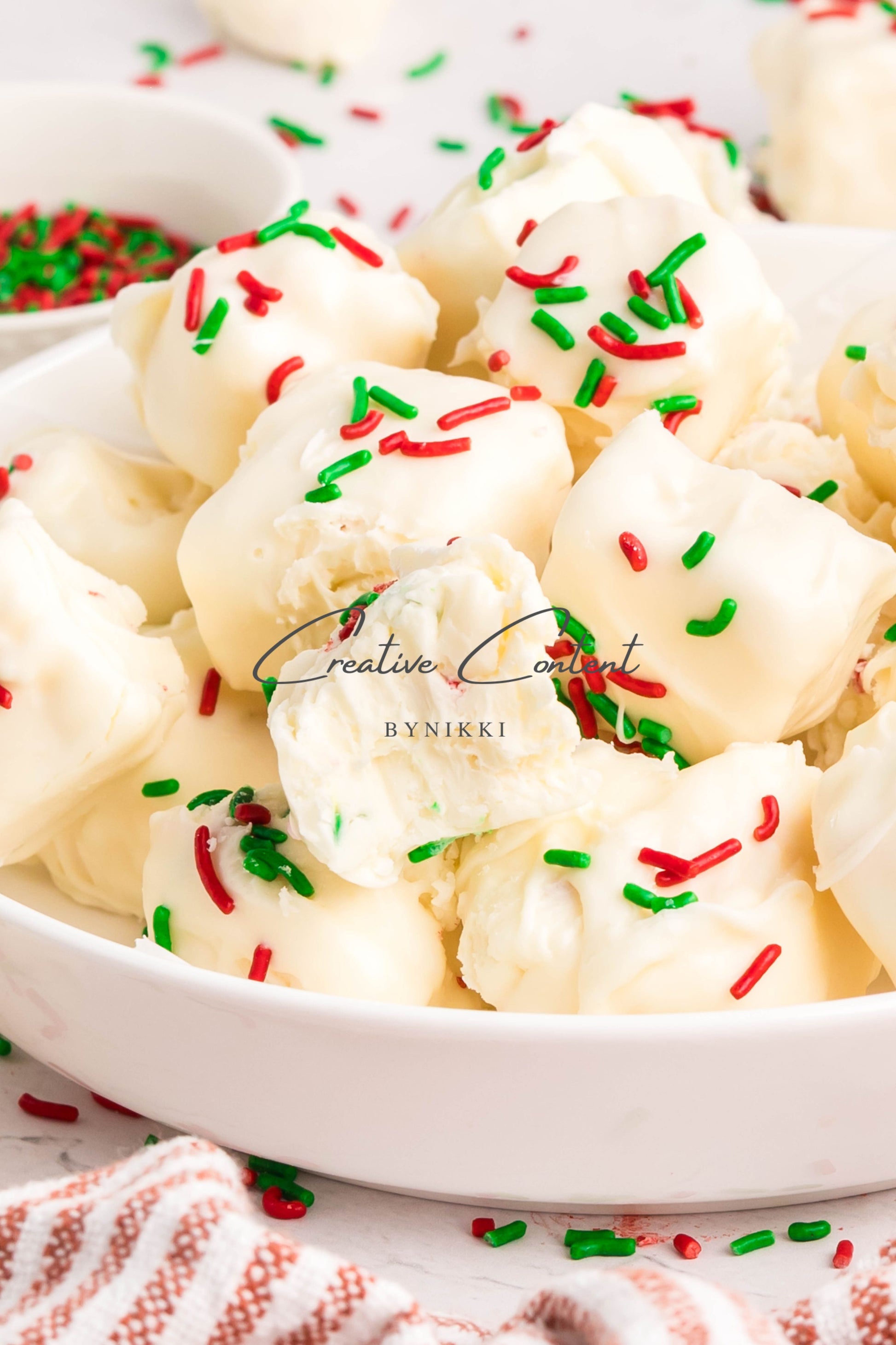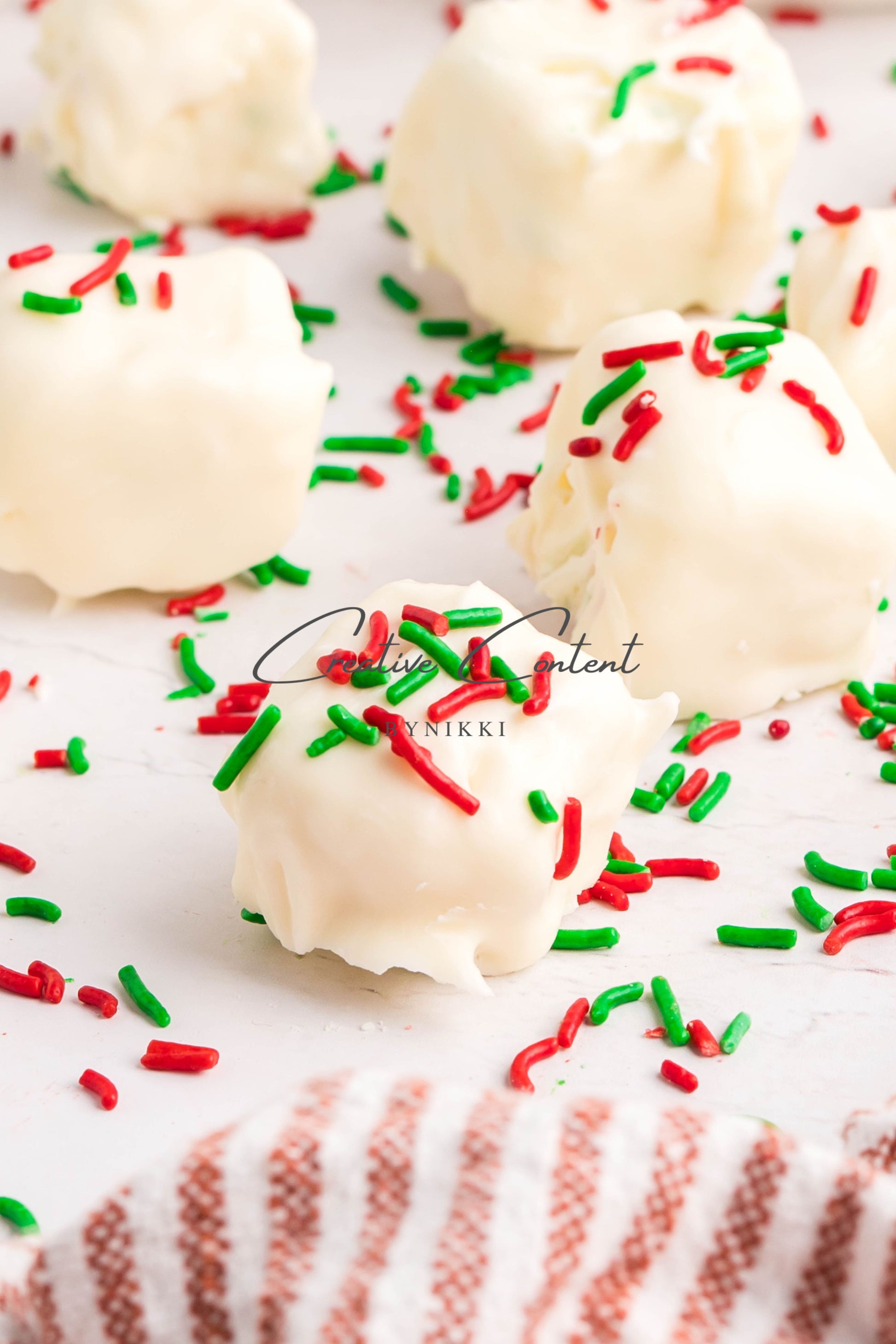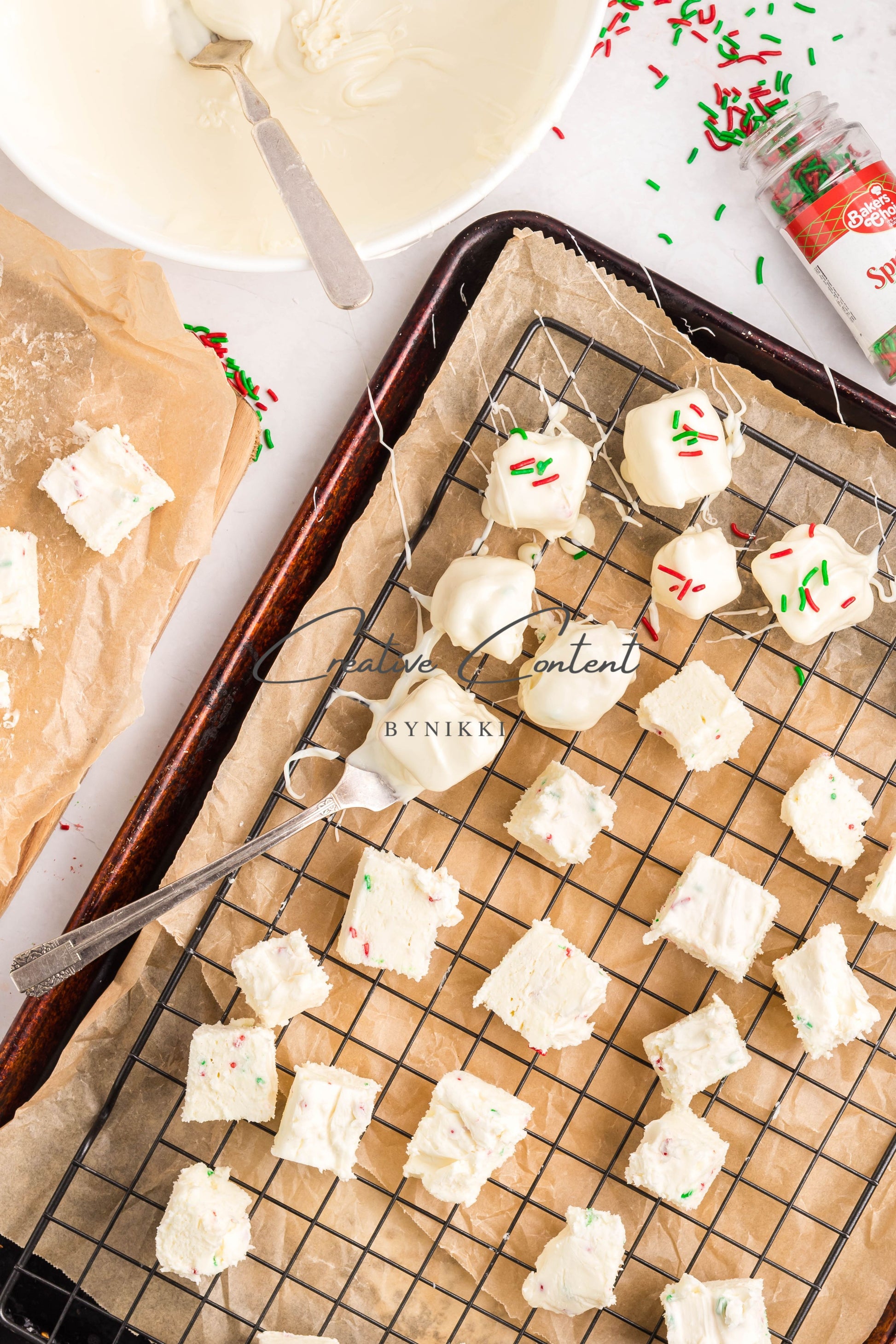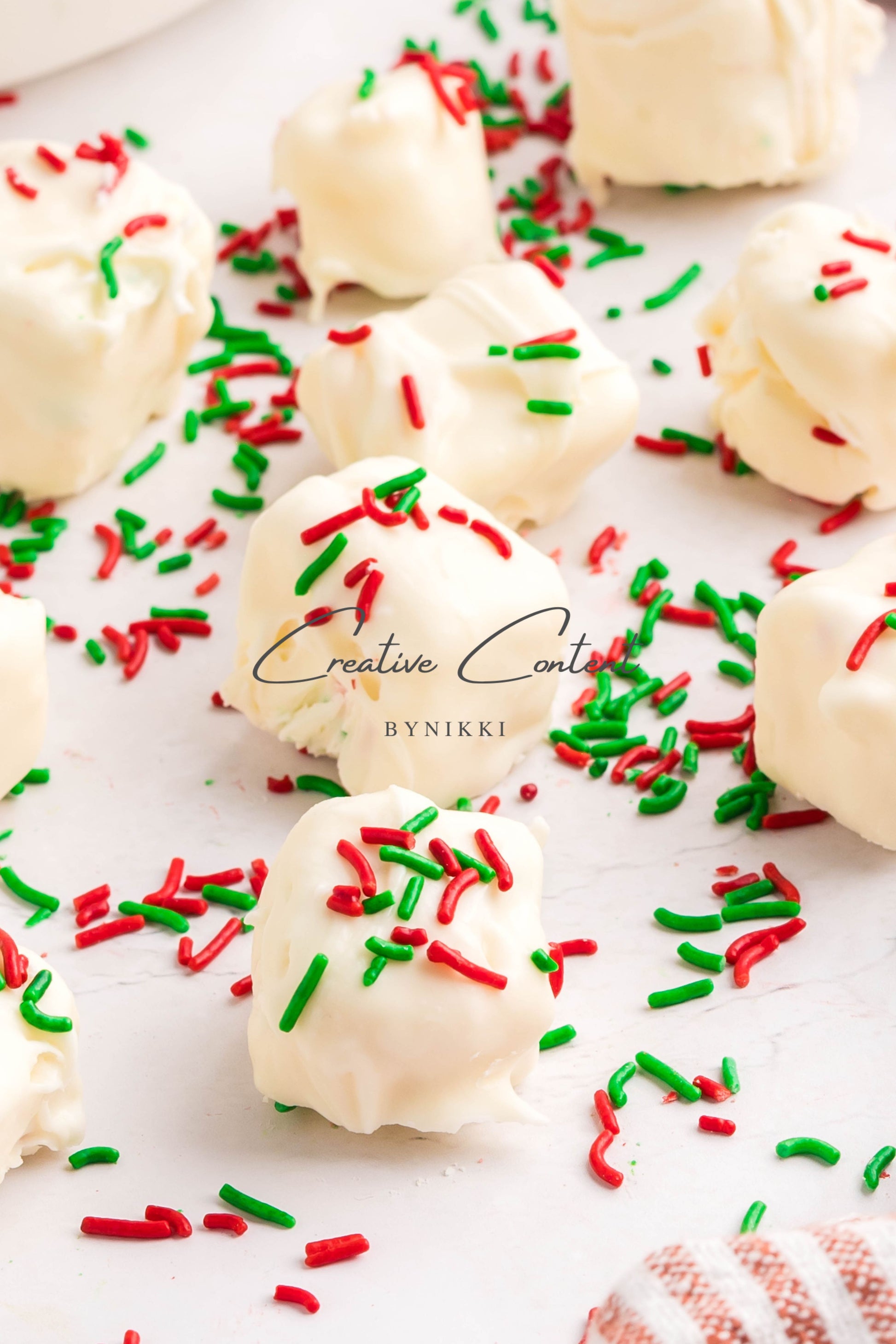 - Ingredients: whipped topping, white chocolate chips, vanilla almond bark, red and green sprinkles