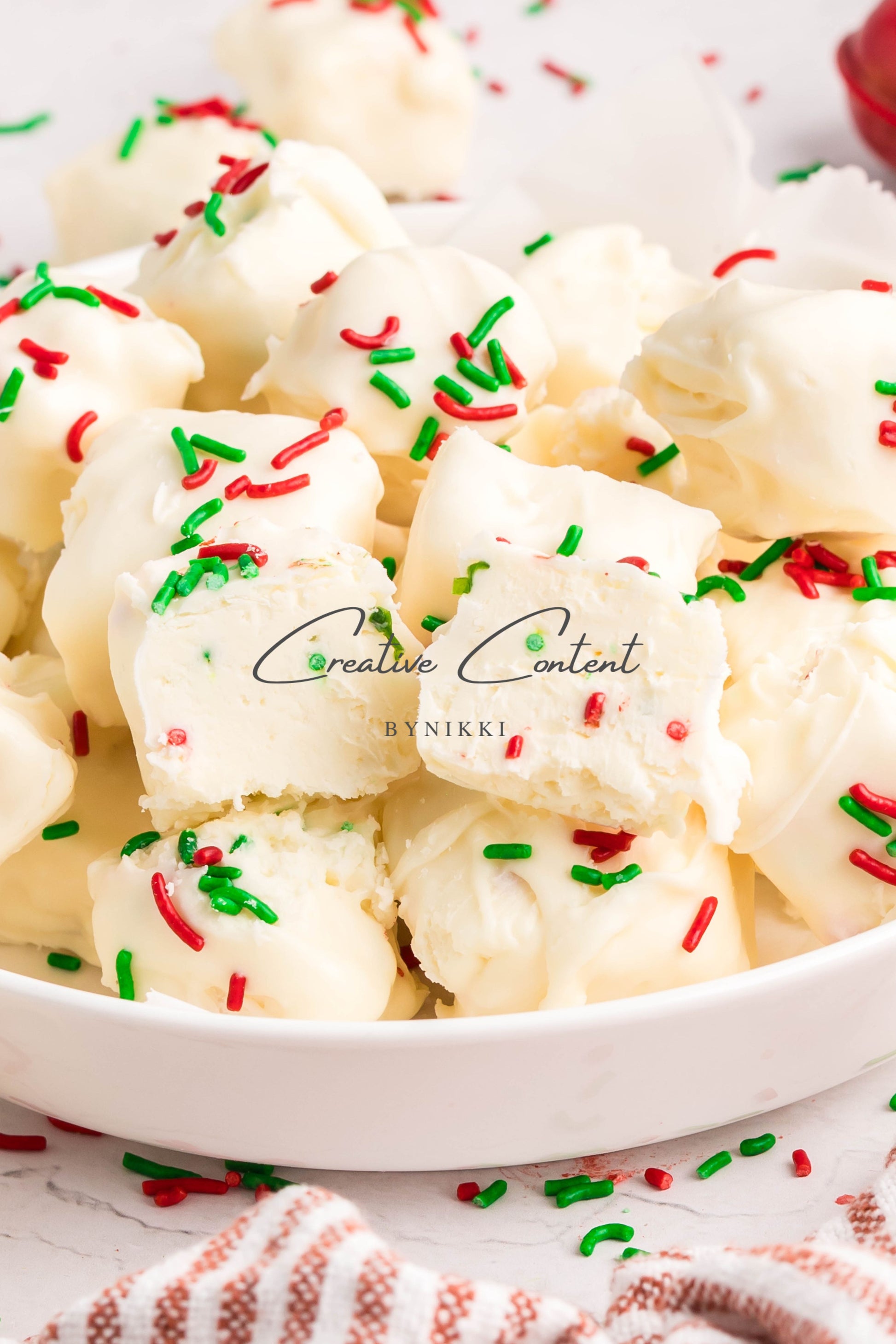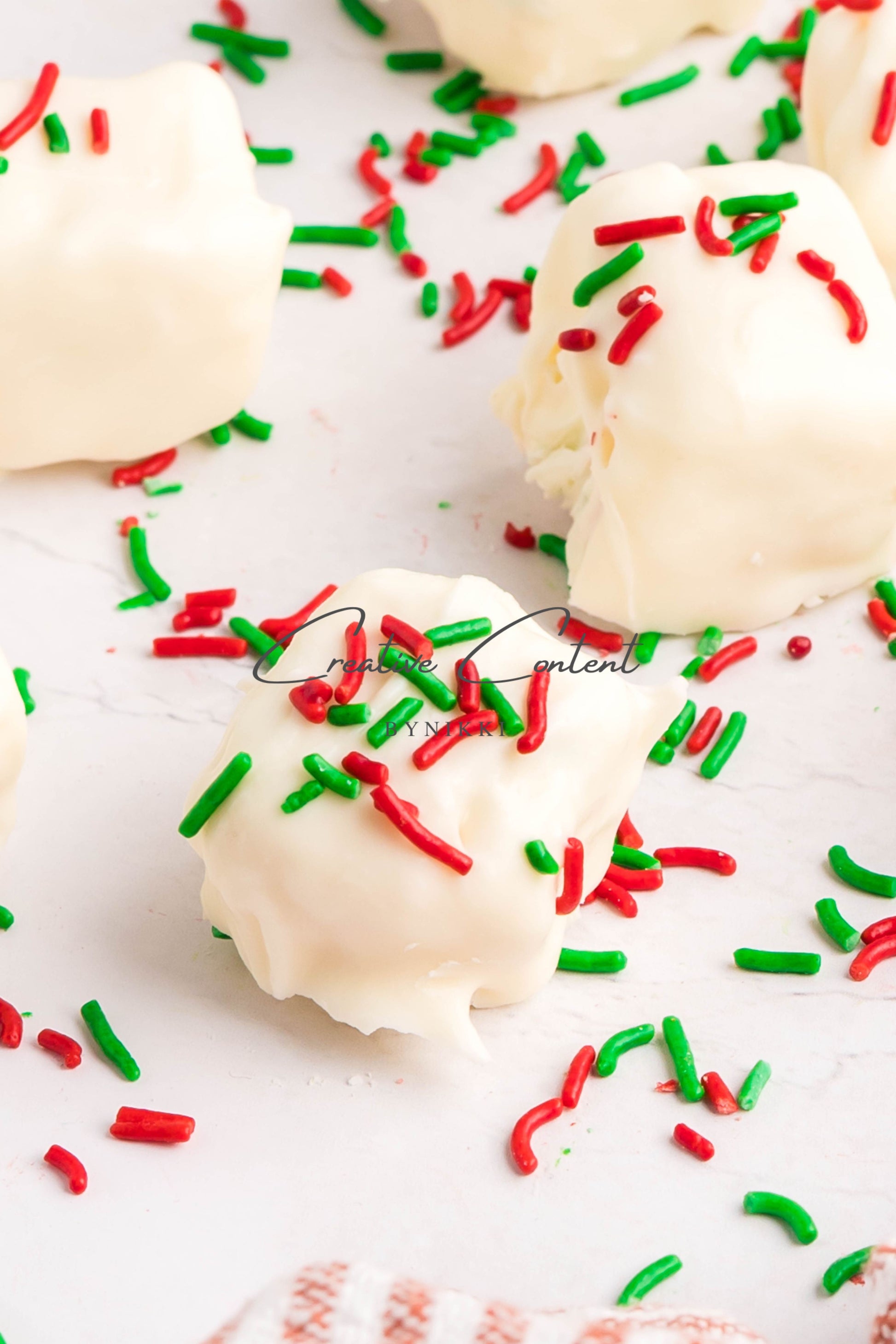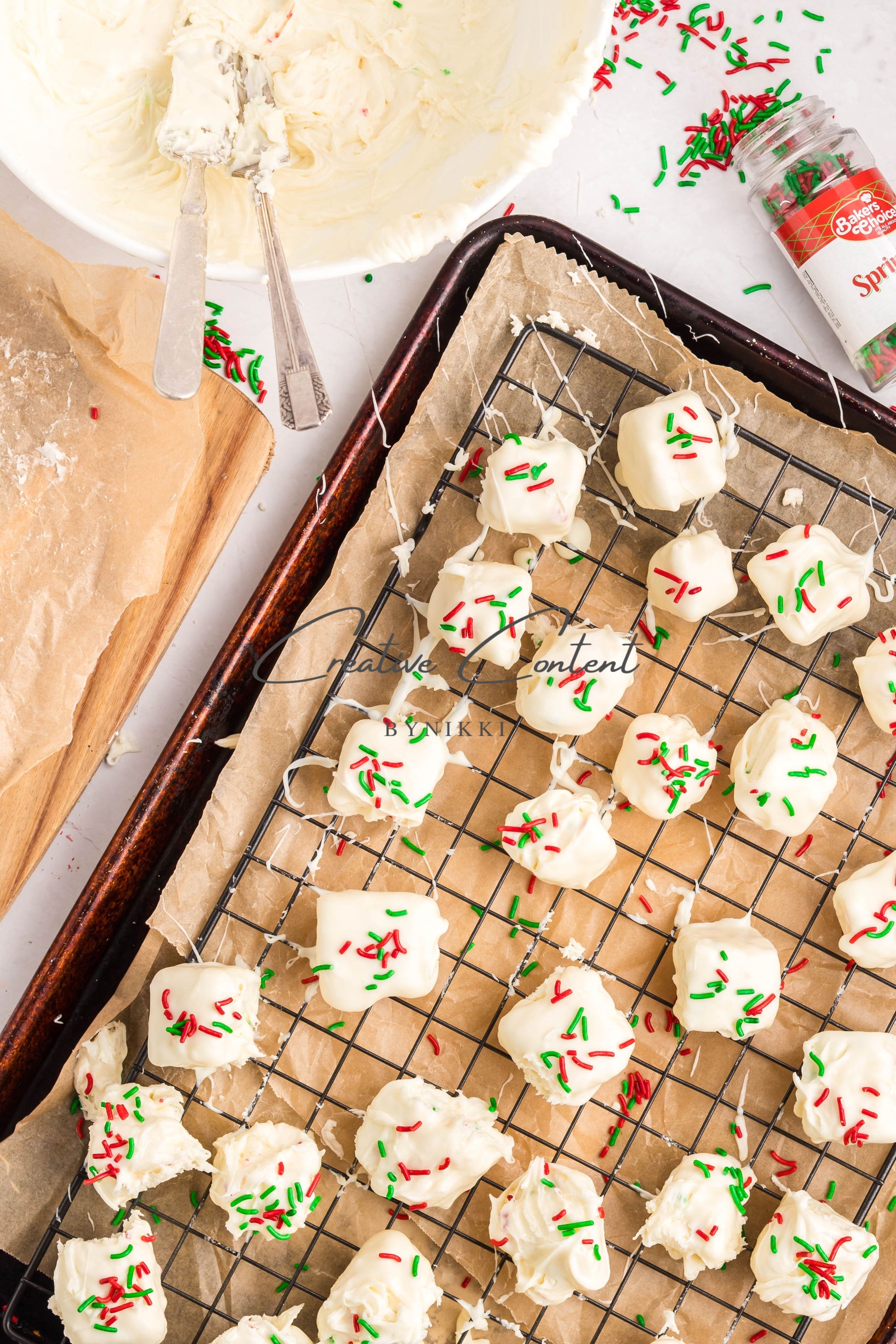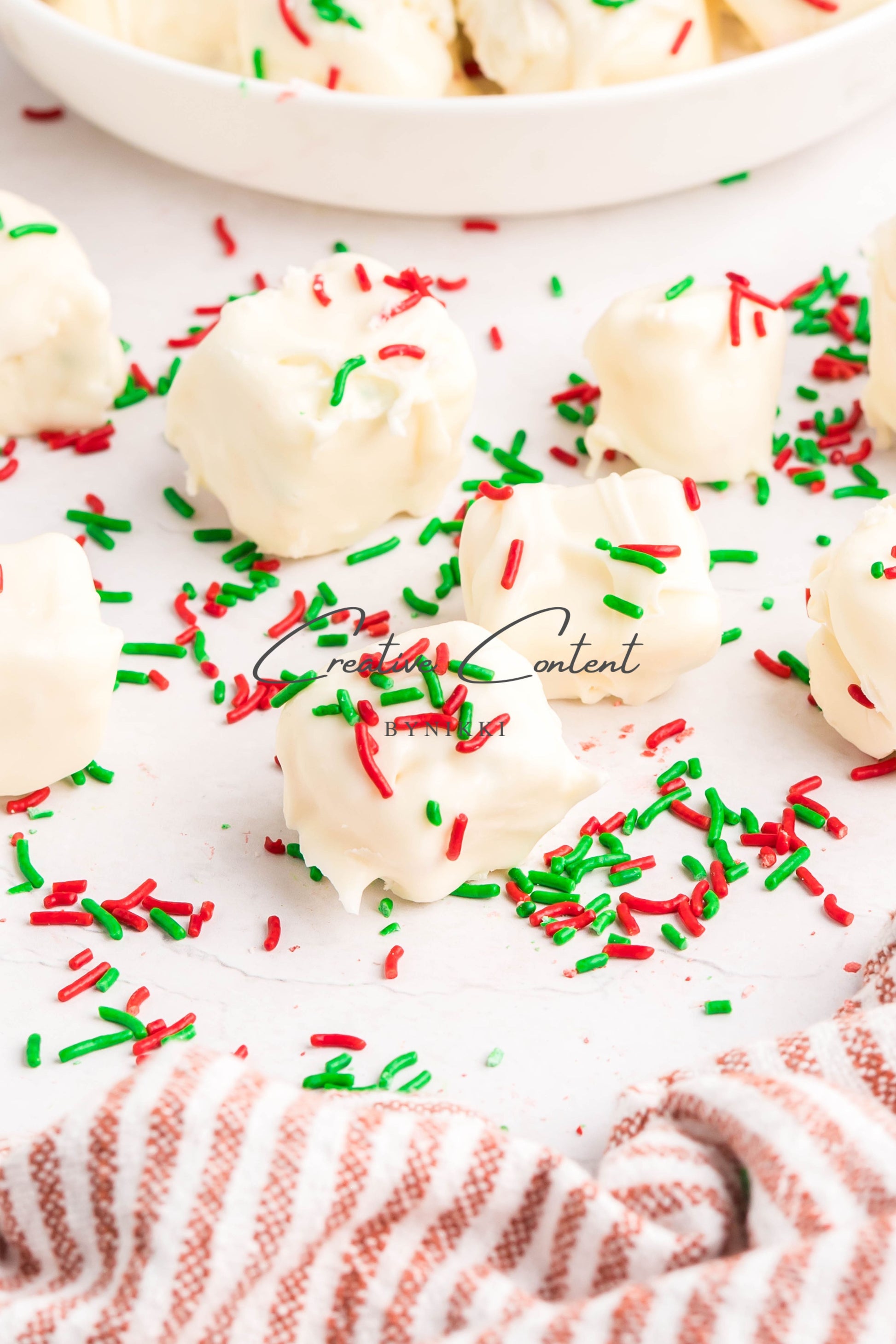 - Ingredients: whipped topping, white chocolate chips, vanilla almond bark, red and green sprinkles