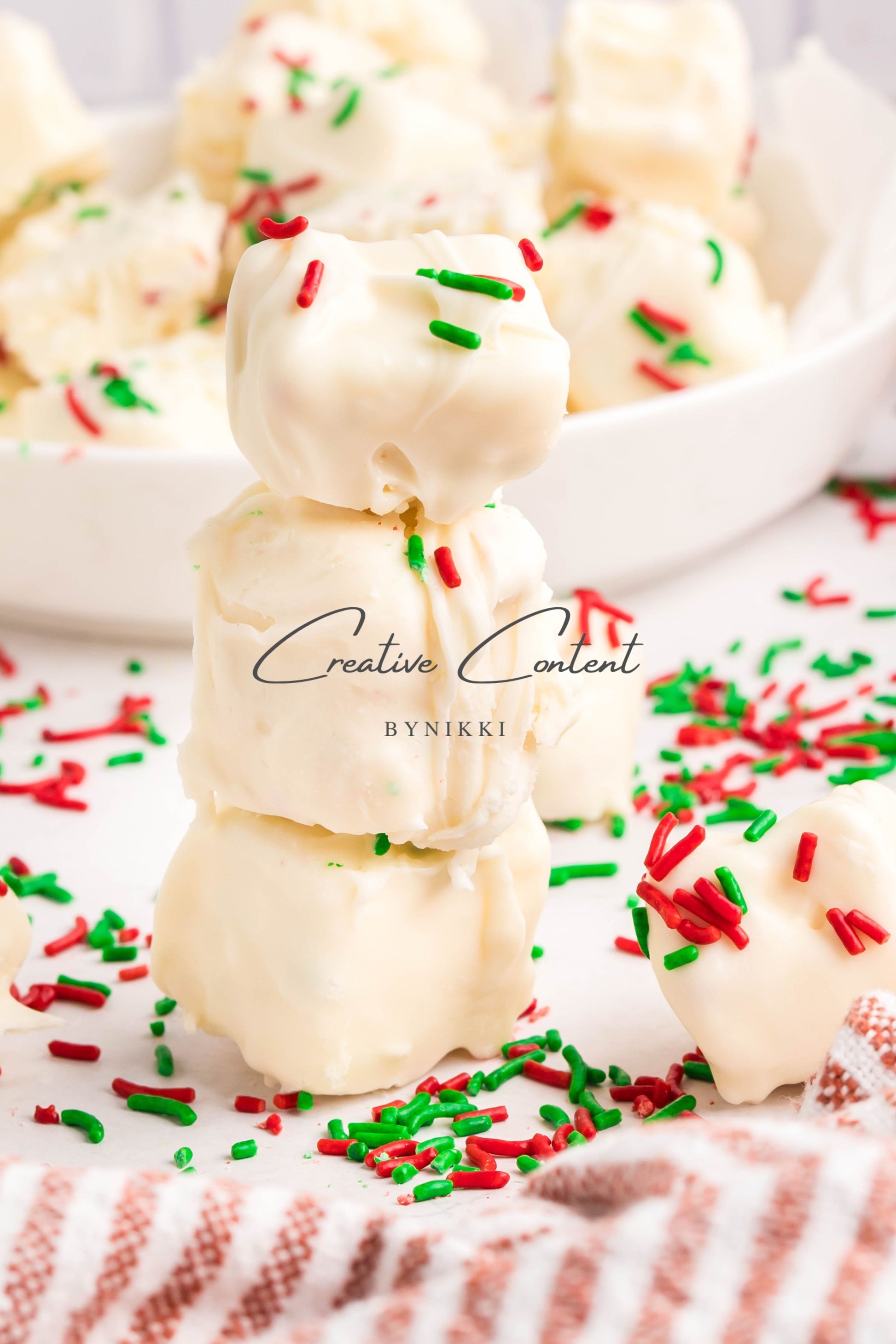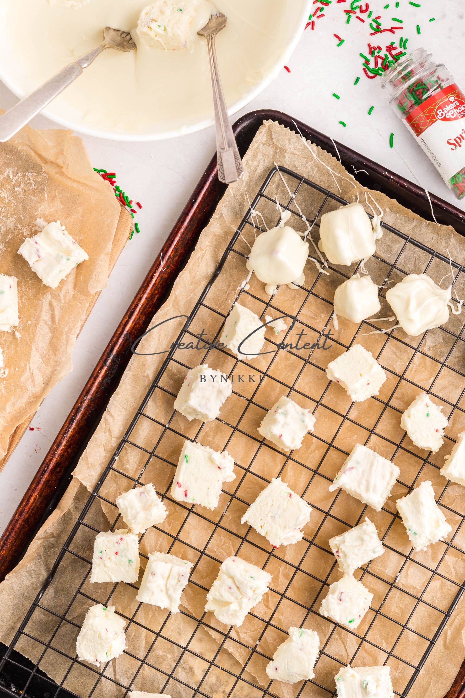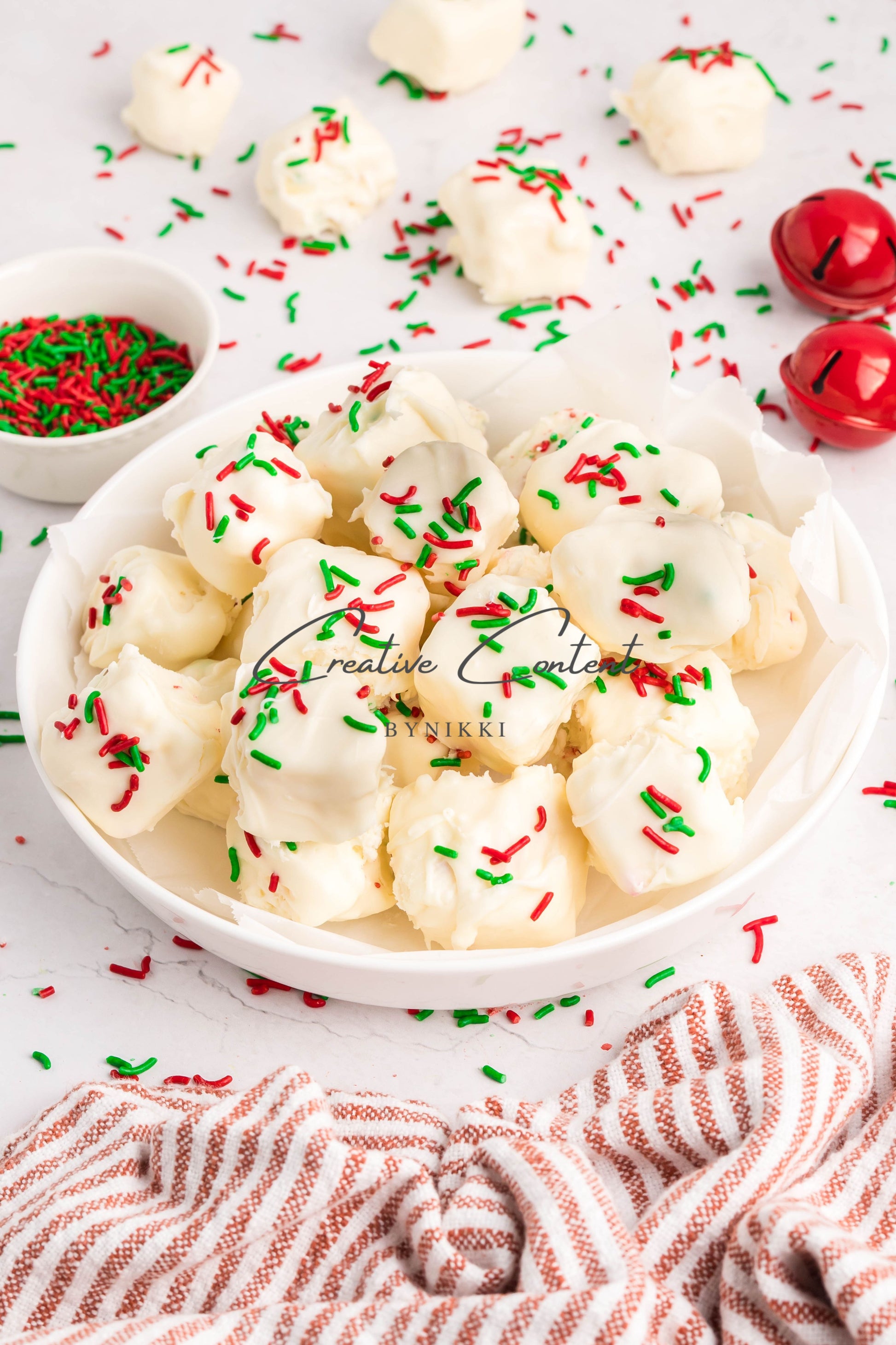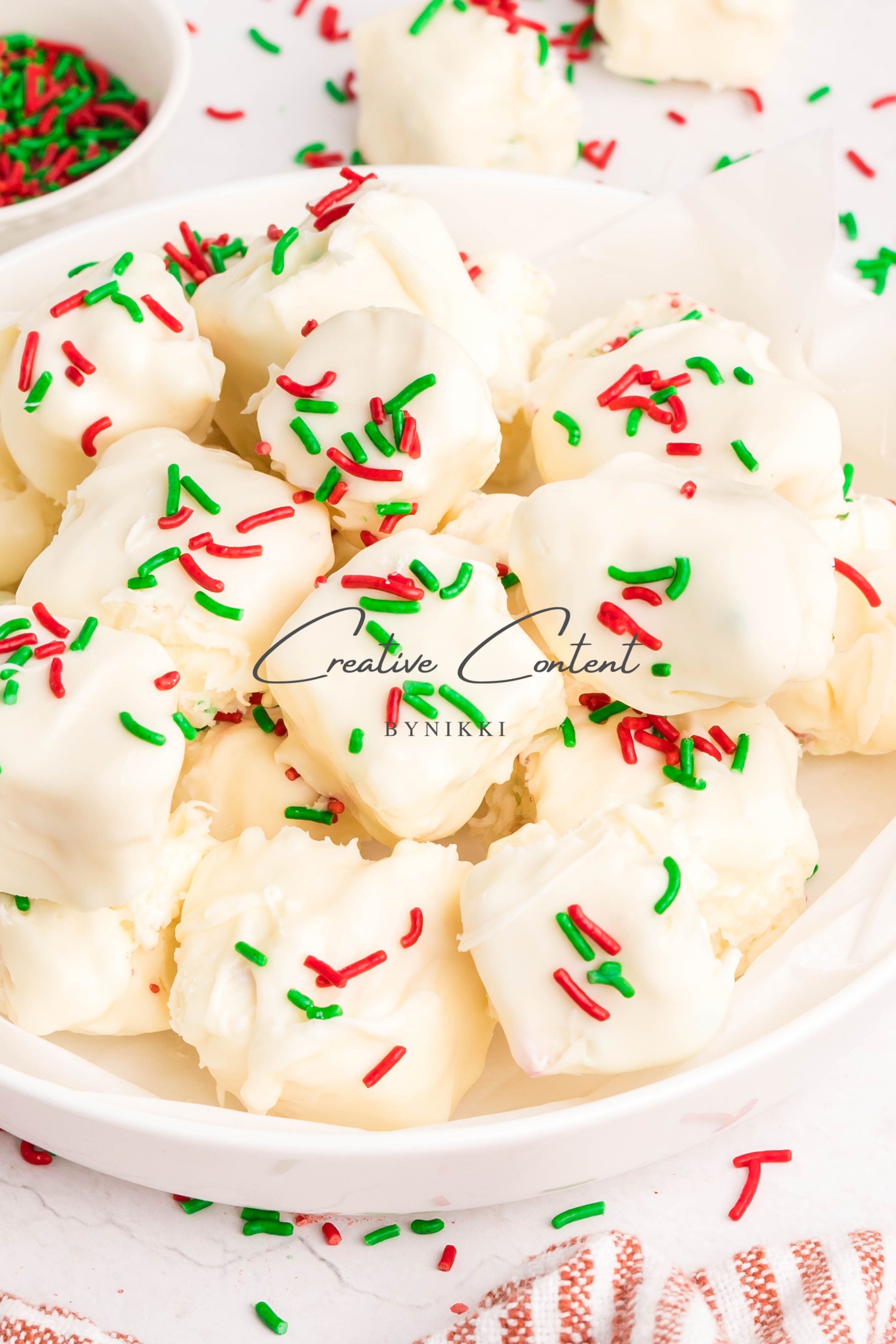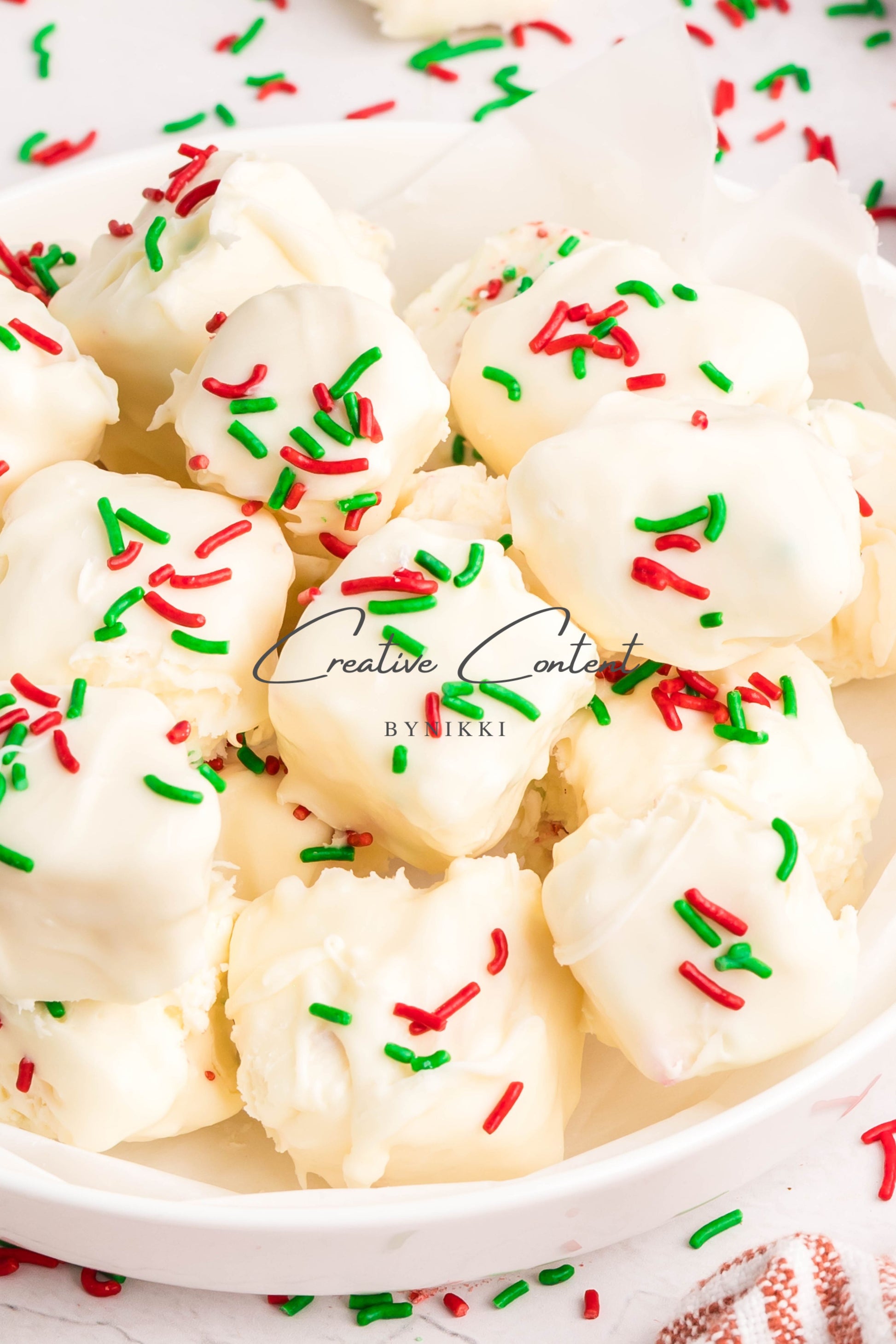- Ingredients: whipped topping, white chocolate chips, vanilla almond bark, red and green sprinkles