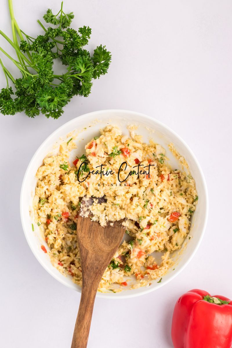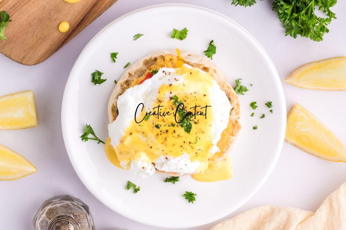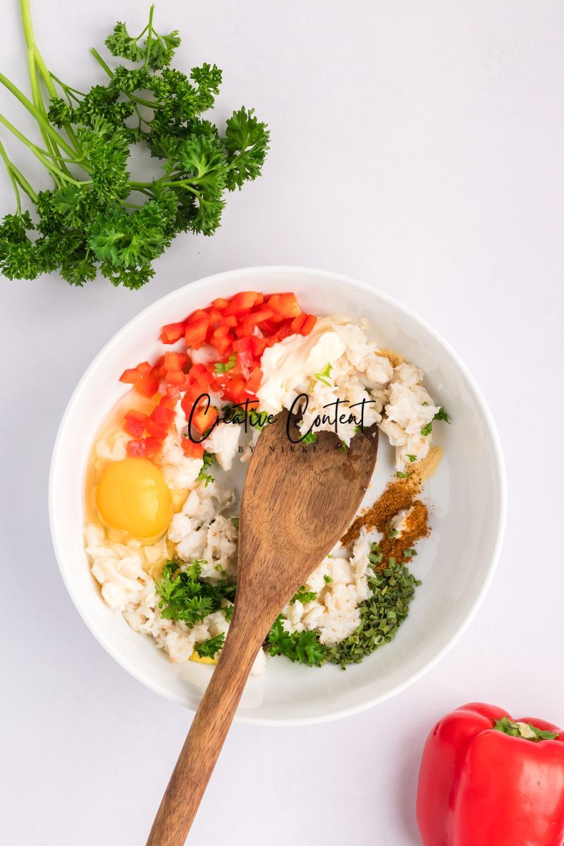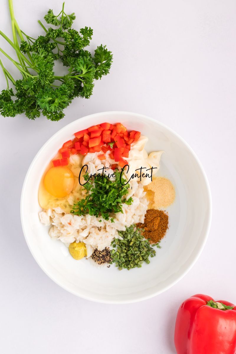 - Ingredients needed; crabmeat, bell pepper, mayonnaise, egg, Old Bay Seasoning, garlic clove, Dijon mustard, dried chives, coarse kosher salt, black pepper, panko breadcrumbs, parsley, avocado oil, unsalted butter, eggs, lemon juice, heavy whipping cream, cayenne pepper, English muffins, and distilled white vinegar.