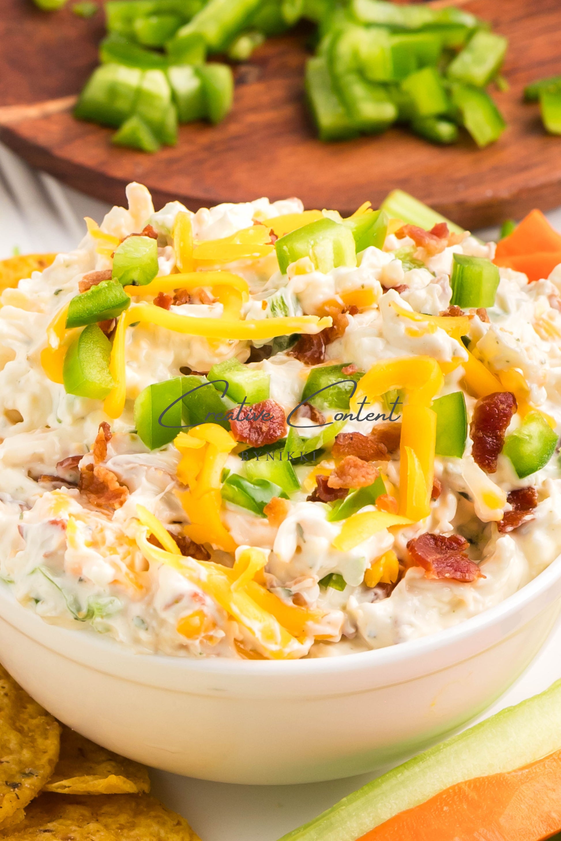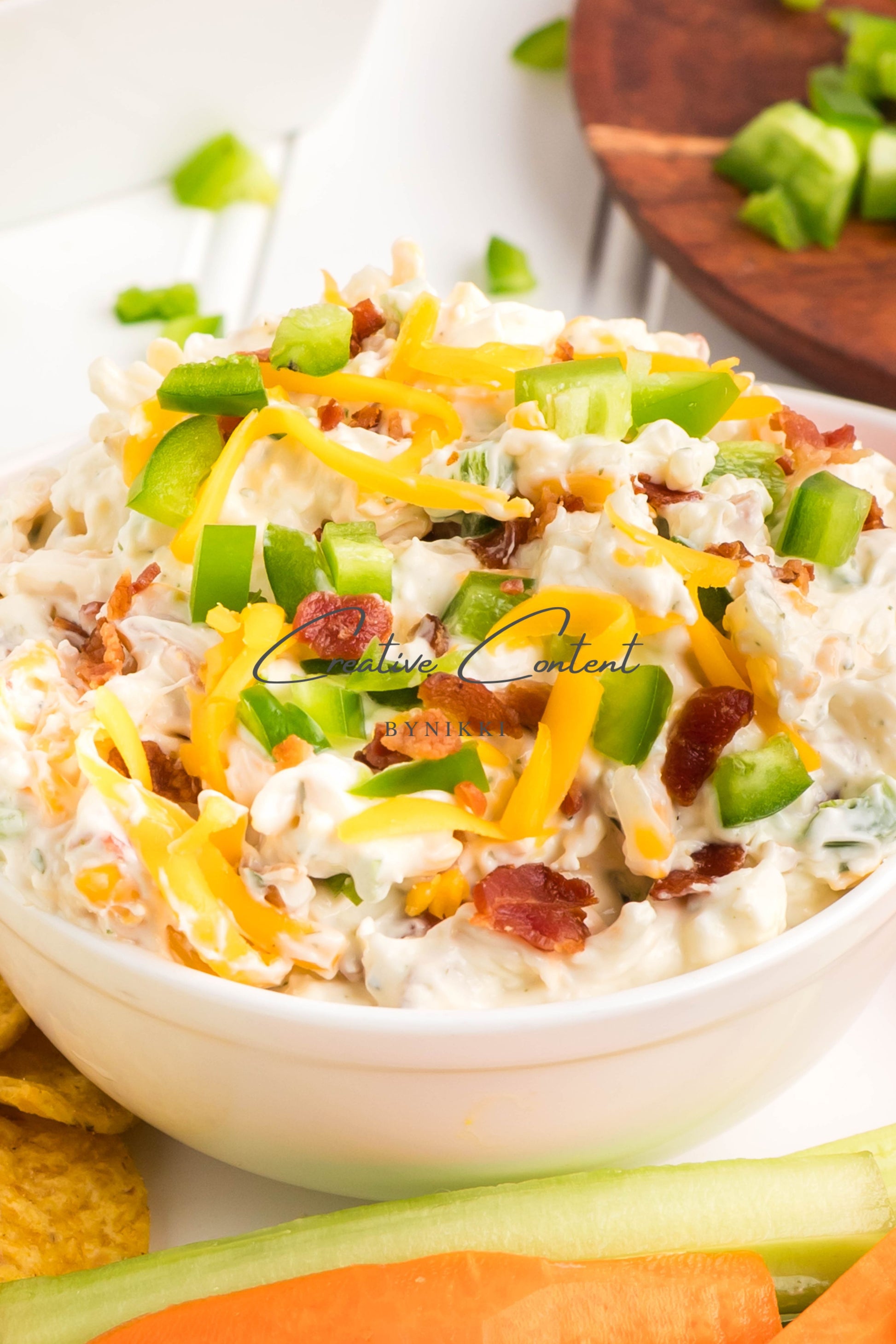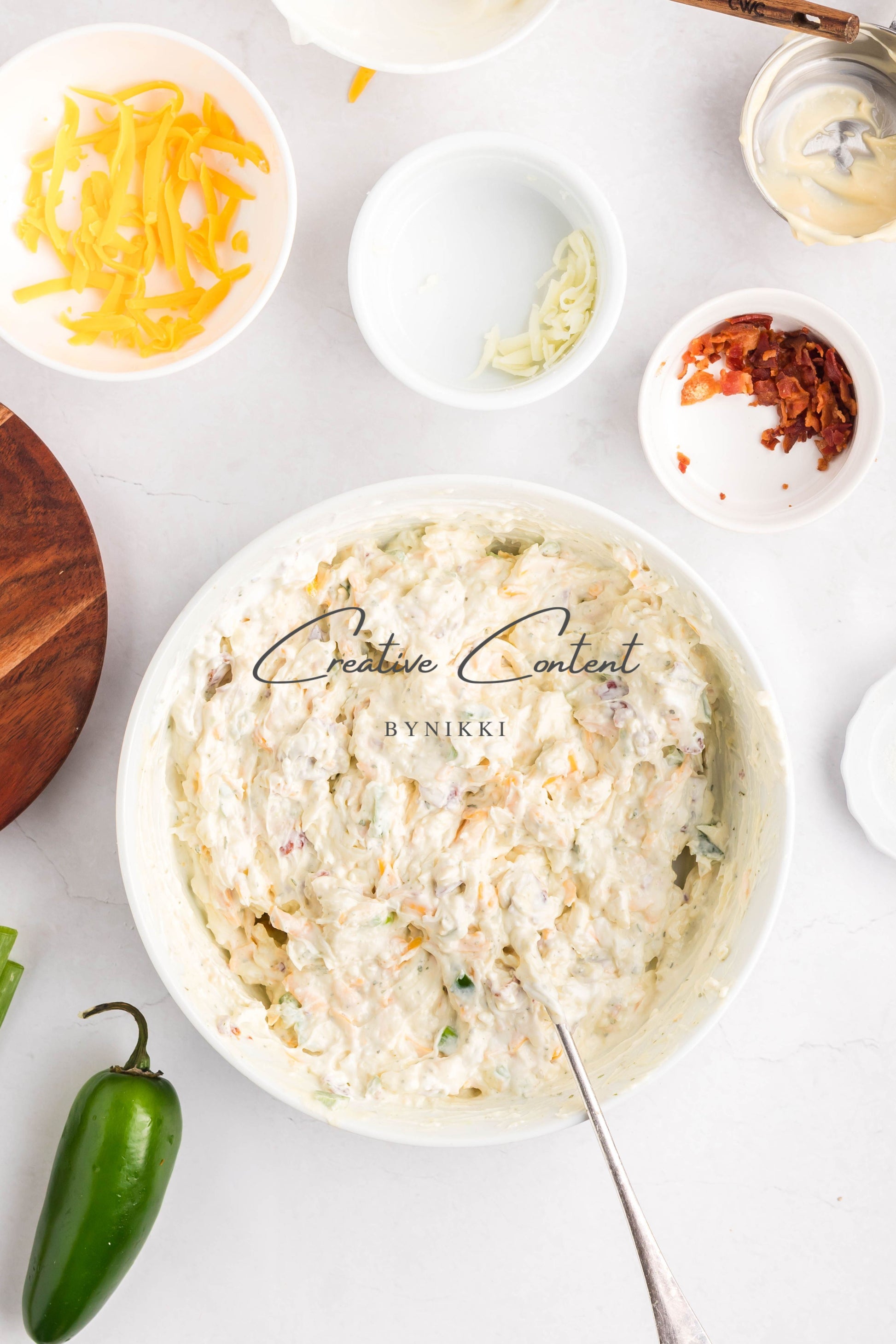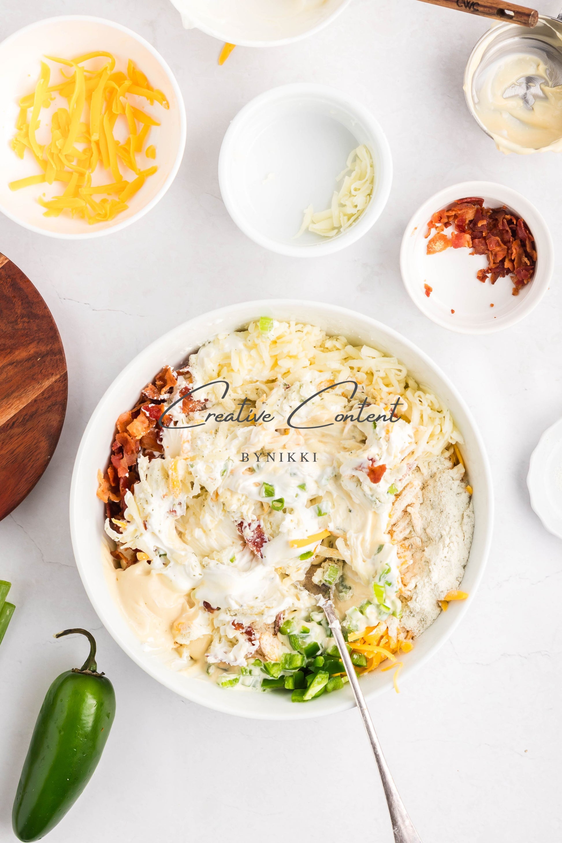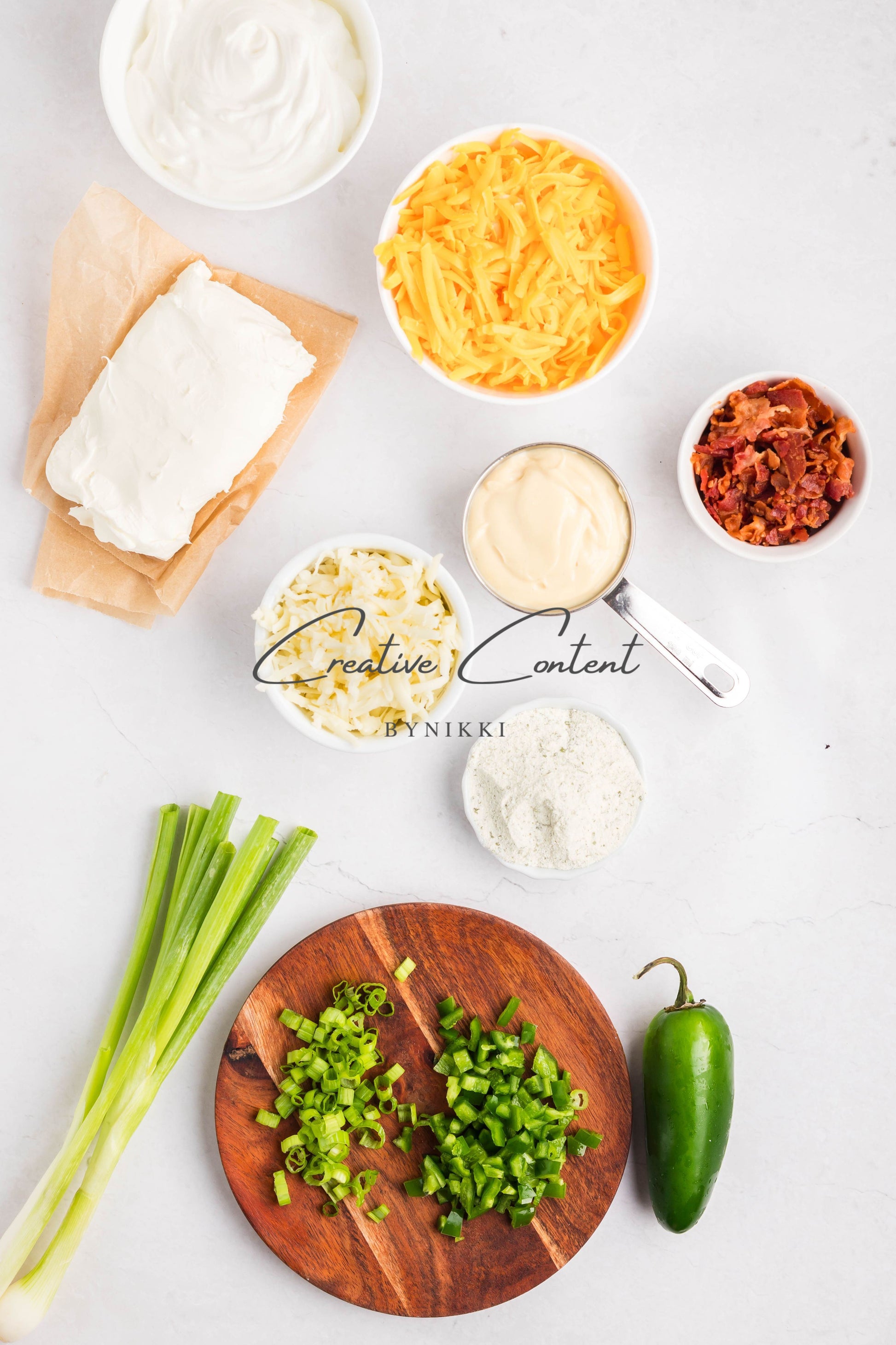 - Ingredients: cream cheese, sour cream, mayonnaise, jalapeno, ranch seasoning mix, shredded cheddar cheese, shredded mozzarella cheese, cooked bacon, green onions