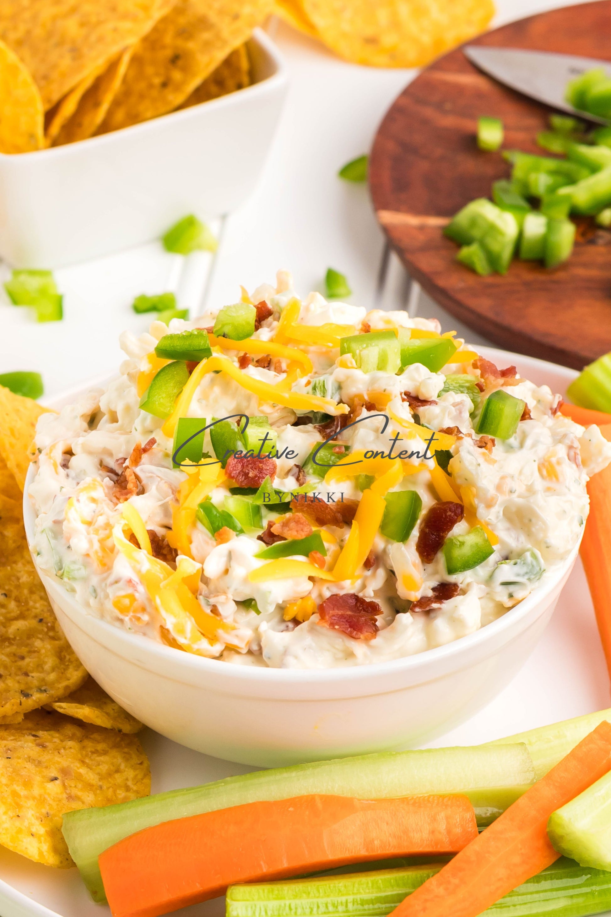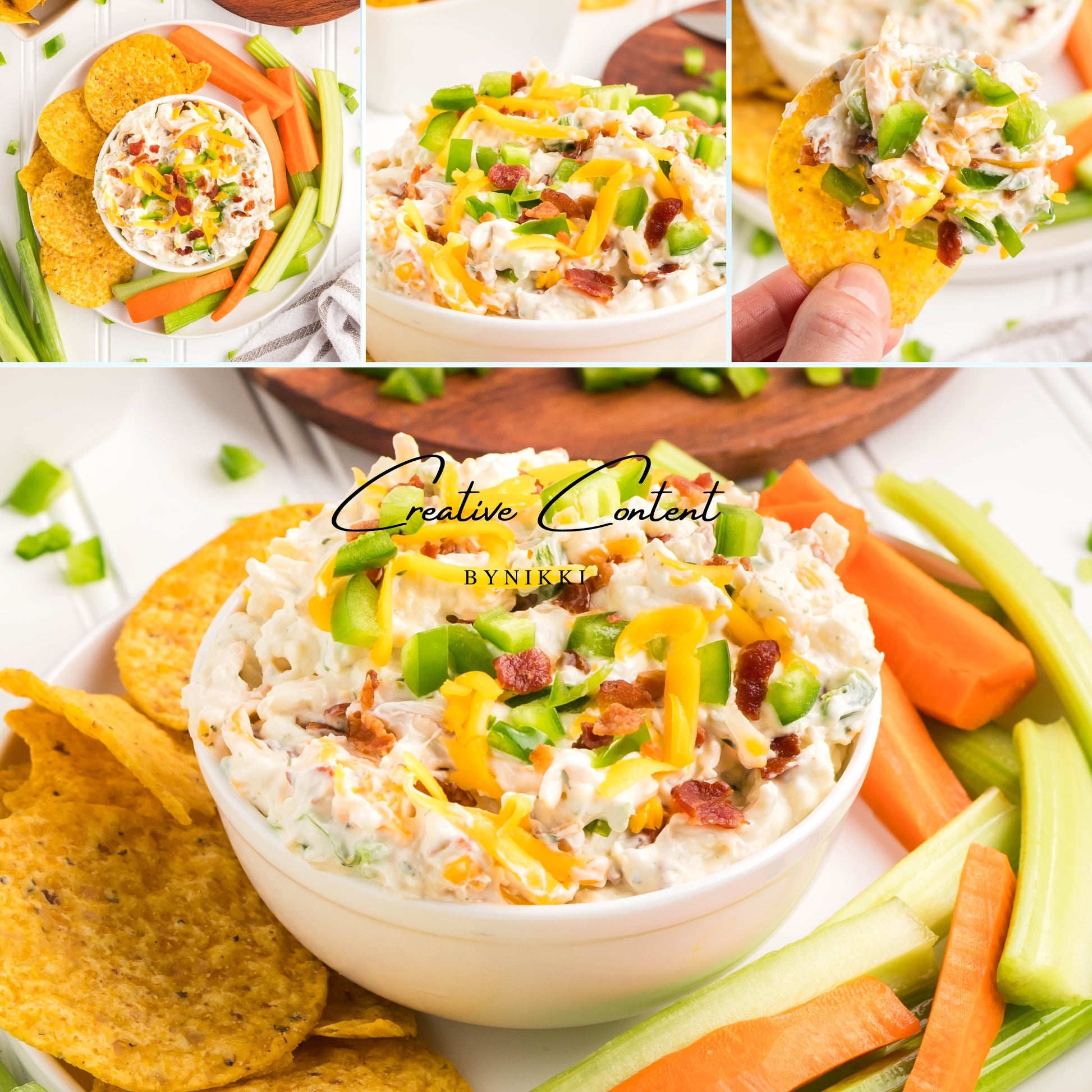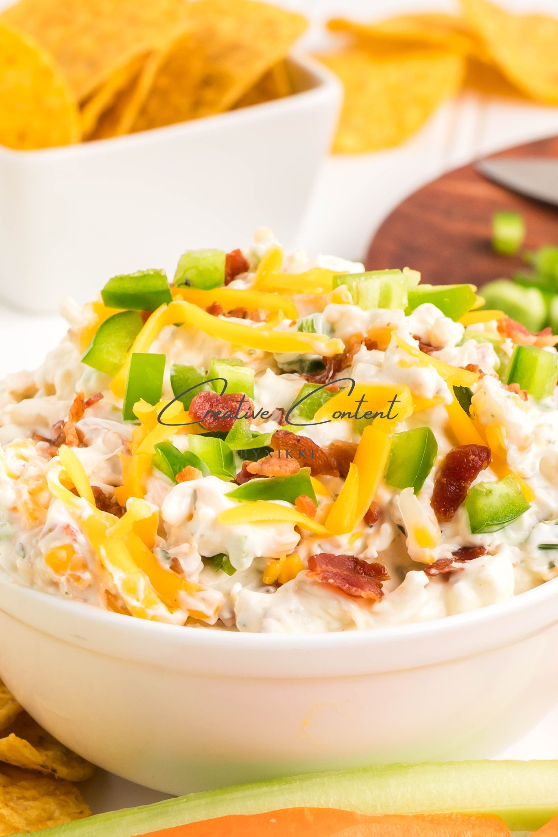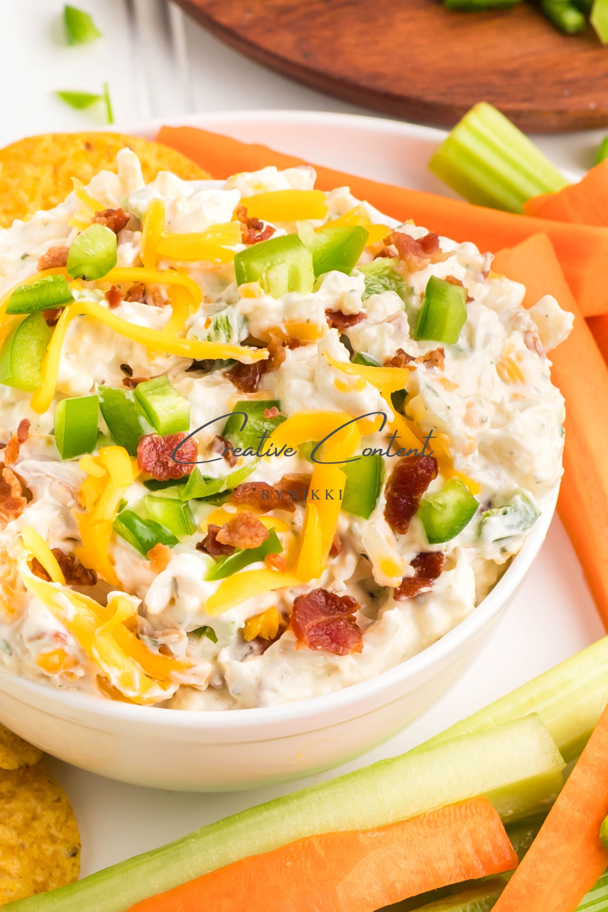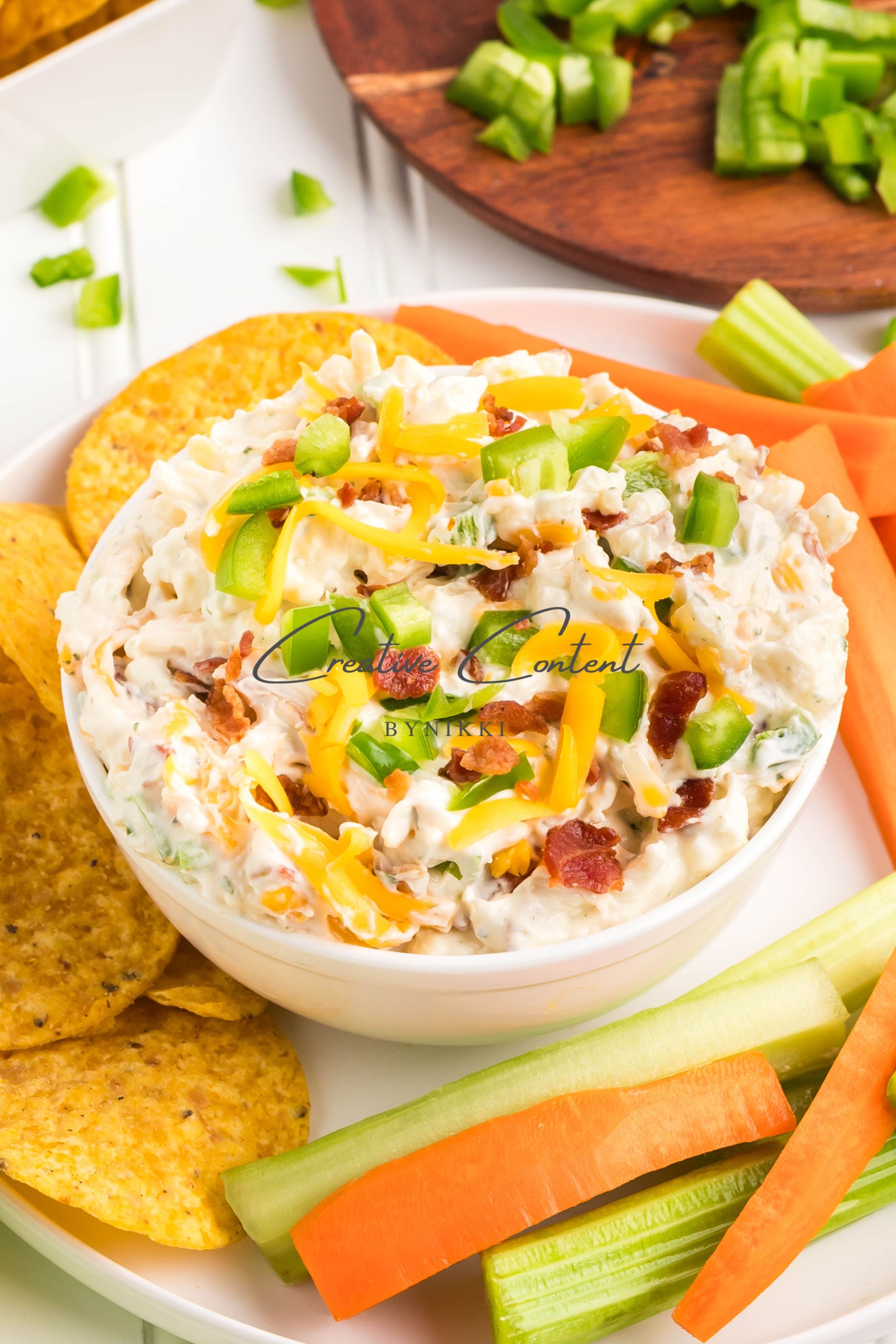 - Ingredients: cream cheese, sour cream, mayonnaise, jalapeno, ranch seasoning mix, shredded cheddar cheese, shredded mozzarella cheese, cooked bacon, green onions