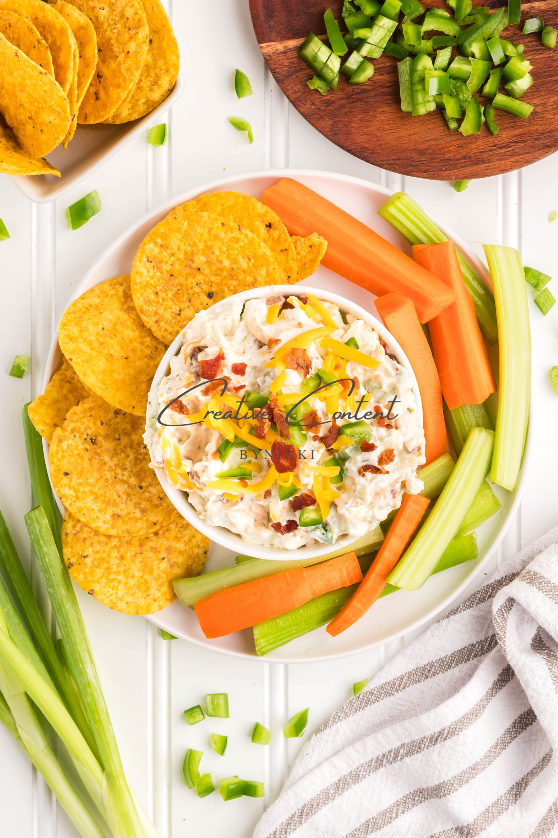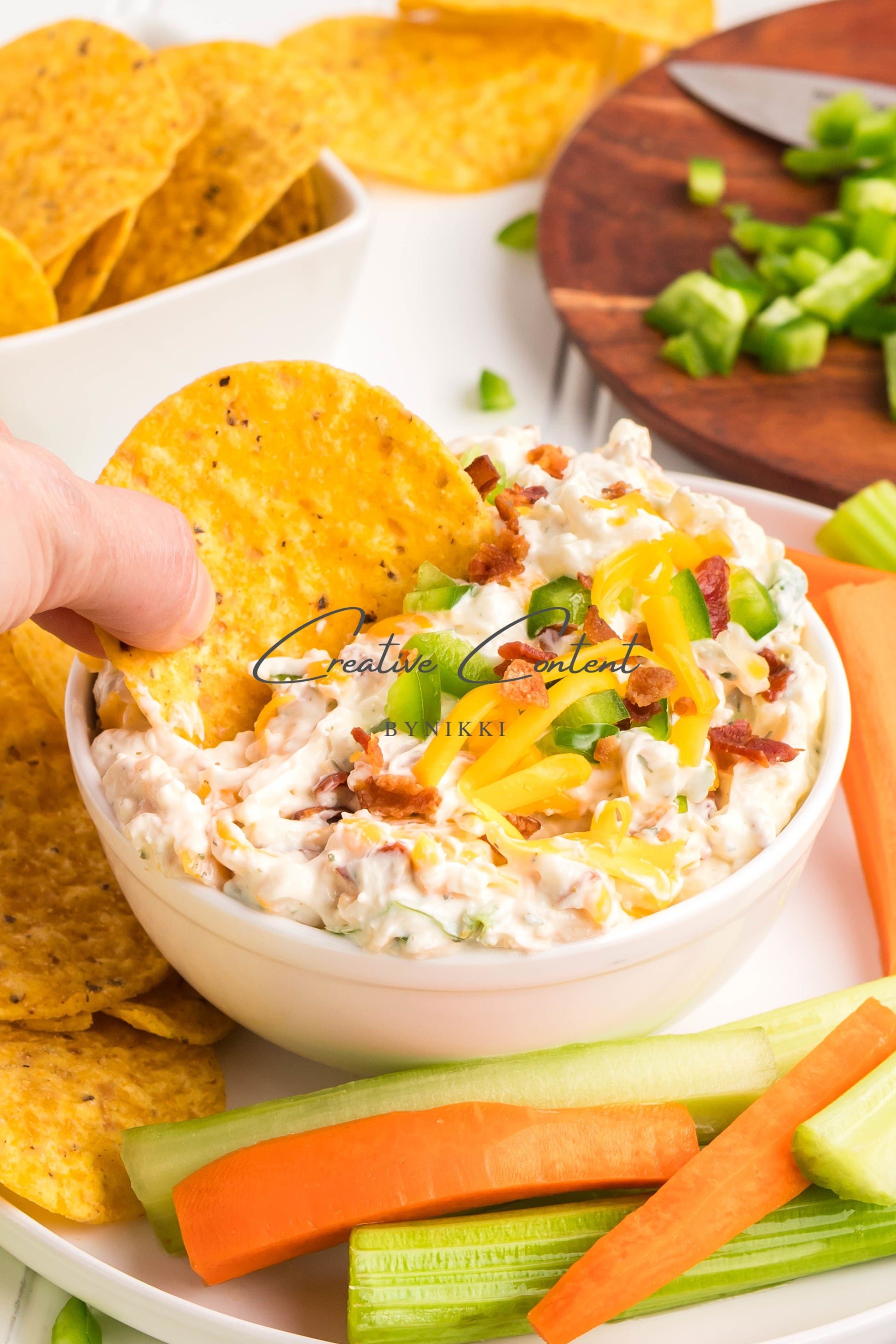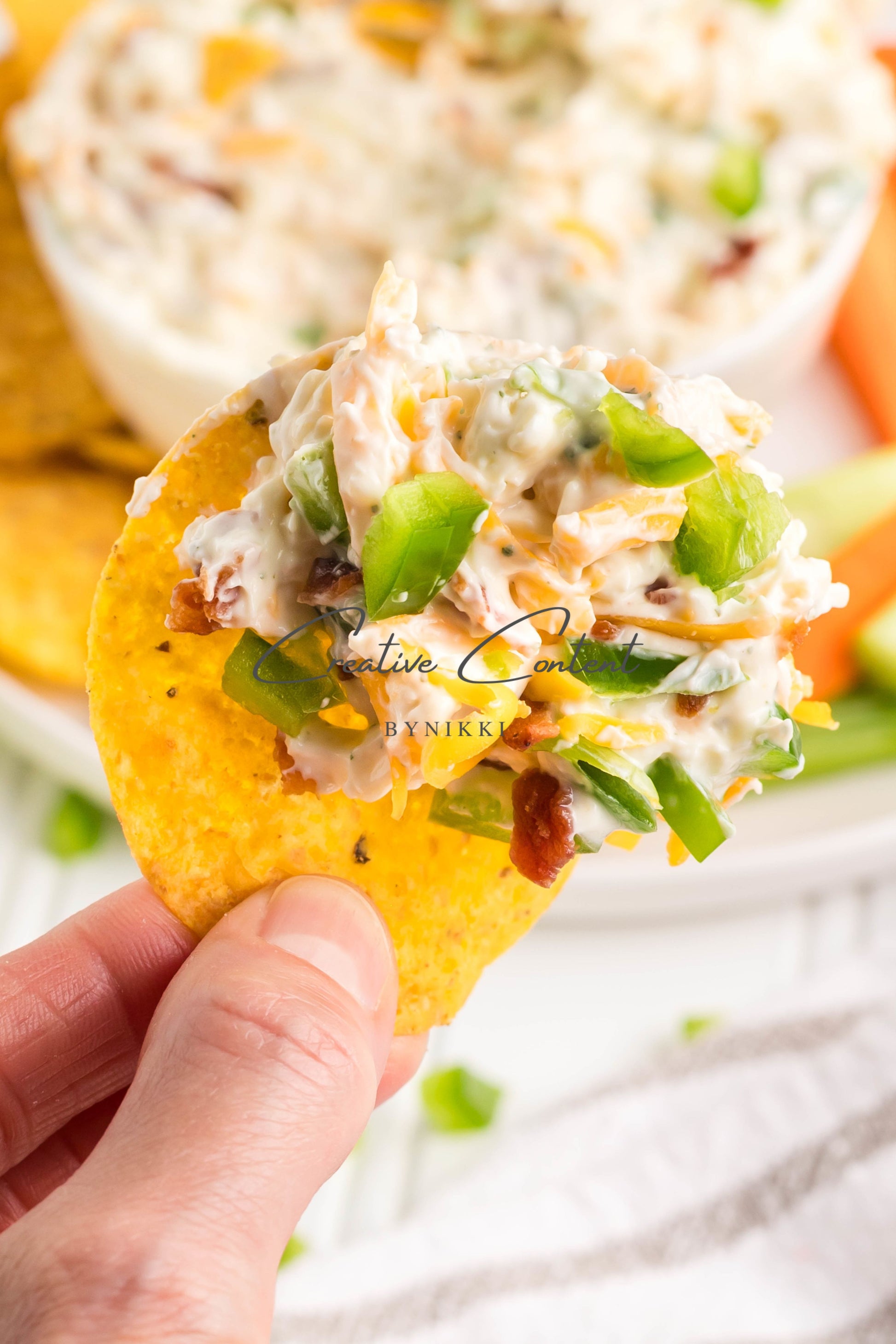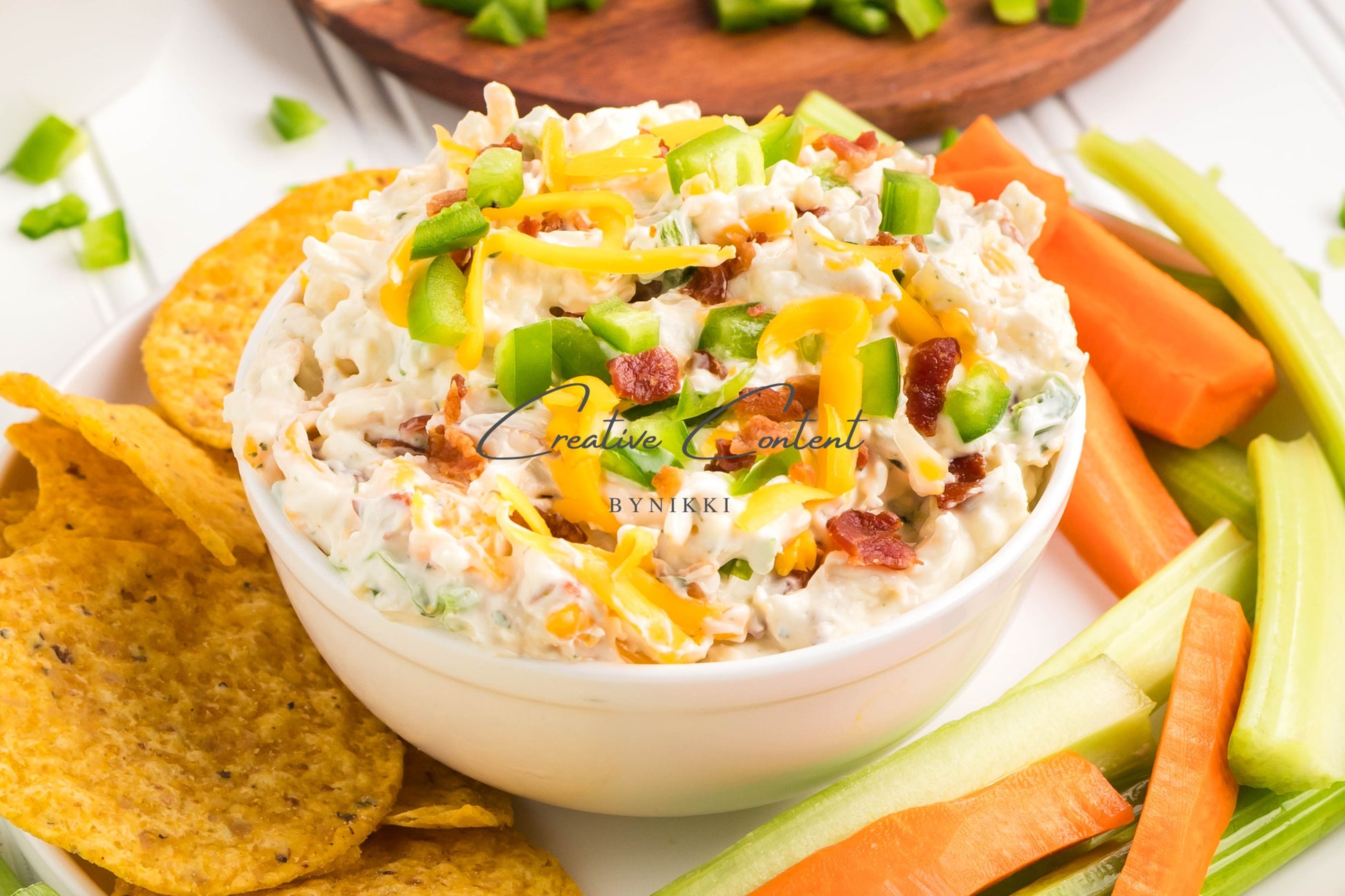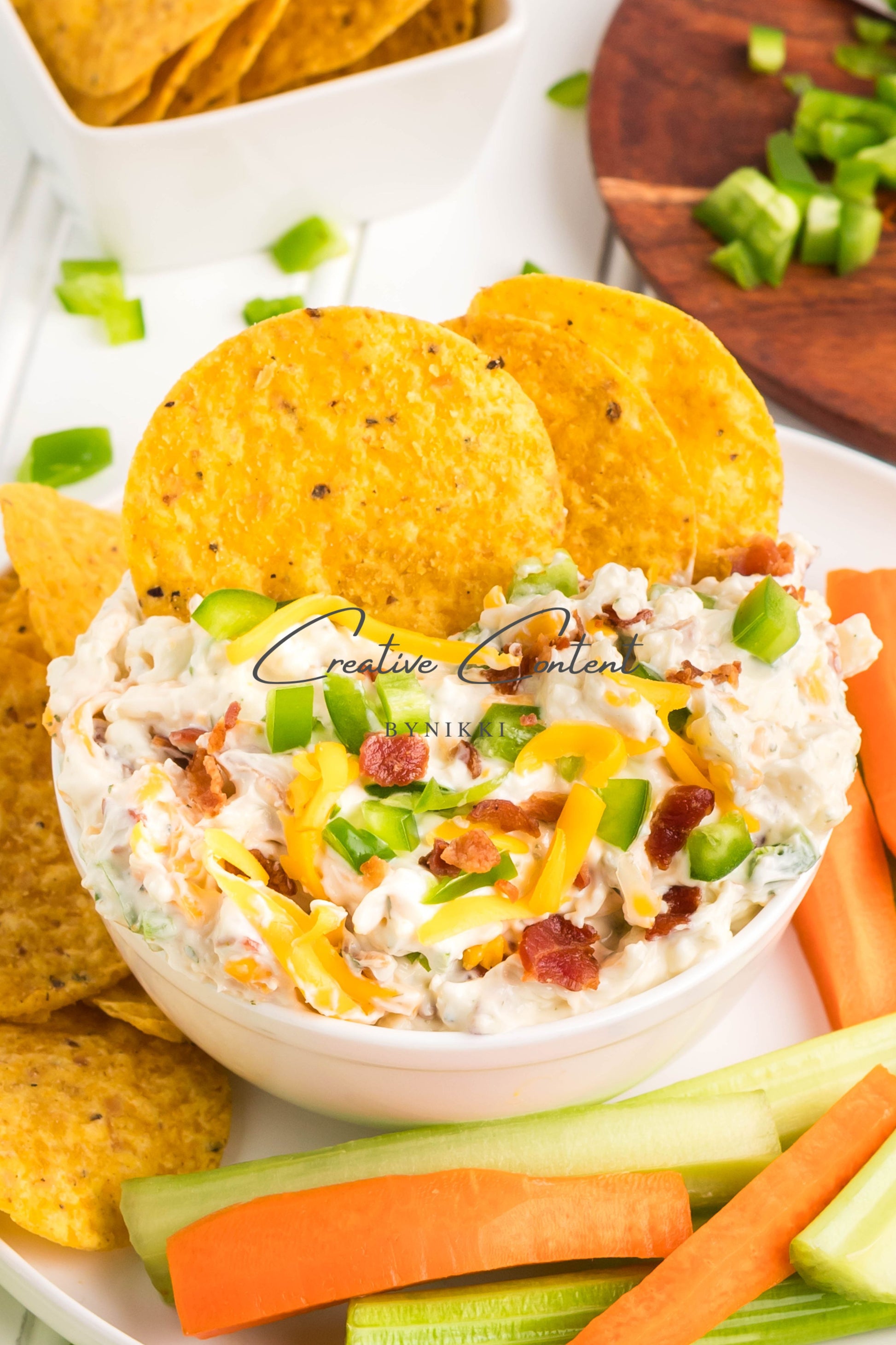 - Ingredients: cream cheese, sour cream, mayonnaise, jalapeno, ranch seasoning mix, shredded cheddar cheese, shredded mozzarella cheese, cooked bacon, green onions