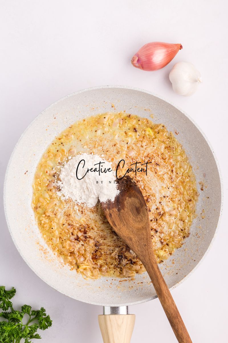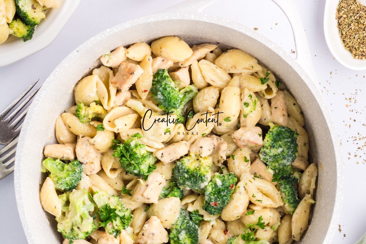 - Ingredients needed; olive oil, chicken breasts, garlic powder, salt, pepper, pasta shells, broccoli, unsalted butter, garlic cloves, shallot, all-purpose flour, heavy whipping cream, lemon juice, Italian seasoning, onion powder, garlic powder, dried thyme, red pepper flakes, nutmeg, parmesan cheese, and parsley.