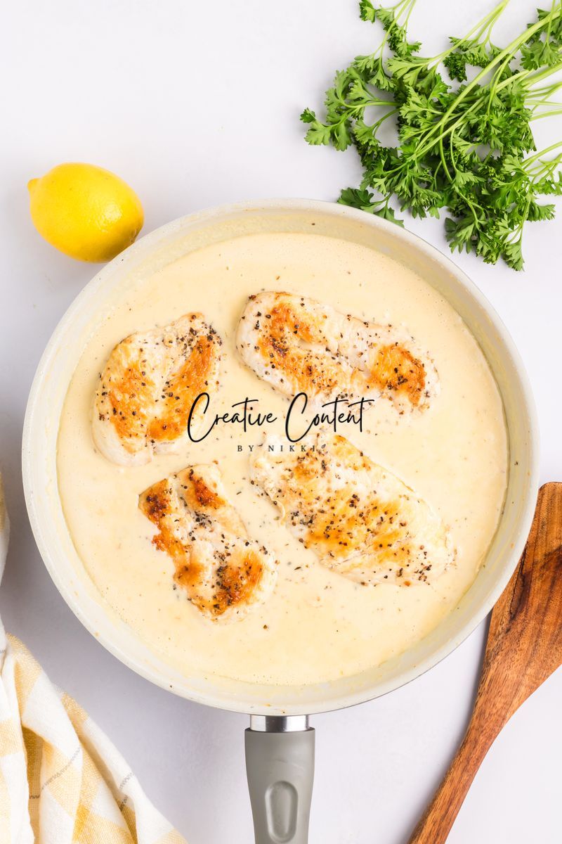 This creamy lemon chicken is bursting with lemon flavor and is infused with fresh garlic in a white wine sauce. The fresh herbs, lemon zest, garlic, and shallot make this a dinner the whole family will love. This is a great recipe when you want to make something a little special for dinner. This decadent dish is creamy with a tangy lemon flavor. In just 25 minutes you will have an amazing dinner that will get you all the oohs and aahs.