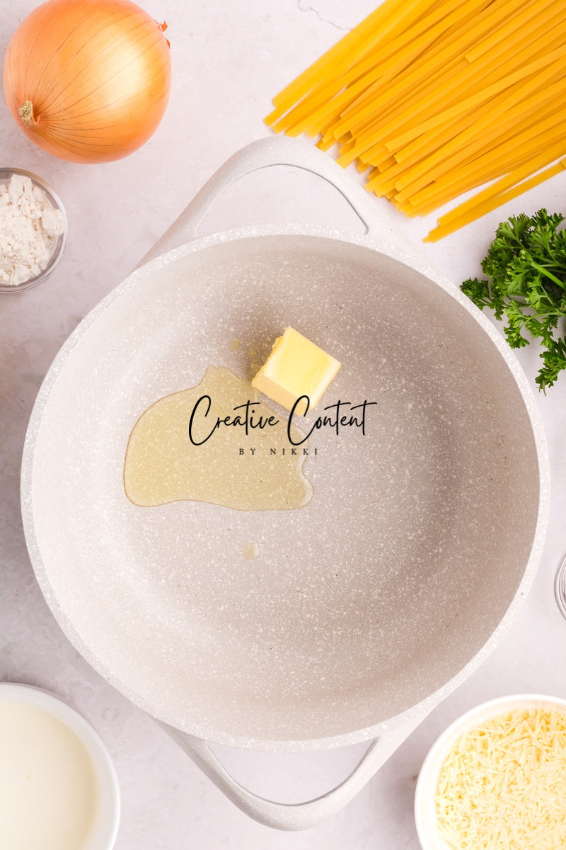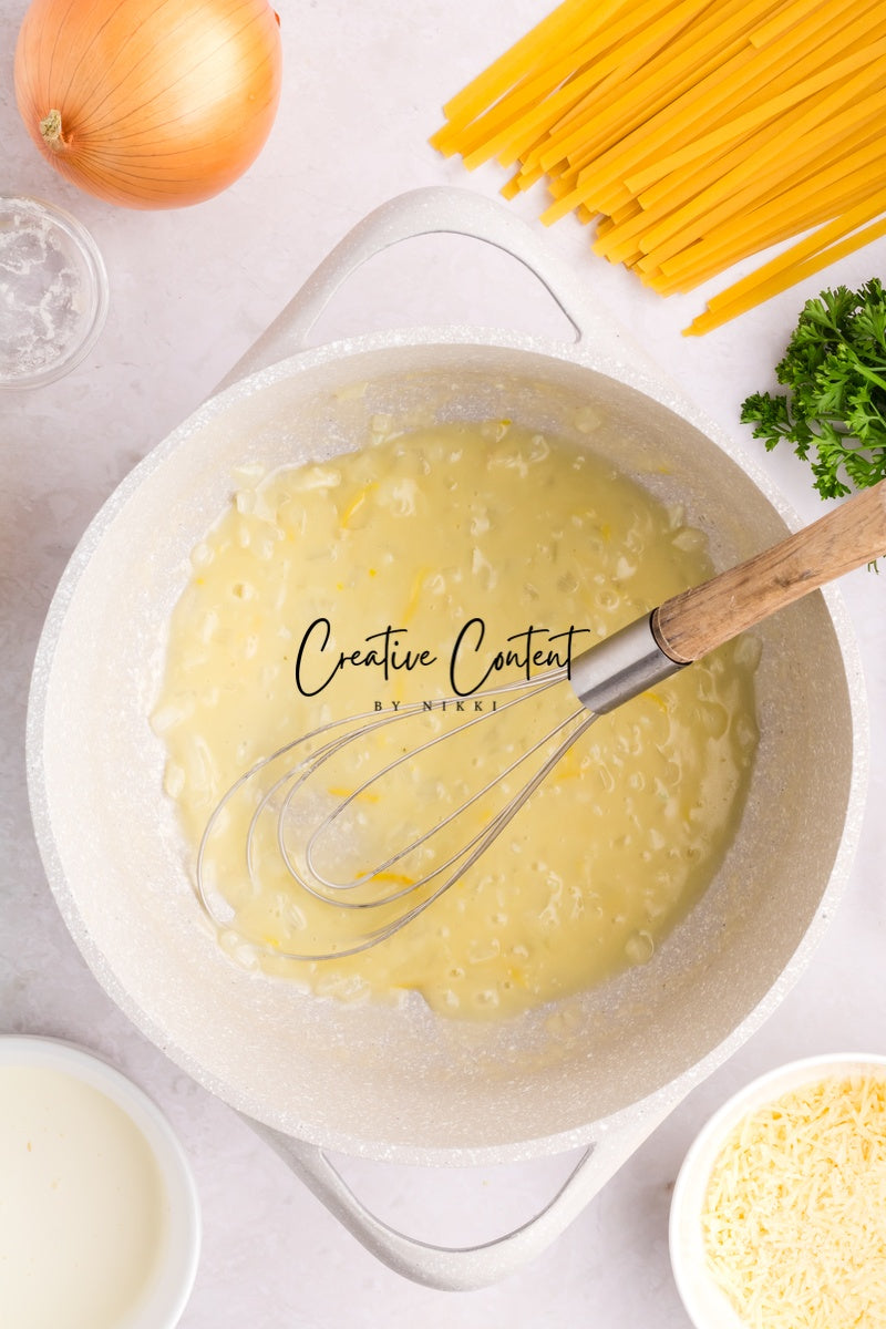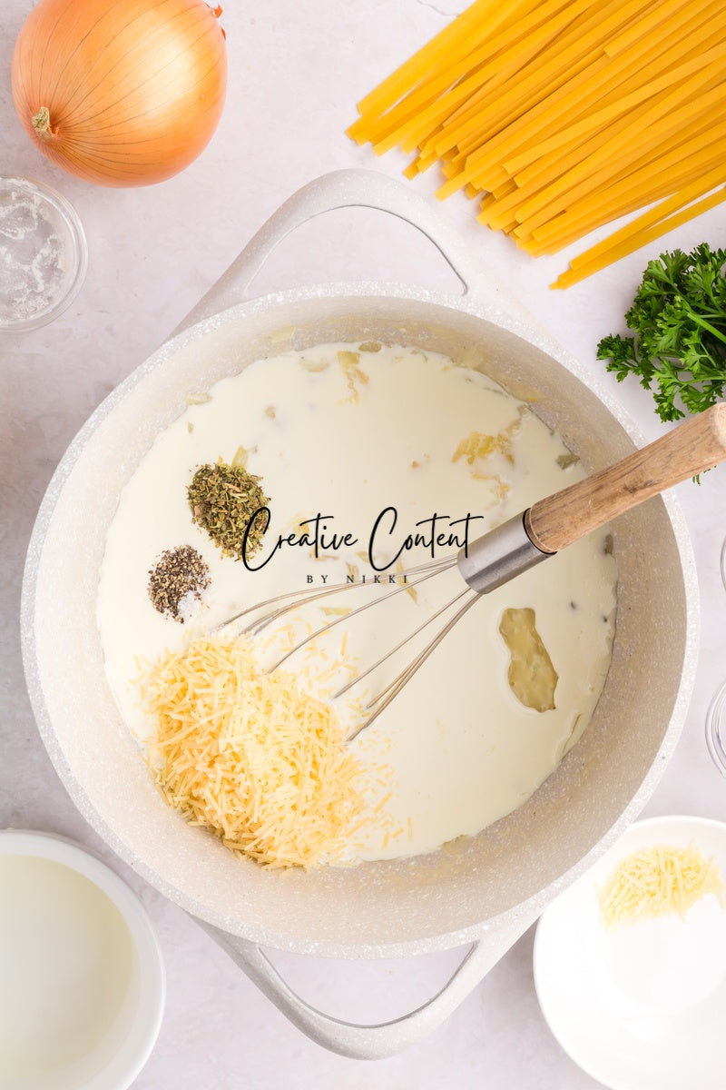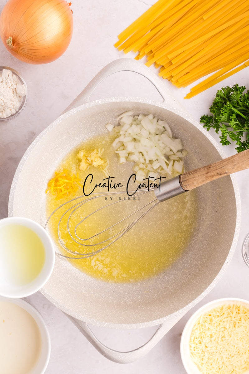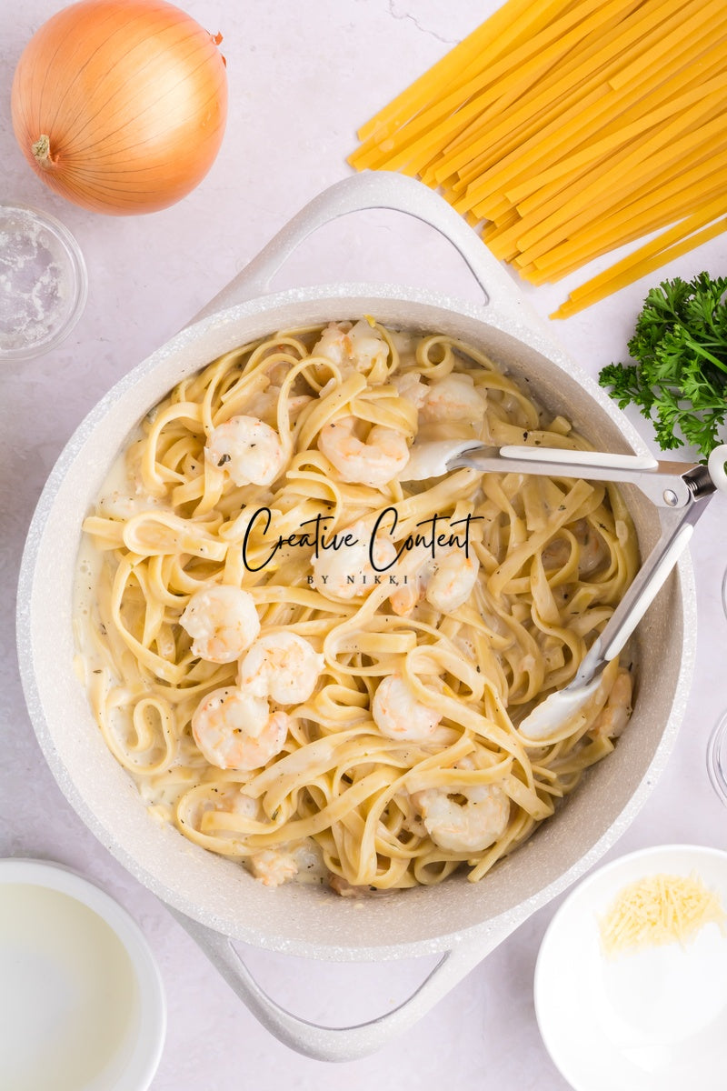 Ingredients needed; Pasta, pasta water, butter, olive oil, onion, garlic cloves, lemon zest, lemon juice, white wine, all-purpose flour, whipping cream, parmesan cheese, Italian seasoning, coarse kosher salt, ground black pepper, paprika, parsley, and raw shrimp.