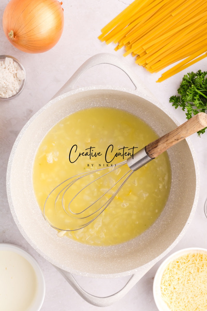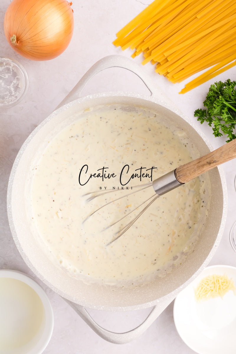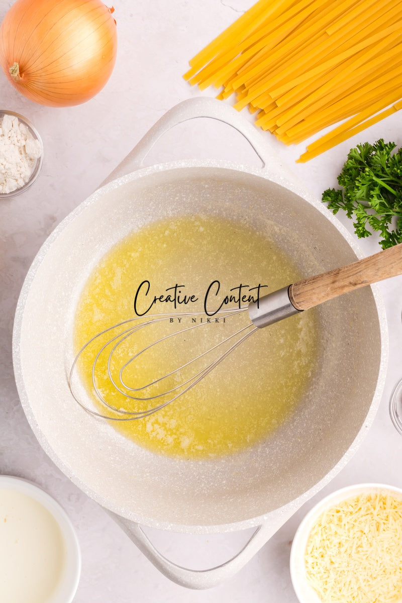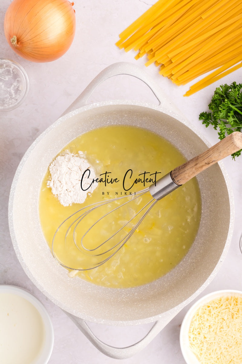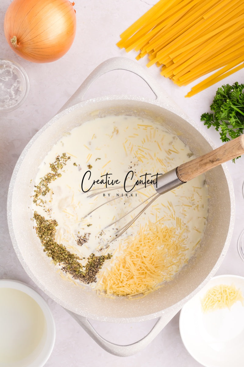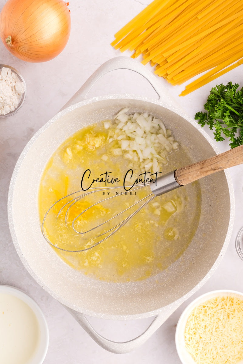 Ingredients needed; Pasta, pasta water, butter, olive oil, onion, garlic cloves, lemon zest, lemon juice, white wine, all-purpose flour, whipping cream, parmesan cheese, Italian seasoning, coarse kosher salt, ground black pepper, paprika, parsley, and raw shrimp.