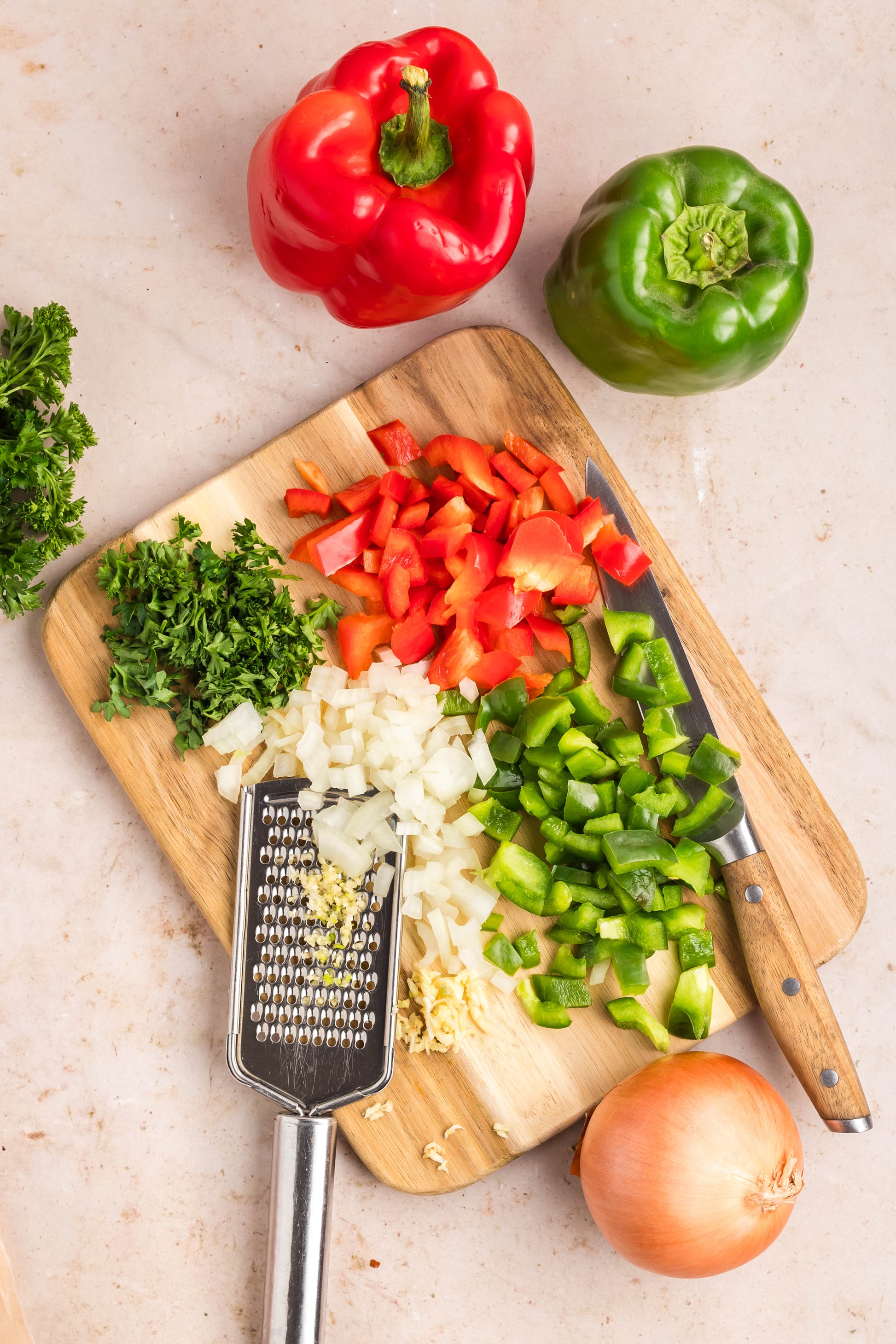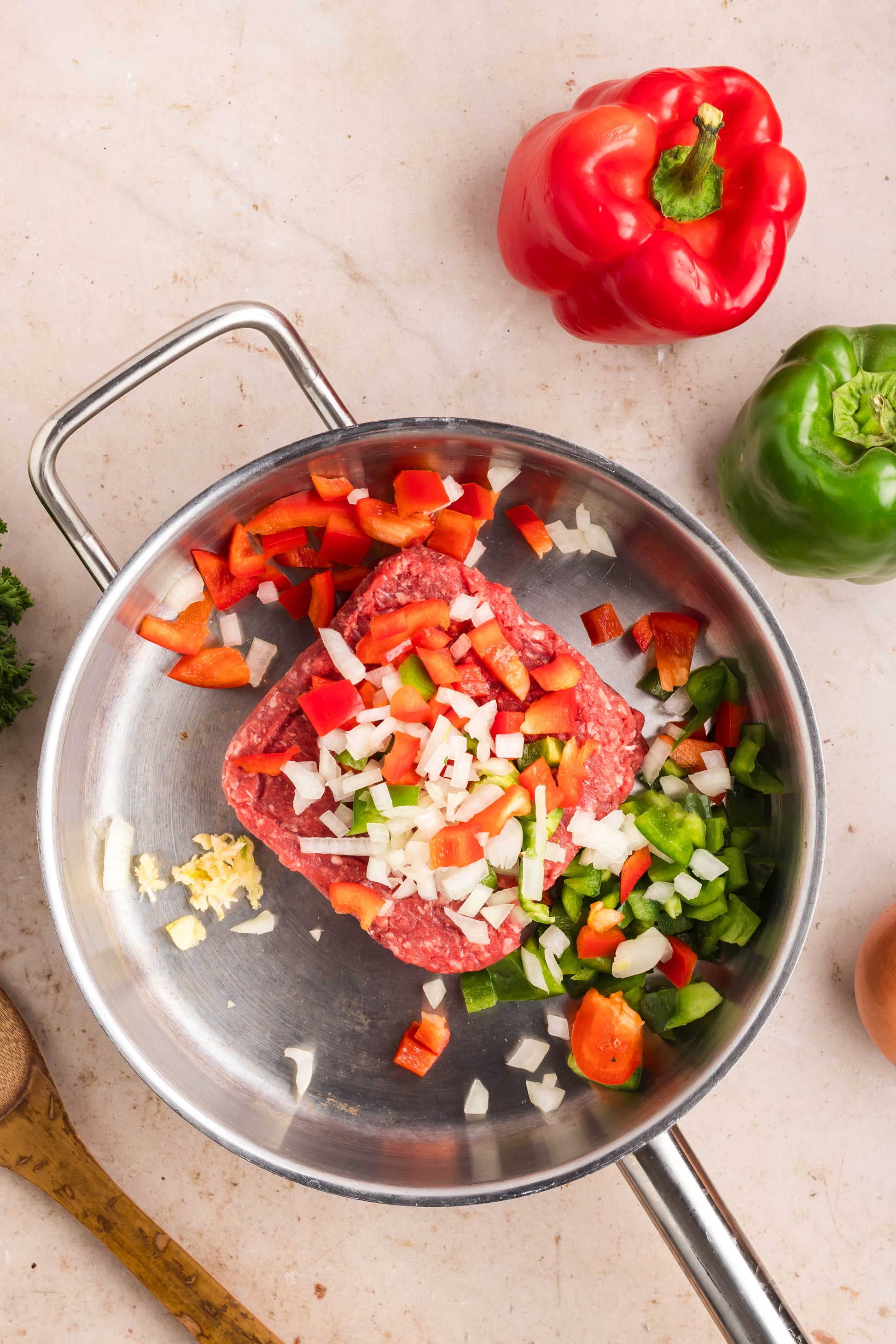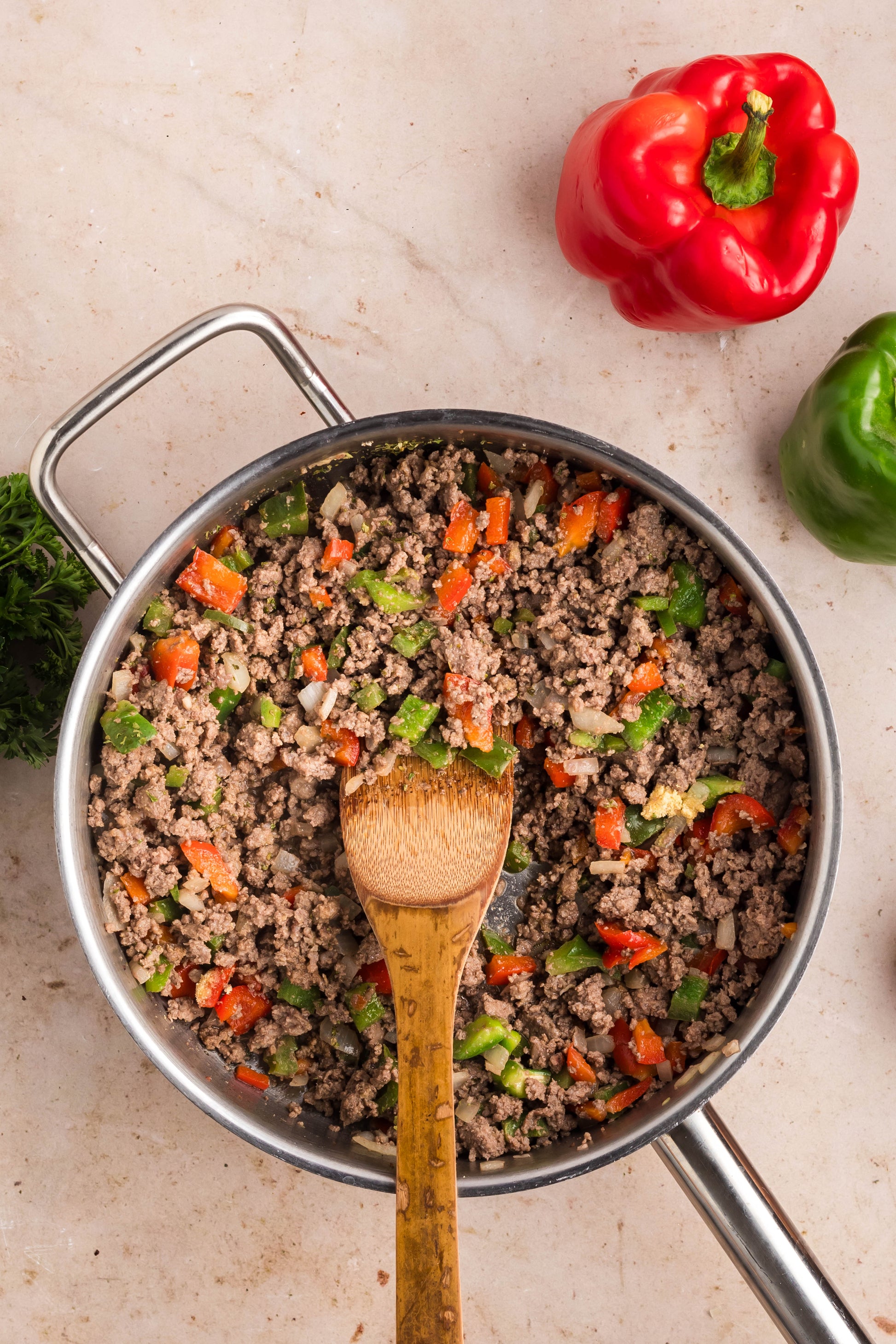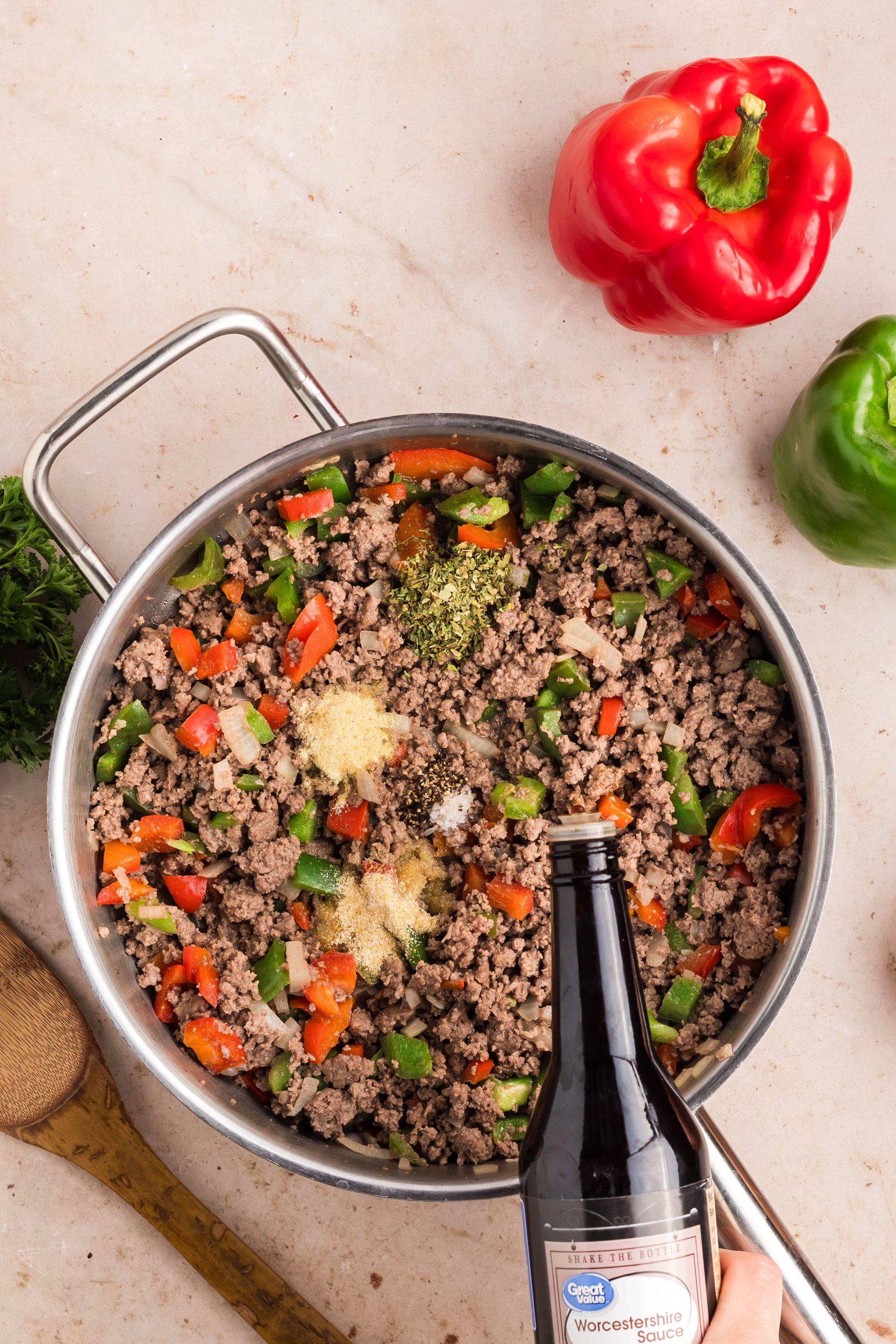 - Ingredients: Ground beef, red bell pepper, green bell pepper, yellow onion, Worcestershire, dried parsley, garlic powder, onion powder, salt, black pepper, cream of mushroom soup, milk, sour cream, cheddar cheese, O'Brien potatoes, parsley