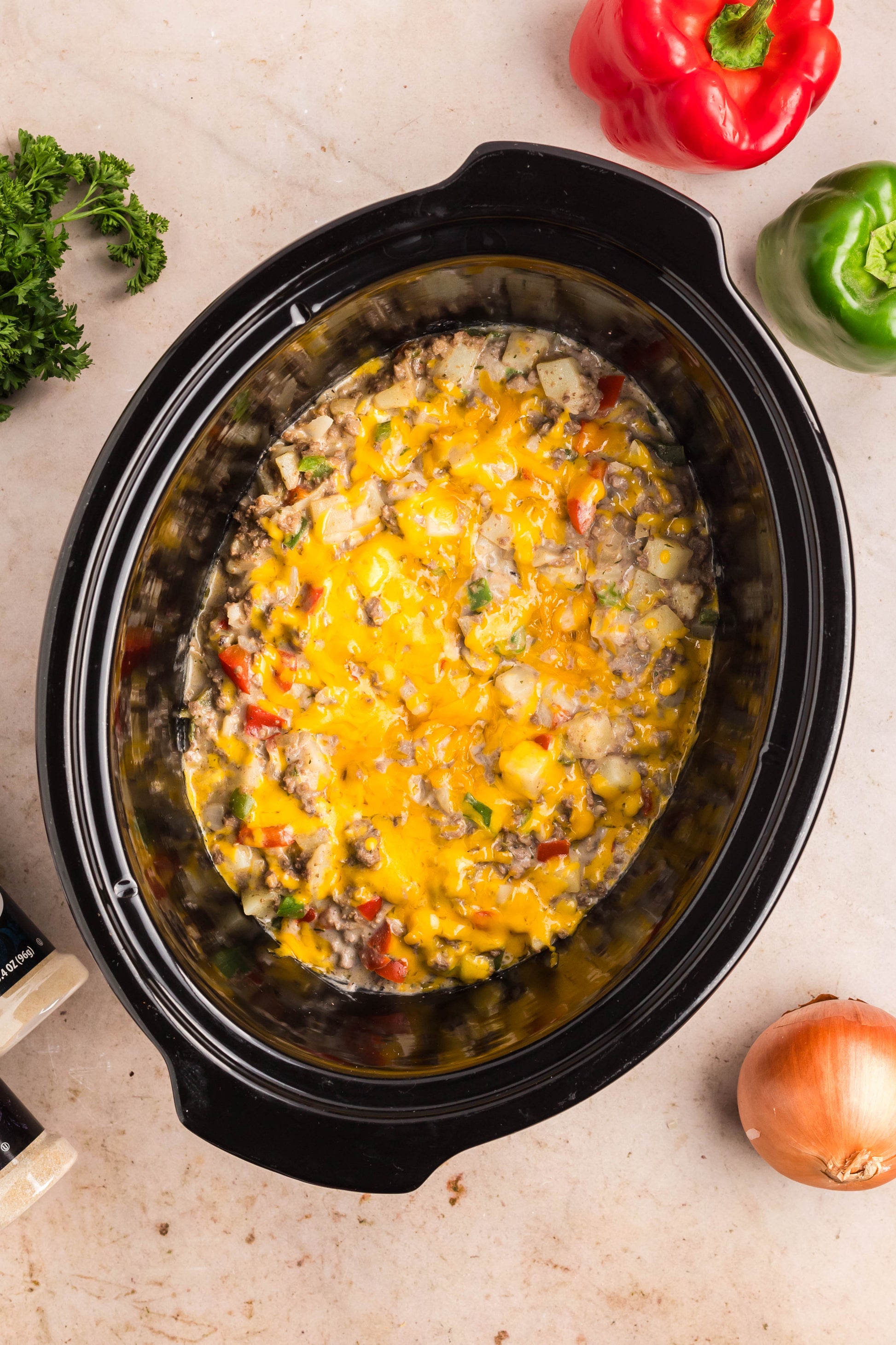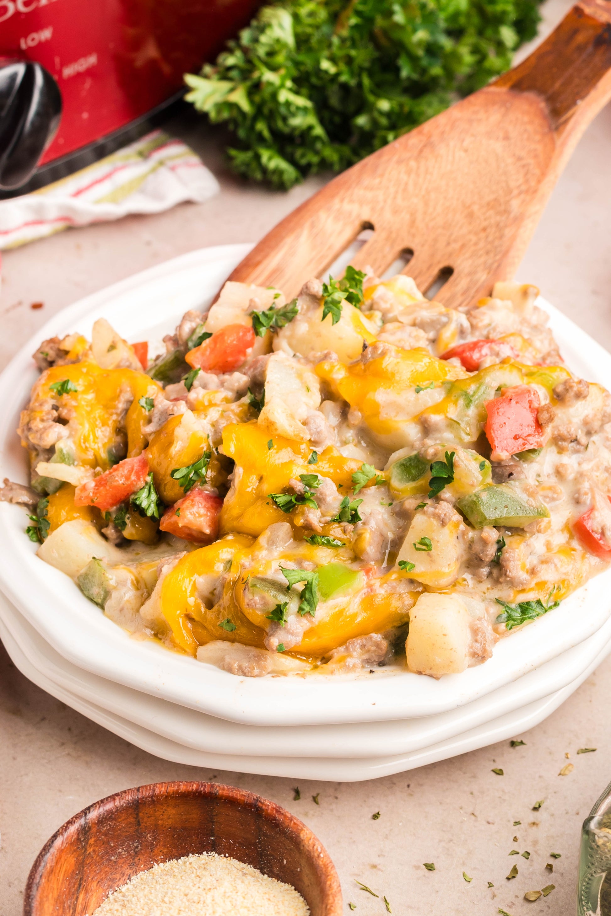 This crock pot cheesesteak potato casserole is a satisfying, comforting dish that brings together a perfect blend of flavors. Tender potatoes, savory ground beef, and melted cheese come together to create a meal that's both filling and delicious.