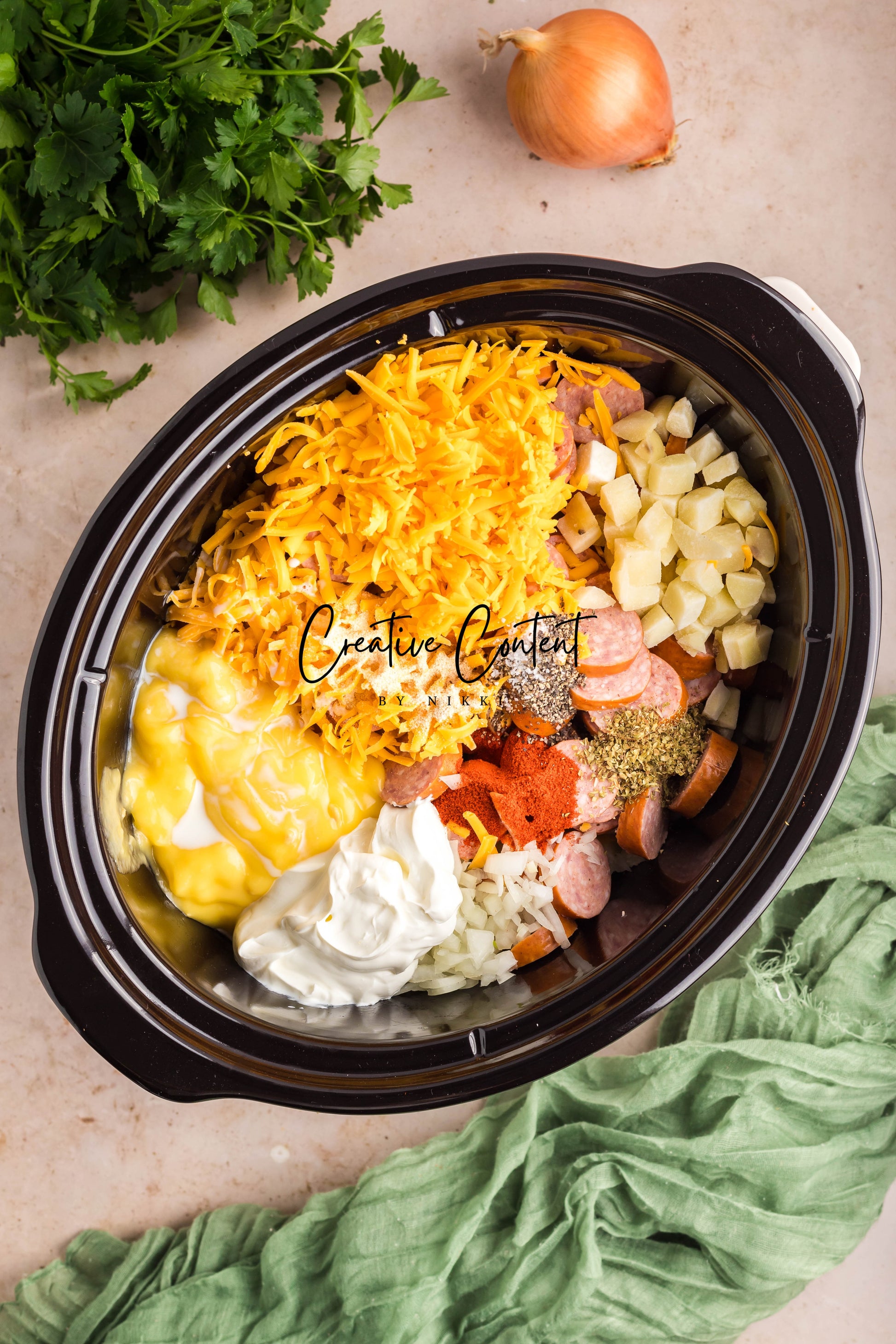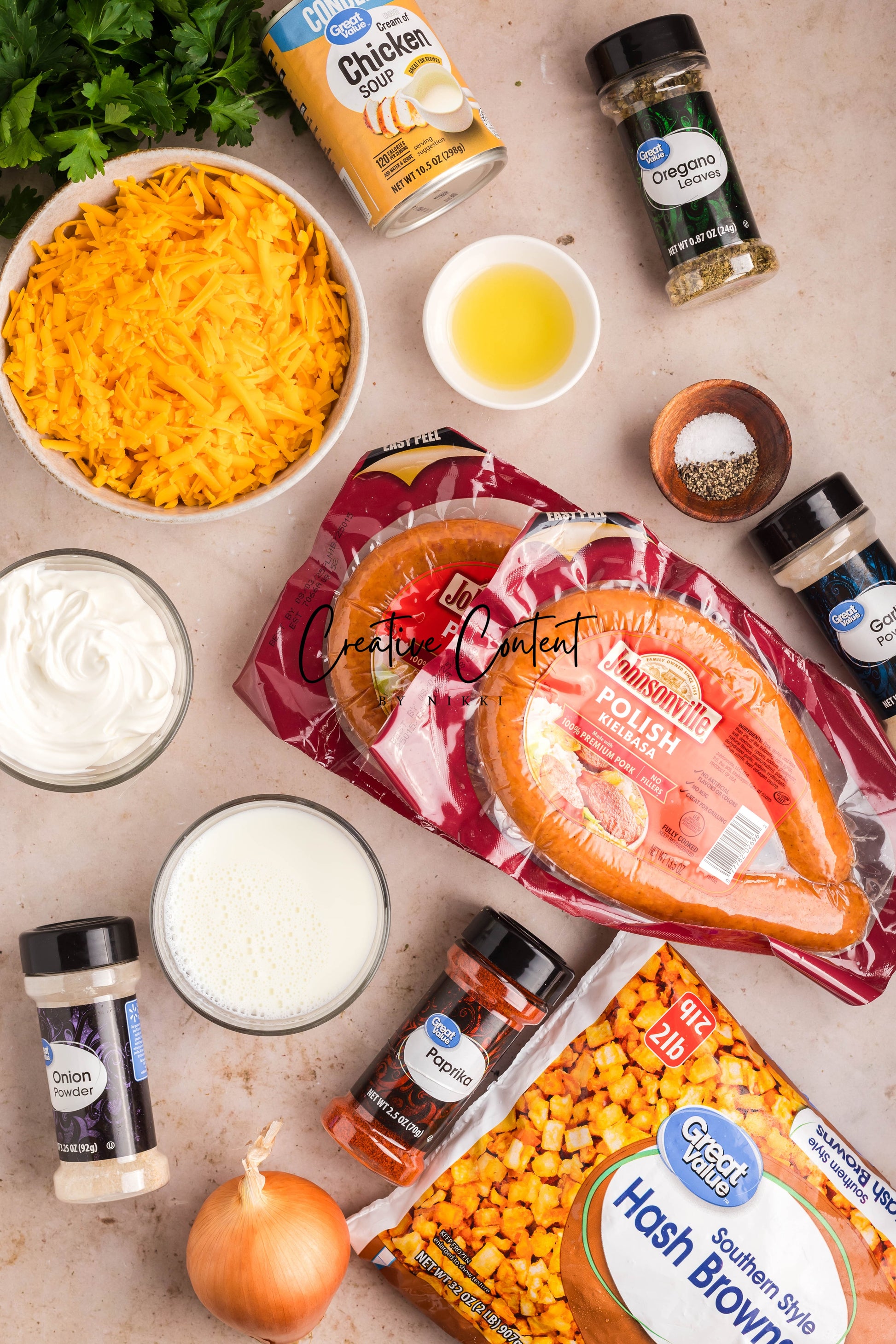 - Ingredients: avocado oil, kielbasa, frozen diced potatoes, shredded cheddar cheese, cream of chicken soup, milk, diced yellow onion, sour cream, onion powder, garlic powder, dried oregano, paprika, coarse kosher salt, black pepper, parsley