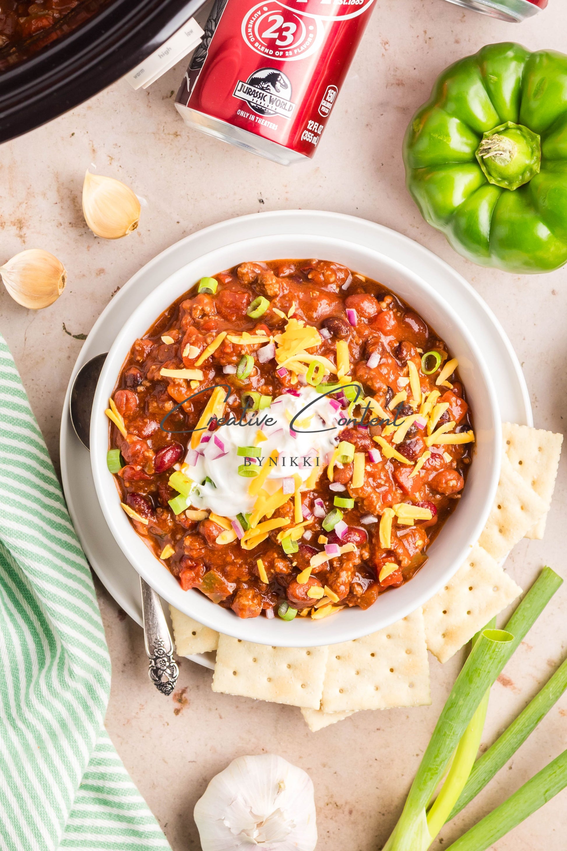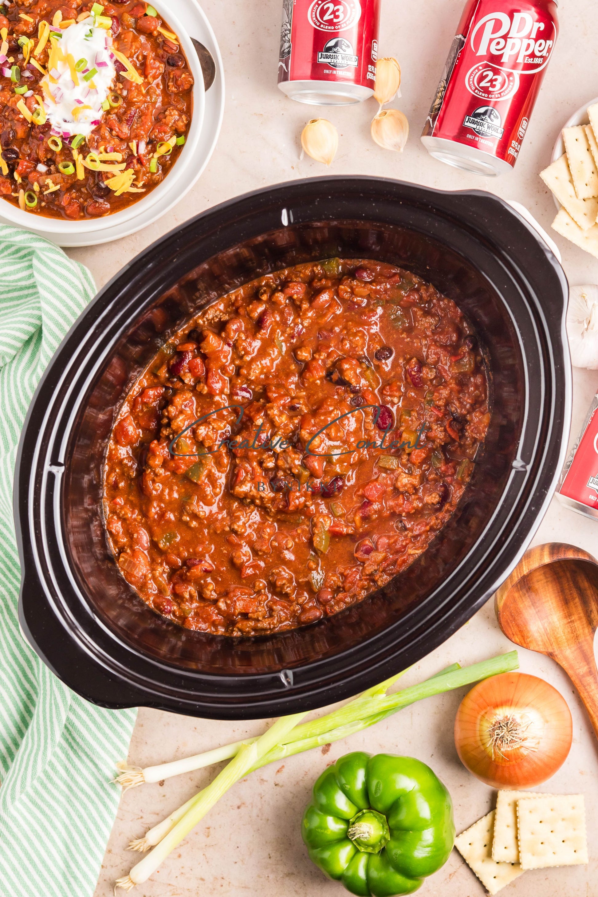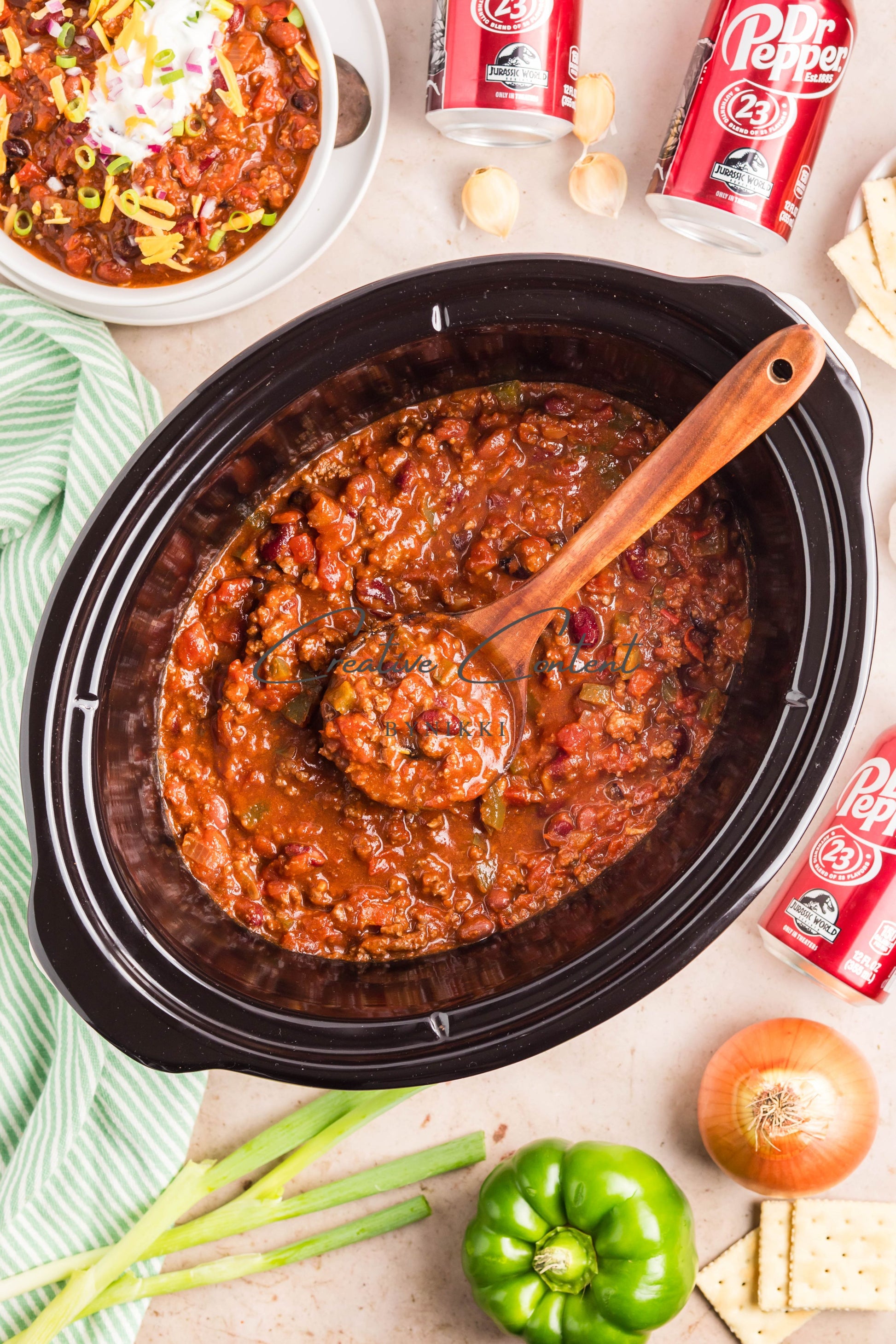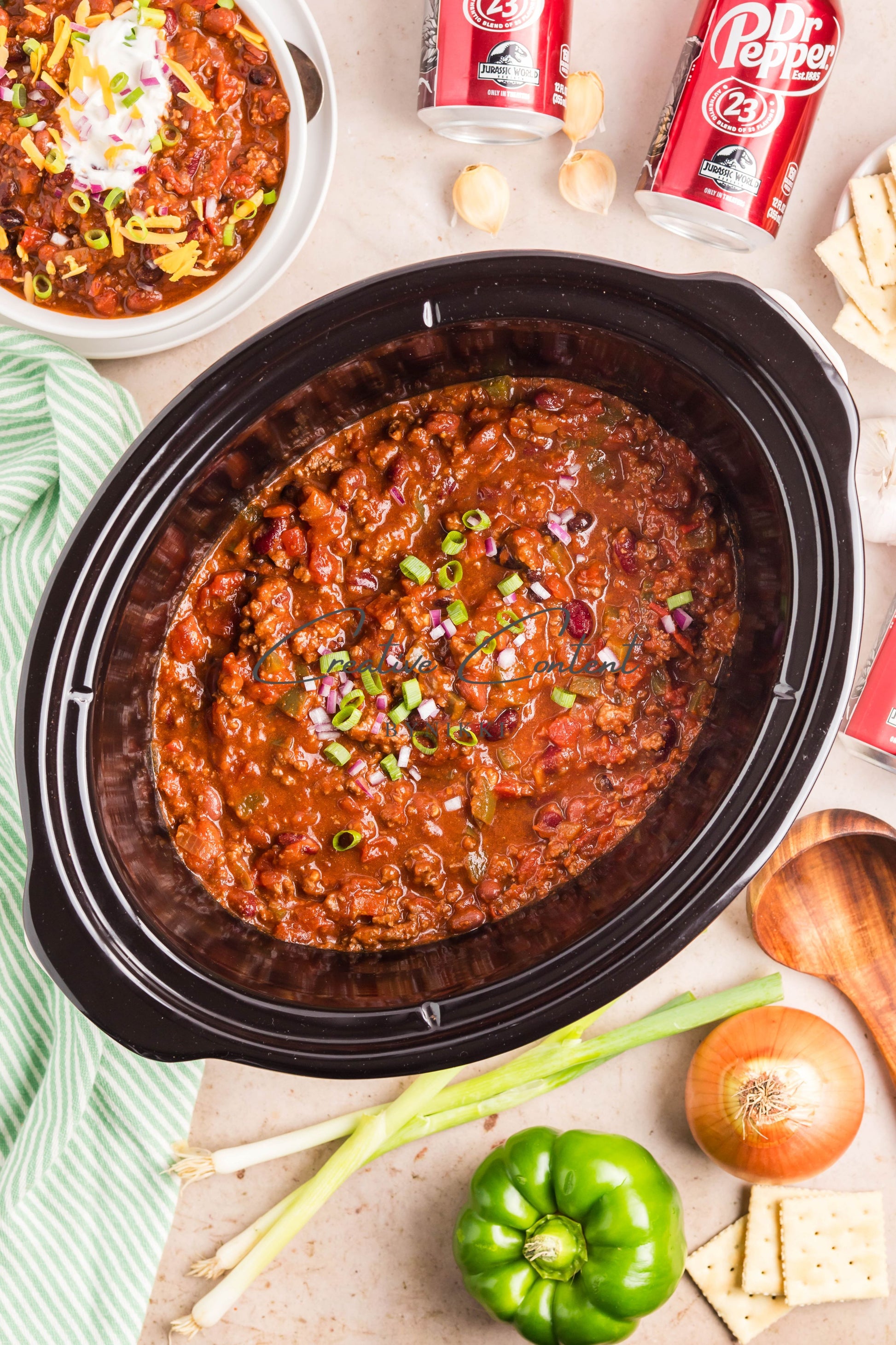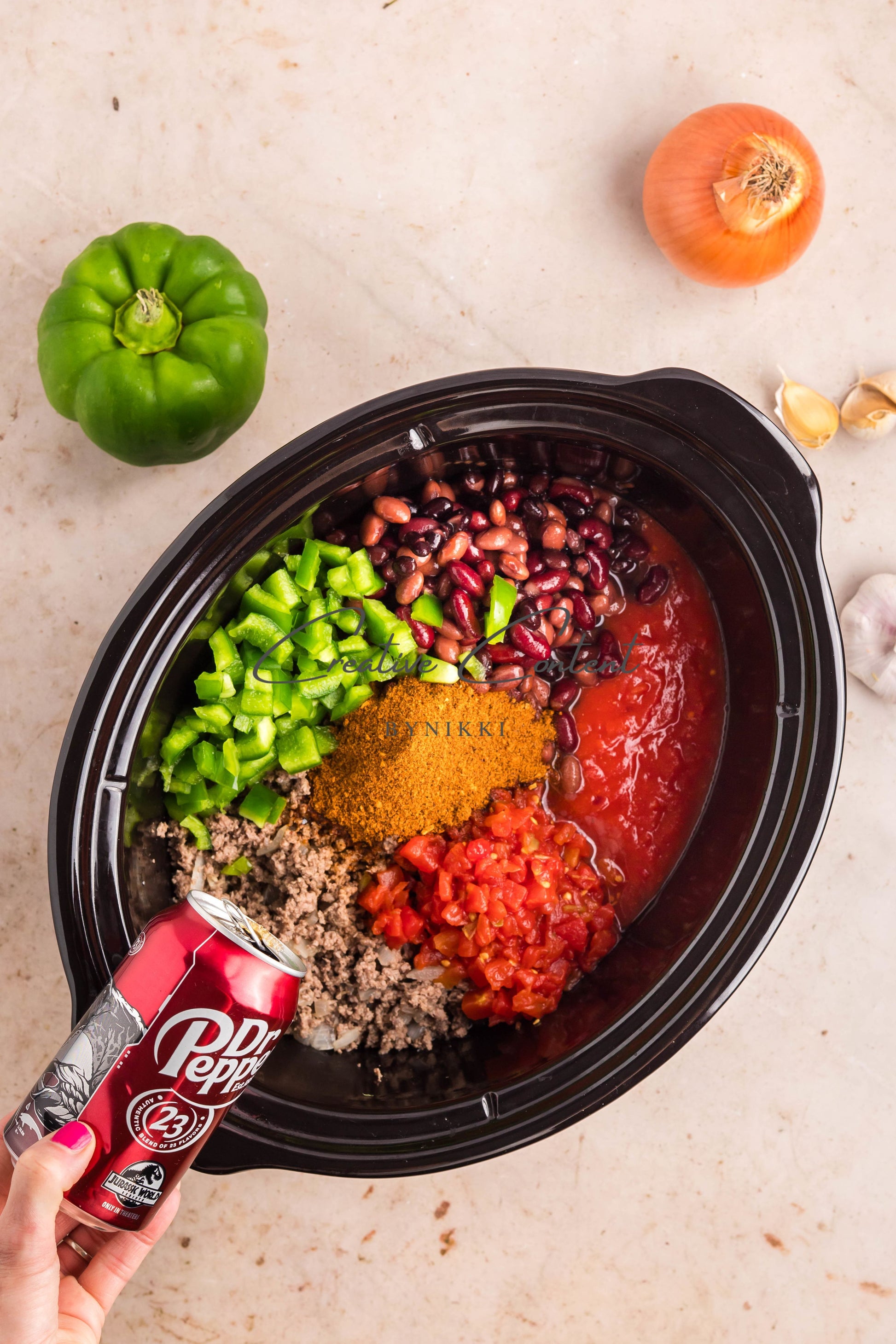 - Ingredients: Ground beef, yellow onion, garlic, green bell pepper, tri-color beans, tomatoes and chilies, crushed tomatoes, chili packet, Dr Pepper, cheese, sour cream, red onion, parsley